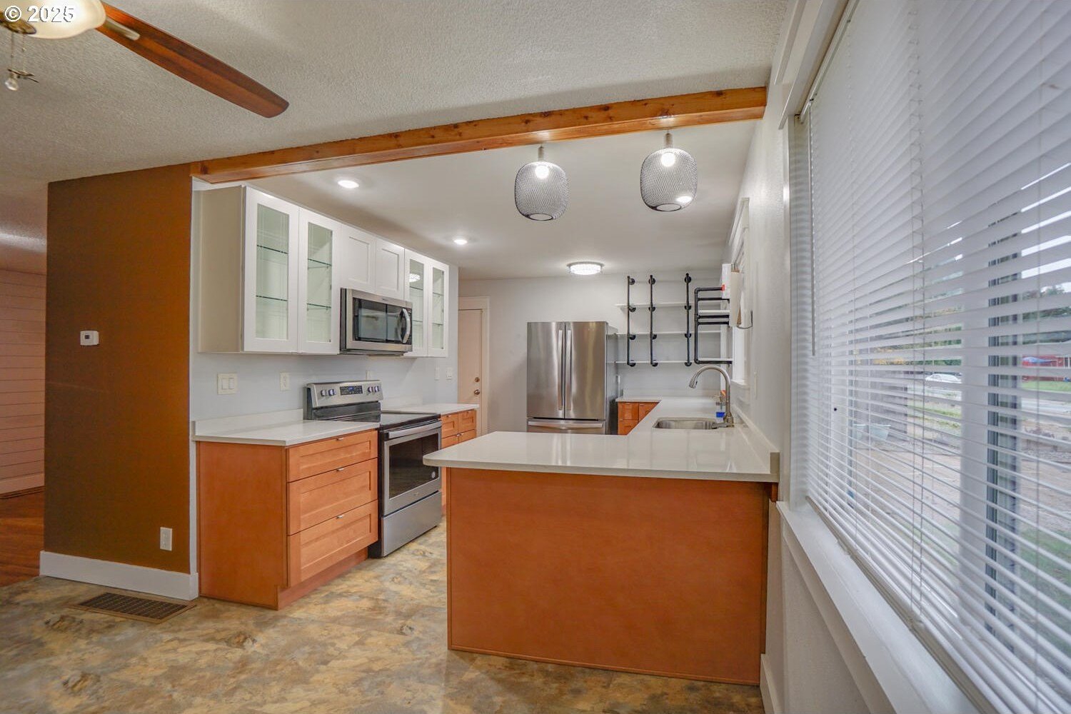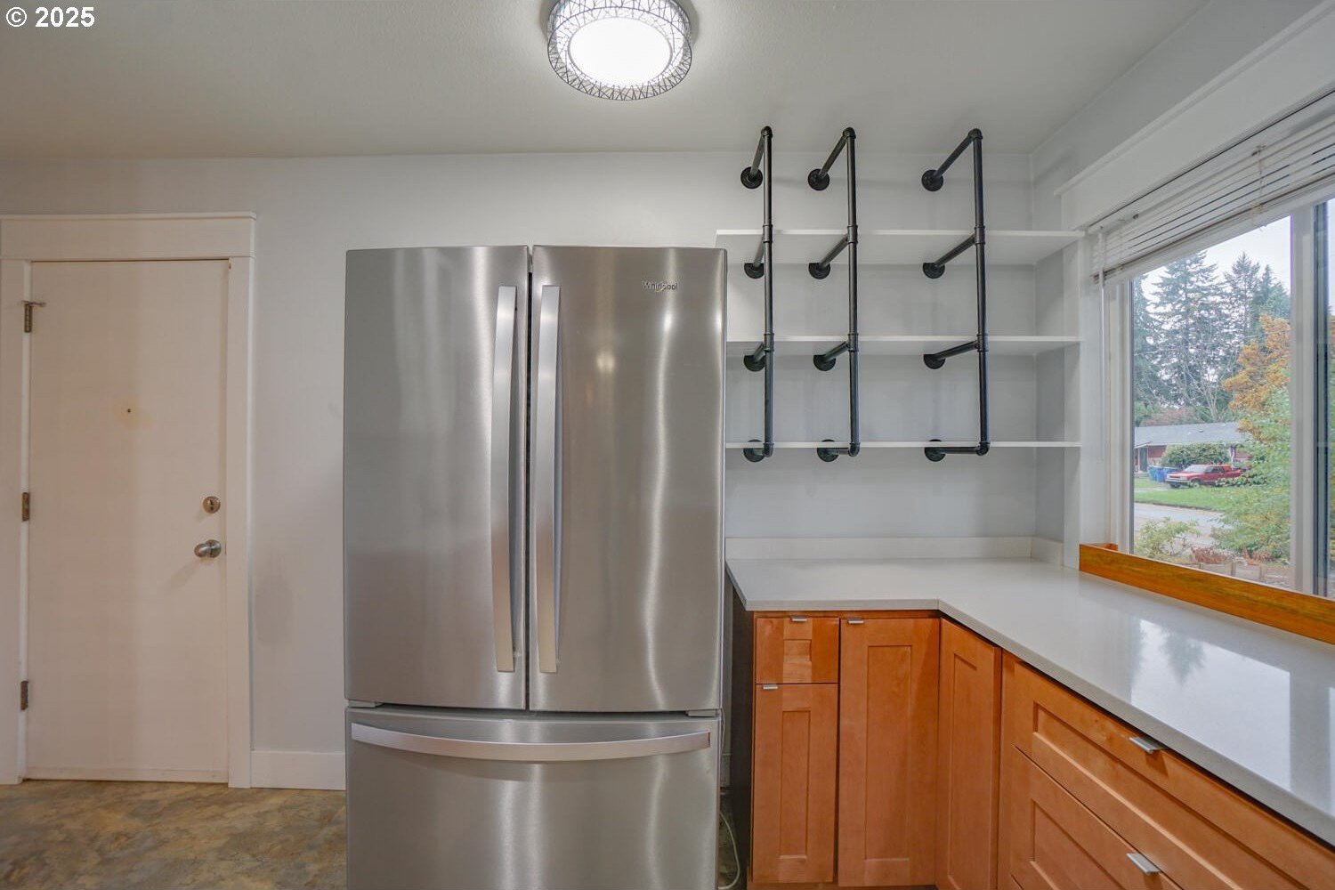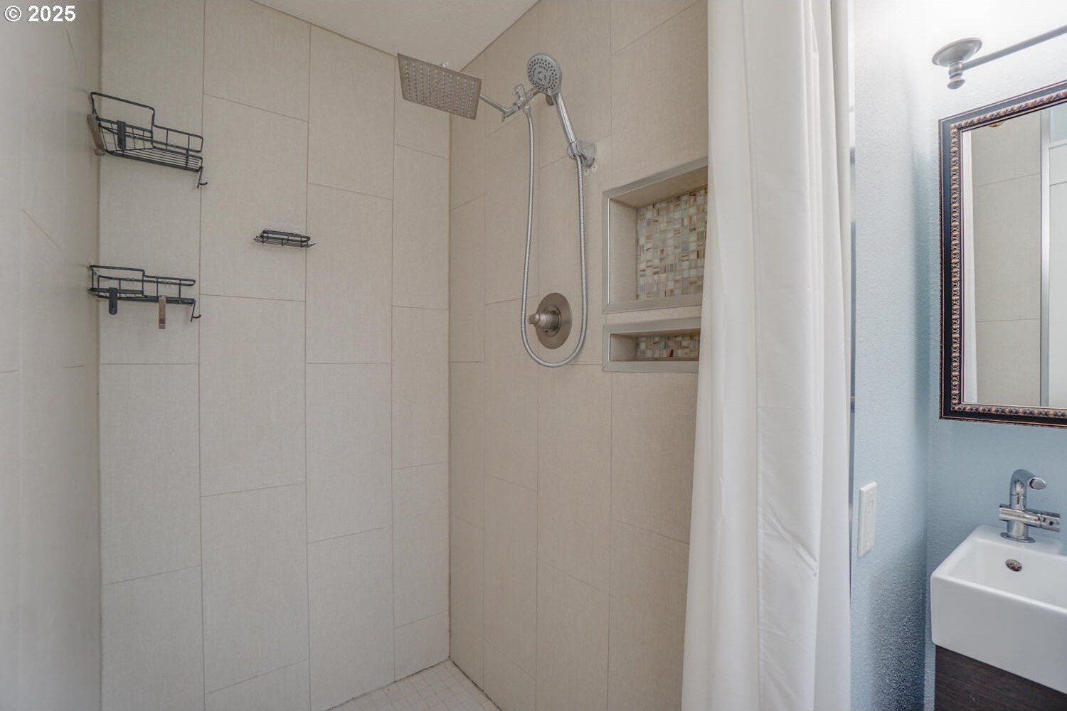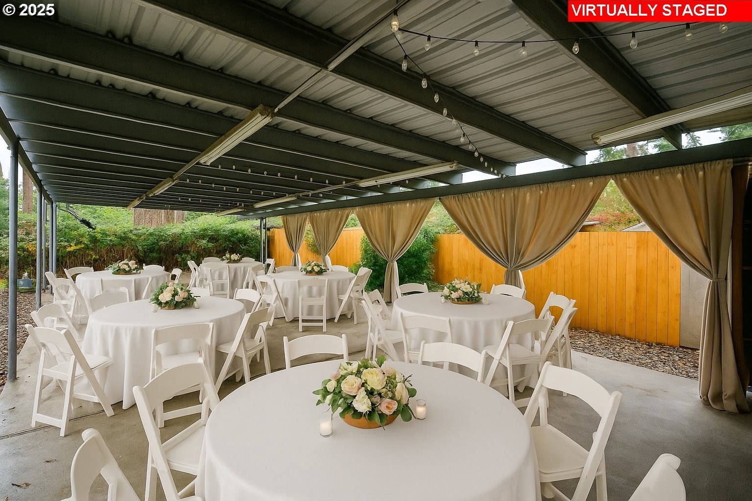 With 2,288 square feet of thoughtfully designed living space, this 3-bedroom, 2-bath home offers warmth, functionality, and a sense of calm from the moment you arrive.Step inside to find gleaming original hardwood floors, large windows that invite natural light, and a welcoming living room centered around a cozy fireplace with insert. The heart of the home is the custom kitchen—featuring quartz countertops, rich wood soft-close cabinetry, and stainless steel appliances, all included. The spacious primary bedroom is located on the main level and features a private ensuite bath with a beautiful custom-tiled walk-in shower.The home is equipped with a forced-air furnace and updated windows for year-round comfort and efficiency.The fully finished basement expands your living options with a second fireplace in the large family room—perfect for movie nights or entertaining guests. A separate den or office provides an ideal space for remote work, creative projects, or even a home library. This versatile lower level is also perfect for YouTube or content creators, offering plenty of room to design your own studio setup or workspace. Abundant storage adds even more functionality to this level.Off the back, a bright and inviting sunroom offers a relaxing space to enjoy morning coffee while overlooking the lush backyard. Sitting on over a quarter acre, the grounds are private, green, and full of character. A whimsical “Hobbit House” storage shed adds both charm and utility. The oversized two-car garage includes a convenient pull-through overhead door leading to a massive 48' x 18' covered patio area—ideal for outdoor dining, entertaining, or covered parking.Nestled in a quiet, established neighborhood, this home feels secluded yet remains close to I-5, shopping, dining, the I-5 Bridge, and PDX—making commuting a breeze. No HOA or CC&Rs, so you can enjoy your property your way.A rare find that perfectly blends mid-century charm, modern upgrades, and unmatched versatility
