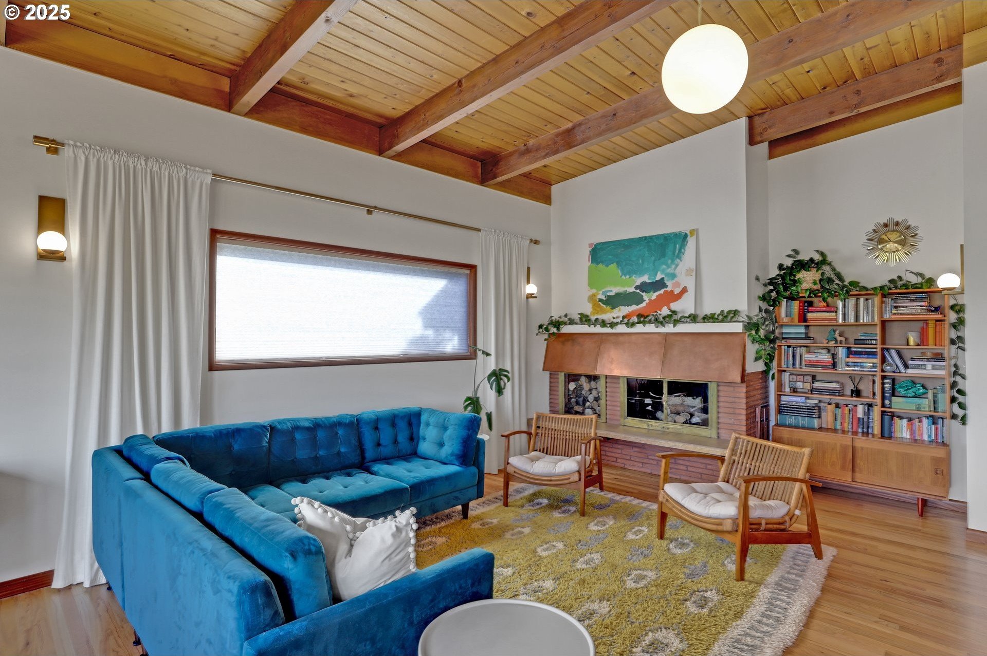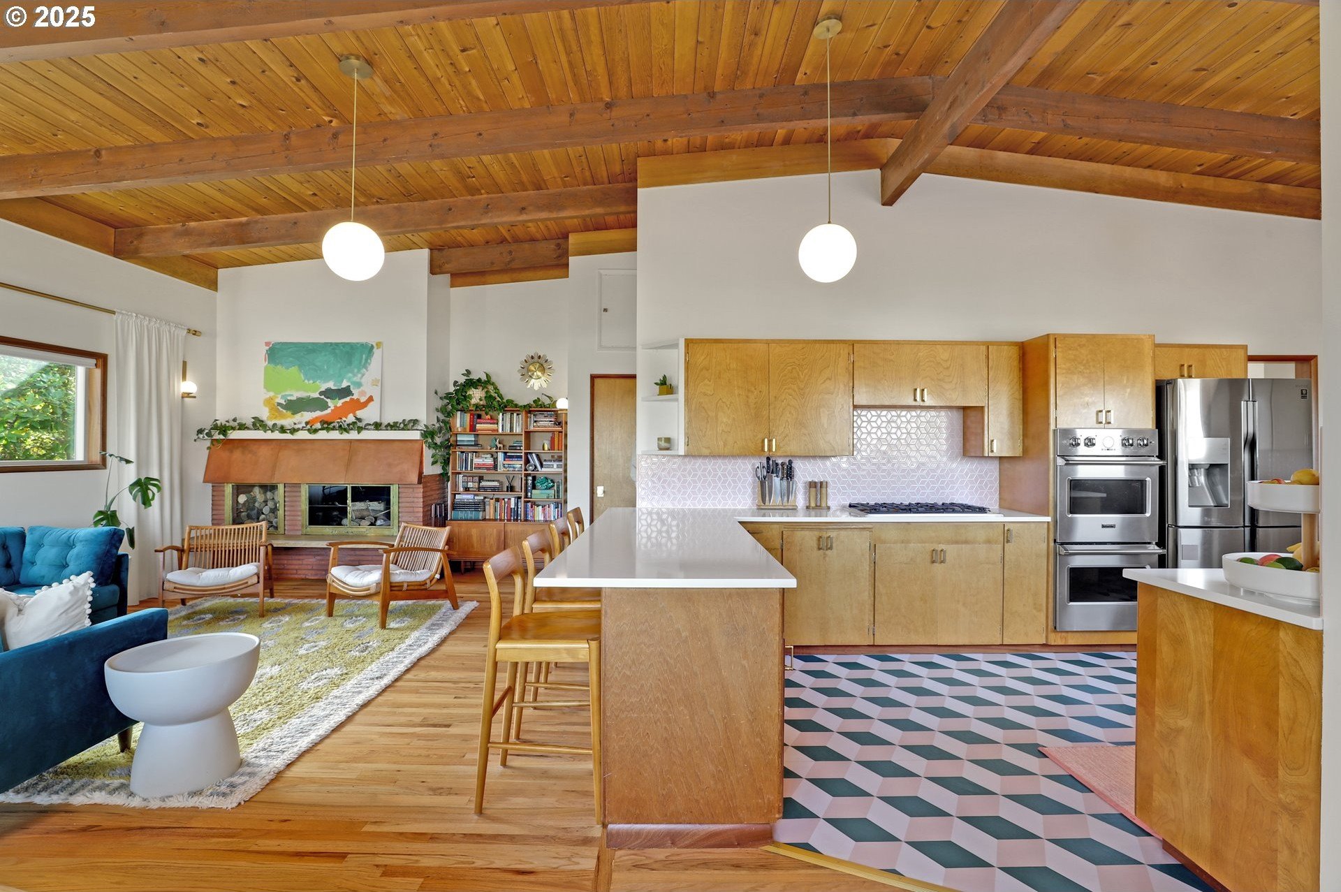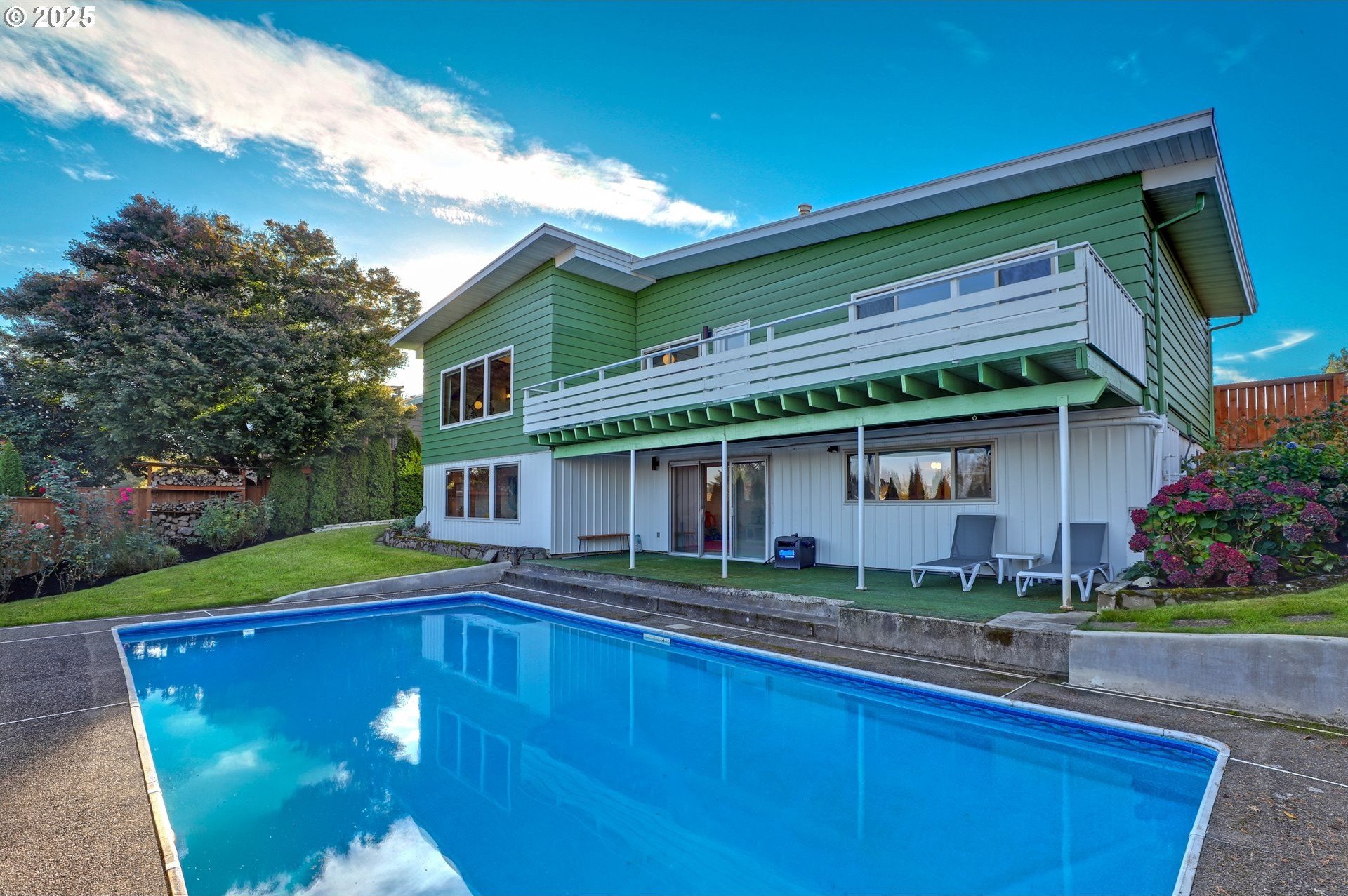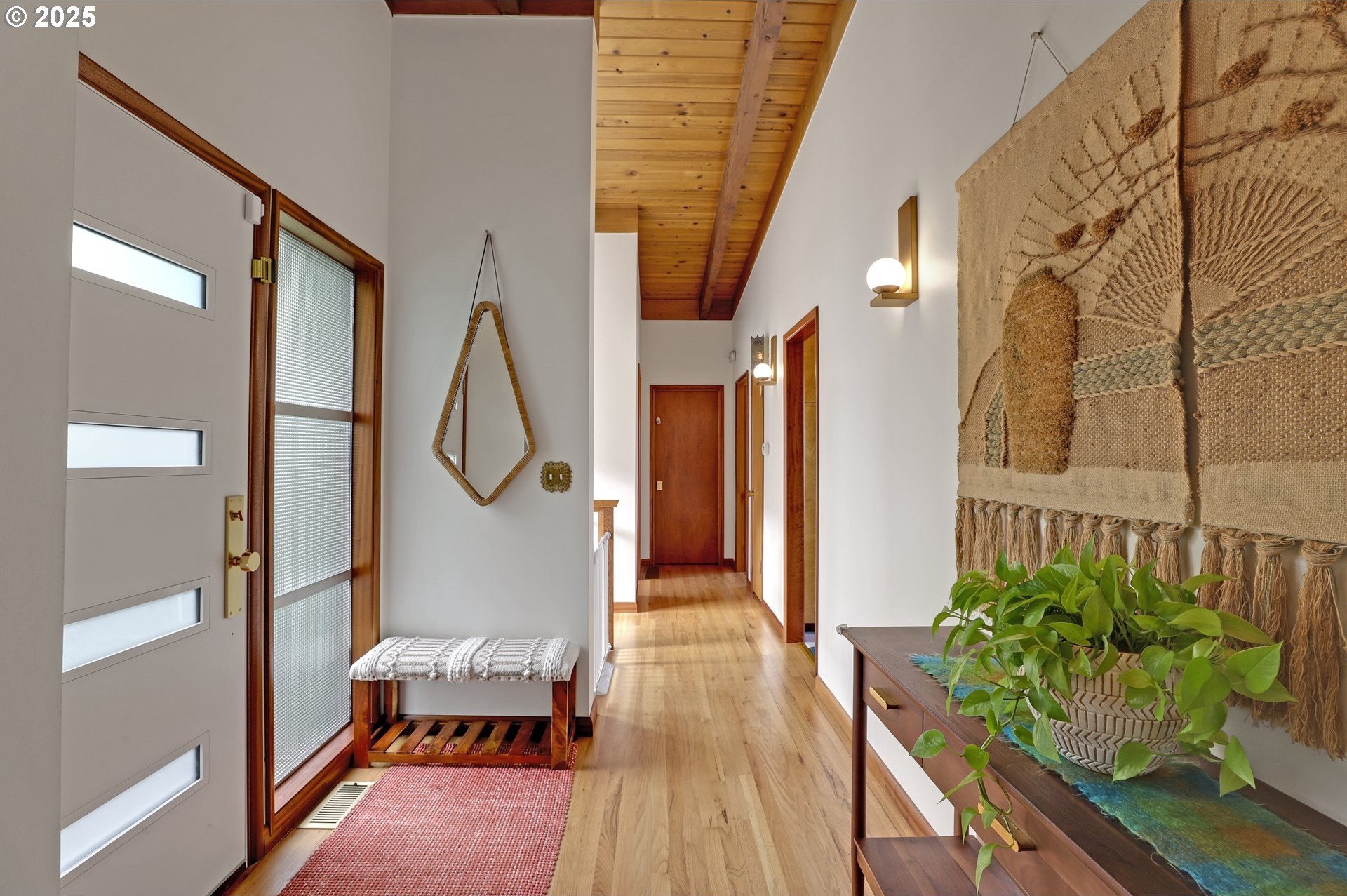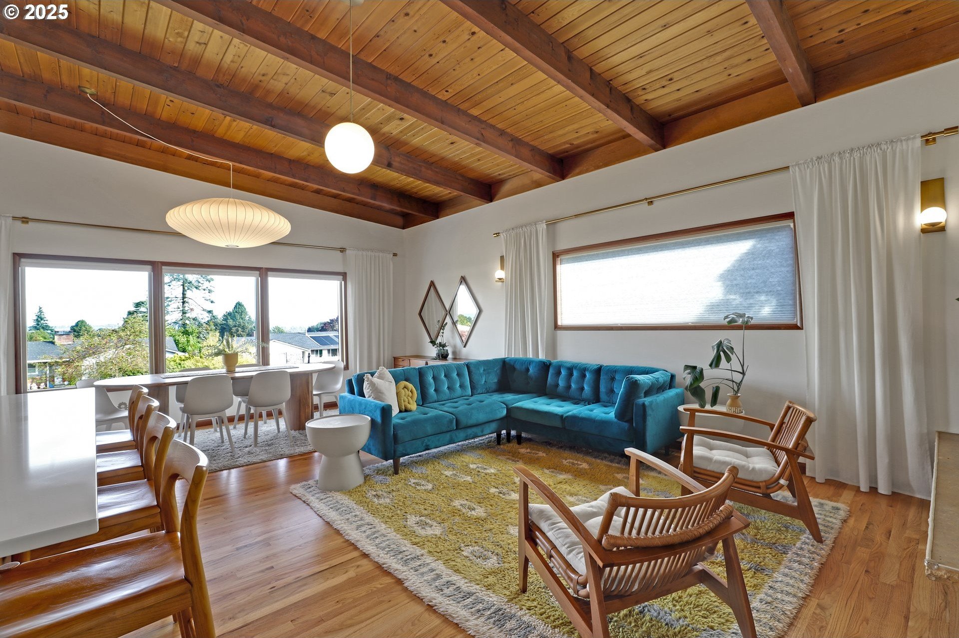 Discover a truly one-of-a-kind mid-century home nestled in the coveted Argay Terrace neighborhood. This 1964 daylight ranch, one of only two built by renowned architect Archie Hodges, showcases unparalleled craftsmanship and views of Mt. St. Helens. As you step inside, you are greeted by vaulted tongue-and-groove cedar ceilings that create an airy and inviting atmosphere. The exposed beams add a touch of architectural elegance, reflecting the timeless style of the 1960s. Every corner of this home is a testament to quality design, featuring beautiful oak hardwood floors and solid core doors that enhance the warm and welcoming feel. The updated kitchen has it all, boasting quartz countertops, a Viking gas range, double oven, Samsung French door refrigerator, Bosch dishwasher, and custom tile backsplash. The bathrooms have also been thoughtfully updated with quartz countertops, Delta fixtures, custom tile, and a new soaking tub for relaxation. One of the standout features of this property is its commitment to preserving the views. The home is equipped with underground power lines, ensuring that your sight-lines remain unobstructed, allowing you to fully appreciate the vistas of Mt. St. Helens year-round. Additional highlights include a new Rinnai tankless water heater, added central air conditioning, a new electrical panel, and refinished hardwood floors upstairs, complemented by new oak hardwood floors downstairs. The home features new light fixtures and rejuvenation fixtures and hardware throughout. Step outside to your fully fenced backyard, featuring a brand new 6' cedar fence for added privacy and an inviting in-ground pool, complete with a new Pentair pool pump and chlorinator. Newly planted 10' Arborvitae ensures a serene and secluded outdoor space. With its rich history and distinctive architecture, this mid-century gem is more than just a home; it is a rare opportunity to own a piece of architectural artistry in one of Portland's most desirable neighborhood. [Home Energy Score = 1. HES Report at https://rpt.greenbuildingregistry.com/hes/OR10242705]