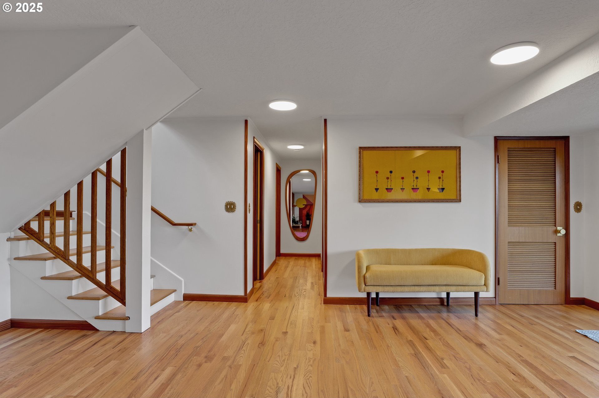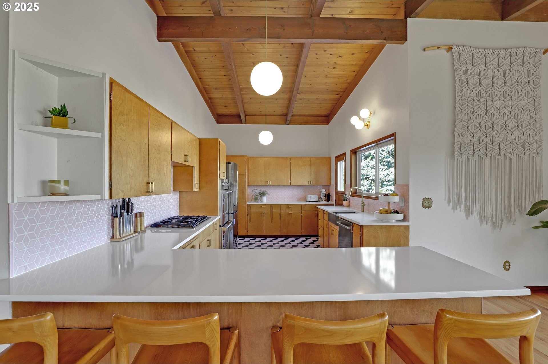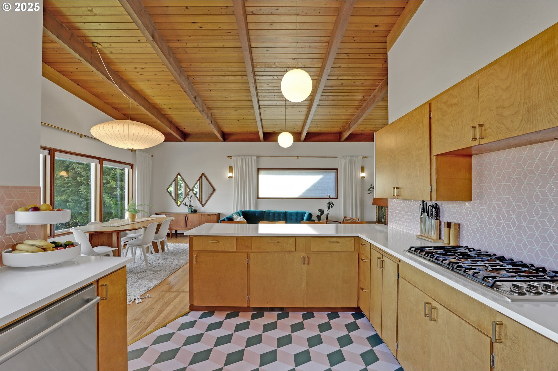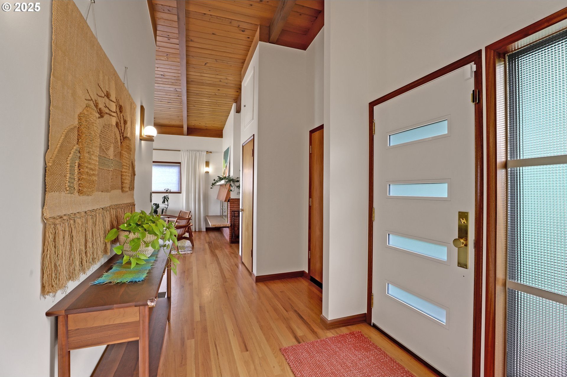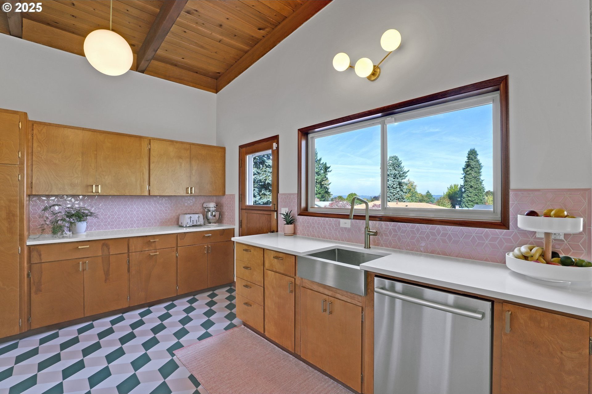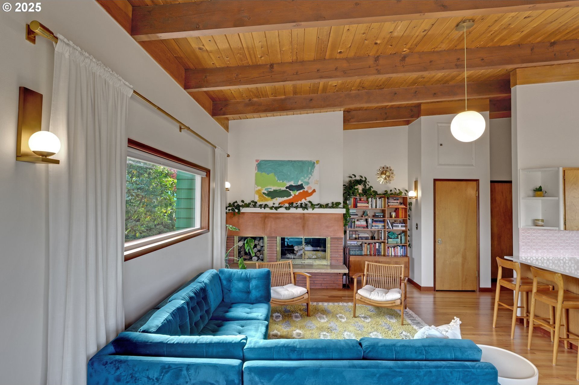 Discover a truly one-of-a-kind mid-century home nestled in the coveted Argay Terrace neighborhood. This 1964 daylight ranch, one of only two built by renowned architect Archie Hodges, showcases unparalleled craftsmanship and views of Mt. St. Helens. As you step inside, you are greeted by vaulted tongue-and-groove cedar ceilings that create an airy and inviting atmosphere. The exposed beams add a touch of architectural elegance, reflecting the timeless style of the 1960s. Every corner of this home is a testament to quality design, featuring beautiful oak hardwood floors and solid core doors that enhance the warm and welcoming feel. The updated kitchen has it all, boasting quartz countertops, a Viking gas range, double oven, Samsung French door refrigerator, Bosch dishwasher, and custom tile backsplash. The bathrooms have also been thoughtfully updated with quartz countertops, Delta fixtures, custom tile, and a new soaking tub for relaxation. One of the standout features of this property is its commitment to preserving the views. The home is equipped with underground power lines, ensuring that your sight-lines remain unobstructed, allowing you to fully appreciate the vistas of Mt. St. Helens year-round. Additional highlights include a new Rinnai tankless water heater, added central air conditioning, a new electrical panel, and refinished hardwood floors upstairs, complemented by new oak hardwood floors downstairs. The home features new light fixtures and rejuvenation fixtures and hardware throughout. Step outside to your fully fenced backyard, featuring a brand new 6' cedar fence for added privacy and an inviting in-ground pool, complete with a new Pentair pool pump and chlorinator. Newly planted 10' Arborvitae ensures a serene and secluded outdoor space. With its rich history and distinctive architecture, this mid-century gem is more than just a home; it is a rare opportunity to own a piece of architectural artistry in one of Portland's most desirable neighborhood. [Home Energy Score = 1. HES Report at https://rpt.greenbuildingregistry.com/hes/OR10242705]