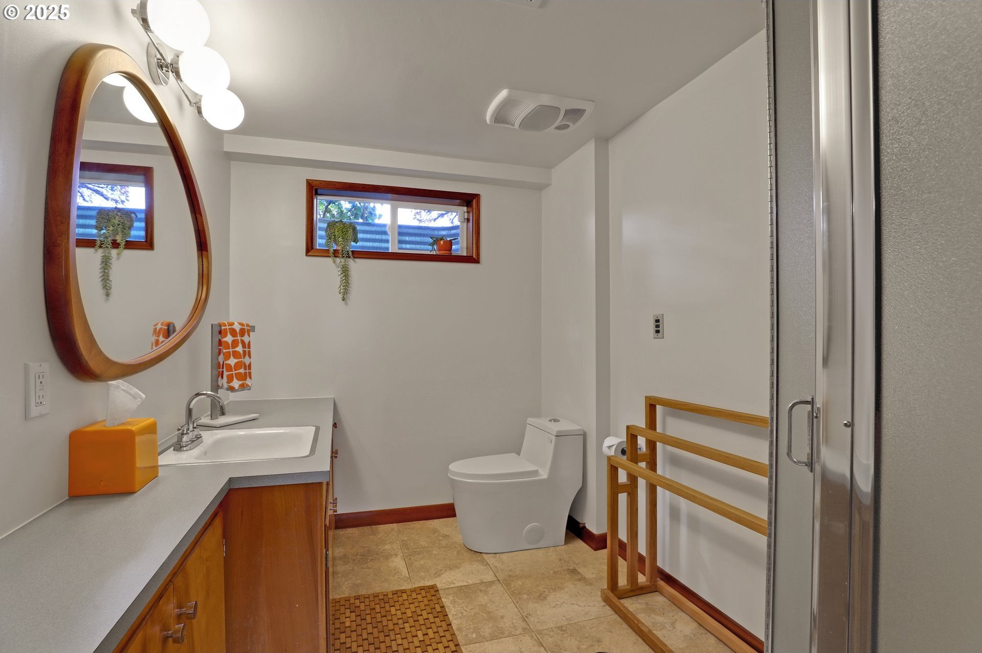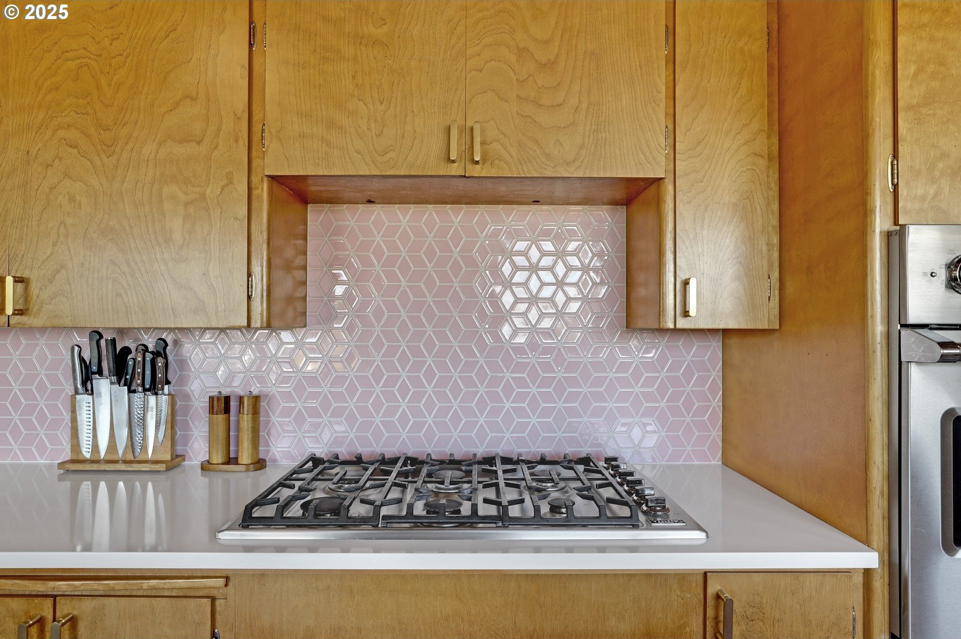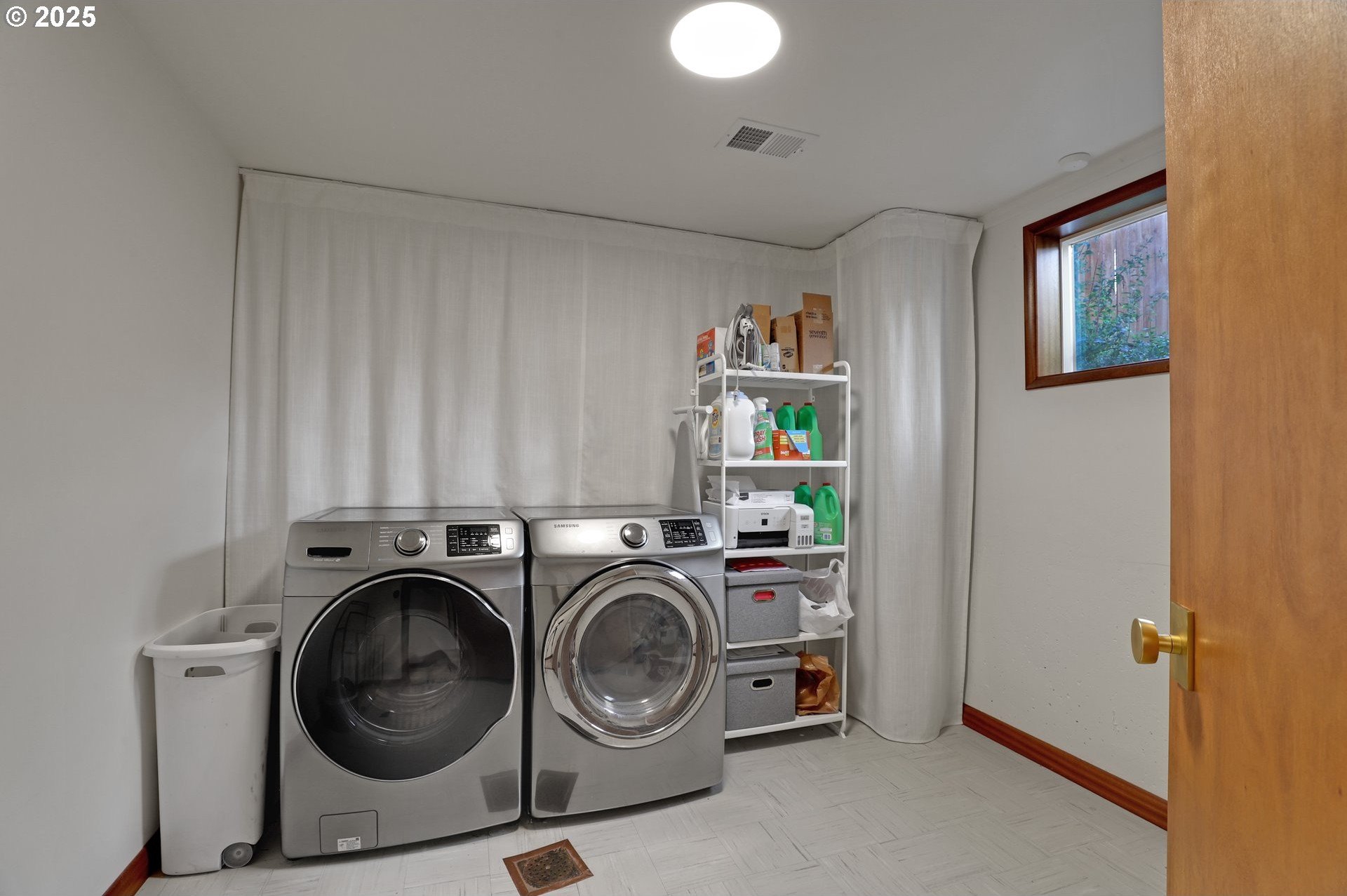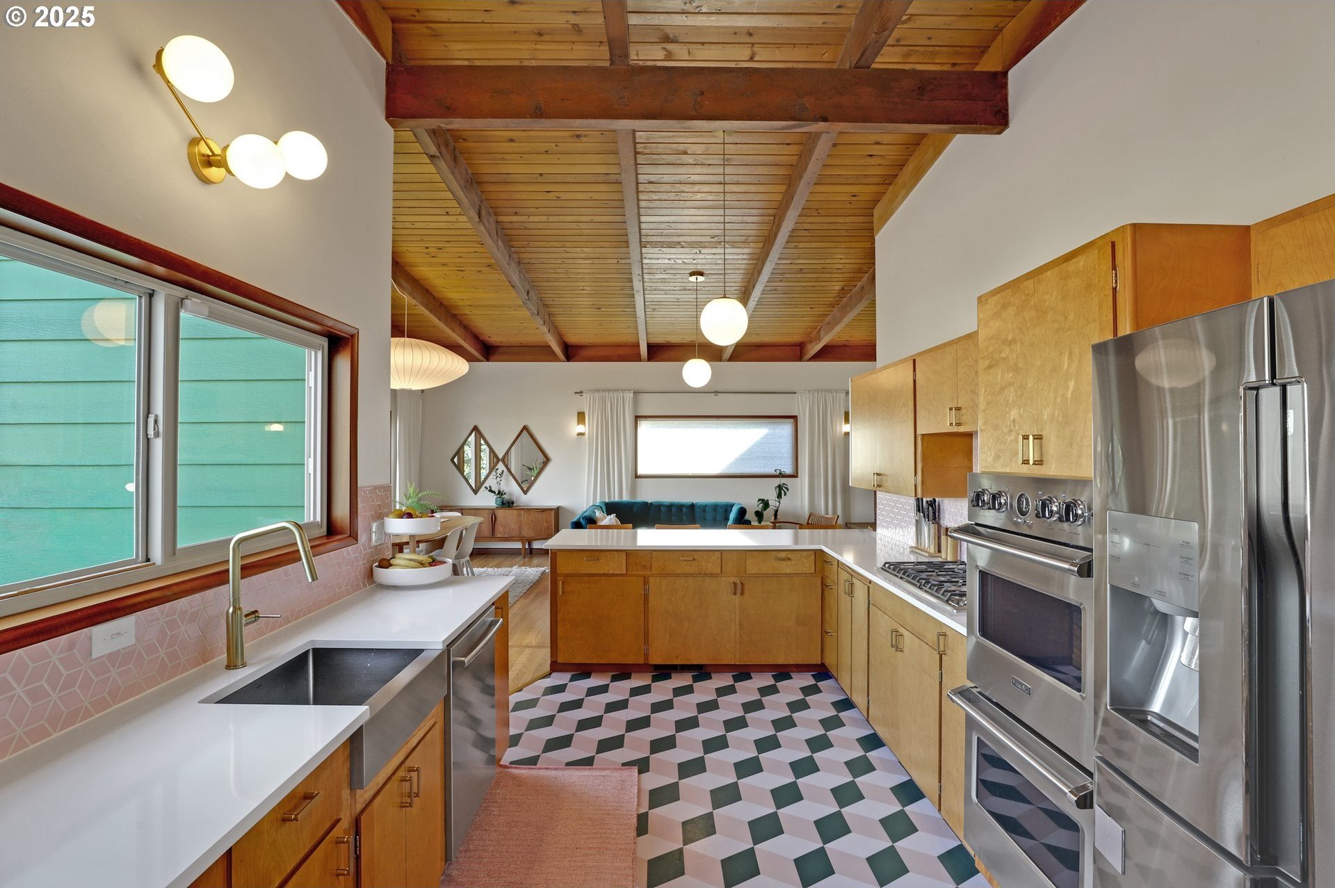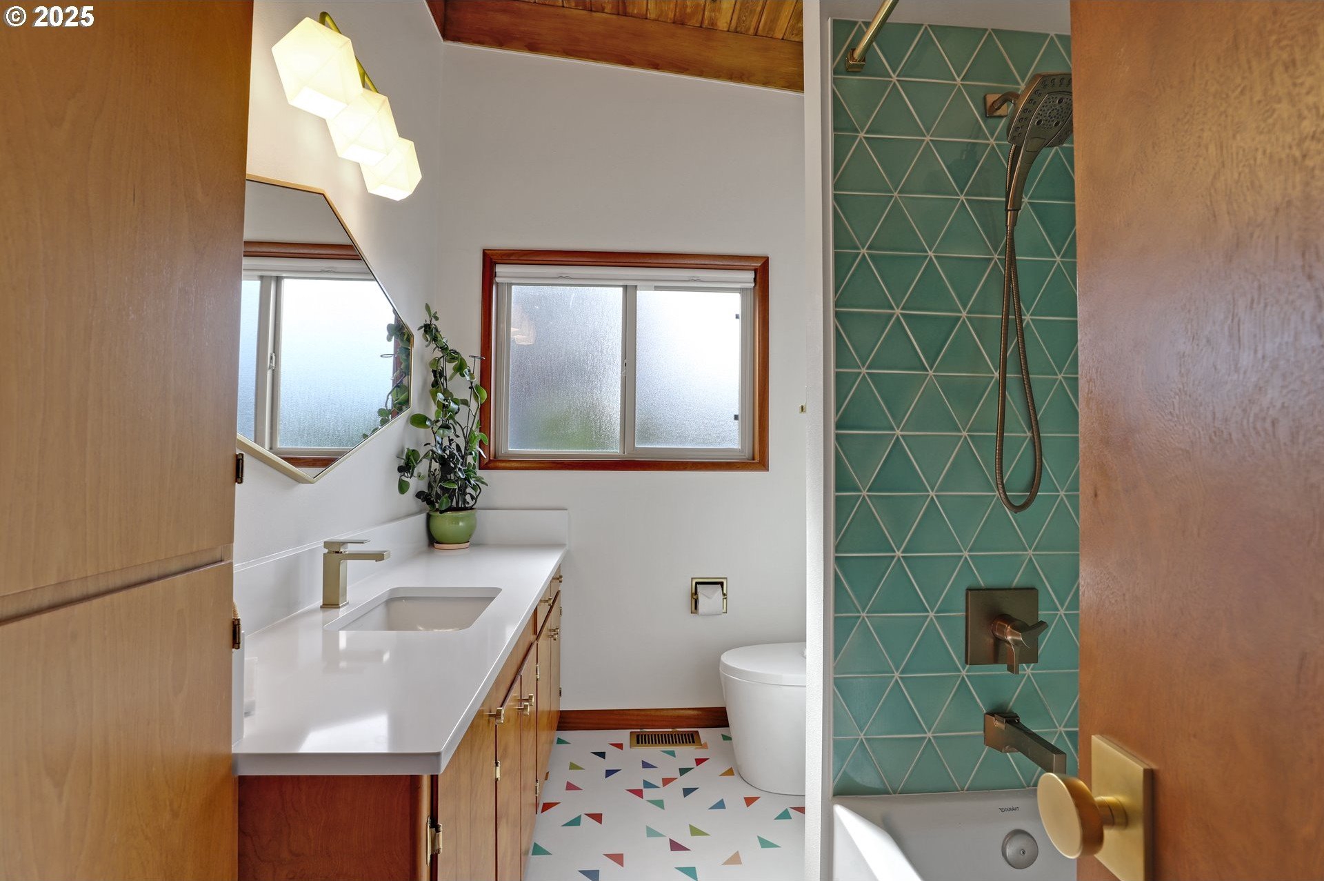 Discover a truly one-of-a-kind mid-century home nestled in the coveted Argay Terrace neighborhood. This 1964 daylight ranch, one of only two built by renowned architect Archie Hodges, showcases unparalleled craftsmanship and views of Mt. St. Helens. As you step inside, you are greeted by vaulted tongue-and-groove cedar ceilings that create an airy and inviting atmosphere. The exposed beams add a touch of architectural elegance, reflecting the timeless style of the 1960s. Every corner of this home is a testament to quality design, featuring beautiful oak hardwood floors and solid core doors that enhance the warm and welcoming feel. The updated kitchen has it all, boasting quartz countertops, a Viking gas range, double oven, Samsung French door refrigerator, Bosch dishwasher, and custom tile backsplash. The bathrooms have also been thoughtfully updated with quartz countertops, Delta fixtures, custom tile, and a new soaking tub for relaxation. One of the standout features of this property is its commitment to preserving the views. The home is equipped with underground power lines, ensuring that your sight-lines remain unobstructed, allowing you to fully appreciate the vistas of Mt. St. Helens year-round. Additional highlights include a new Rinnai tankless water heater, added central air conditioning, a new electrical panel, and refinished hardwood floors upstairs, complemented by new oak hardwood floors downstairs. The home features new light fixtures and rejuvenation fixtures and hardware throughout. Step outside to your fully fenced backyard, featuring a brand new 6' cedar fence for added privacy and an inviting in-ground pool, complete with a new Pentair pool pump and chlorinator. Newly planted 10' Arborvitae ensures a serene and secluded outdoor space. With its rich history and distinctive architecture, this mid-century gem is more than just a home; it is a rare opportunity to own a piece of architectural artistry in one of Portland's most desirable neighborhood. [Home Energy Score = 1. HES Report at https://rpt.greenbuildingregistry.com/hes/OR10242705]