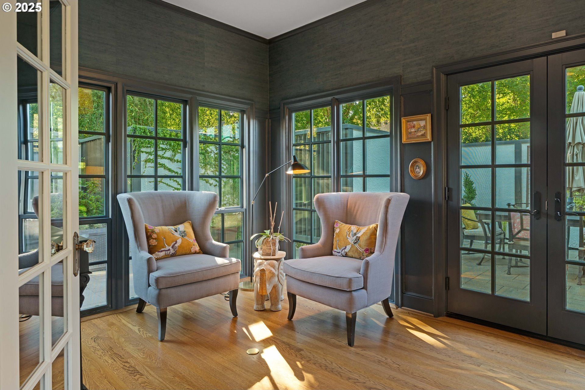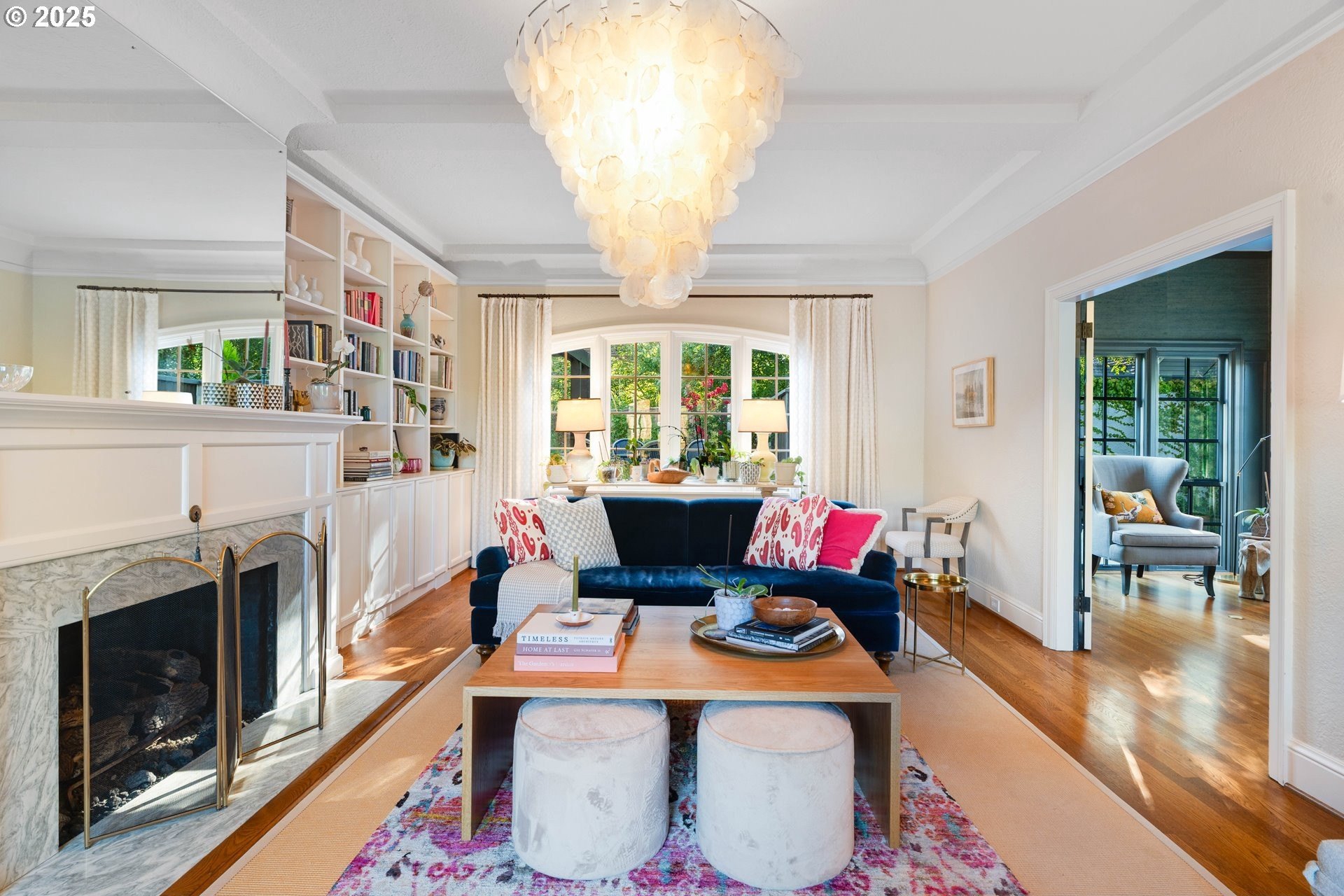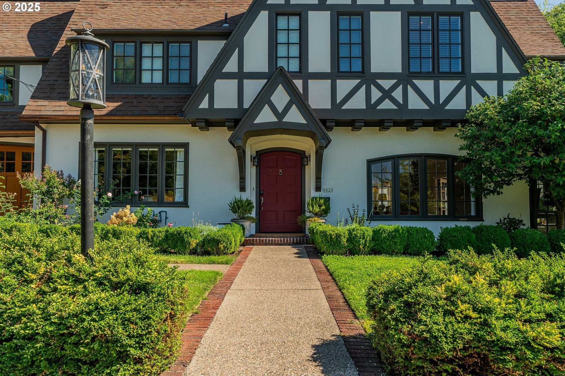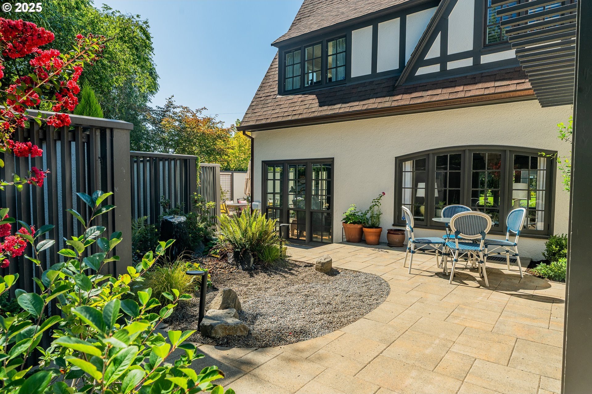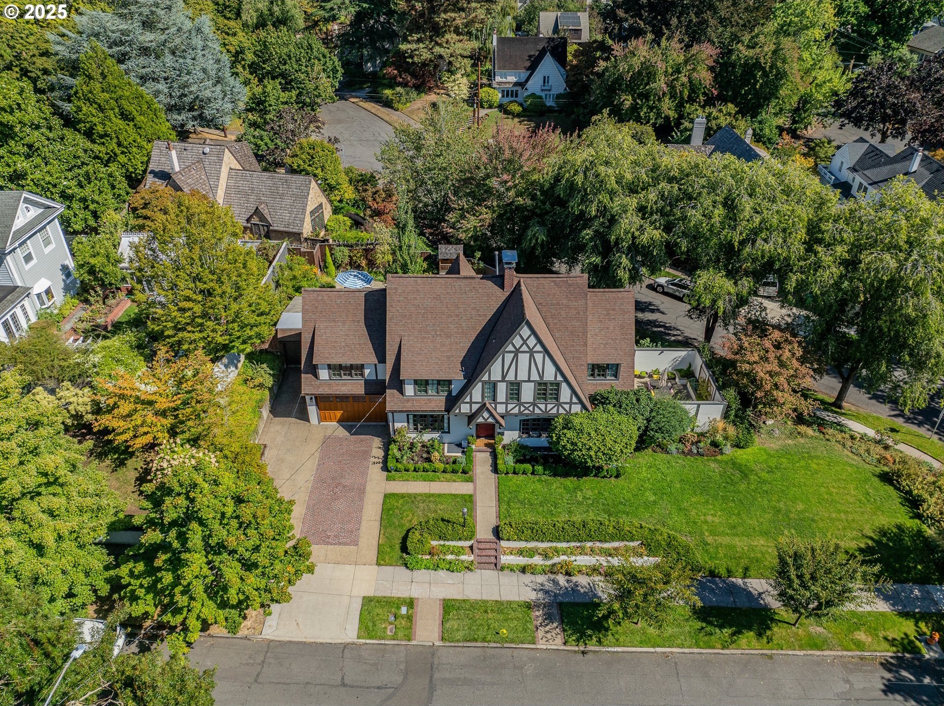 Step into timeless elegance with this stunning Tudor revival situated on a double lot in the premier block of Eastmoreland, offering five bedrooms, three and a half bathrooms, and exquisite details throughout. Off the entry, the formal living room welcomes you with a cozy fireplace, custom bookshelves, and coffered ceilings, while double doors open to a richly styled sunroom filled with character. Hardwood floors flow seamlessly through the main level, leading to a dining room adorned with a chandelier and original built-ins, as well as a chef’s kitchen with stainless steel appliances, double ovens, an island, and abundant storage. A charming breakfast nook with a custom window bench opens to a storybook courtyard, perfect for indoor-outdoor living. The lower level offers incredible versatility with a spacious bonus room featuring a fireplace, an additional bedroom, a full bath, laundry room, and a private sauna for relaxation. Upstairs, four bedrooms include a serene primary suite with a custom walk-in closet and spa-like en suite with soaking tub, glass shower, and dual vanity, complemented by a hallway bath and an office/flex space currently serving as an art studio. Outside, the manicured backyard evokes an English countryside garden, offering lush landscaping and privacy. Ideally situated, it’s an easy walk to Westmoreland Park, the Crystal Springs Rhododendron Gardens, and all the offerings of the charming Sellwood-Moreland neighborhood.
