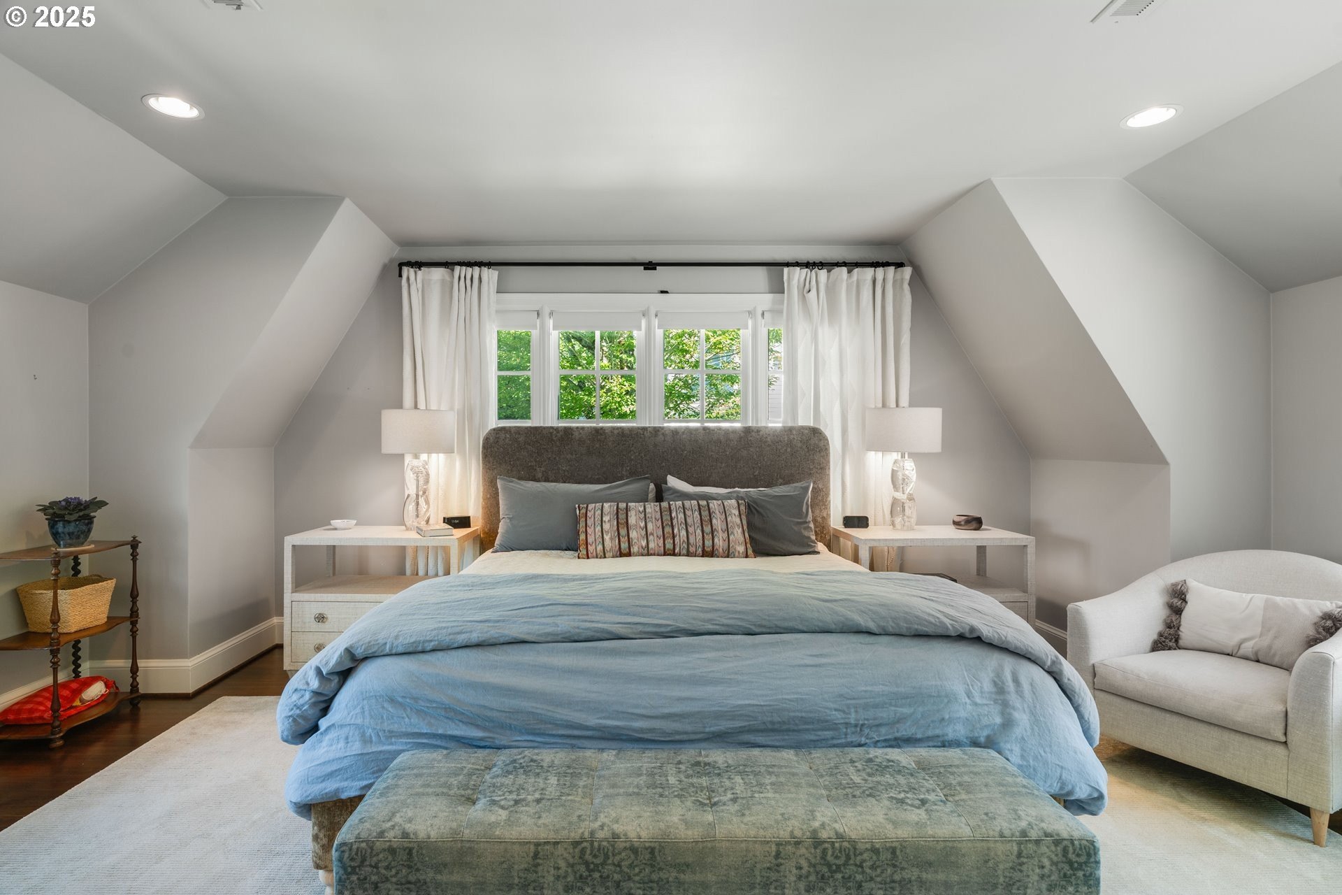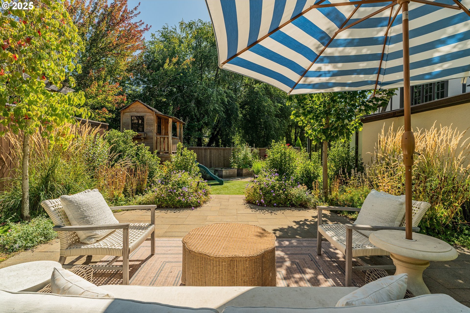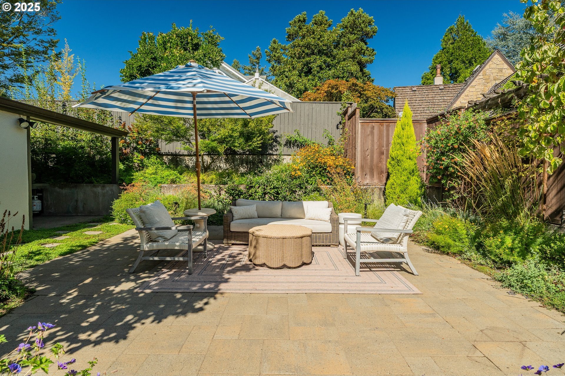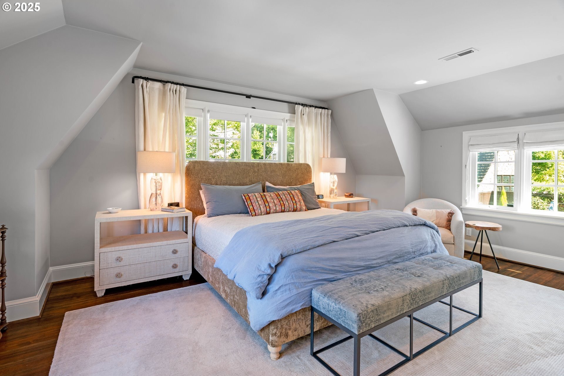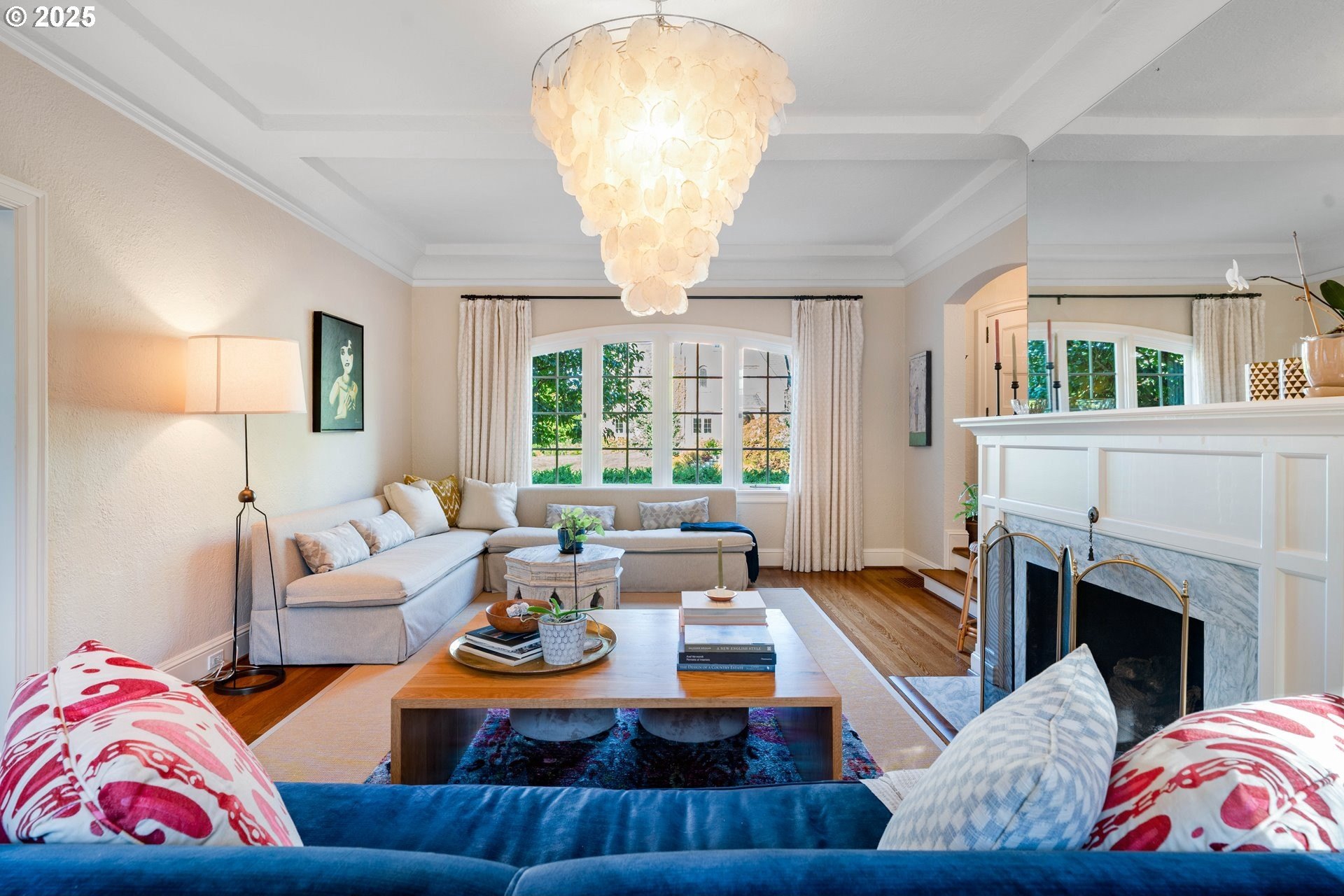 Step into timeless elegance with this stunning Tudor revival situated on a double lot in the premier block of Eastmoreland, offering five bedrooms, three and a half bathrooms, and exquisite details throughout. Off the entry, the formal living room welcomes you with a cozy fireplace, custom bookshelves, and coffered ceilings, while double doors open to a richly styled sunroom filled with character. Hardwood floors flow seamlessly through the main level, leading to a dining room adorned with a chandelier and original built-ins, as well as a chef’s kitchen with stainless steel appliances, double ovens, an island, and abundant storage. A charming breakfast nook with a custom window bench opens to a storybook courtyard, perfect for indoor-outdoor living. The lower level offers incredible versatility with a spacious bonus room featuring a fireplace, an additional bedroom, a full bath, laundry room, and a private sauna for relaxation. Upstairs, four bedrooms include a serene primary suite with a custom walk-in closet and spa-like en suite with soaking tub, glass shower, and dual vanity, complemented by a hallway bath and an office/flex space currently serving as an art studio. Outside, the manicured backyard evokes an English countryside garden, offering lush landscaping and privacy. Ideally situated, it’s an easy walk to Westmoreland Park, the Crystal Springs Rhododendron Gardens, and all the offerings of the charming Sellwood-Moreland neighborhood.