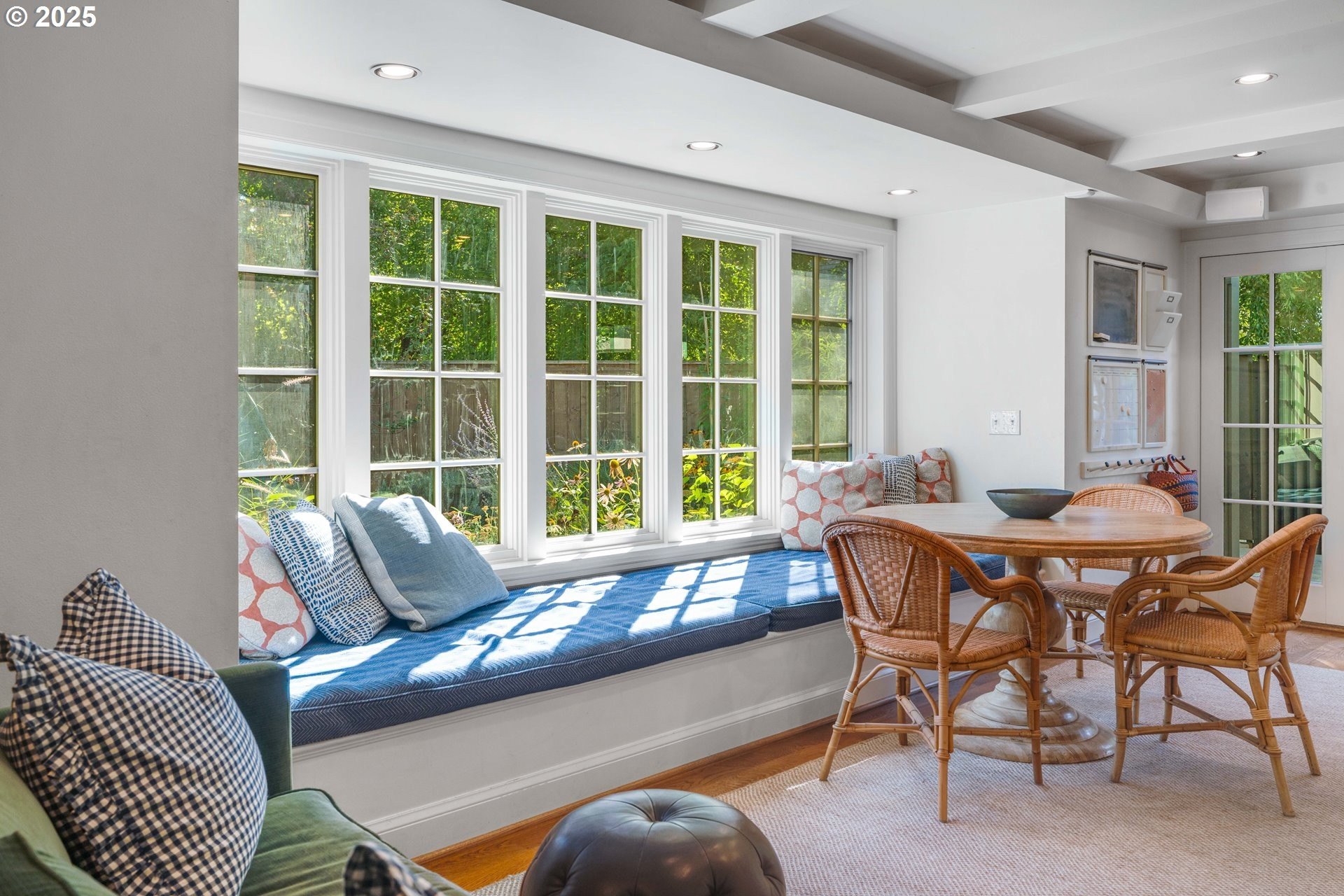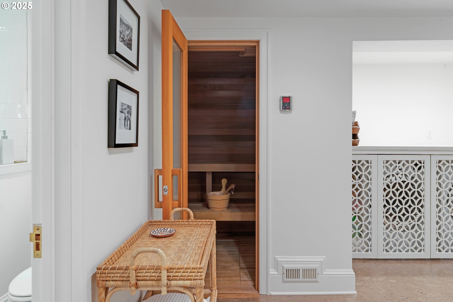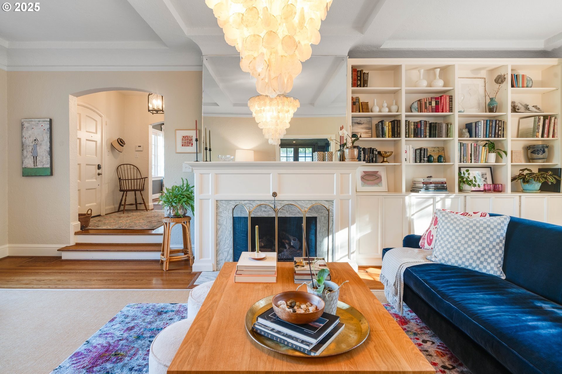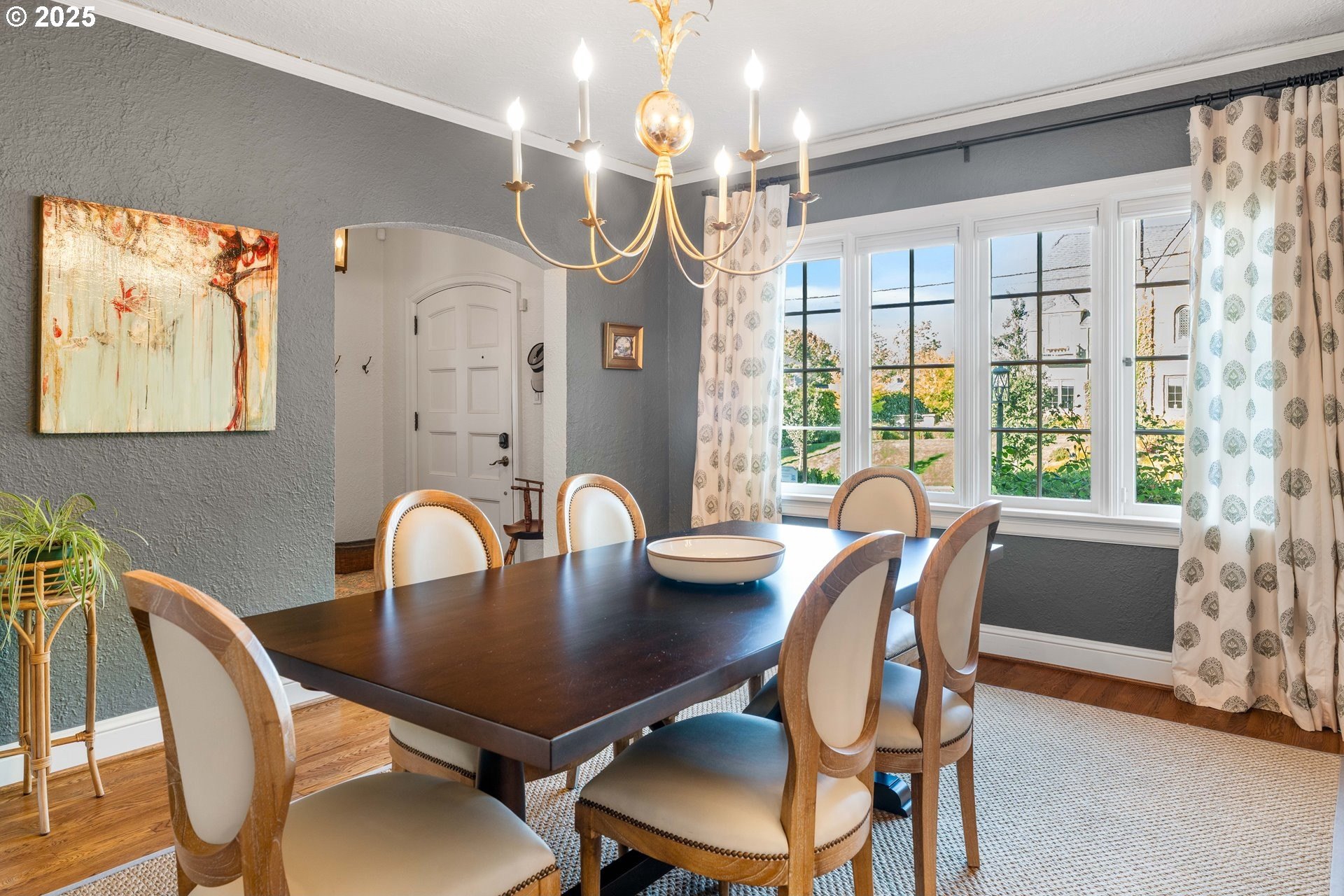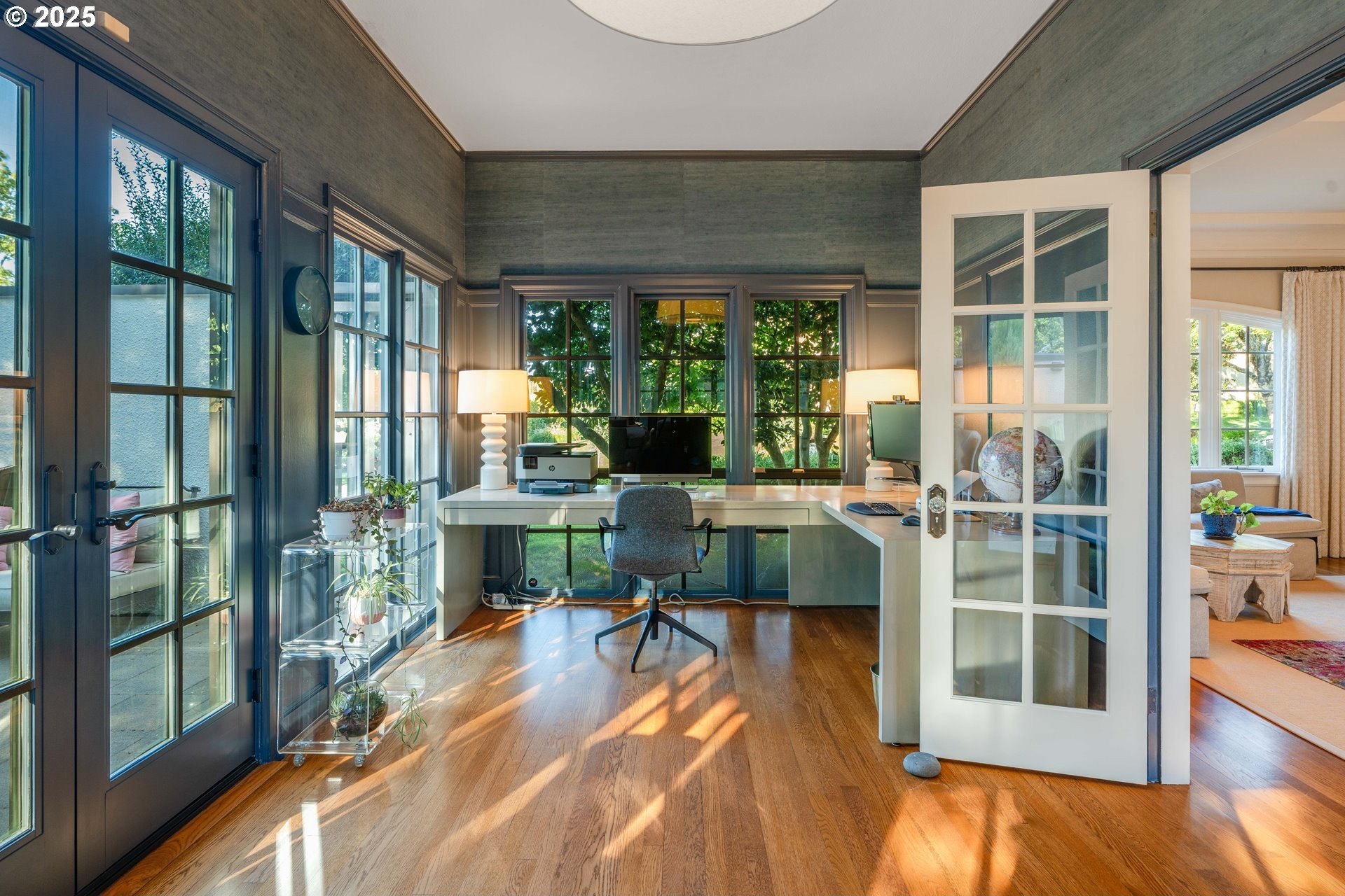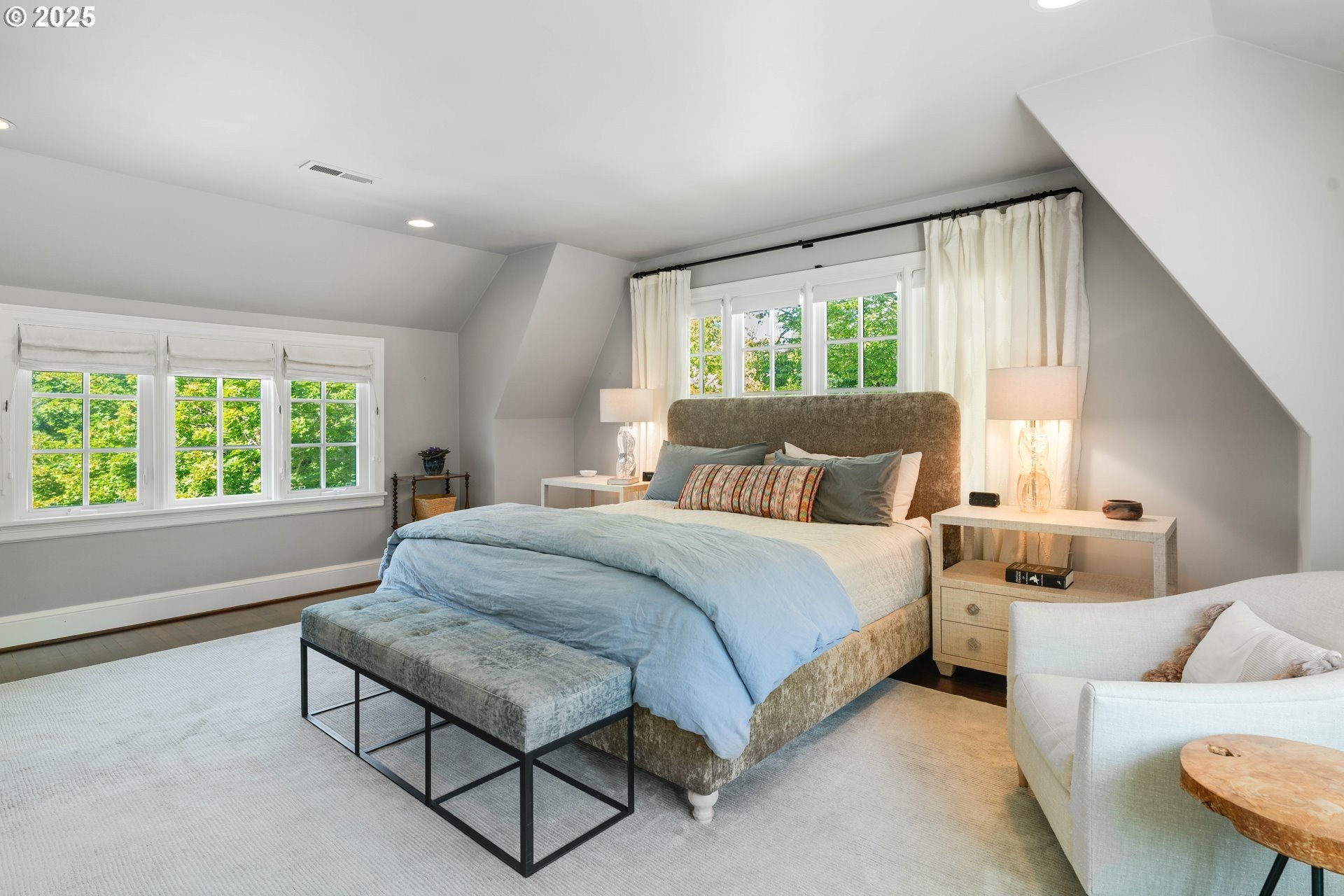 Step into timeless elegance with this stunning Tudor revival situated on a double lot in the premier block of Eastmoreland, offering five bedrooms, three and a half bathrooms, and exquisite details throughout. Off the entry, the formal living room welcomes you with a cozy fireplace, custom bookshelves, and coffered ceilings, while double doors open to a richly styled sunroom filled with character. Hardwood floors flow seamlessly through the main level, leading to a dining room adorned with a chandelier and original built-ins, as well as a chef’s kitchen with stainless steel appliances, double ovens, an island, and abundant storage. A charming breakfast nook with a custom window bench opens to a storybook courtyard, perfect for indoor-outdoor living. The lower level offers incredible versatility with a spacious bonus room featuring a fireplace, an additional bedroom, a full bath, laundry room, and a private sauna for relaxation. Upstairs, four bedrooms include a serene primary suite with a custom walk-in closet and spa-like en suite with soaking tub, glass shower, and dual vanity, complemented by a hallway bath and an office/flex space currently serving as an art studio. Outside, the manicured backyard evokes an English countryside garden, offering lush landscaping and privacy. Ideally situated, it’s an easy walk to Westmoreland Park, the Crystal Springs Rhododendron Gardens, and all the offerings of the charming Sellwood-Moreland neighborhood.