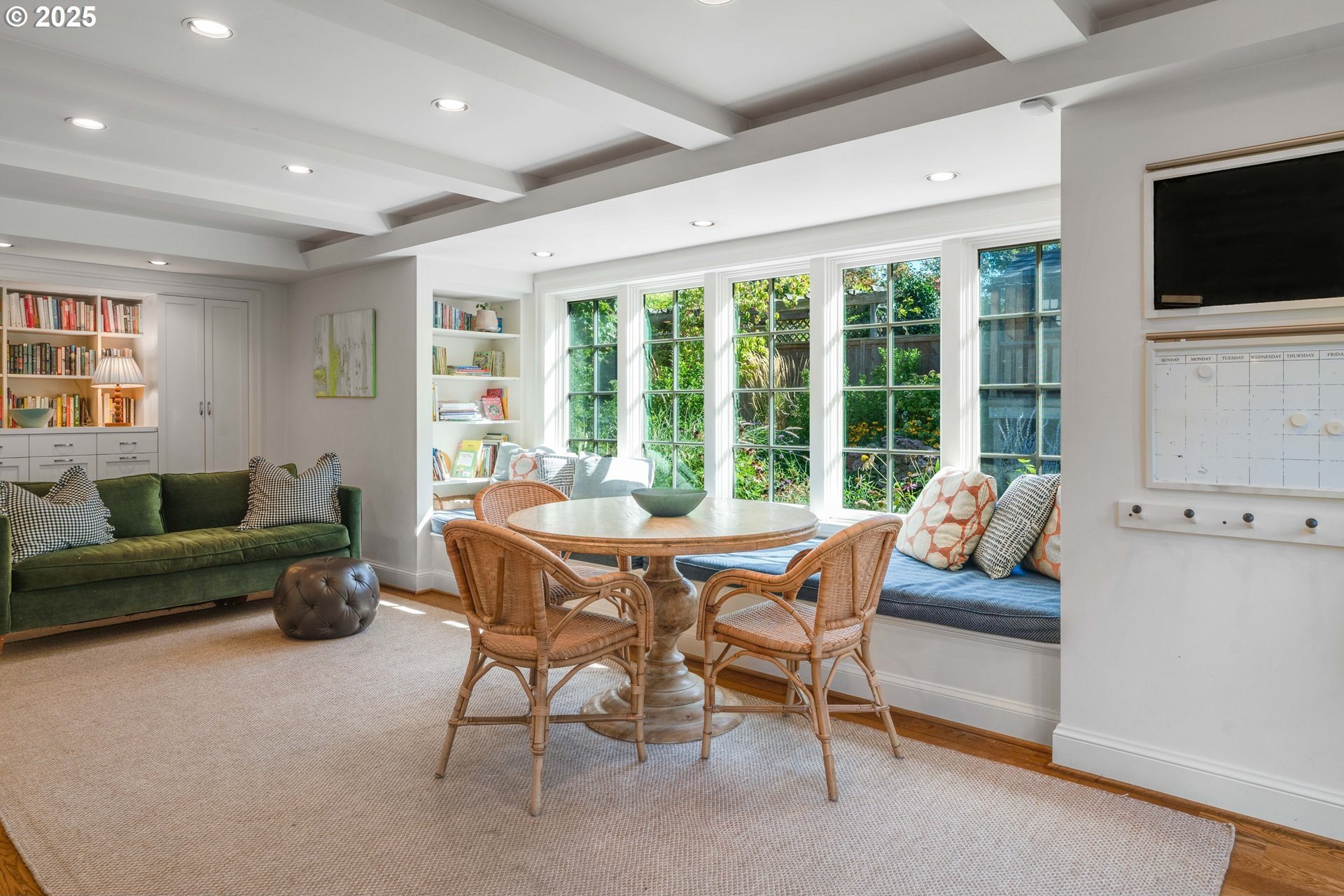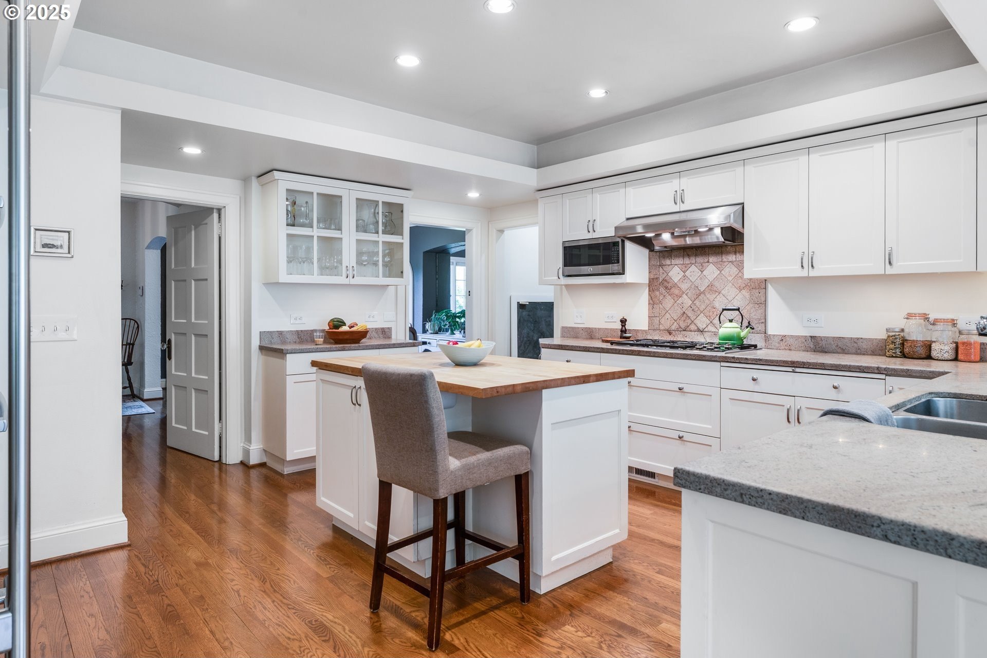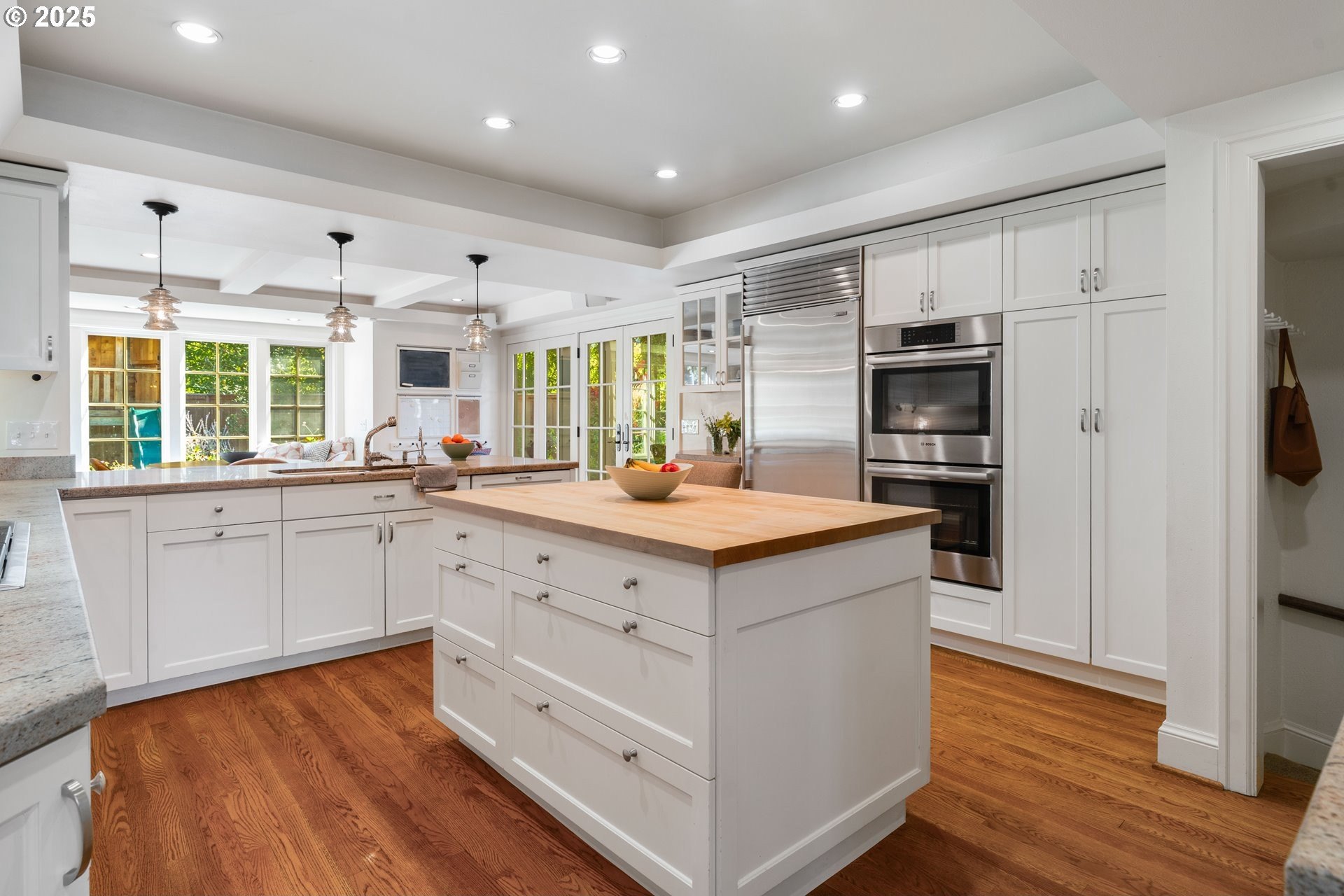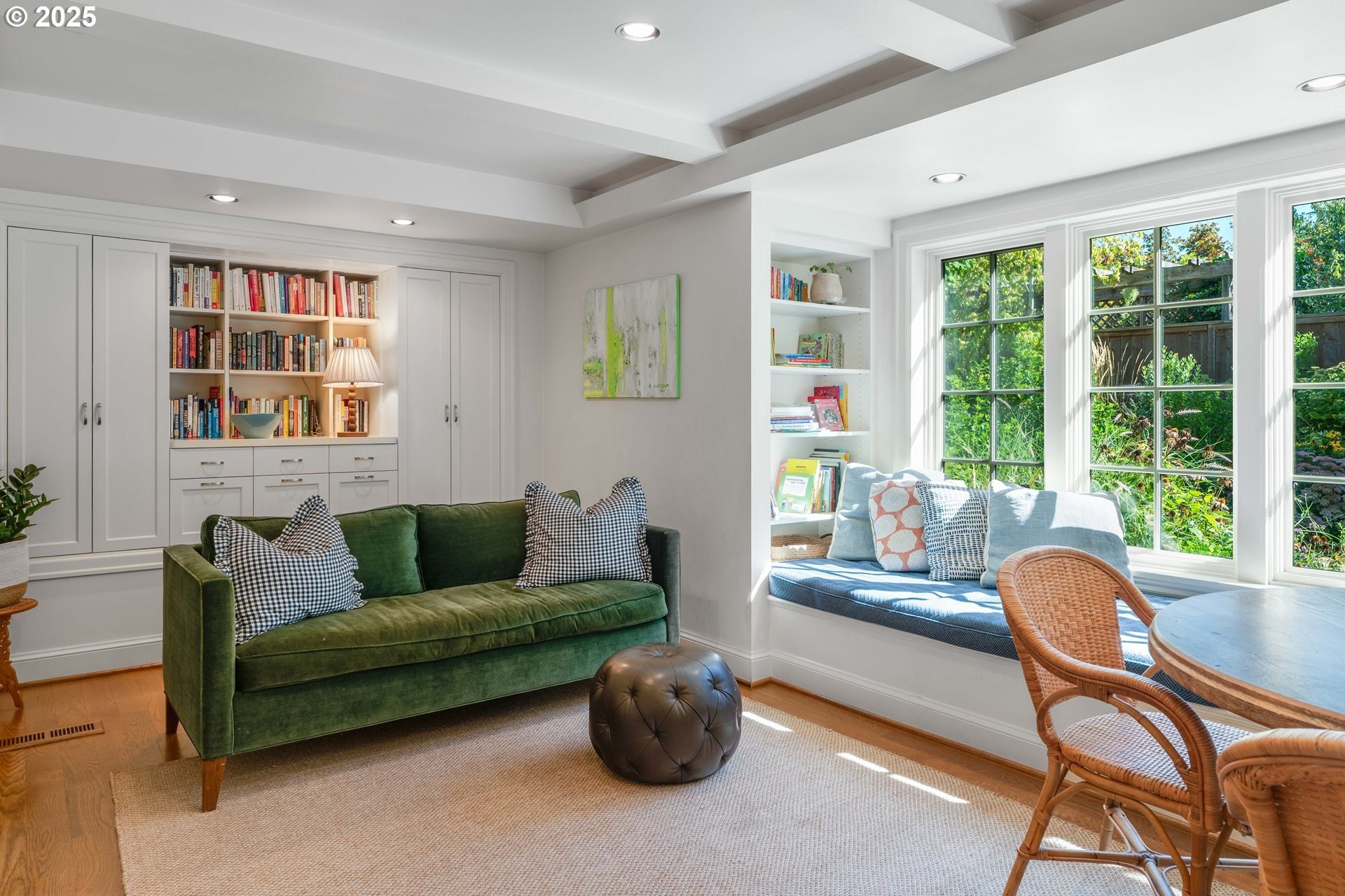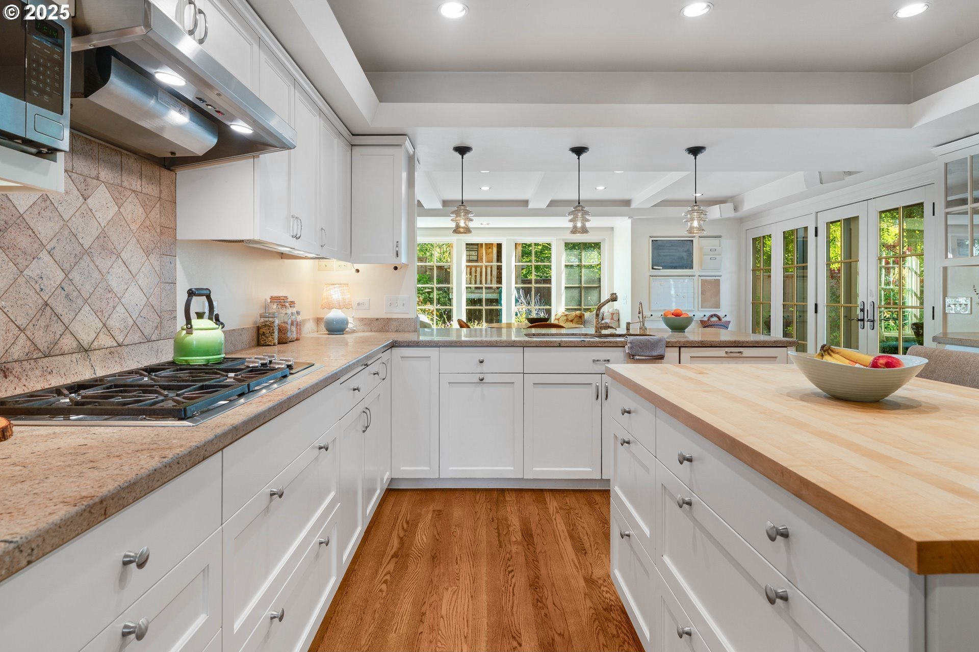 Step into timeless elegance with this stunning Tudor revival situated on a double lot in the premier block of Eastmoreland, offering five bedrooms, three and a half bathrooms, and exquisite details throughout. Off the entry, the formal living room welcomes you with a cozy fireplace, custom bookshelves, and coffered ceilings, while double doors open to a richly styled sunroom filled with character. Hardwood floors flow seamlessly through the main level, leading to a dining room adorned with a chandelier and original built-ins, as well as a chef’s kitchen with stainless steel appliances, double ovens, an island, and abundant storage. A charming breakfast nook with a custom window bench opens to a storybook courtyard, perfect for indoor-outdoor living. The lower level offers incredible versatility with a spacious bonus room featuring a fireplace, an additional bedroom, a full bath, laundry room, and a private sauna for relaxation. Upstairs, four bedrooms include a serene primary suite with a custom walk-in closet and spa-like en suite with soaking tub, glass shower, and dual vanity, complemented by a hallway bath and an office/flex space currently serving as an art studio. Outside, the manicured backyard evokes an English countryside garden, offering lush landscaping and privacy. Ideally situated, it’s an easy walk to Westmoreland Park, the Crystal Springs Rhododendron Gardens, and all the offerings of the charming Sellwood-Moreland neighborhood.