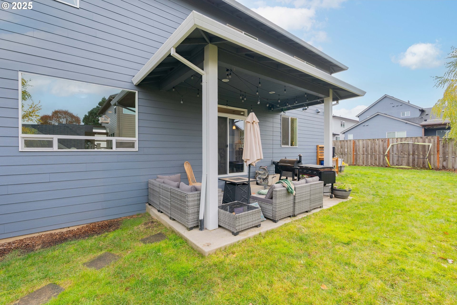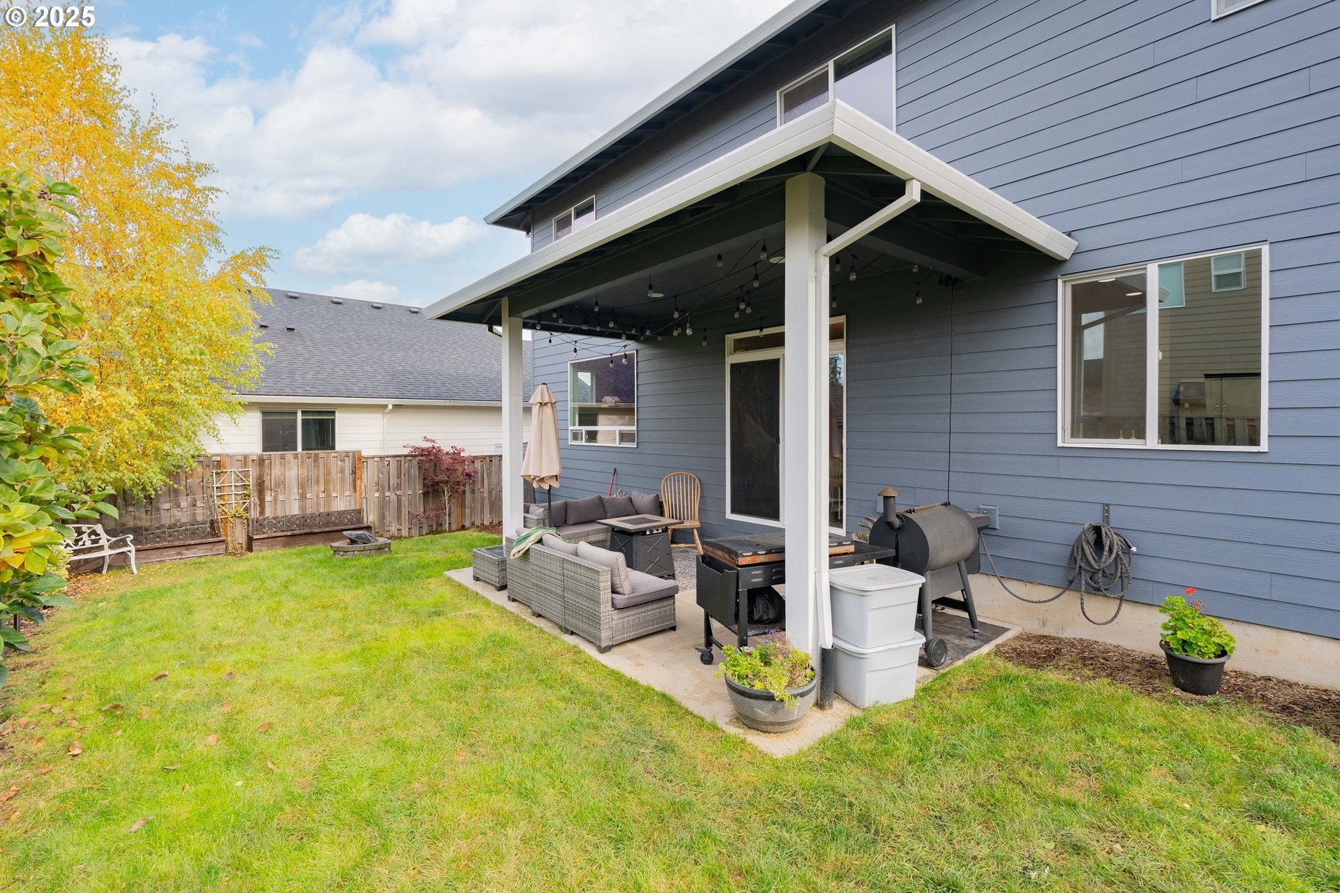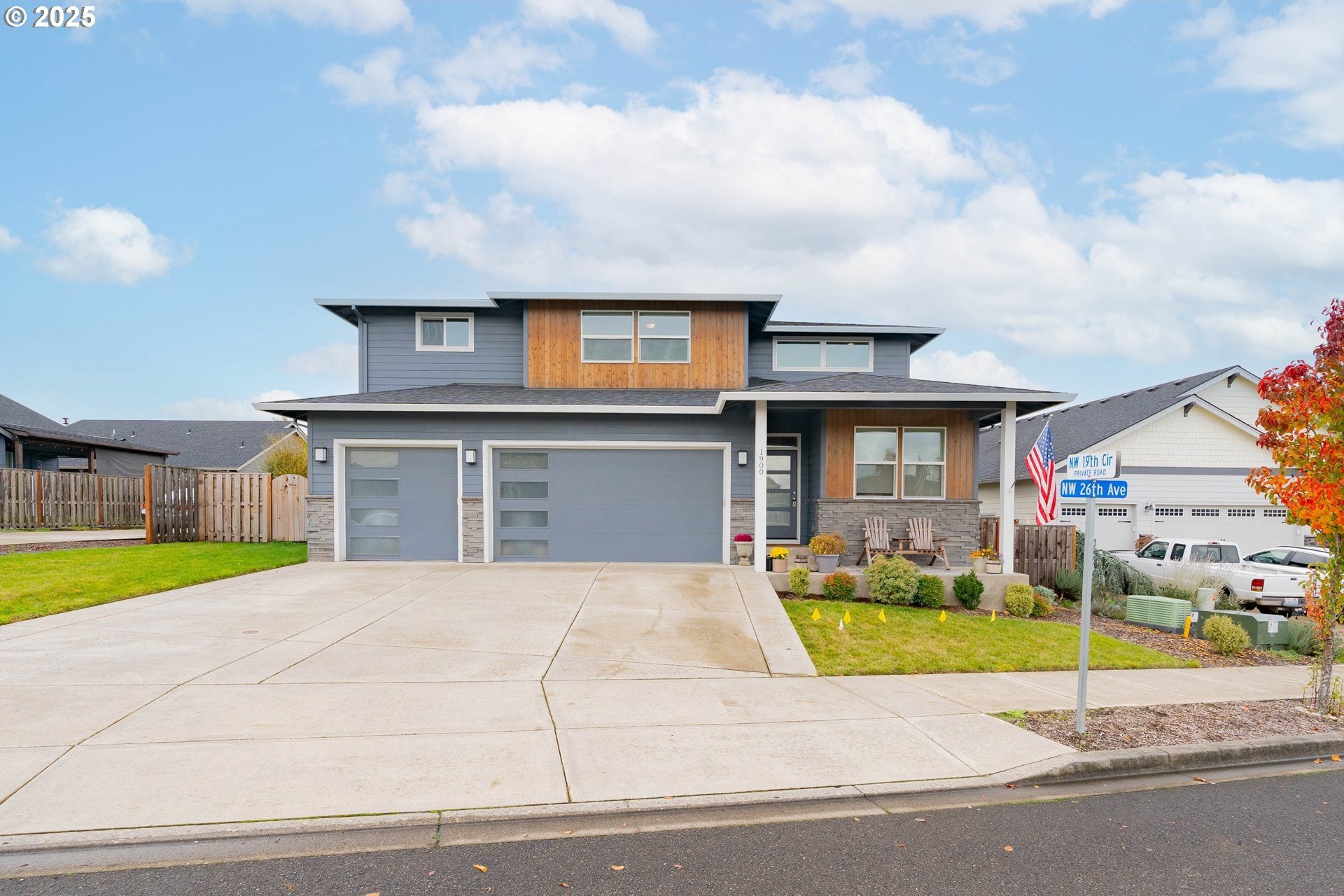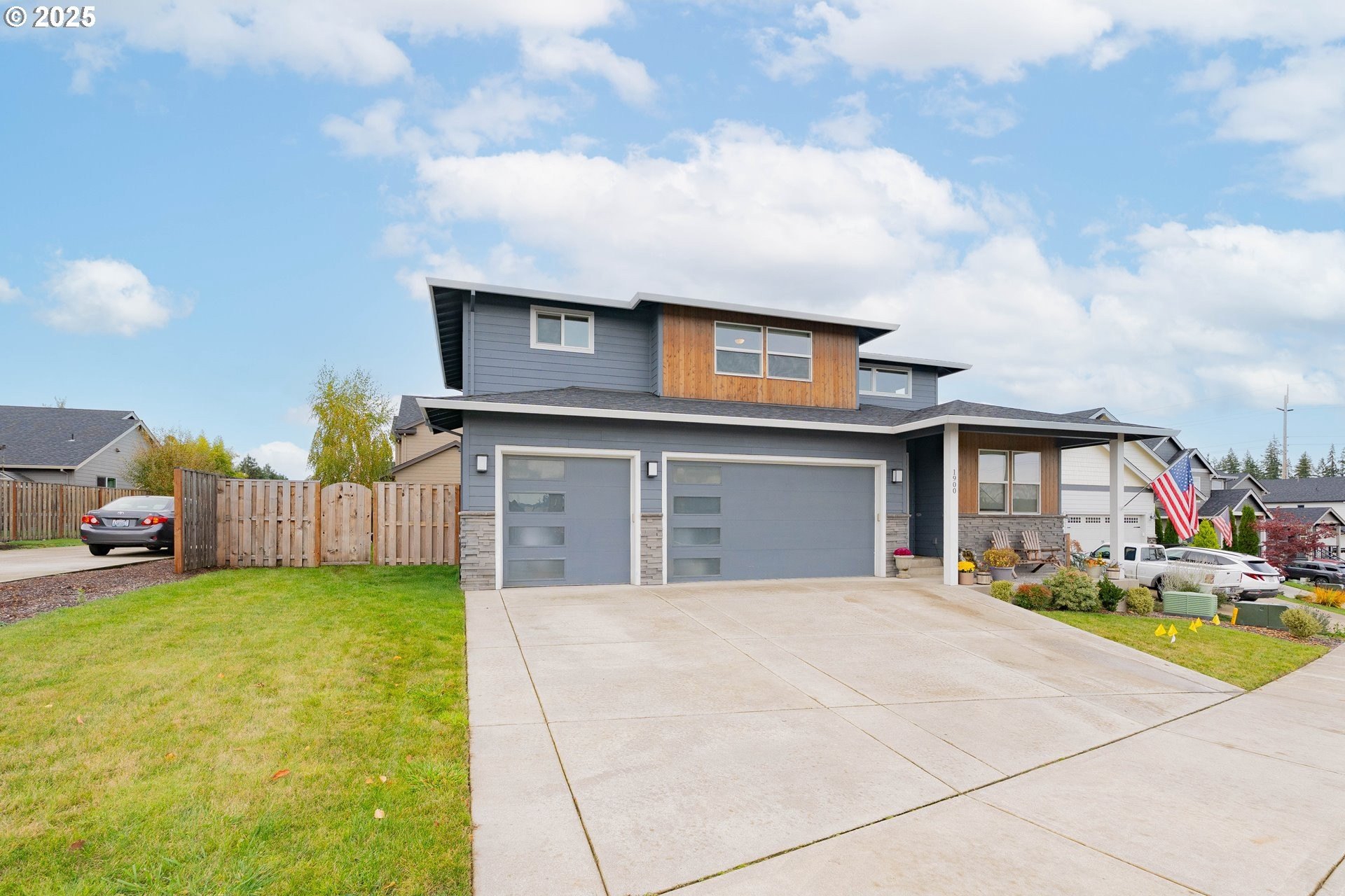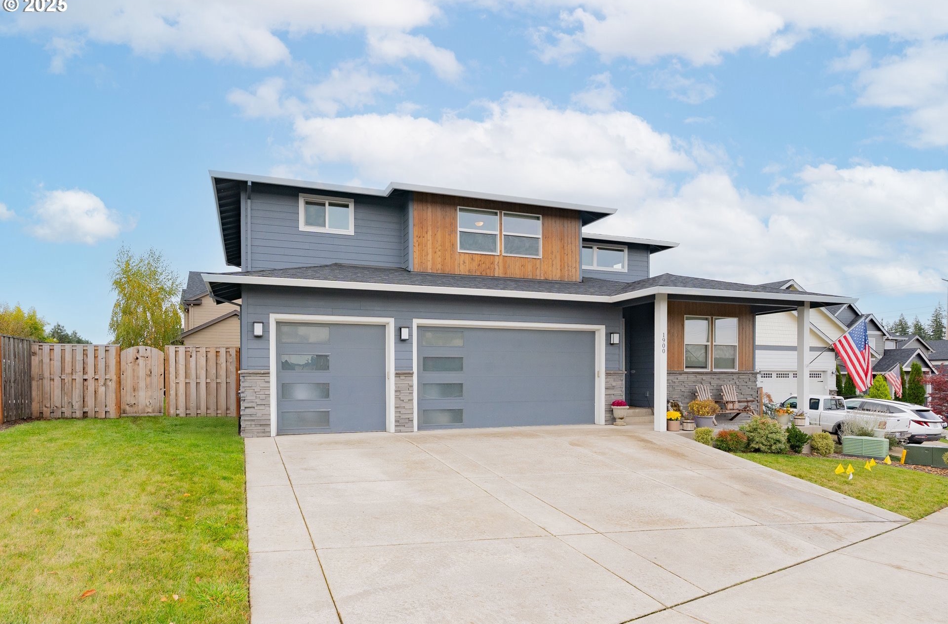 Stylish inside and out! From its contemporary Prairie-style architecture to the striking stacked-stone fireplace surround, this 2019-built home blends modern design with everyday comfort. Offering 2,110 sq ft of thoughtfully designed living space, it includes 4 bedrooms and 2.5 bathrooms. The main level features an open floor plan with high ceilings and warm-toned, easy-care Luxury Vinyl Plank flooring throughout. Off the foyer, French doors open to a spacious office/flex space. The great/living room is the heart of the home - bright and inviting with a large picture window overlooking the backyard and a gas fireplace framed by beautiful, stacked-stone as the focal point. The kitchen seamlessly combines style and function with sleek quartz countertops, an eating bar, pendant lighting, Shaker-style cabinetry, a pantry, and stainless-steel appliances. Sliding doors from the dining area open to a large, covered patio – allowing for tons of natural light and easy indoor/outdoor living. Upstairs, you’ll find 3 good-sized bedrooms plus a spacious owner’s suite featuring a large spa-inspired ensuite with a dual-sink quartz vanity, soaking tub, separate shower, and walk-in closet. Outdoors, you will find a manicured yard, with the backyard fully fenced and complete with a covered patio, firepit, raised garden beds, and plenty of space to relax or play. An attached 3-car garage provides ample space for vehicles, storage, or hobbies. Conveniently located near schools, parks, and all that downtown Battle Ground has to offer - dining, shopping, and more - this chic, functional home is move-in ready. Welcome Home! Open House this Saturday, November 8 from 12-2pm - Join Us!