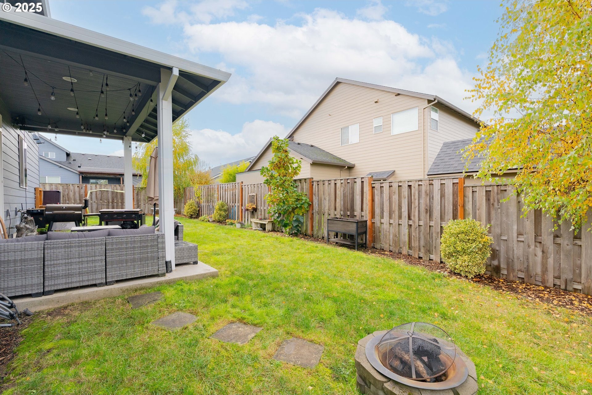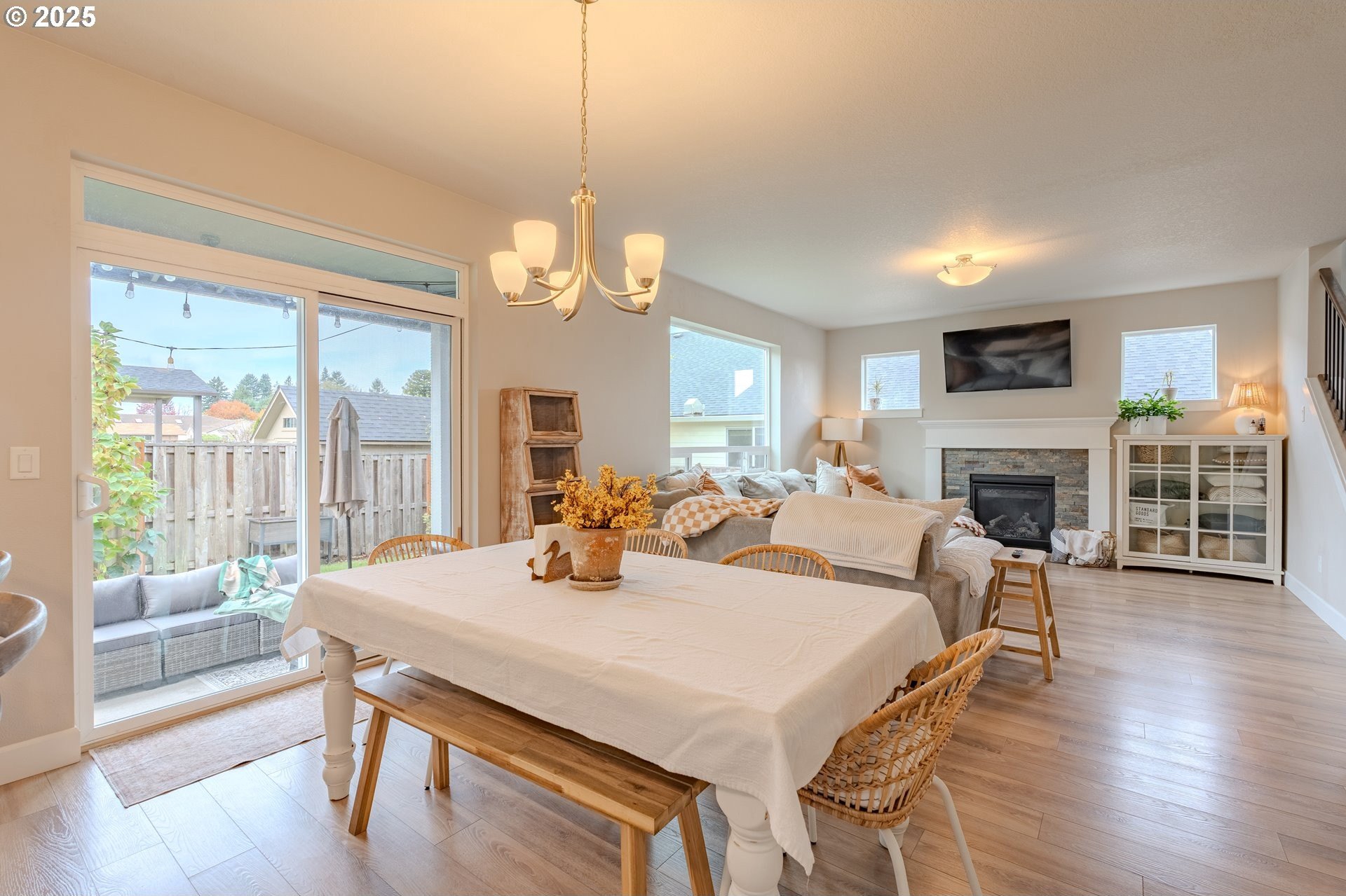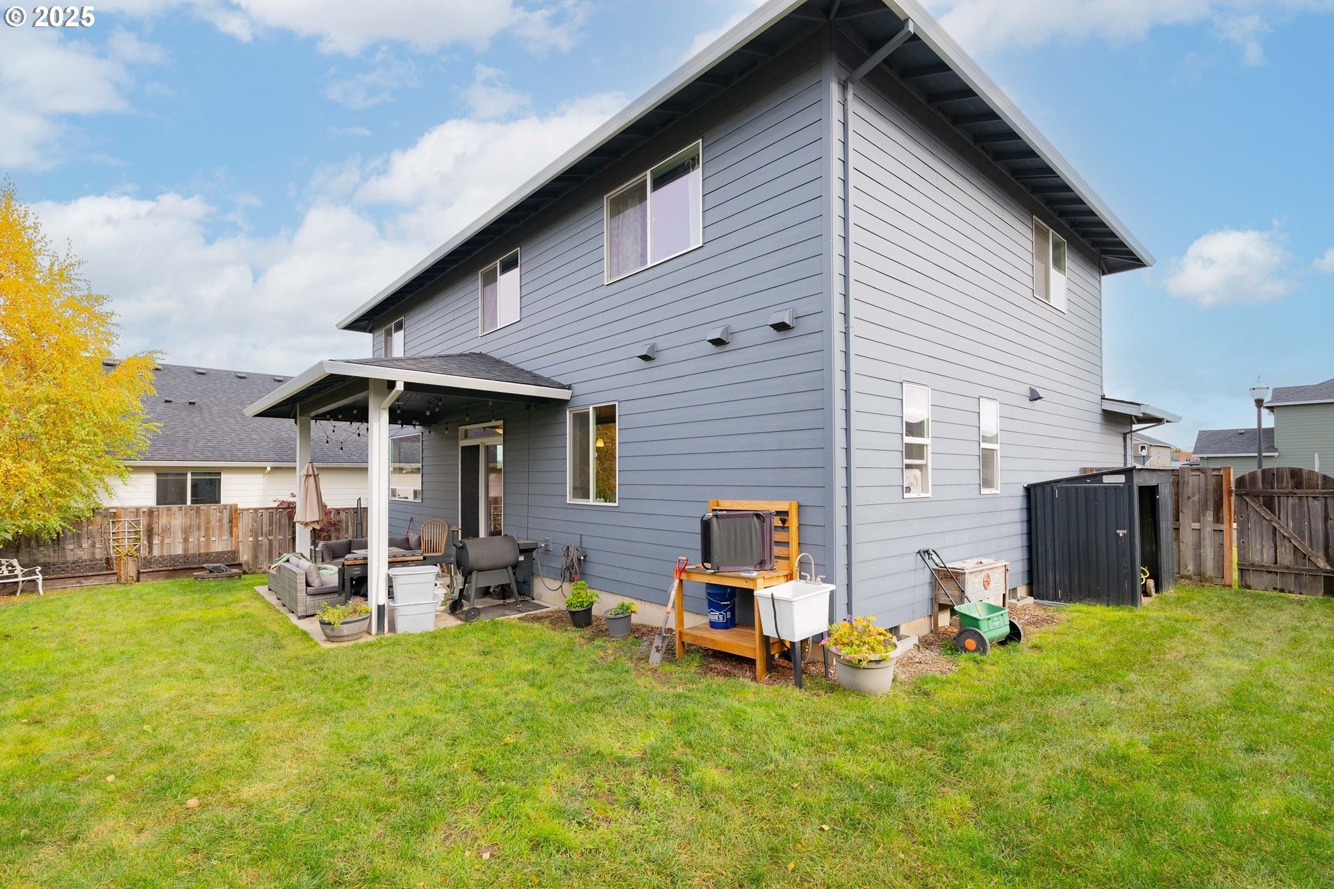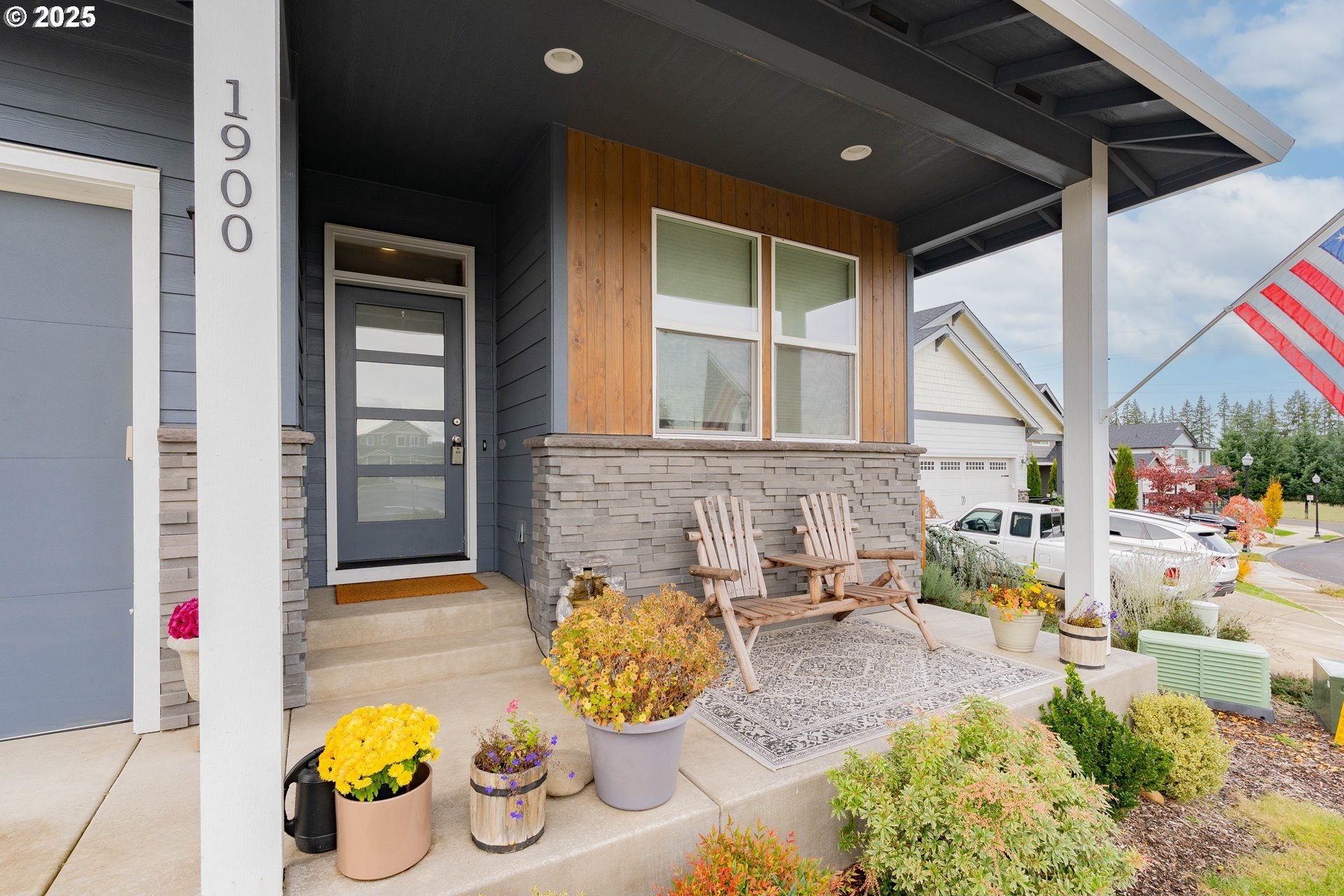 Stylish inside and out! From its contemporary Prairie-style architecture to the striking stacked-stone fireplace surround, this 2019-built home blends modern design with everyday comfort. Offering 2,110 sq ft of thoughtfully designed living space, it includes 4 bedrooms and 2.5 bathrooms. The main level features an open floor plan with high ceilings and warm-toned, easy-care Luxury Vinyl Plank flooring throughout. Off the foyer, French doors open to a spacious office/flex space. The great/living room is the heart of the home - bright and inviting with a large picture window overlooking the backyard and a gas fireplace framed by beautiful, stacked-stone as the focal point. The kitchen seamlessly combines style and function with sleek quartz countertops, an eating bar, pendant lighting, Shaker-style cabinetry, a pantry, and stainless-steel appliances. Sliding doors from the dining area open to a large, covered patio – allowing for tons of natural light and easy indoor/outdoor living. Upstairs, you’ll find 3 good-sized bedrooms plus a spacious owner’s suite featuring a large spa-inspired ensuite with a dual-sink quartz vanity, soaking tub, separate shower, and walk-in closet. Outdoors, you will find a manicured yard, with the backyard fully fenced and complete with a covered patio, firepit, raised garden beds, and plenty of space to relax or play. An attached 3-car garage provides ample space for vehicles, storage, or hobbies. Conveniently located near schools, parks, and all that downtown Battle Ground has to offer - dining, shopping, and more - this chic, functional home is move-in ready. Welcome Home! Open House this Saturday, November 8 from 12-2pm - Join Us!