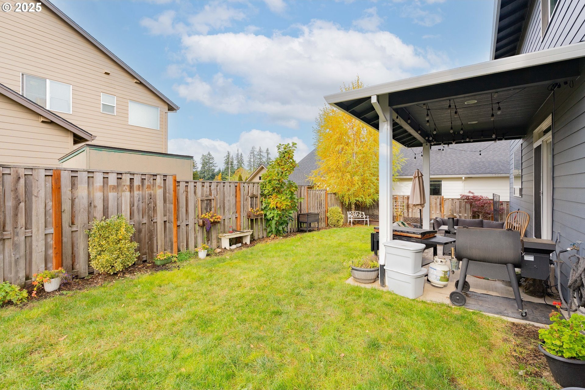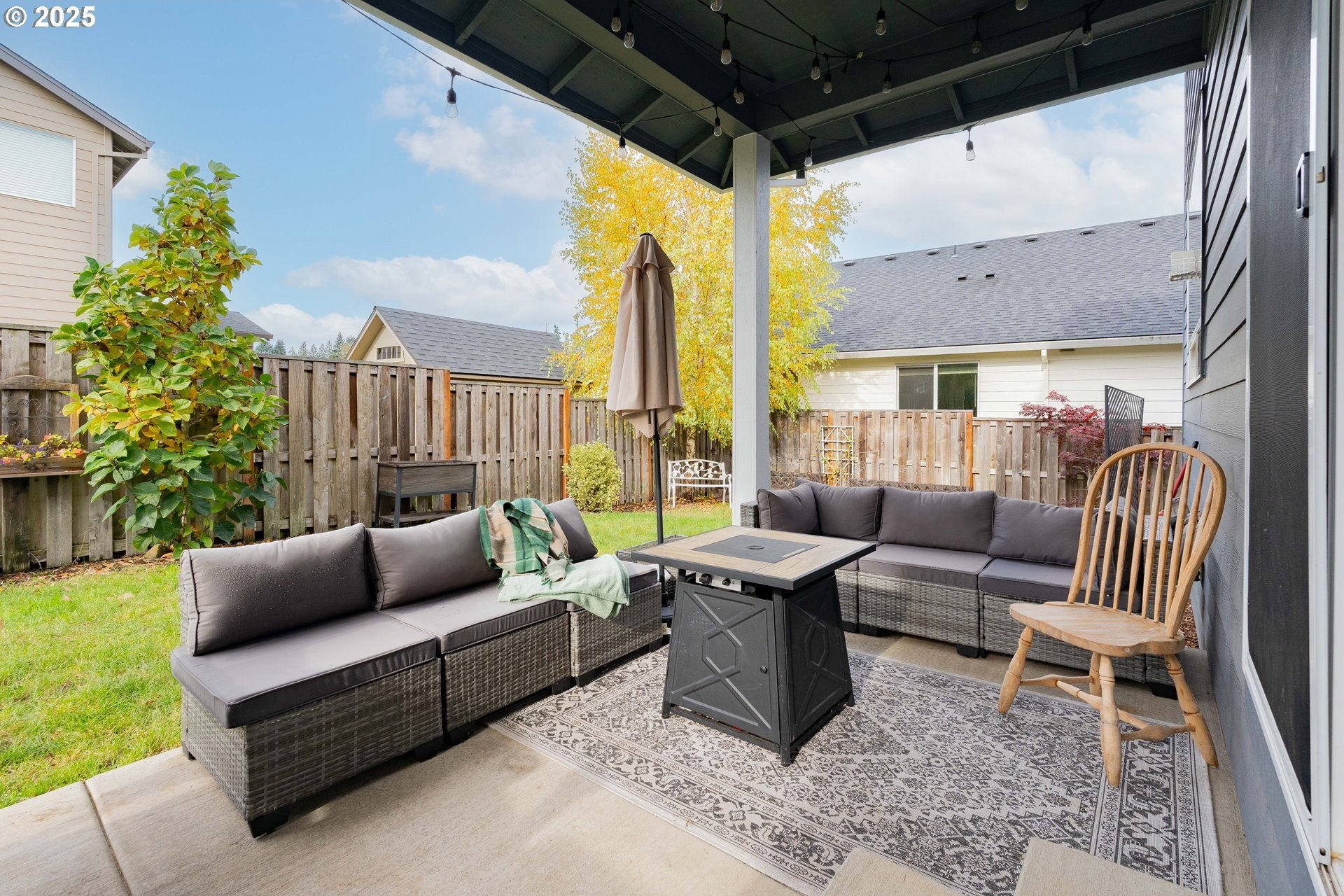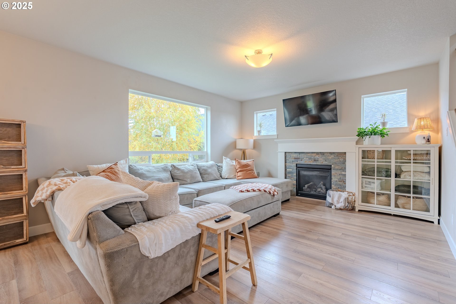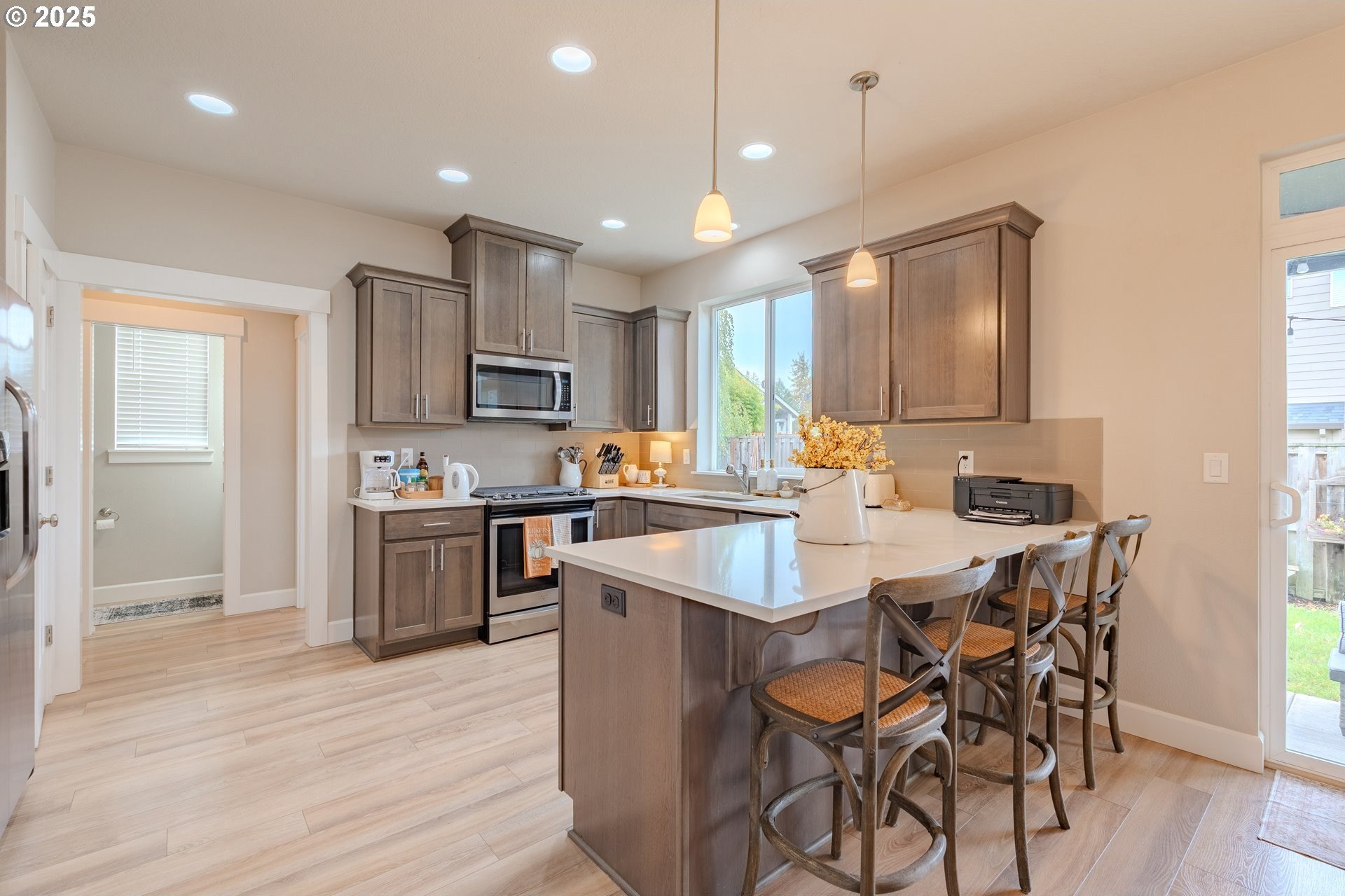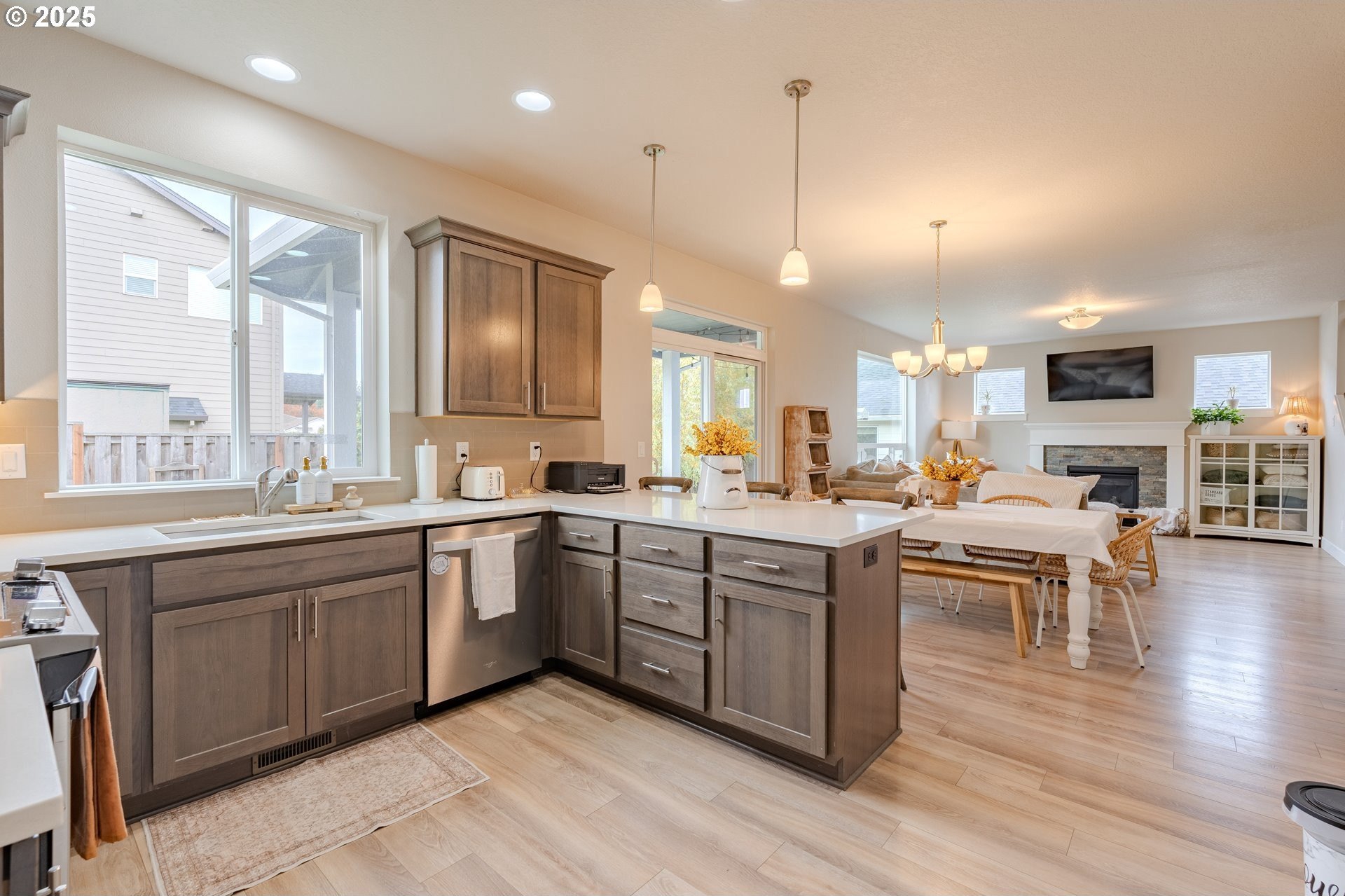 Stylish inside and out! From its contemporary Prairie-style architecture to the striking stacked-stone fireplace surround, this 2019-built home blends modern design with everyday comfort. Offering 2,110 sq ft of thoughtfully designed living space, it includes 4 bedrooms and 2.5 bathrooms. The main level features an open floor plan with high ceilings and warm-toned, easy-care Luxury Vinyl Plank flooring throughout. Off the foyer, French doors open to a spacious office/flex space. The great/living room is the heart of the home - bright and inviting with a large picture window overlooking the backyard and a gas fireplace framed by beautiful, stacked-stone as the focal point. The kitchen seamlessly combines style and function with sleek quartz countertops, an eating bar, pendant lighting, Shaker-style cabinetry, a pantry, and stainless-steel appliances. Sliding doors from the dining area open to a large, covered patio – allowing for tons of natural light and easy indoor/outdoor living. Upstairs, you’ll find 3 good-sized bedrooms plus a spacious owner’s suite featuring a large spa-inspired ensuite with a dual-sink quartz vanity, soaking tub, separate shower, and walk-in closet. Outdoors, you will find a manicured yard, with the backyard fully fenced and complete with a covered patio, firepit, raised garden beds, and plenty of space to relax or play. An attached 3-car garage provides ample space for vehicles, storage, or hobbies. Conveniently located near schools, parks, and all that downtown Battle Ground has to offer - dining, shopping, and more - this chic, functional home is move-in ready. Welcome Home! Open House this Saturday, November 8 from 12-2pm - Join Us!