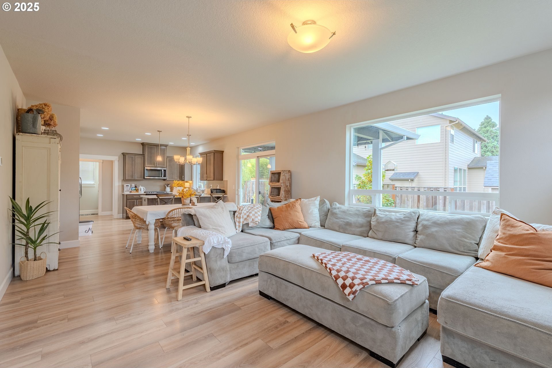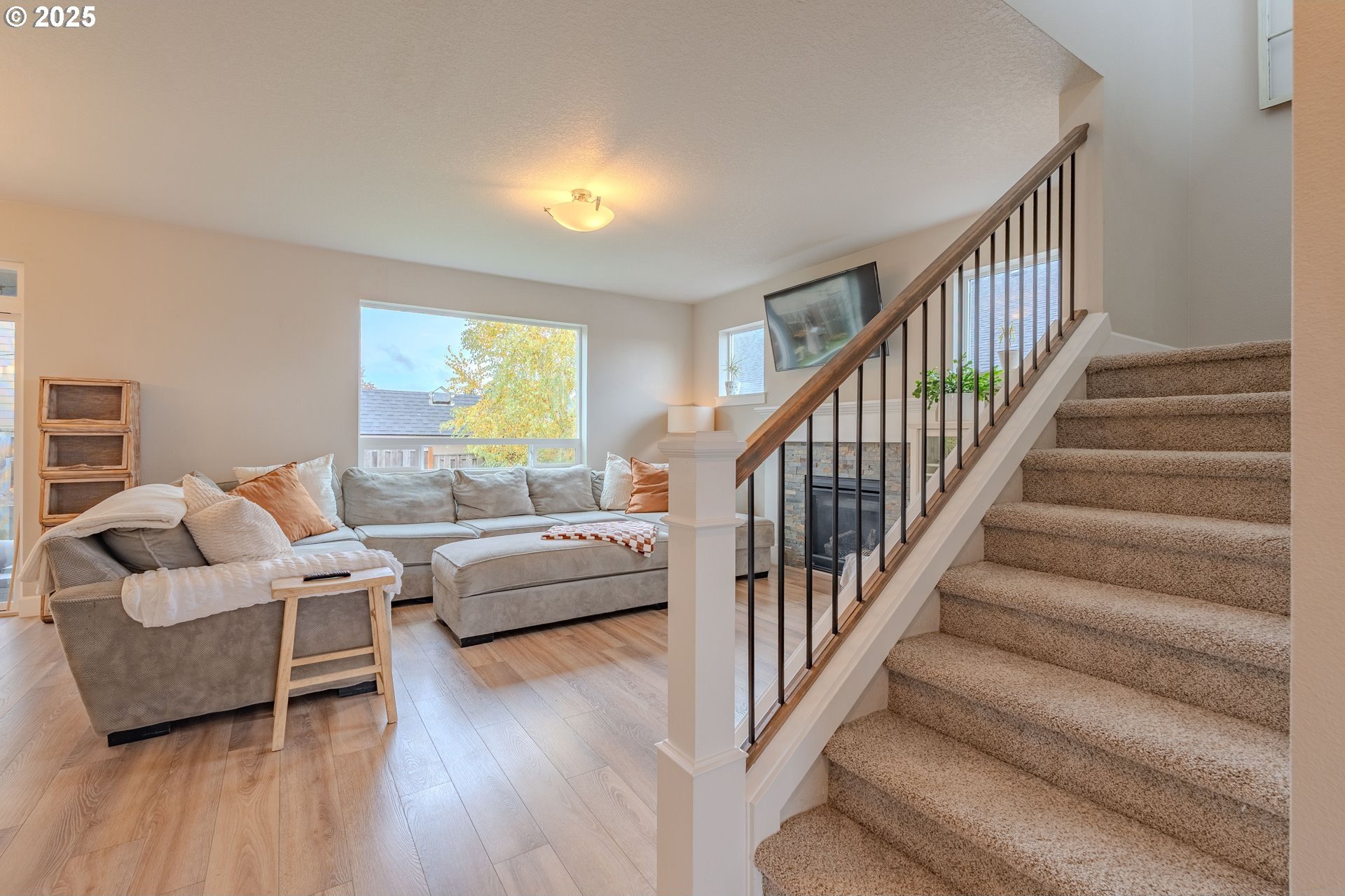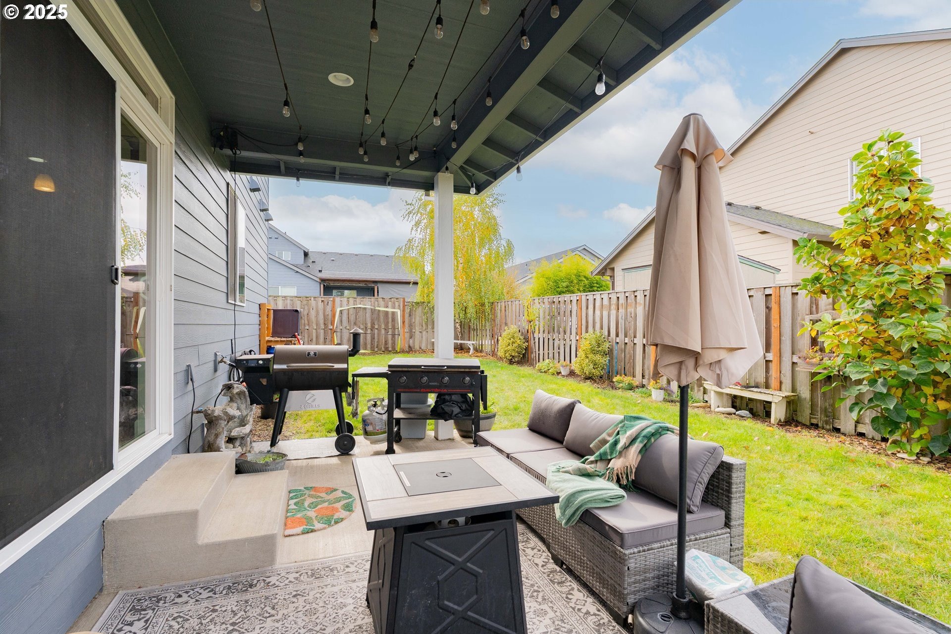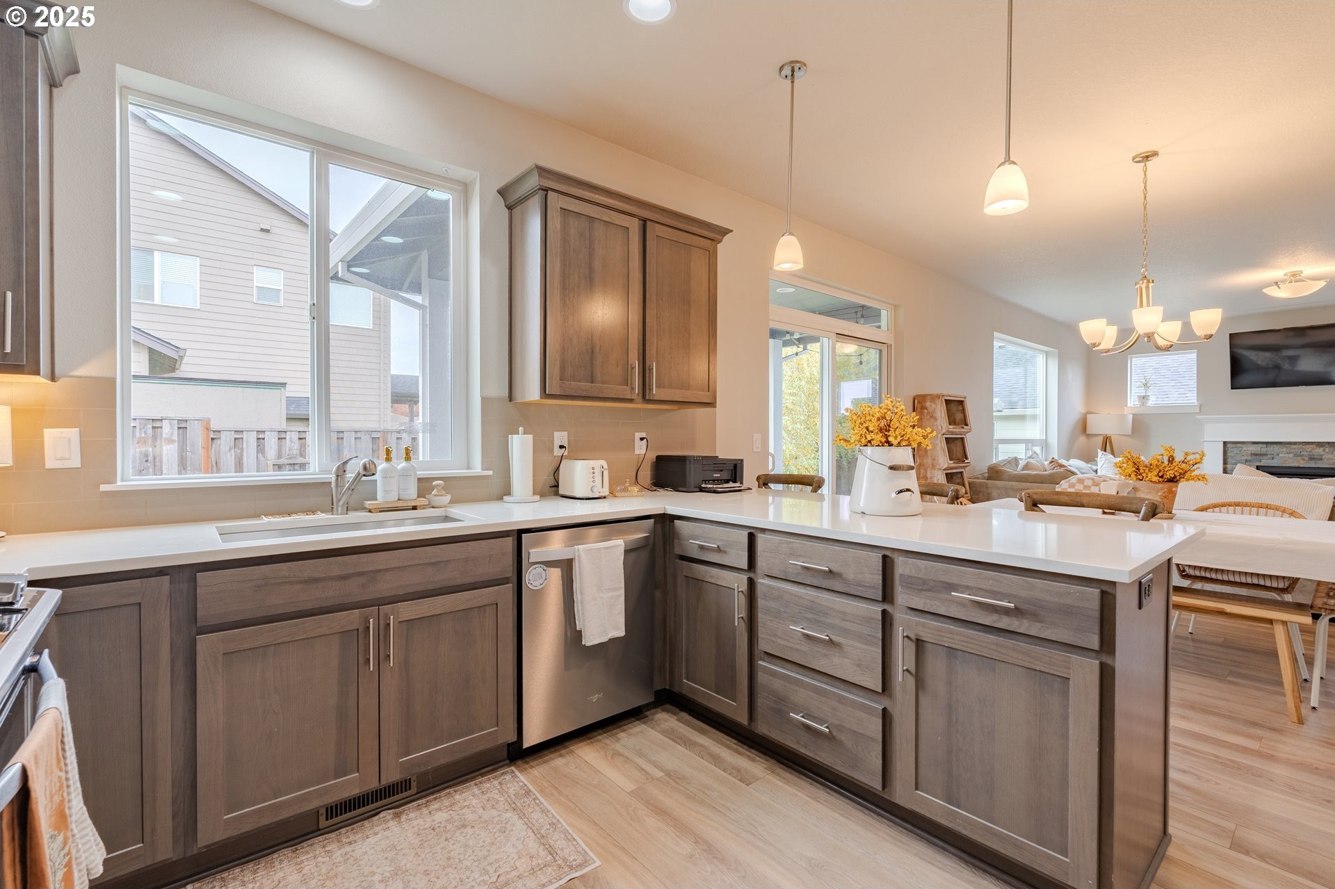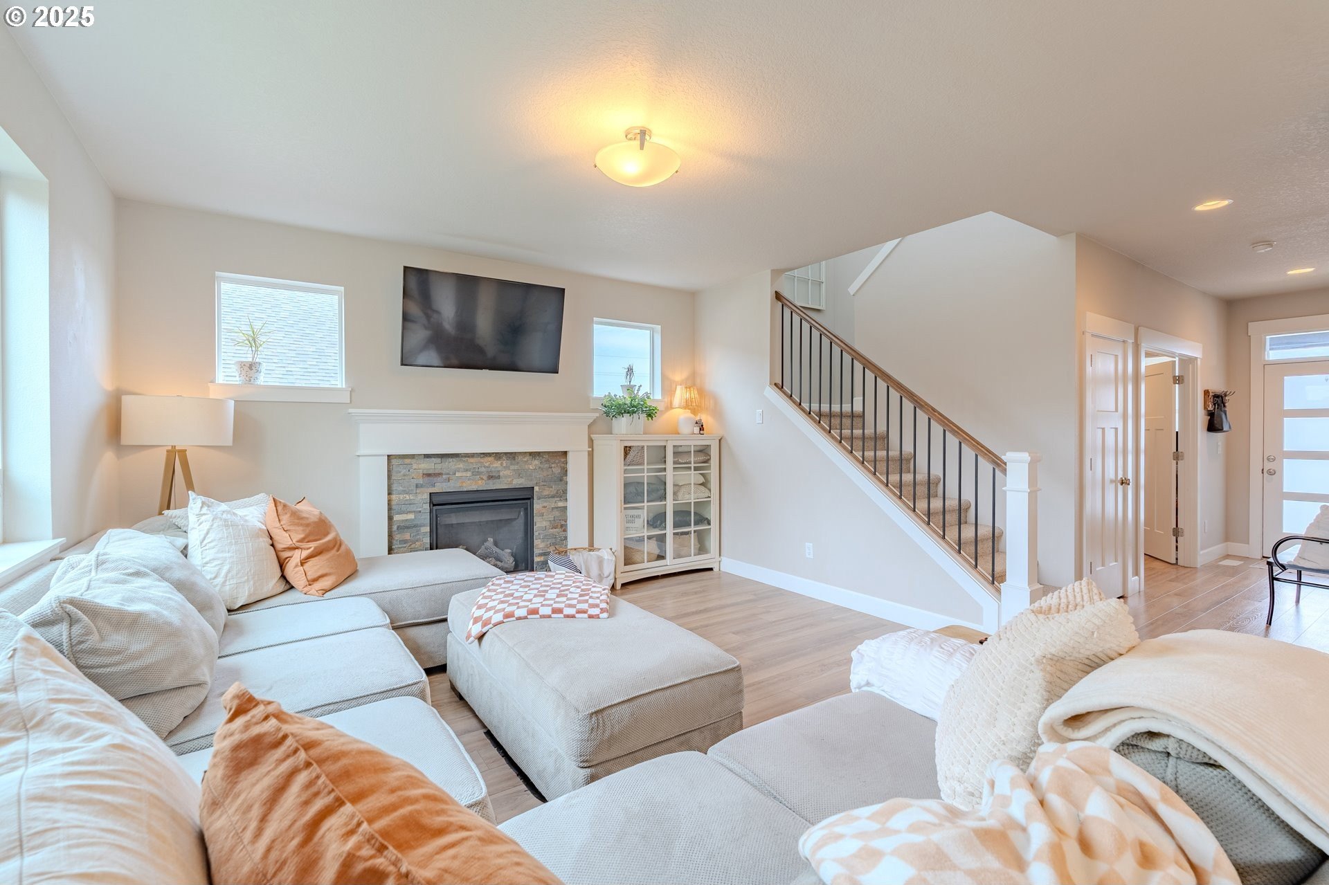 Stylish inside and out! From its contemporary Prairie-style architecture to the striking stacked-stone fireplace surround, this 2019-built home blends modern design with everyday comfort. Offering 2,110 sq ft of thoughtfully designed living space, it includes 4 bedrooms and 2.5 bathrooms. The main level features an open floor plan with high ceilings and warm-toned, easy-care Luxury Vinyl Plank flooring throughout. Off the foyer, French doors open to a spacious office/flex space. The great/living room is the heart of the home - bright and inviting with a large picture window overlooking the backyard and a gas fireplace framed by beautiful, stacked-stone as the focal point. The kitchen seamlessly combines style and function with sleek quartz countertops, an eating bar, pendant lighting, Shaker-style cabinetry, a pantry, and stainless-steel appliances. Sliding doors from the dining area open to a large, covered patio – allowing for tons of natural light and easy indoor/outdoor living. Upstairs, you’ll find 3 good-sized bedrooms plus a spacious owner’s suite featuring a large spa-inspired ensuite with a dual-sink quartz vanity, soaking tub, separate shower, and walk-in closet. Outdoors, you will find a manicured yard, with the backyard fully fenced and complete with a covered patio, firepit, raised garden beds, and plenty of space to relax or play. An attached 3-car garage provides ample space for vehicles, storage, or hobbies. Conveniently located near schools, parks, and all that downtown Battle Ground has to offer - dining, shopping, and more - this chic, functional home is move-in ready. Welcome Home! Open House this Saturday, November 8 from 12-2pm - Join Us!