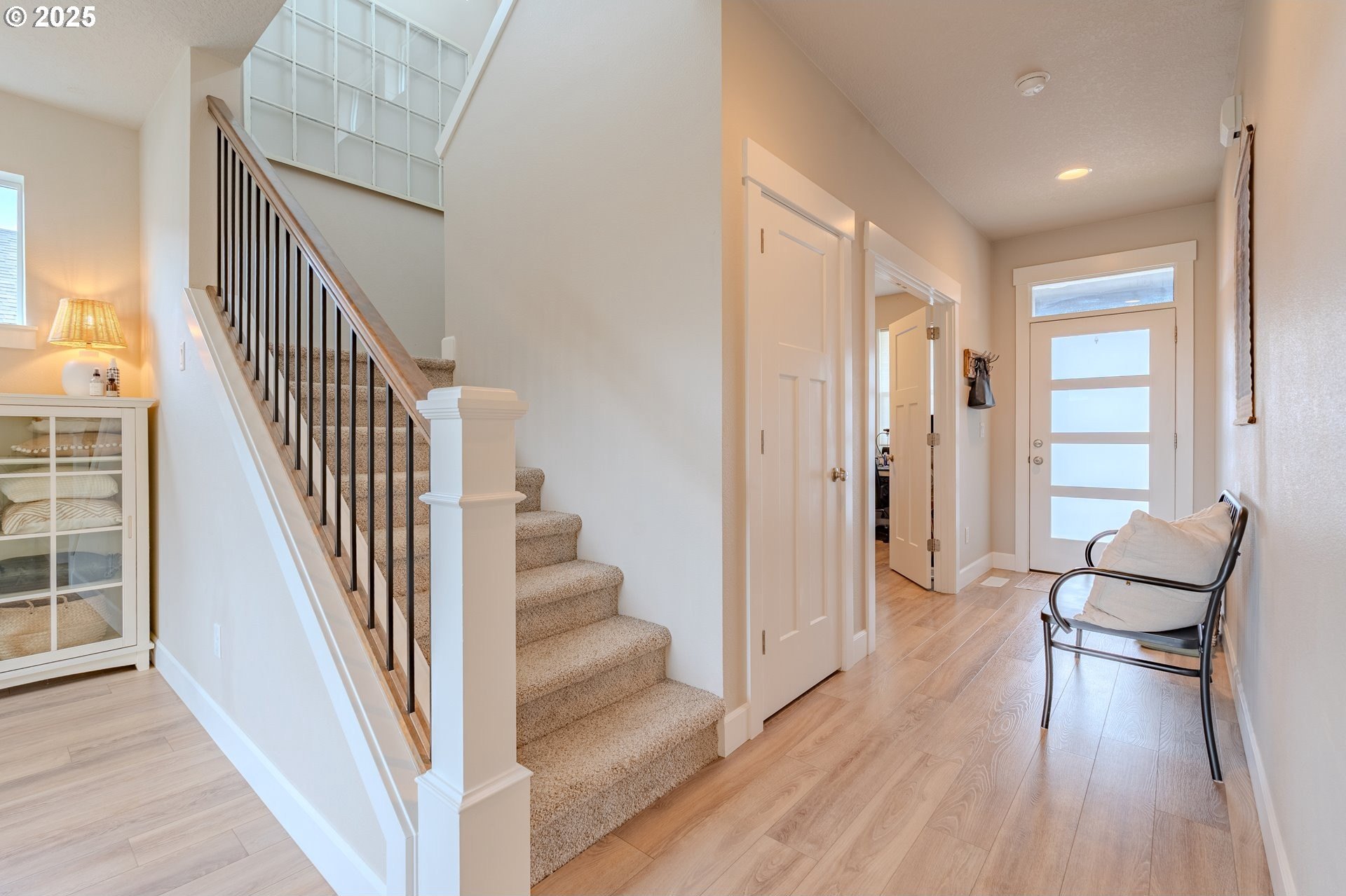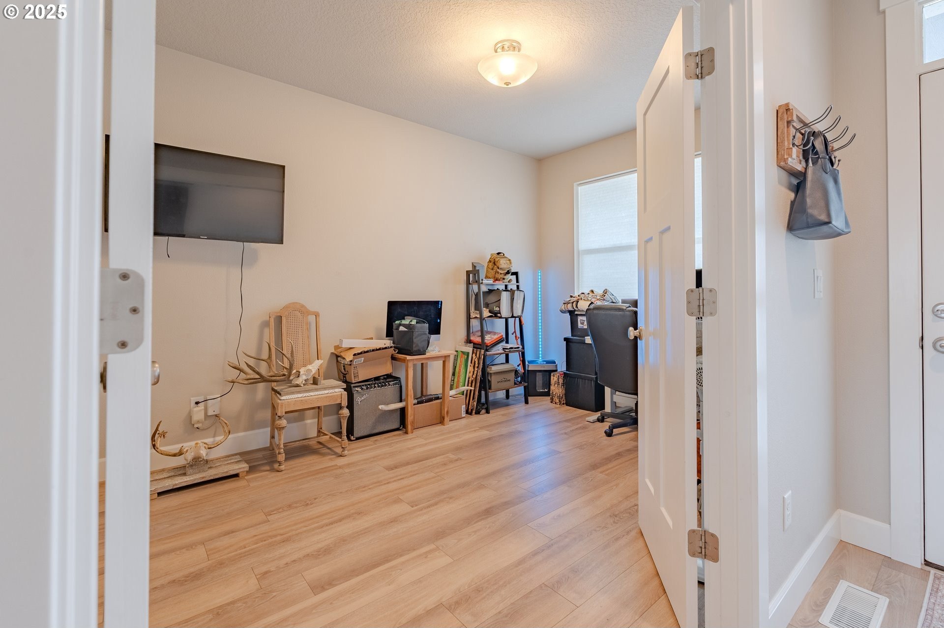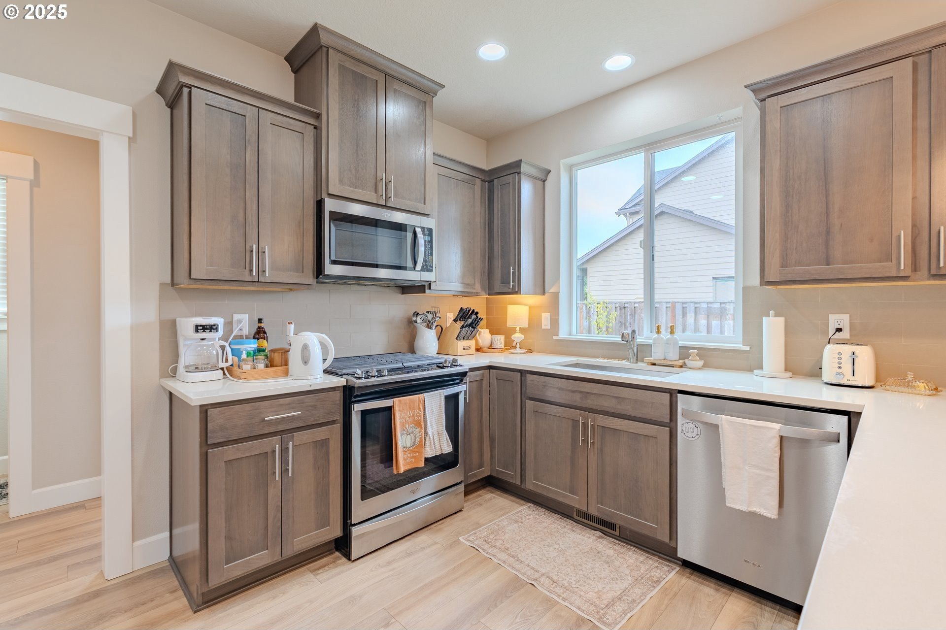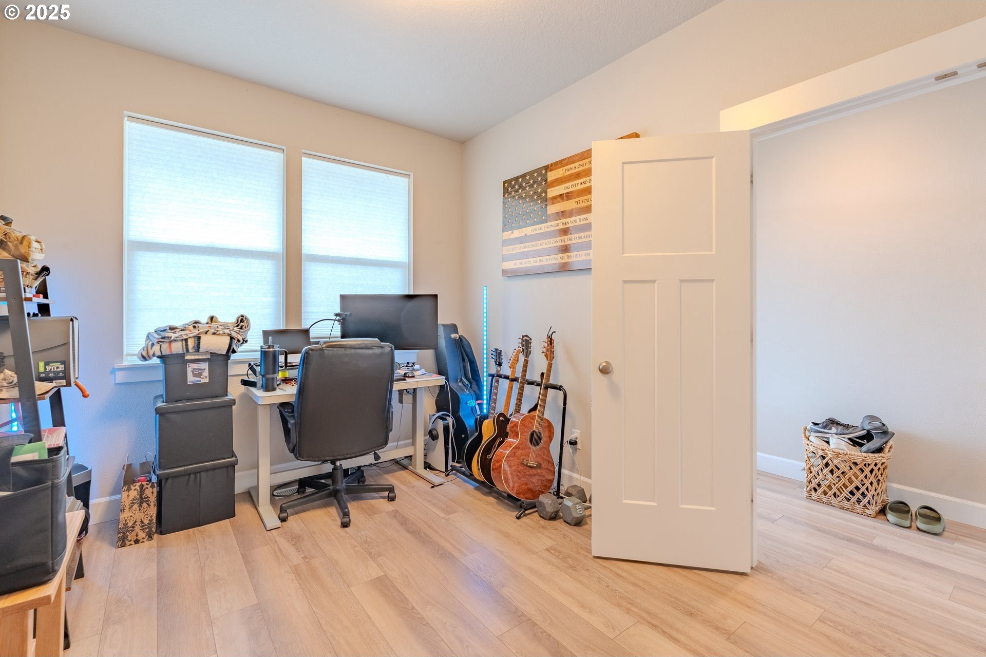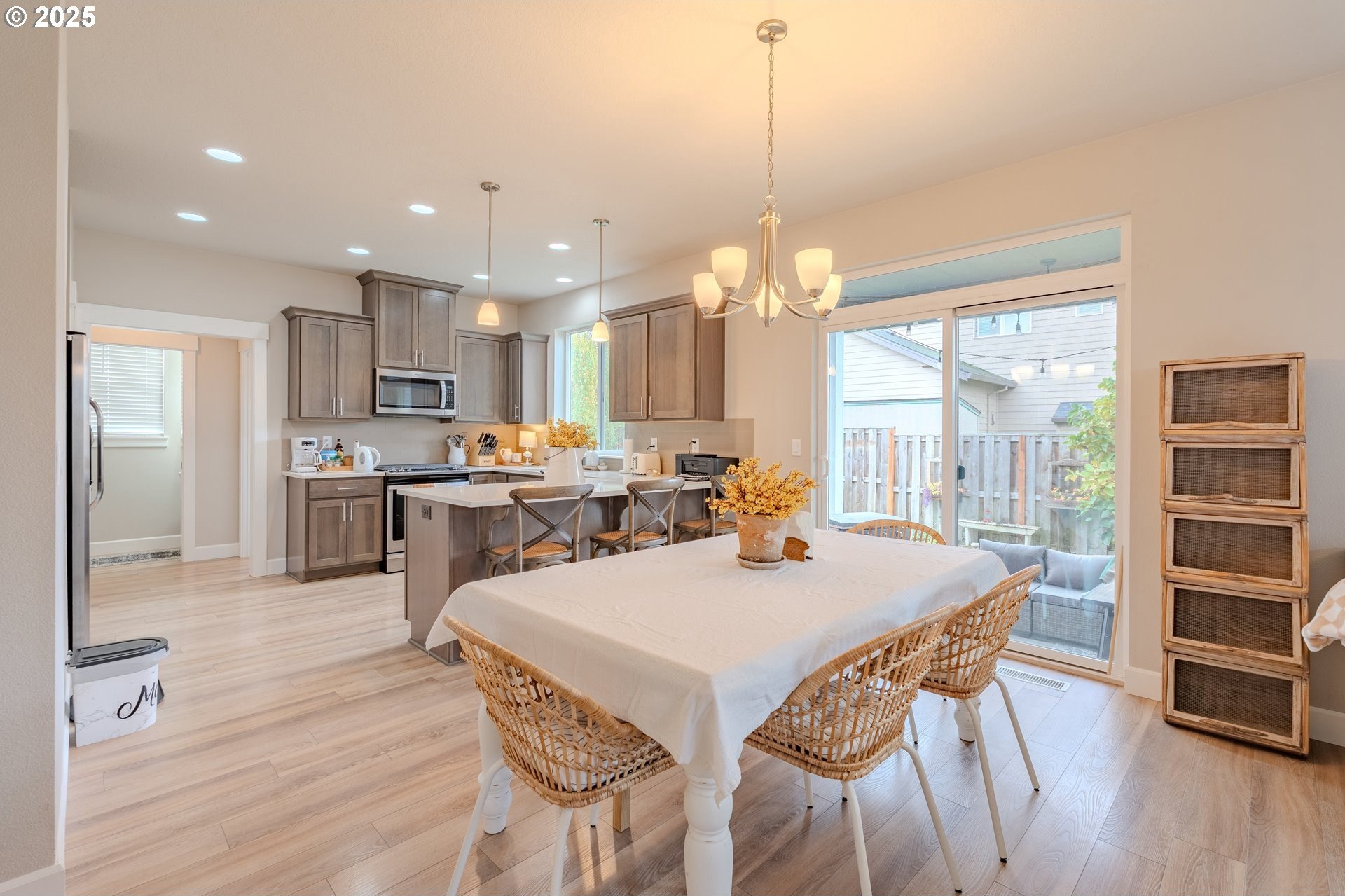 Stylish inside and out! From its contemporary Prairie-style architecture to the striking stacked-stone fireplace surround, this 2019-built home blends modern design with everyday comfort. Offering 2,110 sq ft of thoughtfully designed living space, it includes 4 bedrooms and 2.5 bathrooms. The main level features an open floor plan with high ceilings and warm-toned, easy-care Luxury Vinyl Plank flooring throughout. Off the foyer, French doors open to a spacious office/flex space. The great/living room is the heart of the home - bright and inviting with a large picture window overlooking the backyard and a gas fireplace framed by beautiful, stacked-stone as the focal point. The kitchen seamlessly combines style and function with sleek quartz countertops, an eating bar, pendant lighting, Shaker-style cabinetry, a pantry, and stainless-steel appliances. Sliding doors from the dining area open to a large, covered patio – allowing for tons of natural light and easy indoor/outdoor living. Upstairs, you’ll find 3 good-sized bedrooms plus a spacious owner’s suite featuring a large spa-inspired ensuite with a dual-sink quartz vanity, soaking tub, separate shower, and walk-in closet. Outdoors, you will find a manicured yard, with the backyard fully fenced and complete with a covered patio, firepit, raised garden beds, and plenty of space to relax or play. An attached 3-car garage provides ample space for vehicles, storage, or hobbies. Conveniently located near schools, parks, and all that downtown Battle Ground has to offer - dining, shopping, and more - this chic, functional home is move-in ready. Welcome Home! Open House this Saturday, November 8 from 12-2pm - Join Us!
