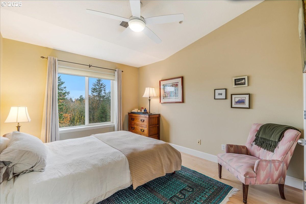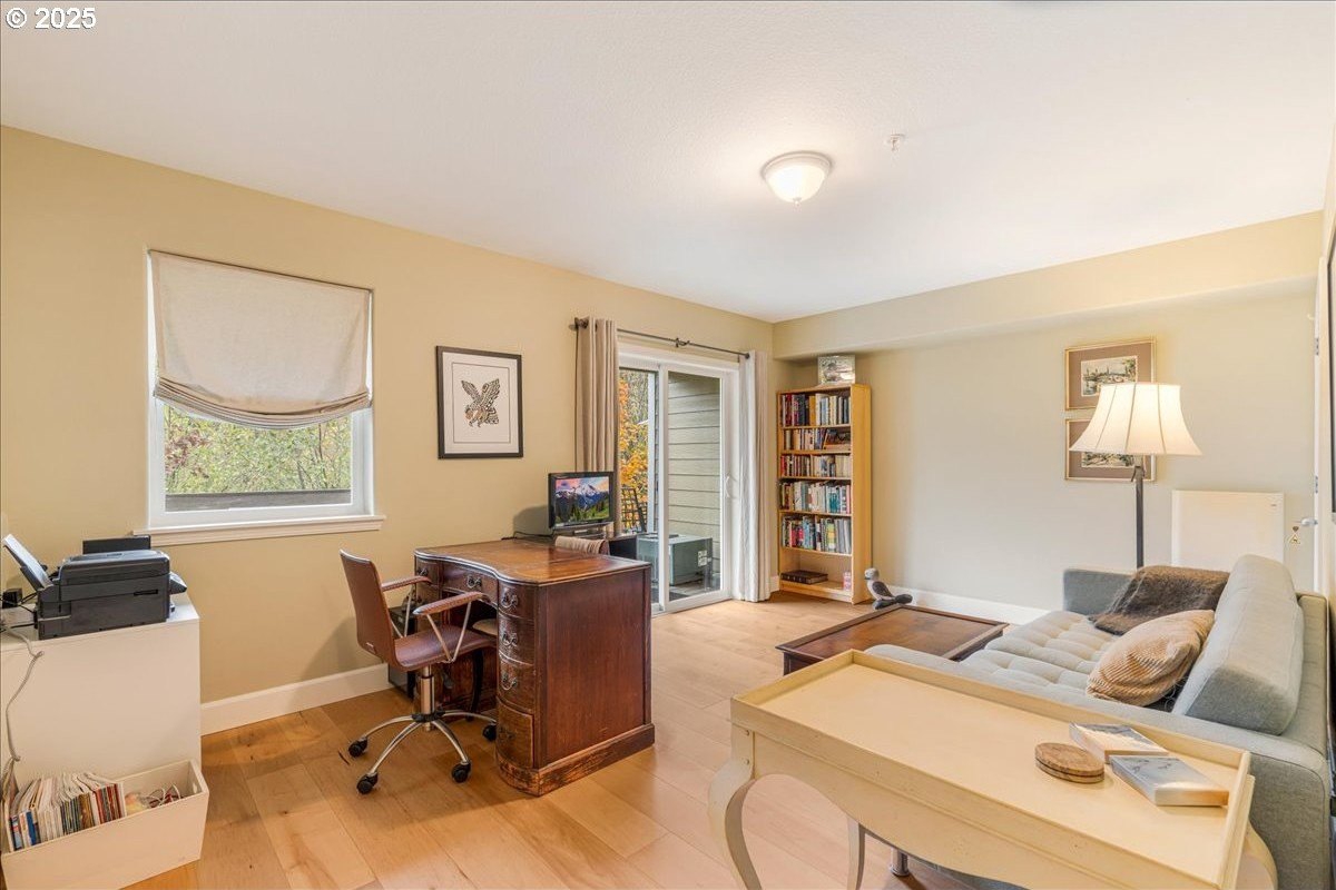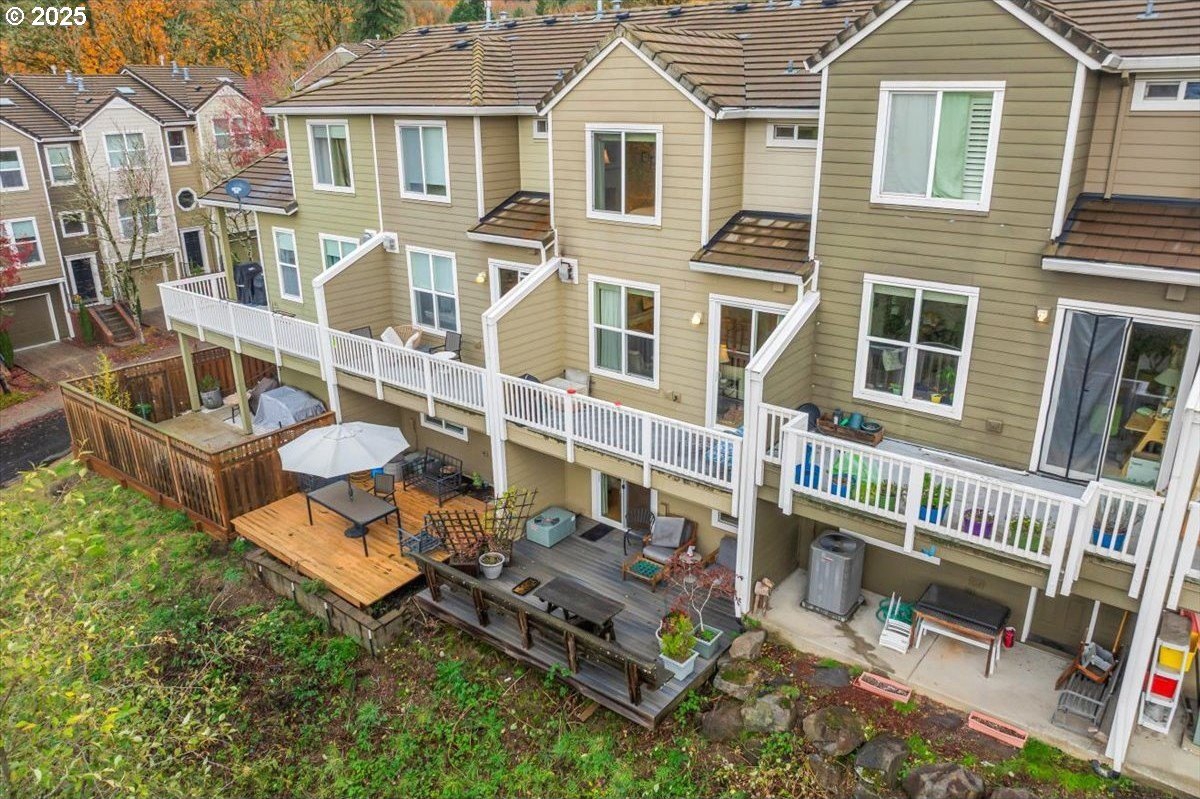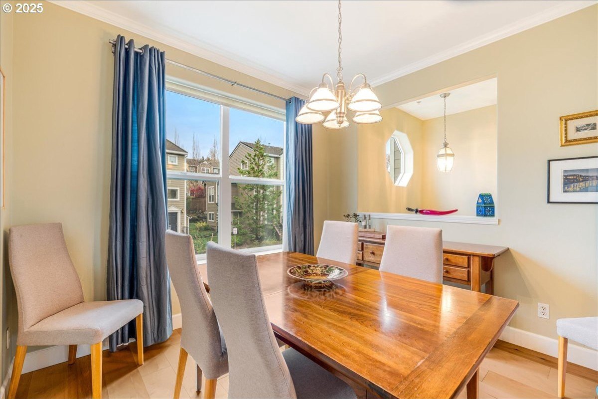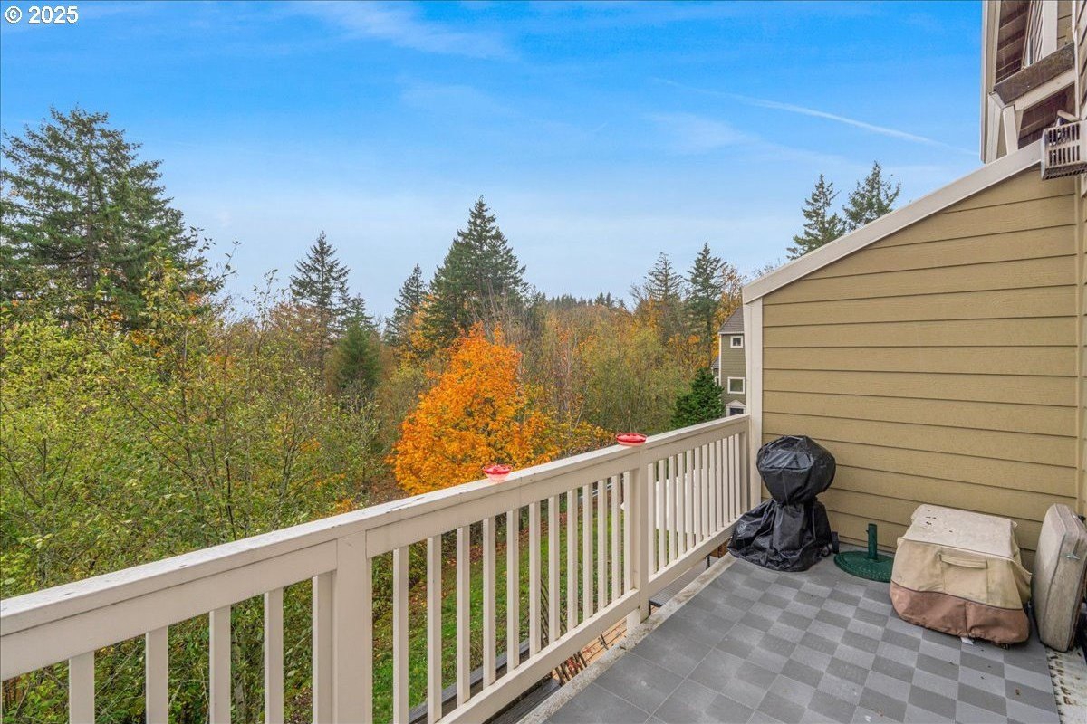 Nestled in a serene greenbelt setting, this elegant townhome offers the perfect blend of comfort, quality and style. With an ideal layout that seamlessly flows across three levels, the home is designed to take full advantage of its beautiful surroundings, including expansive views of greenspace and sunsets. The main floor is an entertainer's dream, showcasing extensive engineered maple hardwood floors throughout. The bright and airy living room offers a balcony overlooking the greenspace, while the gas fireplace adds warmth and ambiance. High ceilings and built-in bookcases add character and functionality to the space. The spacious kitchen boasts hardwood floors, modern appliances, including a gas range and freestanding refrigerator, tile counters and backsplash, light wood cabinetry, and flows seamlessly into a formal dining area. The upper-level primary bedroom is a true retreat, featuring hardwood floors, a walk-in closet, full bath, and stunning sunset views. The second bedroom upstairs is thoughtfully designed with hardwood floors, its own walk-in closet and easy access to the hall bath, providing privacy and convenience for family or guests. The versatile lower level is a private 3rd bedroom, office or family room and includes hardwood floors, a full bath, large walk-in closet, and sliding door to a private patio, perfect for relaxing or entertaining while enjoying the peaceful view of the greenspace. Whether you need a third bedroom, home office, or cozy family room, this space offers endless possibilities. Upgrades and updates include high quality wool carpeting on stairs, new engineered maple hardwoods throughout every level, new trim, and fresh paint, ensuring that every detail of this home feels both timeless and move-in ready. Location! Forest Heights offers picturesque walking trails, a park with a lake, a merchant center with coffee shop, pizza, and other services. All this while minutes to downtown, hospitals, Nike and Intel! [Home Energy Score = 9. HES Report at https://rpt.greenbuildingregistry.com/hes/OR10241753]
