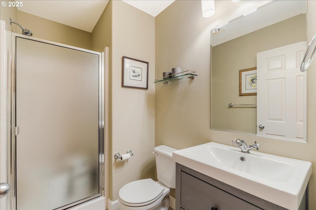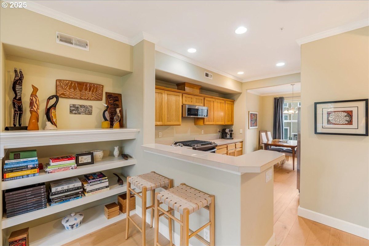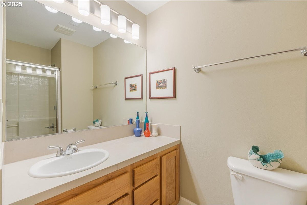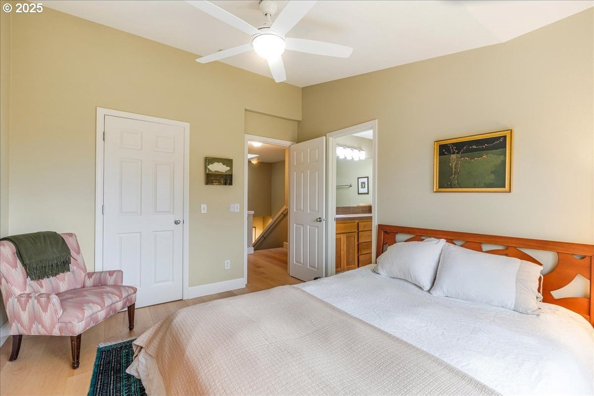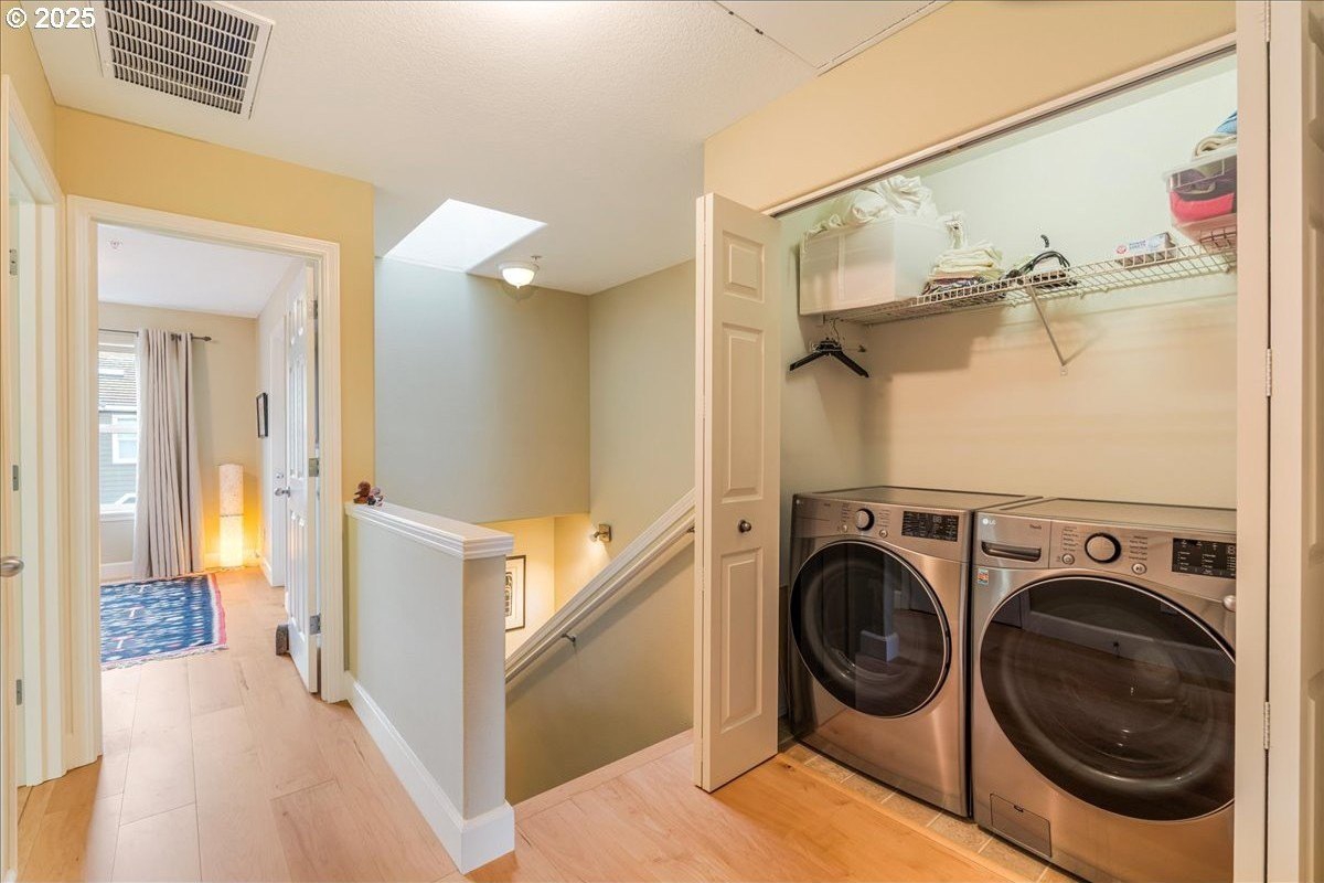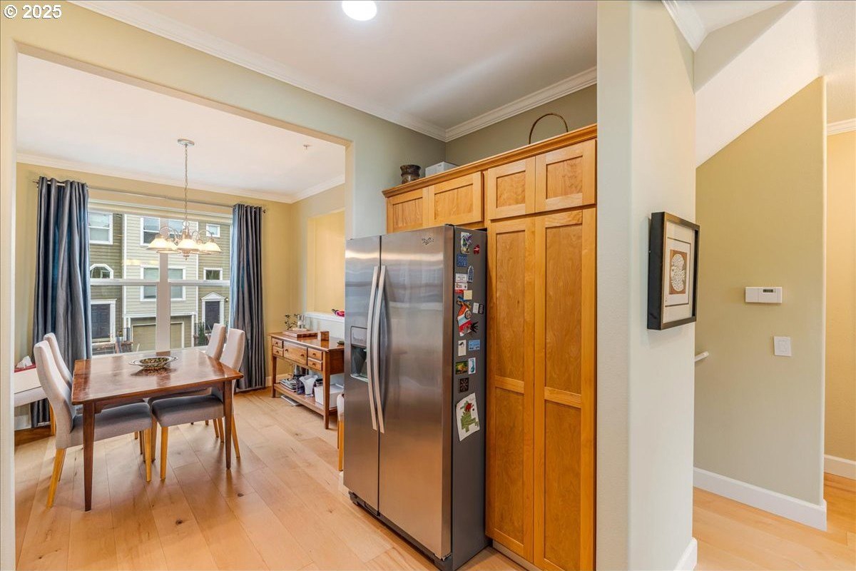 Nestled in a serene greenbelt setting, this elegant townhome offers the perfect blend of comfort, quality and style. With an ideal layout that seamlessly flows across three levels, the home is designed to take full advantage of its beautiful surroundings, including expansive views of greenspace and sunsets. The main floor is an entertainer's dream, showcasing extensive engineered maple hardwood floors throughout. The bright and airy living room offers a balcony overlooking the greenspace, while the gas fireplace adds warmth and ambiance. High ceilings and built-in bookcases add character and functionality to the space. The spacious kitchen boasts hardwood floors, modern appliances, including a gas range and freestanding refrigerator, tile counters and backsplash, light wood cabinetry, and flows seamlessly into a formal dining area. The upper-level primary bedroom is a true retreat, featuring hardwood floors, a walk-in closet, full bath, and stunning sunset views. The second bedroom upstairs is thoughtfully designed with hardwood floors, its own walk-in closet and easy access to the hall bath, providing privacy and convenience for family or guests. The versatile lower level is a private 3rd bedroom, office or family room and includes hardwood floors, a full bath, large walk-in closet, and sliding door to a private patio, perfect for relaxing or entertaining while enjoying the peaceful view of the greenspace. Whether you need a third bedroom, home office, or cozy family room, this space offers endless possibilities. Upgrades and updates include high quality wool carpeting on stairs, new engineered maple hardwoods throughout every level, new trim, and fresh paint, ensuring that every detail of this home feels both timeless and move-in ready. Location! Forest Heights offers picturesque walking trails, a park with a lake, a merchant center with coffee shop, pizza, and other services. All this while minutes to downtown, hospitals, Nike and Intel! [Home Energy Score = 9. HES Report at https://rpt.greenbuildingregistry.com/hes/OR10241753]