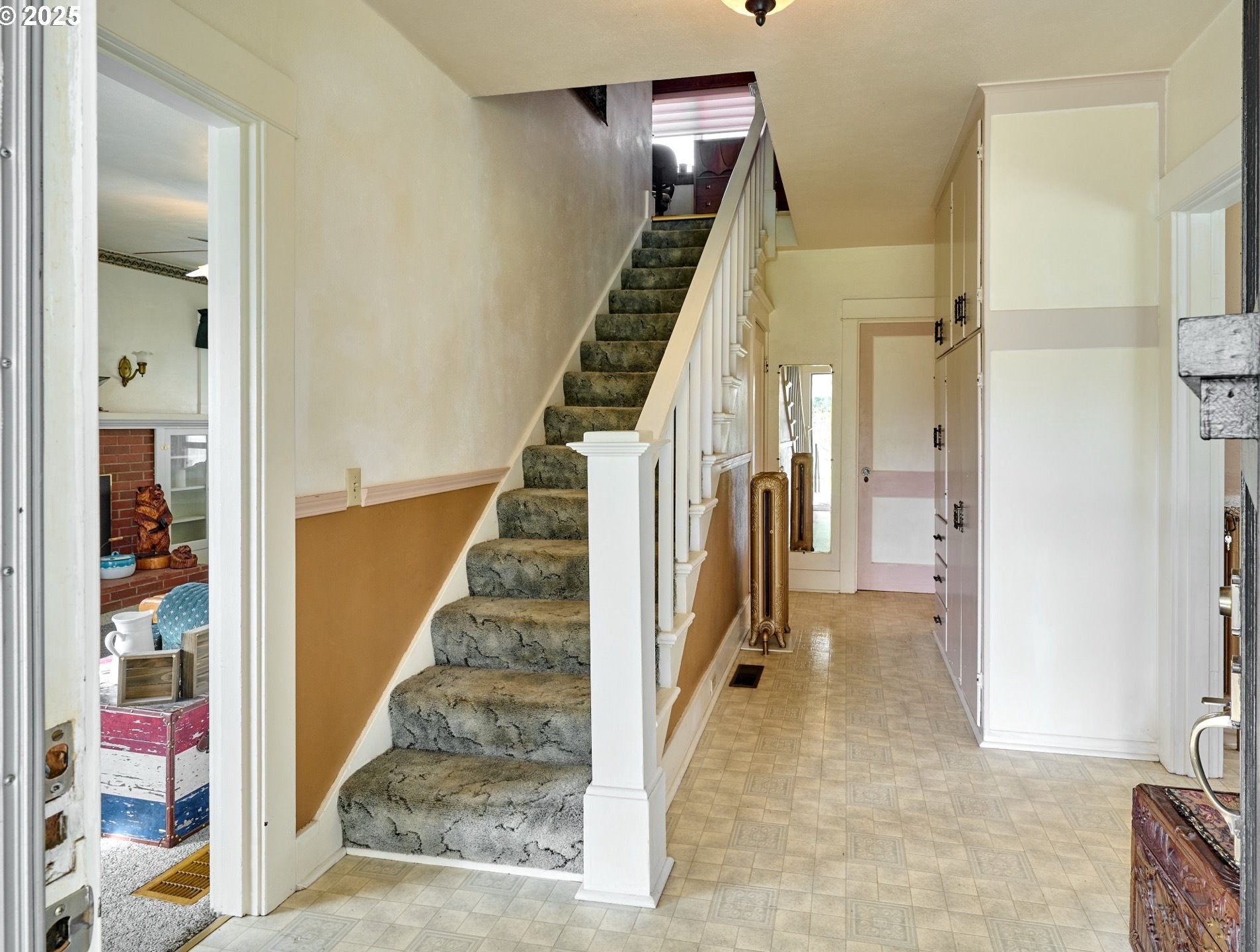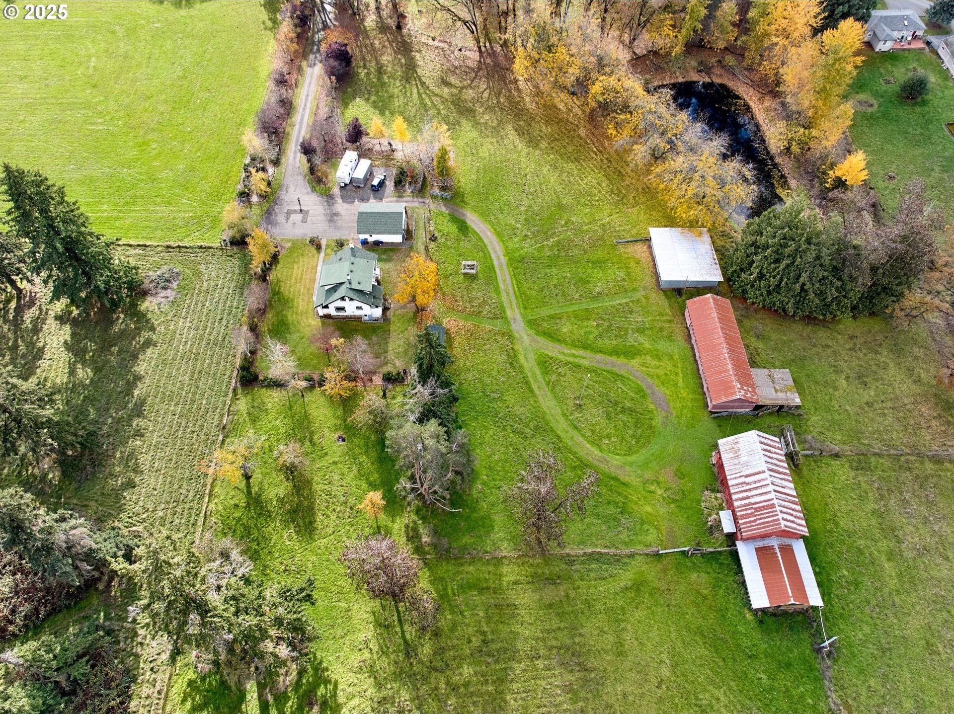 Follow the tree-lined lane to your classic white 1924 farmhouse, resting on flat, usable acreage with gentle rolling slopes. A perfect blend of functionality and rural charm, just on the edge of town. Offered for the first time since the 1950s, this property features 20 acres of open pasture, a large seasonal pond ideal for fishing, small boating, and wildlife viewing, majestic mature oak trees, and expansive skies. The 3-bedroom, 2-bath home exudes timeless character with original woodwork, vintage glass door hardware, and charming architectural details throughout. The spacious living room centers around a gas fireplace flanked by built-ins, creating a warm and inviting focal point. Though no longer operational, the original radiators remain as an elegant nod to the home’s history. The manicured grounds include mature fruit trees and a fenced garden area. A two-story barn, built in 1955, offers solid flooring and a uniquely designed manger. Additional structures include a detached two-car garage and two open-front sheds, perfect for farm machinery or implements. The land is fully fenced and cross-fenced, cattle-ready, with the front pasture historically used for hay production. A secondary well is in place however it has does not have electrical connected and has not been used in decades. Zoned RRFF5 and potentially dividable, due diligence necessary with the county.