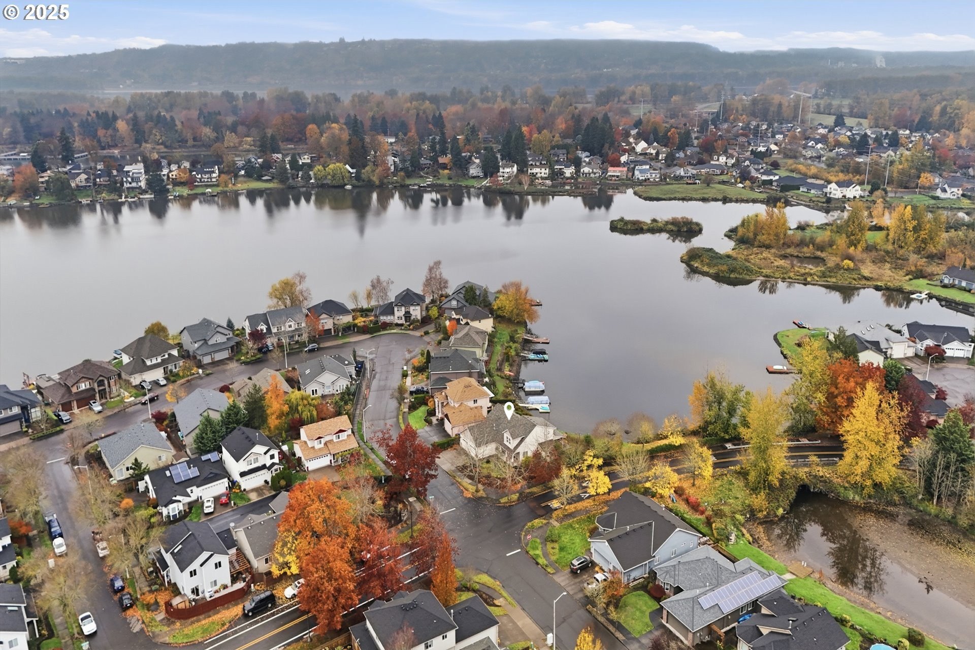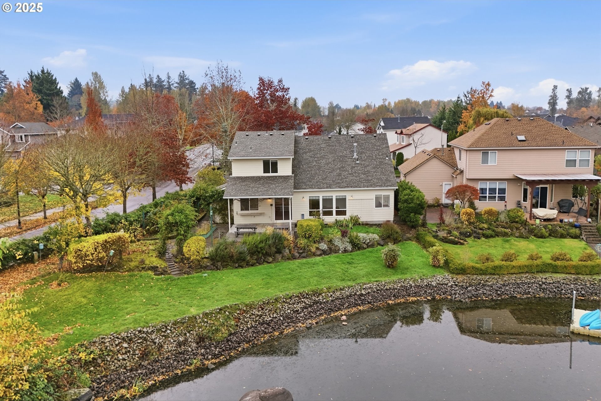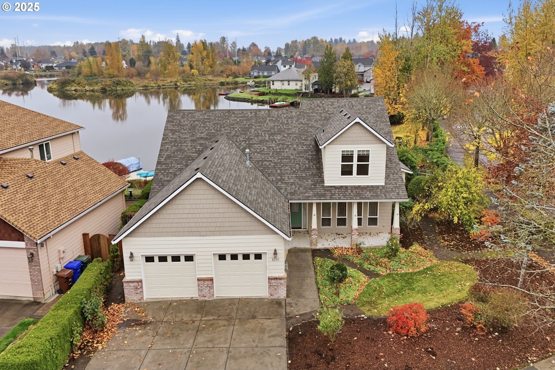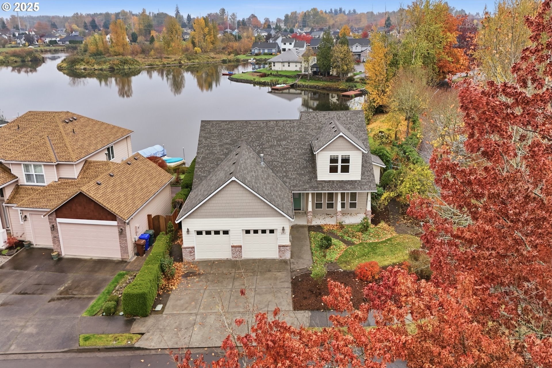 Serene lakeside living! Welcome to your private retreat on Fairview Lake, where nature, light, and thoughtful design come together in perfect harmony. This custom-built home rests on a .26 acre corner lot with a 140 feet of lake frontage, surrounded by lush landscaping, fruit trees, and peaceful water views. Inside, warmth and craftsmanship define every detail. The main level offers true single level living with a primary suite featuring a jetted tub and walk-in closet, a dedicated office with built-ins, and laundry room equipped with washer and dryer. Hardwood and tile floors flow throughout the great room layout, where a gas fireplace anchors the space and expansive windows frame the ever-changing beauty of the lake. The island kitchen is as functional as it is beautiful, complete with double ovens, a gas cooktop, pantry, and stainless steel appliances - perfect for everyday living or entertaining with ease. Just beyond, the covered patio invites you to enjoy quiet mornings or golden-hour sunsets reflected on the water’s surface, often accompanied by visits from ducks, herons, and other wildlife that make Fairview Lake their home. Upstairs, you’ll find two spacious bedrooms and a full bath, ideal for guests, hobbies, or relaxation. With 2,196 square feet of living space, this home blends openness and comfort, offering room to breathe while remaining intimately connected to its natural surroundings. Located in Lake Shores Estates, just minutes from Blue Lake Regional Park, Salish Ponds Trail, downtown Fairview, and I-84, this property offers the rare balance of privacy and accessibility - where lakefront tranquility meets everyday convenience.Discover a home that feels more like a sanctuary - beautifully built, gracefully lived in, and ready for its next chapter.