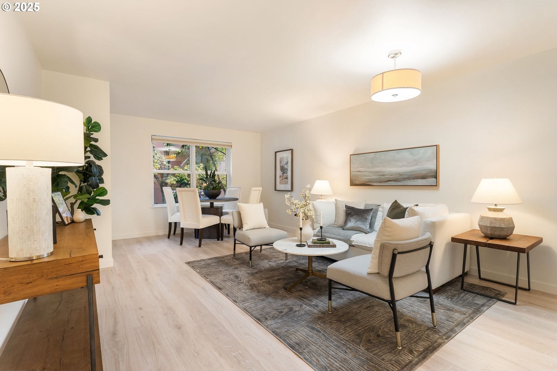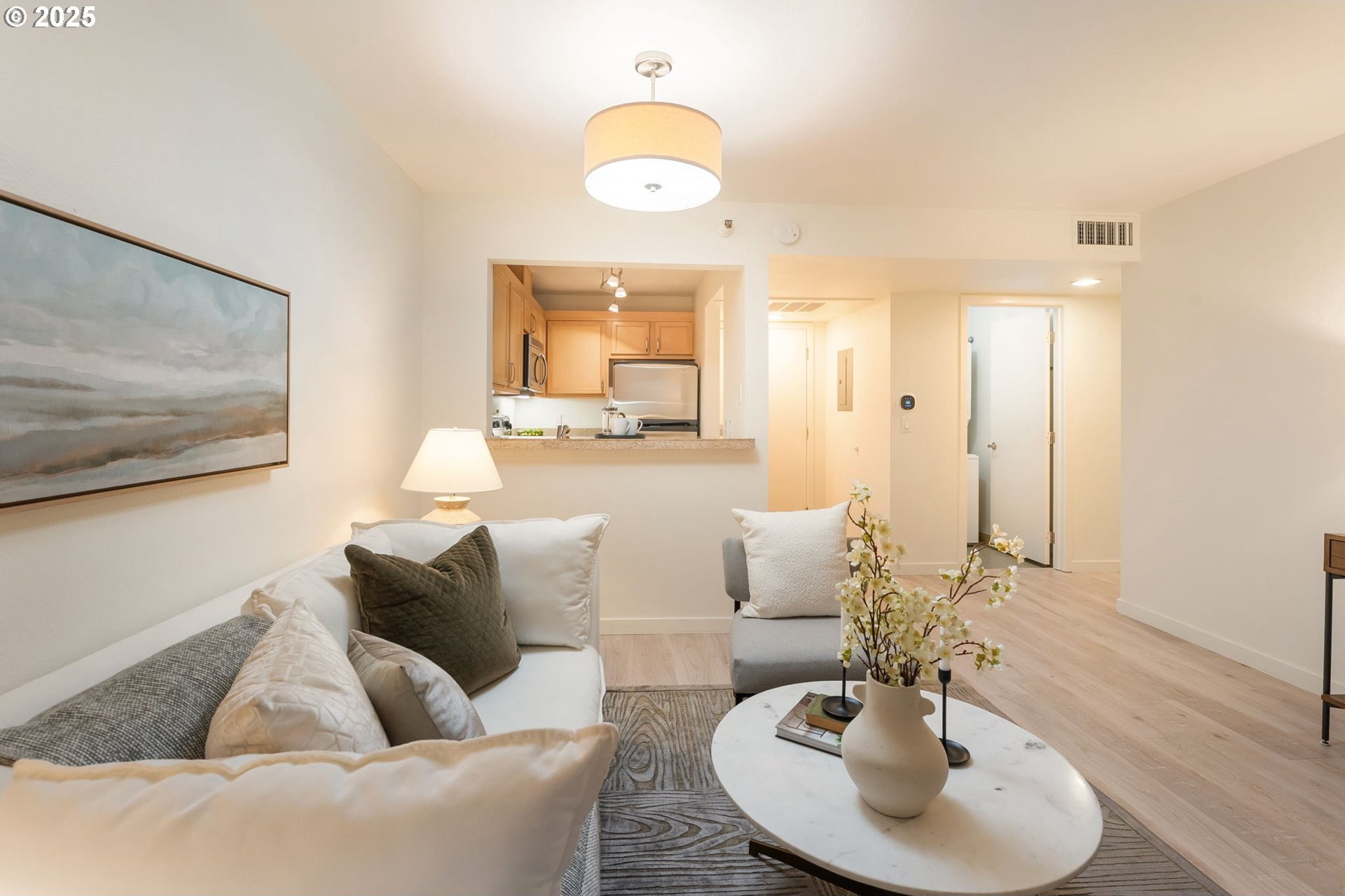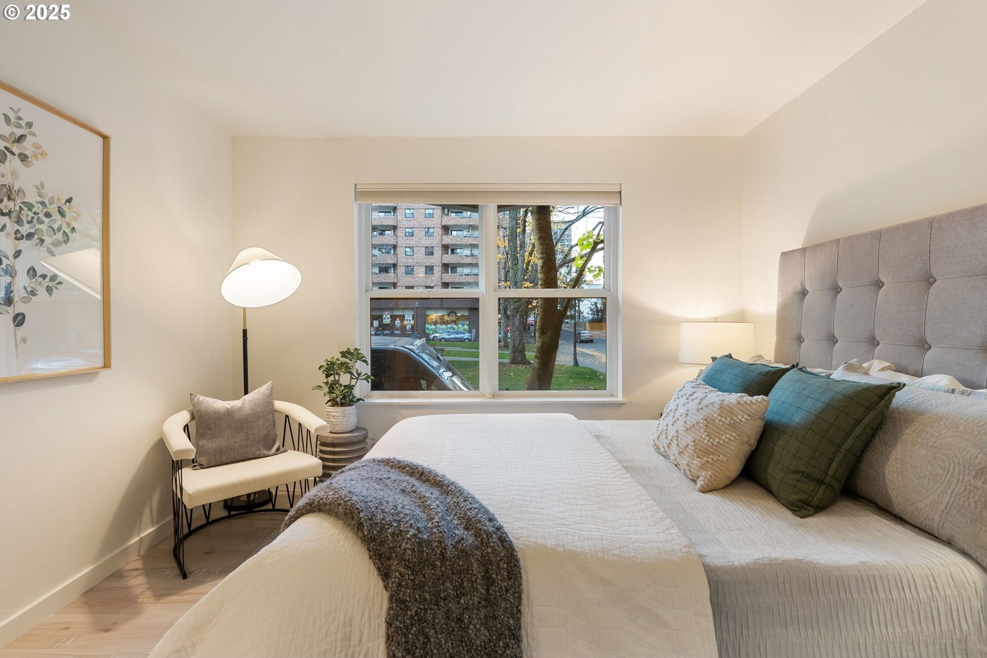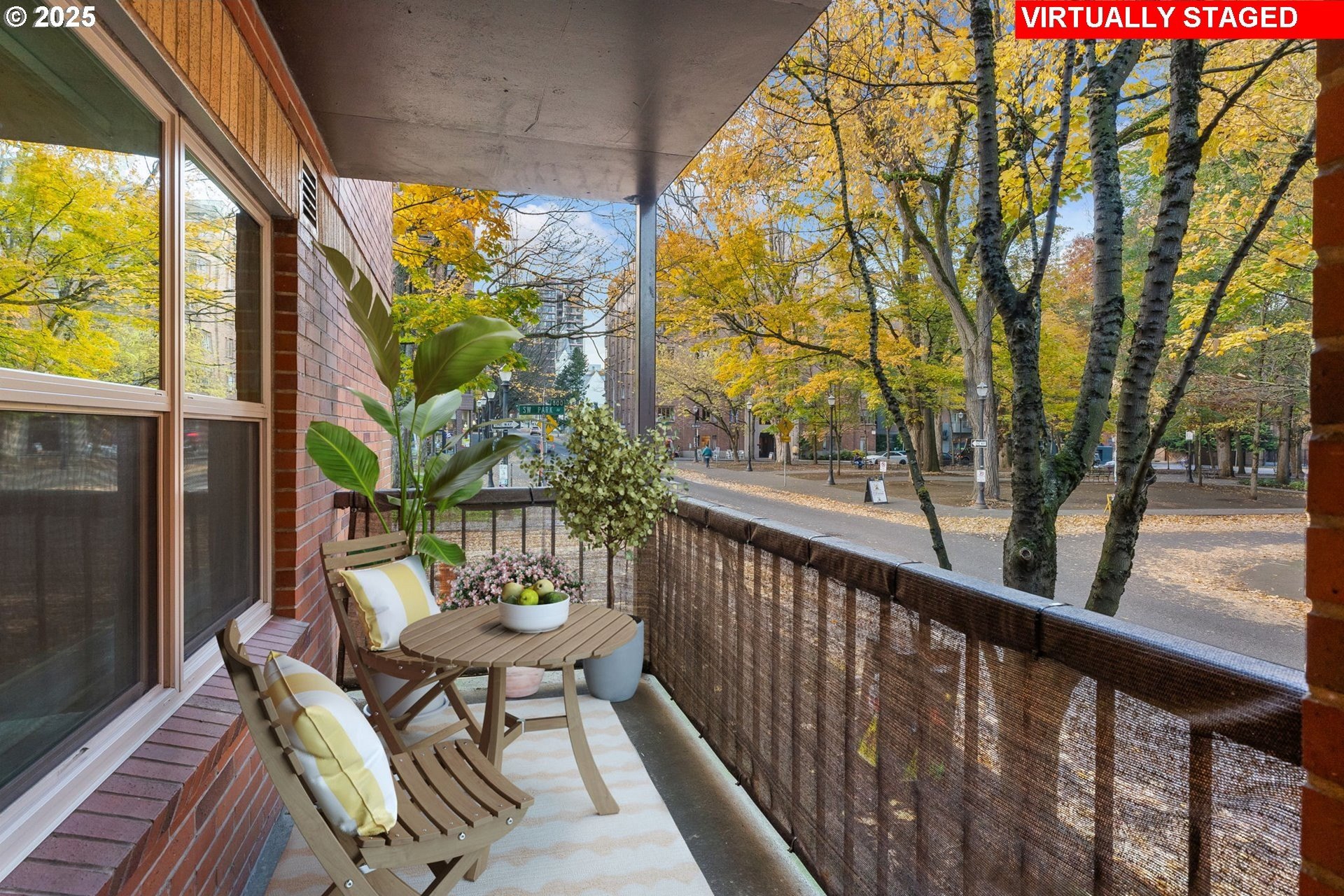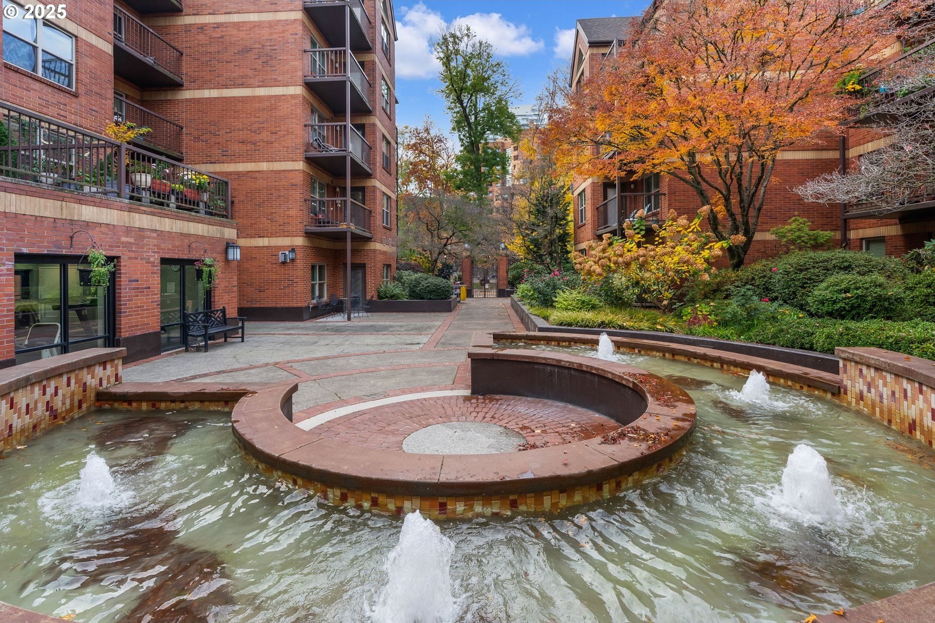 Welcome to the best of urban living just steps from the beautiful downtown park blocks! Enjoy short walks to the Arlene Schnitzer concert hall, Portland Art Museum, Portland State University and a plethora of cafes and restaurants. This first floor one level home was just freshly renovated with new luxury vinyl plank flooring, fresh interior paint through out. The open great room concept allows for a cozy family room and a full dining space. It opens onto a covered balcony that looks onto the beauty of the park blocks. Enjoy a primary ensuite with full bath and walk in closet. The efficient kitchen presents with granite counters and stainless steel appliances. A stackable washer and dryer in the unit included. This is a beautiful and secure building, gated courtyard entrance with secure common areas and onsite building supervisor. The community amenities are extensive including, meeting room/library, weight room/gym, bike storage, roof top, sundeck with city views and a gorgeous courtyard. Deeded parking #99 and storage unit #11. This is a hidden gem in the heart of the downtown, just move in and enjoy city living! Unit #104