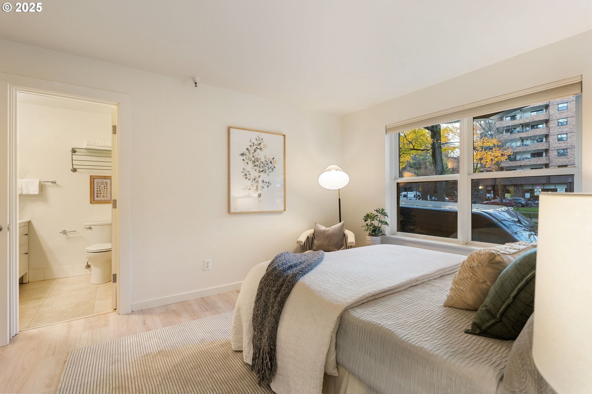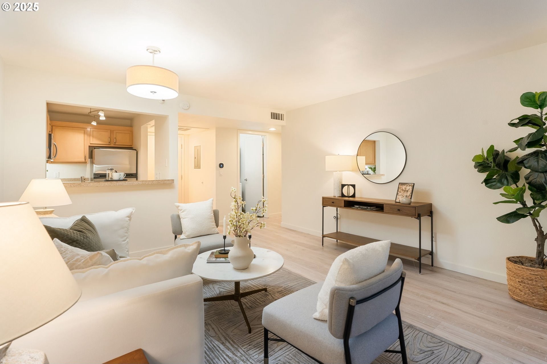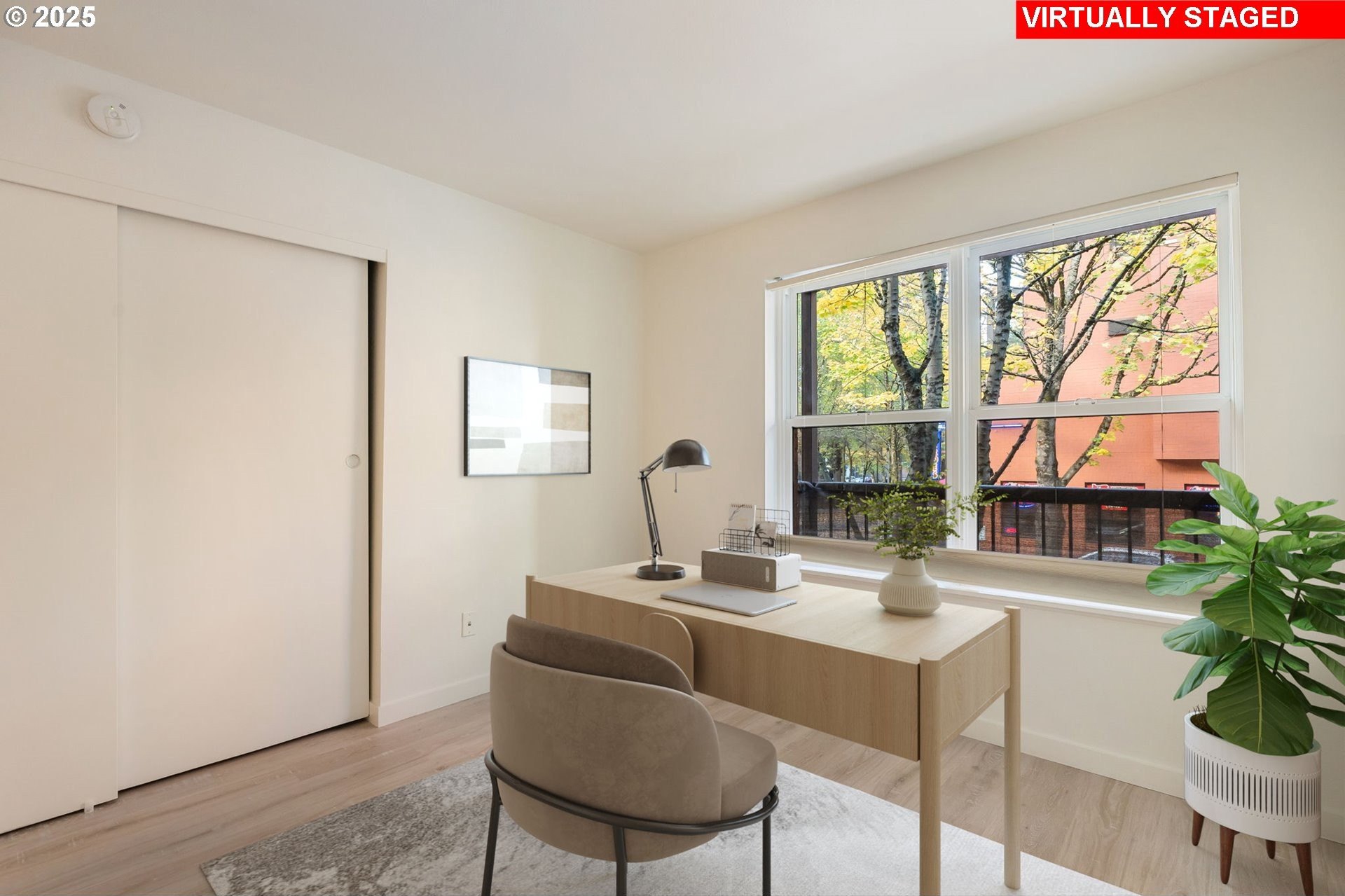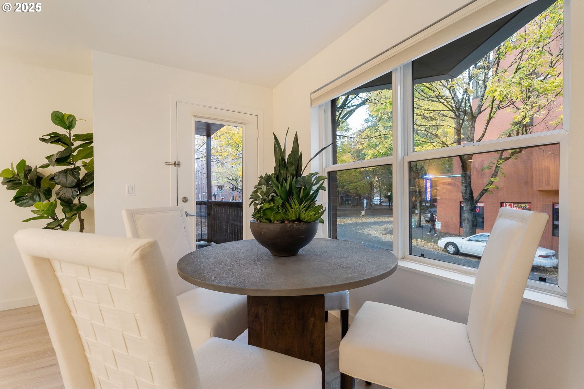 Welcome to the best of urban living just steps from the beautiful downtown park blocks! Enjoy short walks to the Arlene Schnitzer concert hall, Portland Art Museum, Portland State University and a plethora of cafes and restaurants. This first floor one level home was just freshly renovated with new luxury vinyl plank flooring, fresh interior paint through out. The open great room concept allows for a cozy family room and a full dining space. It opens onto a covered balcony that looks onto the beauty of the park blocks. Enjoy a primary ensuite with full bath and walk in closet. The efficient kitchen presents with granite counters and stainless steel appliances. A stackable washer and dryer in the unit included. This is a beautiful and secure building, gated courtyard entrance with secure common areas and onsite building supervisor. The community amenities are extensive including, meeting room/library, weight room/gym, bike storage, roof top, sundeck with city views and a gorgeous courtyard. Deeded parking #99 and storage unit #11. This is a hidden gem in the heart of the downtown, just move in and enjoy city living! Unit #104