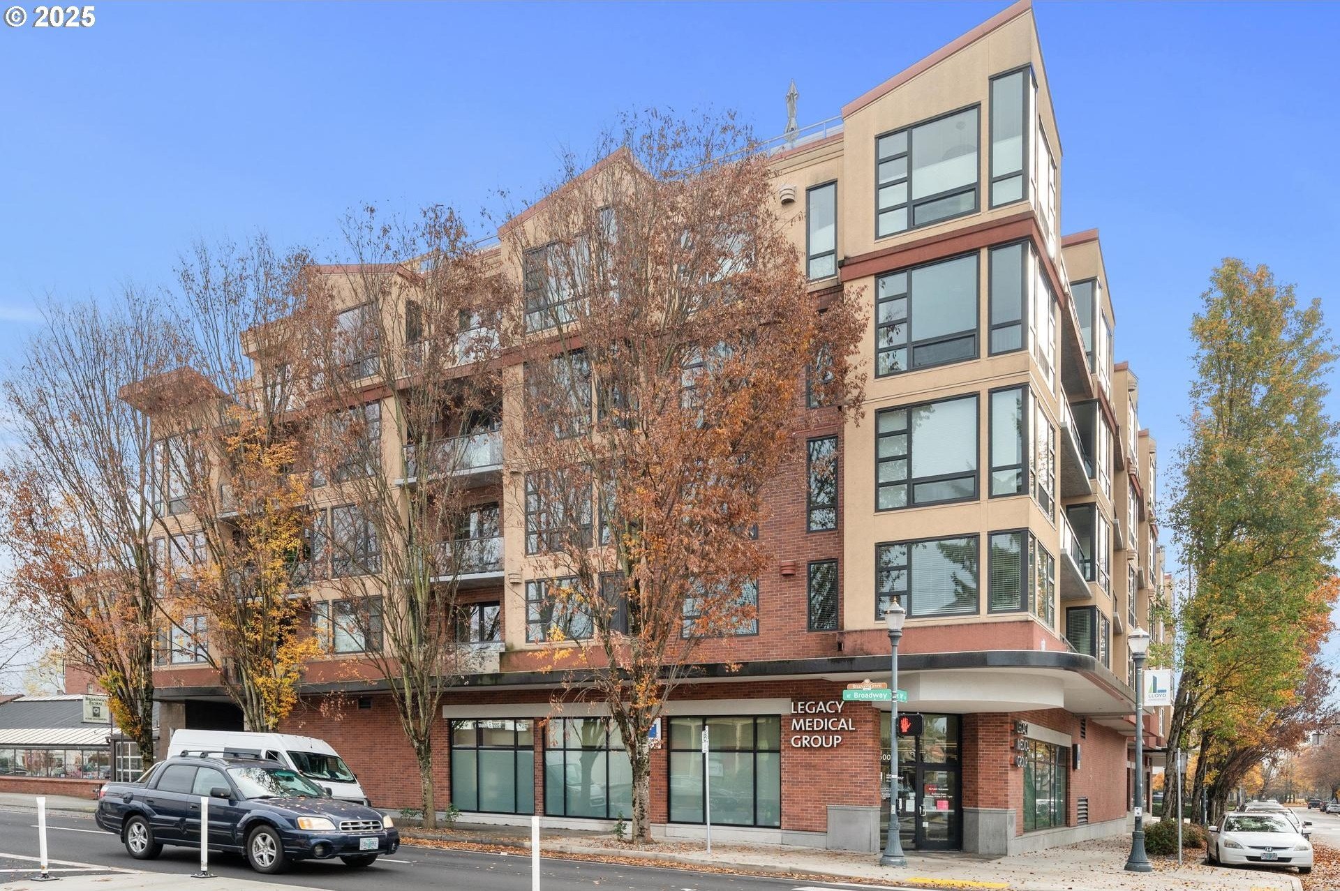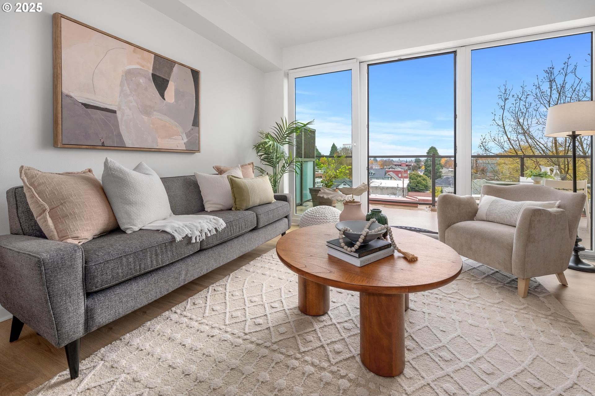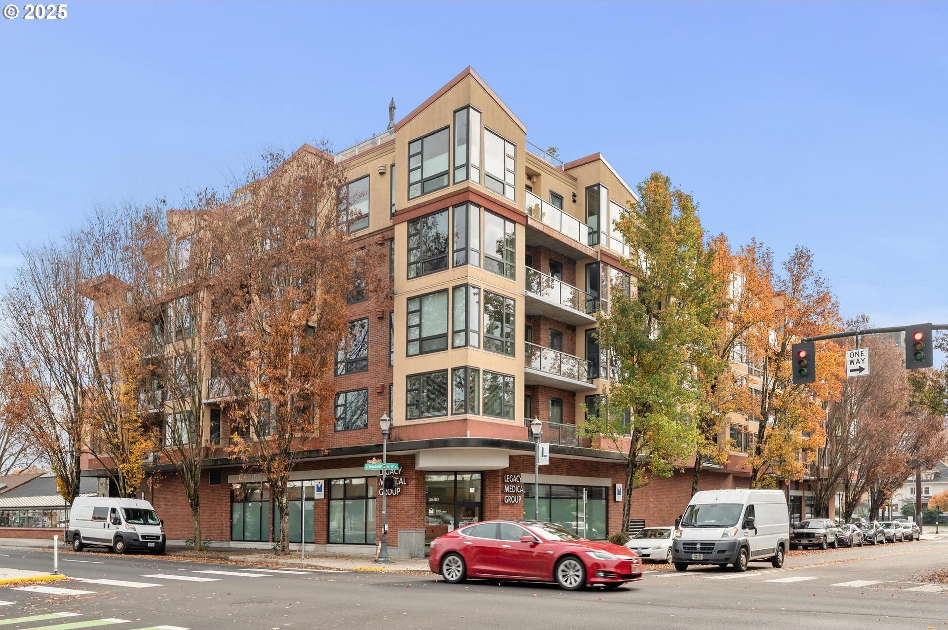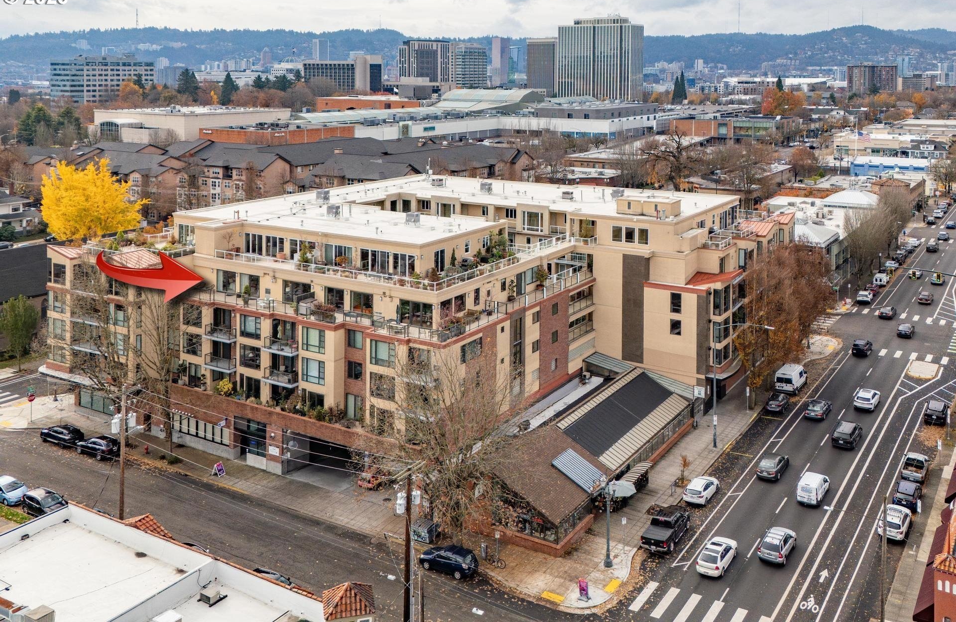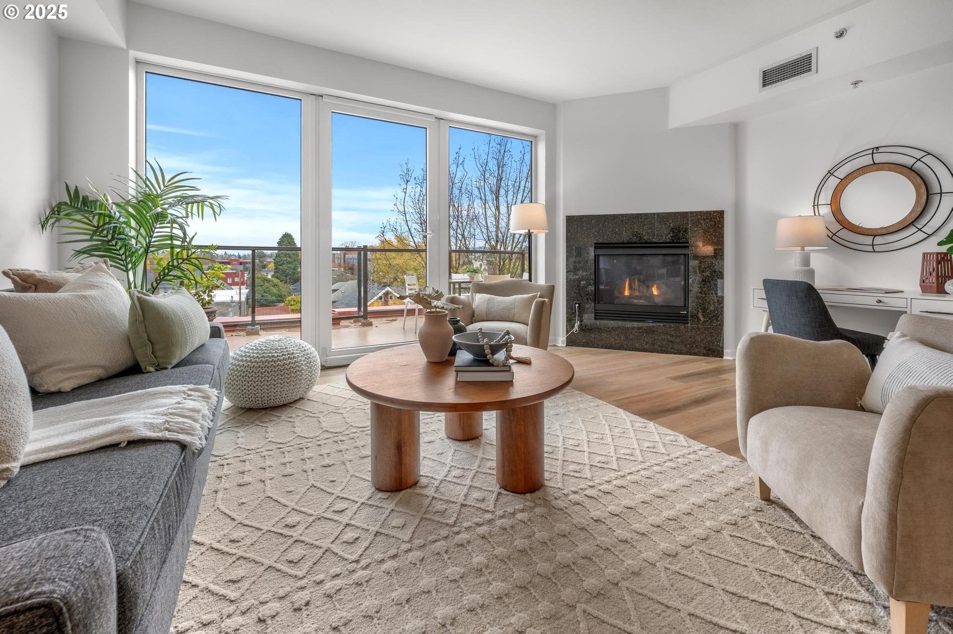 Welcome to your airy 5th-floor retreat, where an open floorplan and floor-to-ceiling windows fill the home with natural light from sunrise on. Three expansive sliding glass doors invite you out to a generous lanai—an ideal extension of your living space for morning coffee, lounging, or enjoying the soft glow of Portland evenings.Nestled in the heart of inner Northeast PDX—one of the city’s most beloved and walkable neighborhoods—this contemporary condo blends modern design with effortless everyday comfort. The east-facing orientation offers wonderful city and mountain views while keeping you connected to the energy of the neighborhood below.The beautifully appointed kitchen is a true chef’s delight, showcasing granite countertops, a gas range, stainless steel appliances, and a welcoming eat-in bar perfect for gathering with friends. Enjoy fresh paint, new flooring, and a cozy gas fireplace that makes the home truly move-in ready.Convenience is at your fingertips with two dedicated parking spaces and a secure storage unit. The community is impeccably maintained, offering lush courtyards and inviting common areas for residents to enjoy. Step outside and you’re moments from trendy shopping, restaurants, and everyday essentials—including multiple grocery options. With an exceptional Walk Score of 95 and a Bike Score of 100, this location embodies the best of Portland living—vibrant, connected, and effortlessly convenient. This is more than a home; it’s a lifestyle you’ll love.