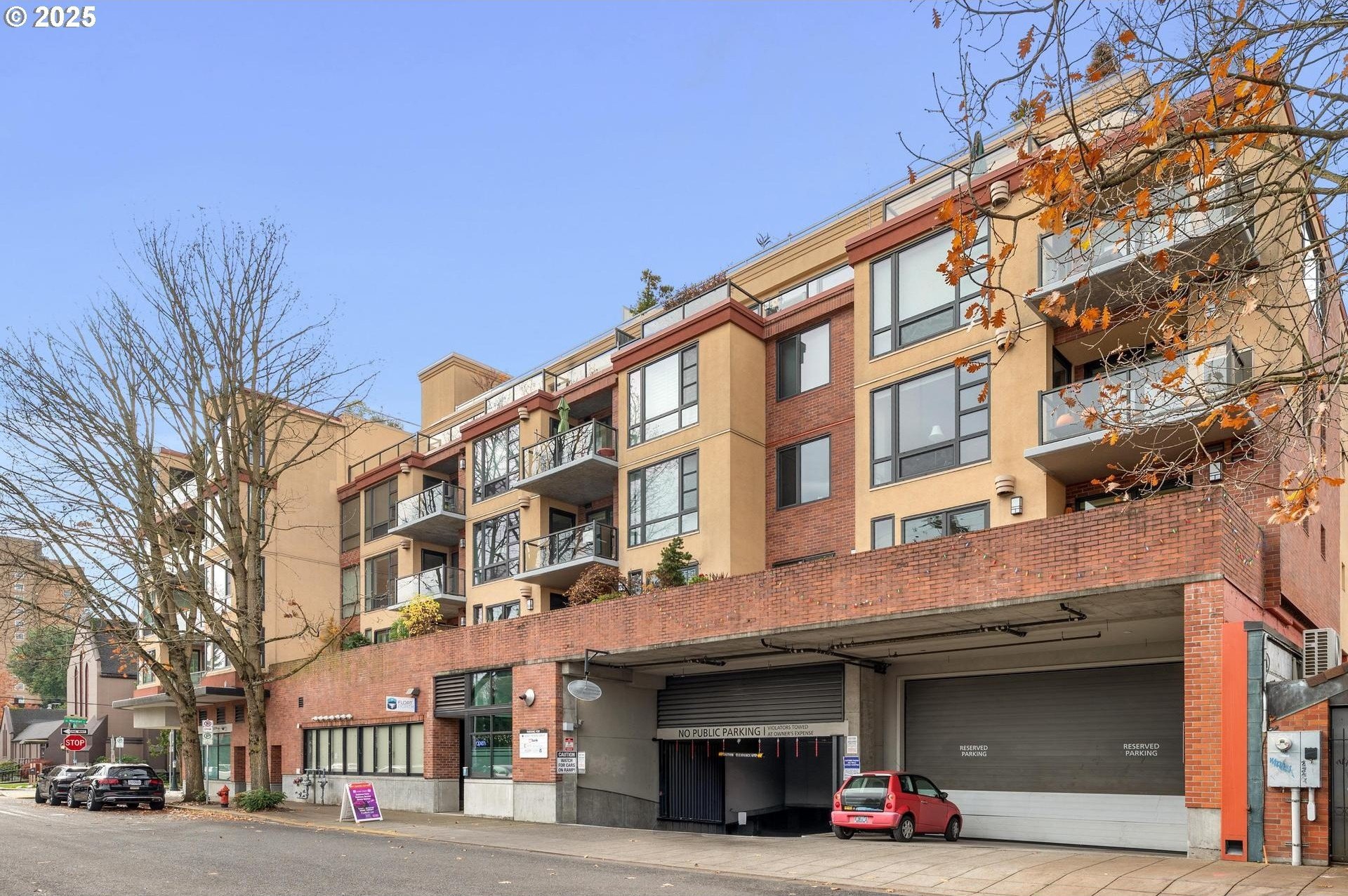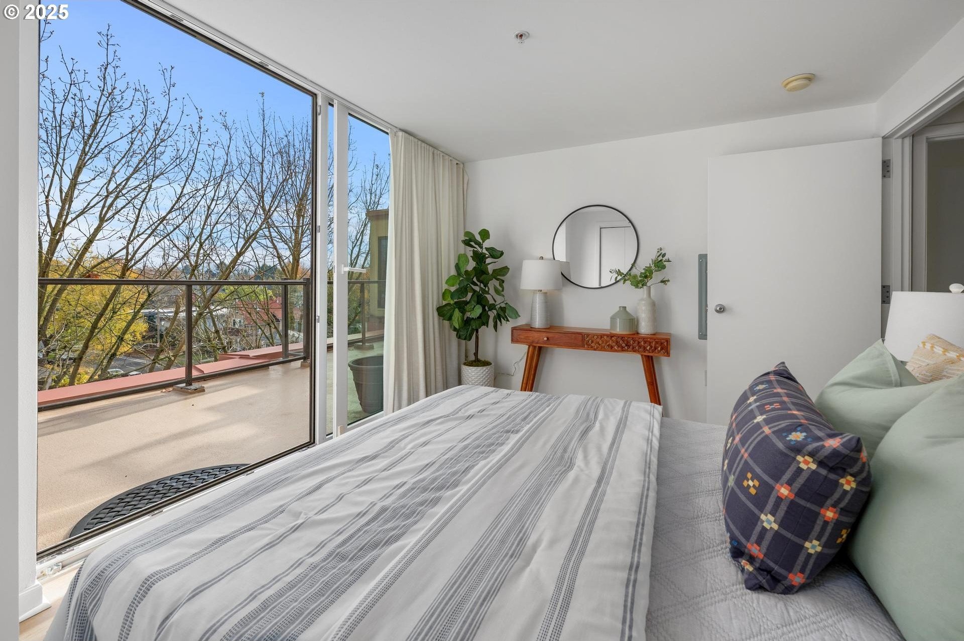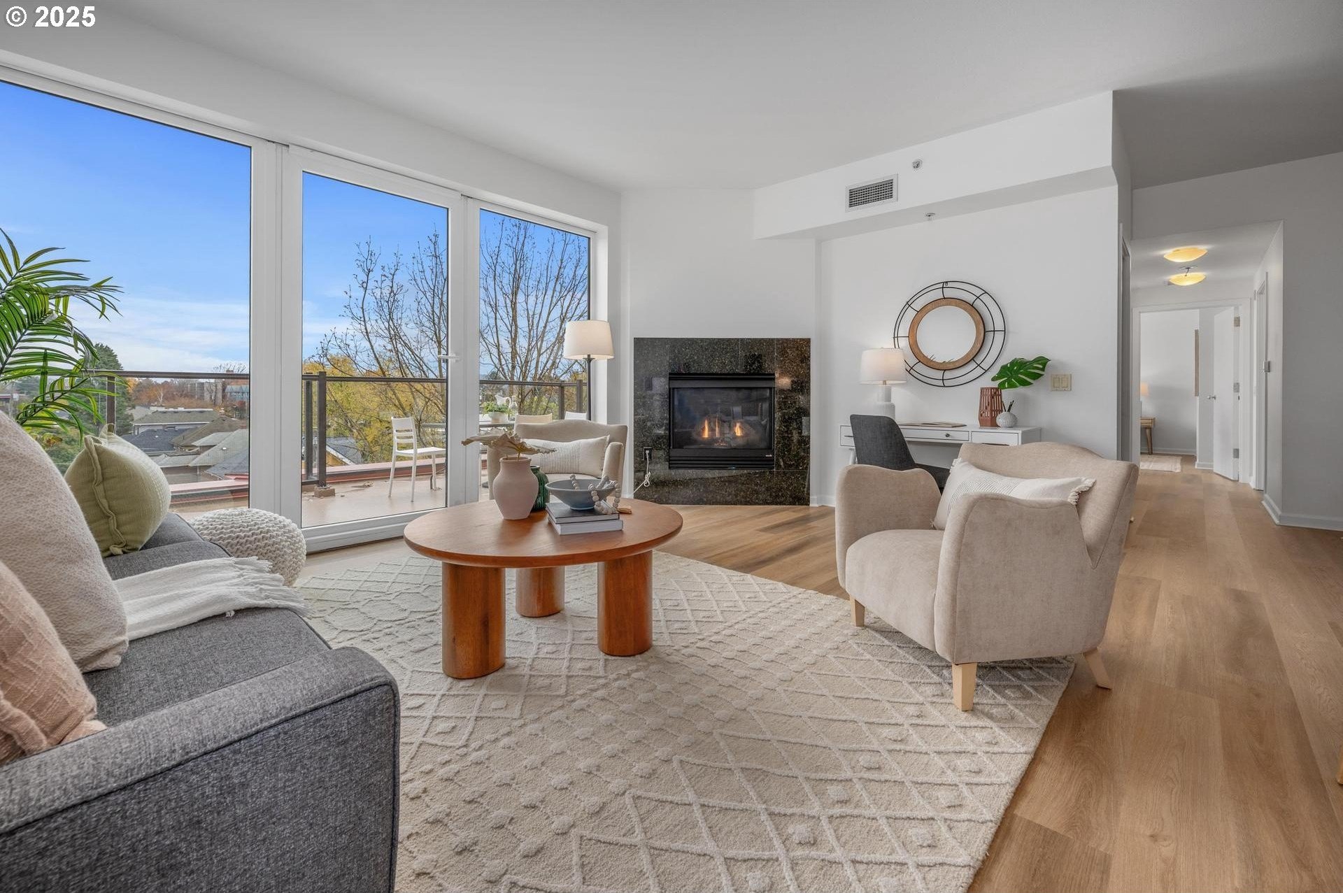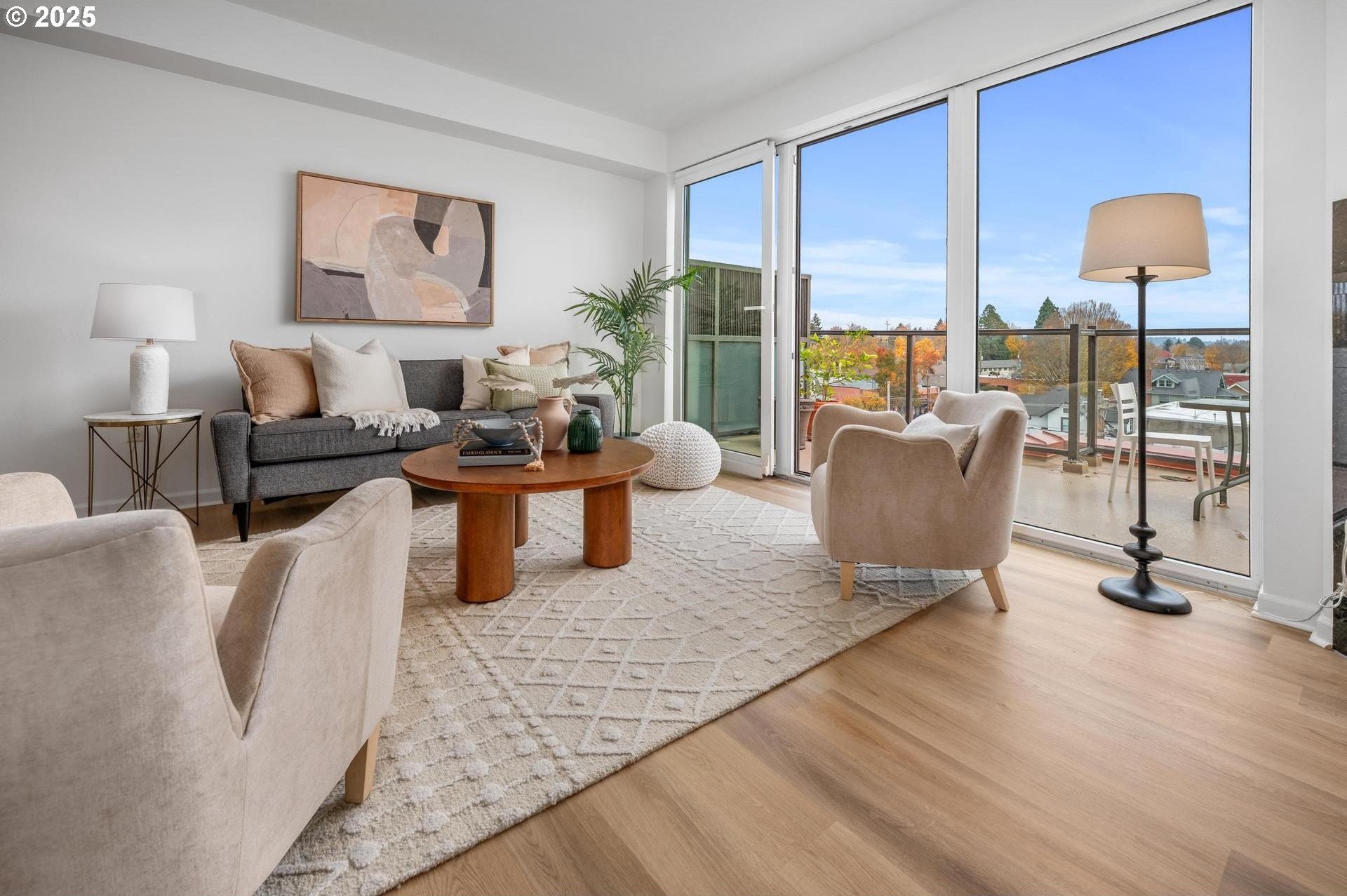 Welcome to your airy 5th-floor retreat, where an open floorplan and floor-to-ceiling windows fill the home with natural light from sunrise on. Three expansive sliding glass doors invite you out to a generous lanai—an ideal extension of your living space for morning coffee, lounging, or enjoying the soft glow of Portland evenings.Nestled in the heart of inner Northeast PDX—one of the city’s most beloved and walkable neighborhoods—this contemporary condo blends modern design with effortless everyday comfort. The east-facing orientation offers wonderful city and mountain views while keeping you connected to the energy of the neighborhood below.The beautifully appointed kitchen is a true chef’s delight, showcasing granite countertops, a gas range, stainless steel appliances, and a welcoming eat-in bar perfect for gathering with friends. Enjoy fresh paint, new flooring, and a cozy gas fireplace that makes the home truly move-in ready.Convenience is at your fingertips with two dedicated parking spaces and a secure storage unit. The community is impeccably maintained, offering lush courtyards and inviting common areas for residents to enjoy. Step outside and you’re moments from trendy shopping, restaurants, and everyday essentials—including multiple grocery options. With an exceptional Walk Score of 95 and a Bike Score of 100, this location embodies the best of Portland living—vibrant, connected, and effortlessly convenient. This is more than a home; it’s a lifestyle you’ll love.
