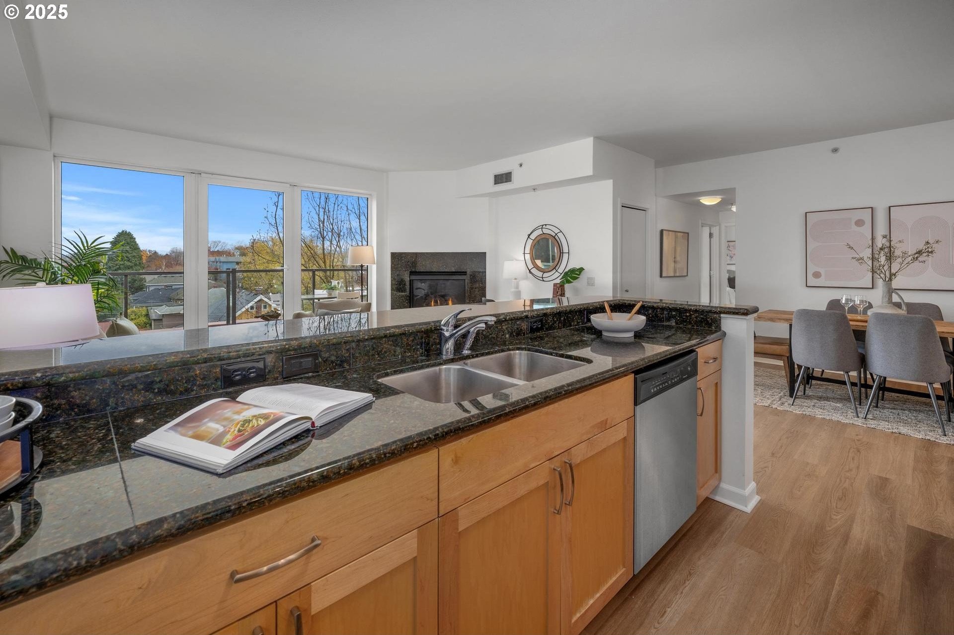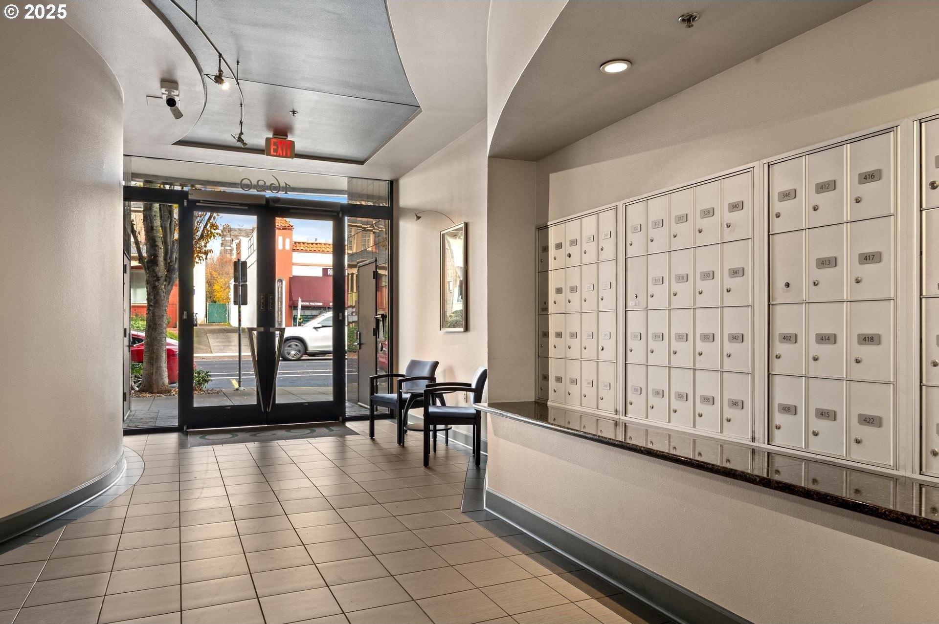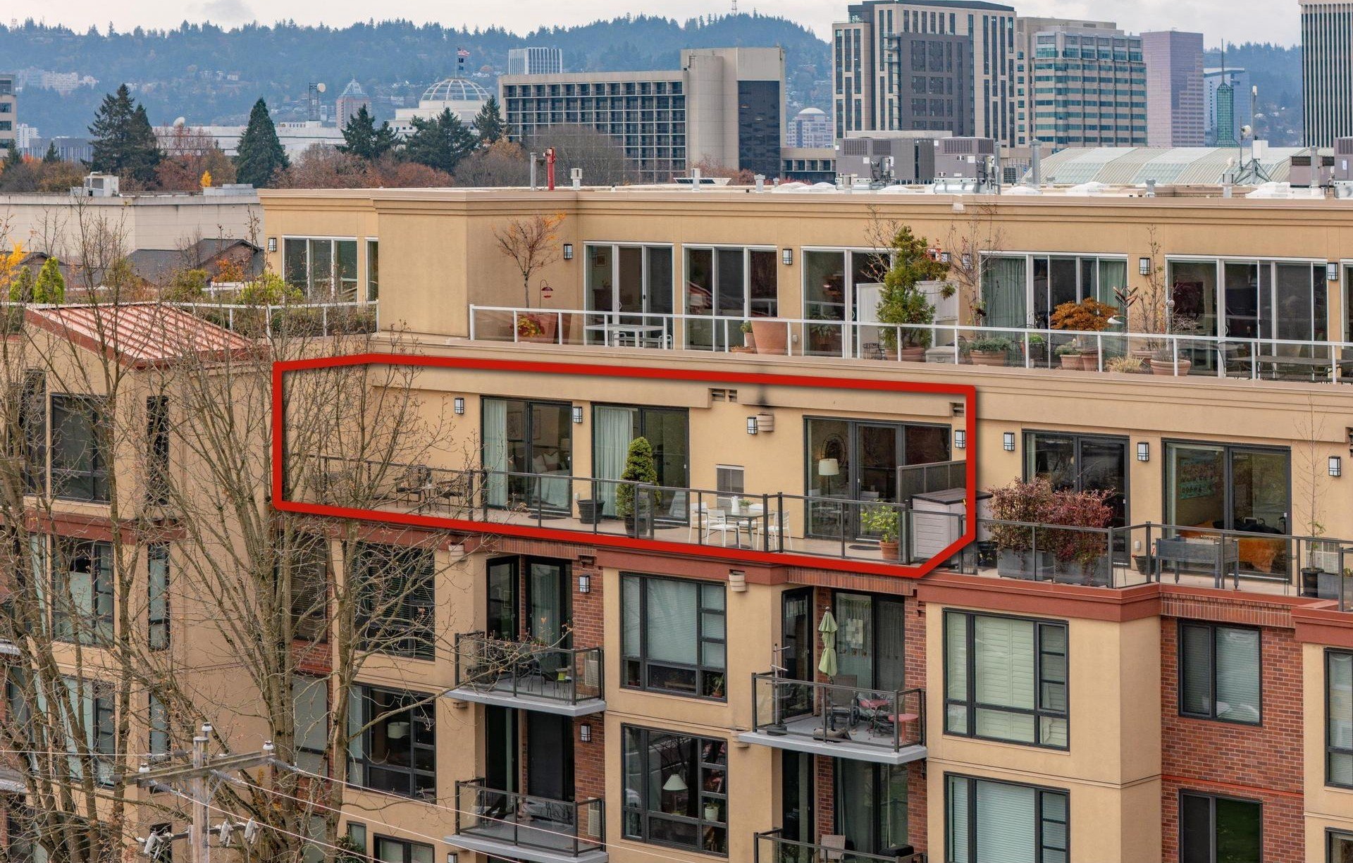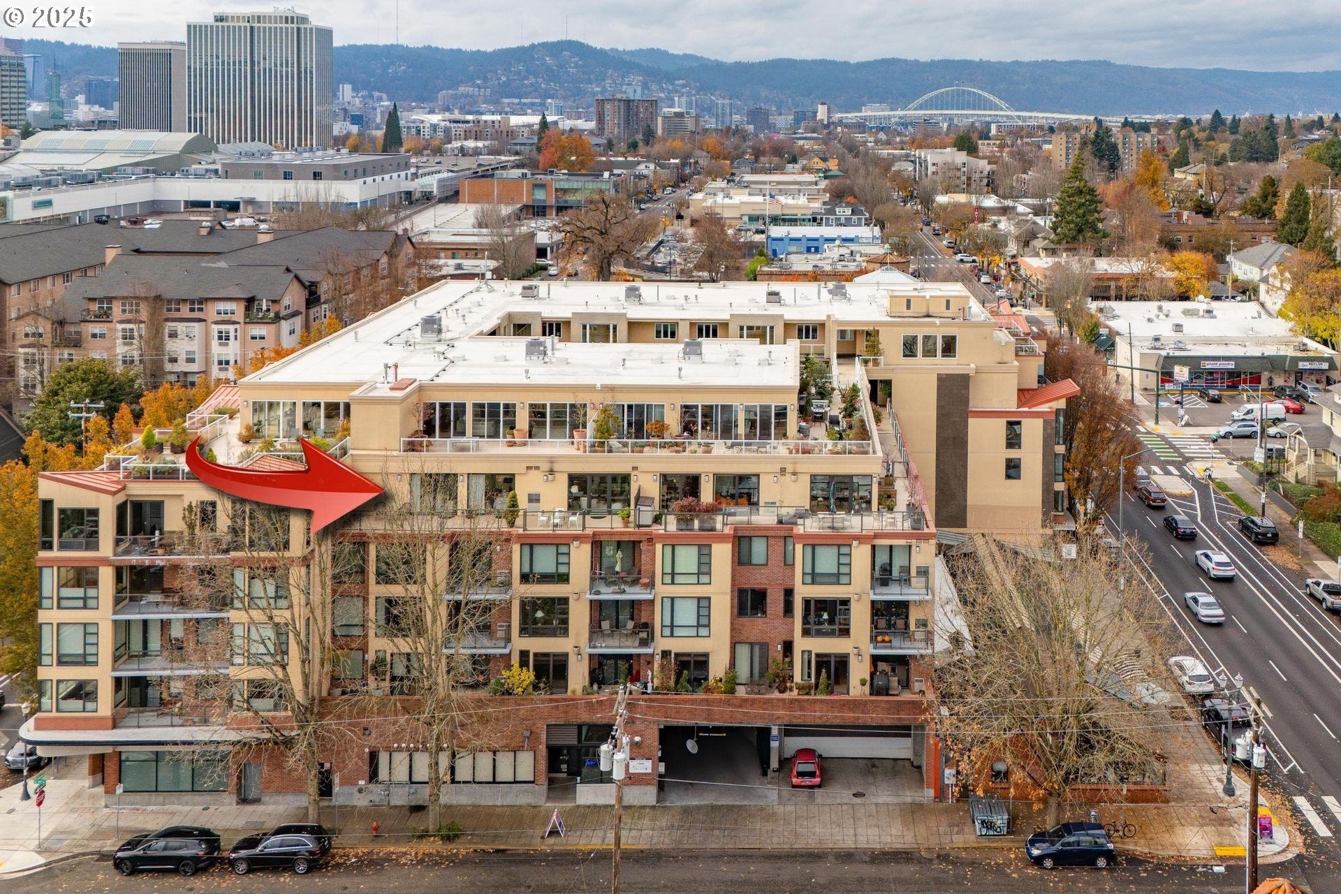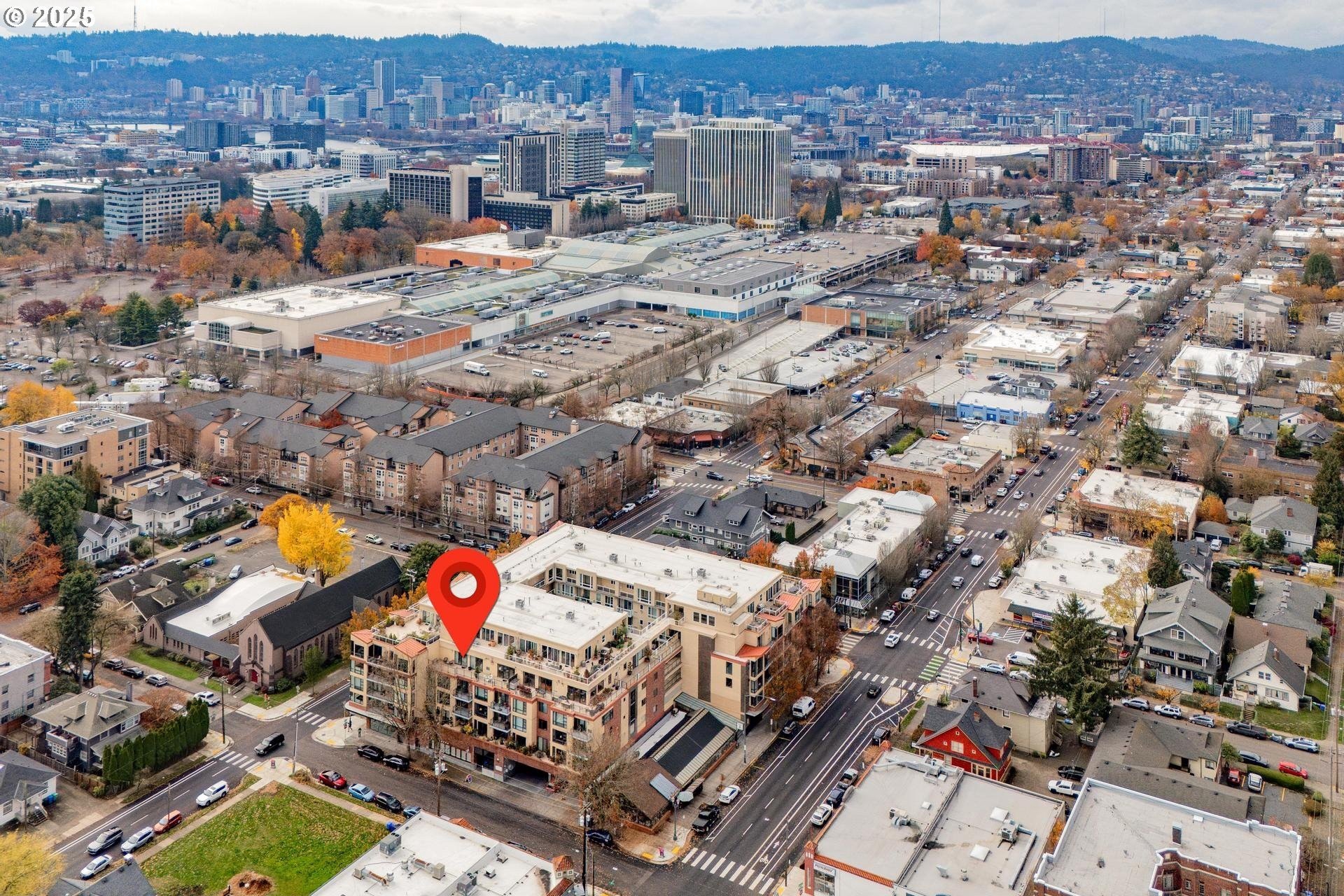 Welcome to your airy 5th-floor retreat, where an open floorplan and floor-to-ceiling windows fill the home with natural light from sunrise on. Three expansive sliding glass doors invite you out to a generous lanai—an ideal extension of your living space for morning coffee, lounging, or enjoying the soft glow of Portland evenings.Nestled in the heart of inner Northeast PDX—one of the city’s most beloved and walkable neighborhoods—this contemporary condo blends modern design with effortless everyday comfort. The east-facing orientation offers wonderful city and mountain views while keeping you connected to the energy of the neighborhood below.The beautifully appointed kitchen is a true chef’s delight, showcasing granite countertops, a gas range, stainless steel appliances, and a welcoming eat-in bar perfect for gathering with friends. Enjoy fresh paint, new flooring, and a cozy gas fireplace that makes the home truly move-in ready.Convenience is at your fingertips with two dedicated parking spaces and a secure storage unit. The community is impeccably maintained, offering lush courtyards and inviting common areas for residents to enjoy. Step outside and you’re moments from trendy shopping, restaurants, and everyday essentials—including multiple grocery options. With an exceptional Walk Score of 95 and a Bike Score of 100, this location embodies the best of Portland living—vibrant, connected, and effortlessly convenient. This is more than a home; it’s a lifestyle you’ll love.