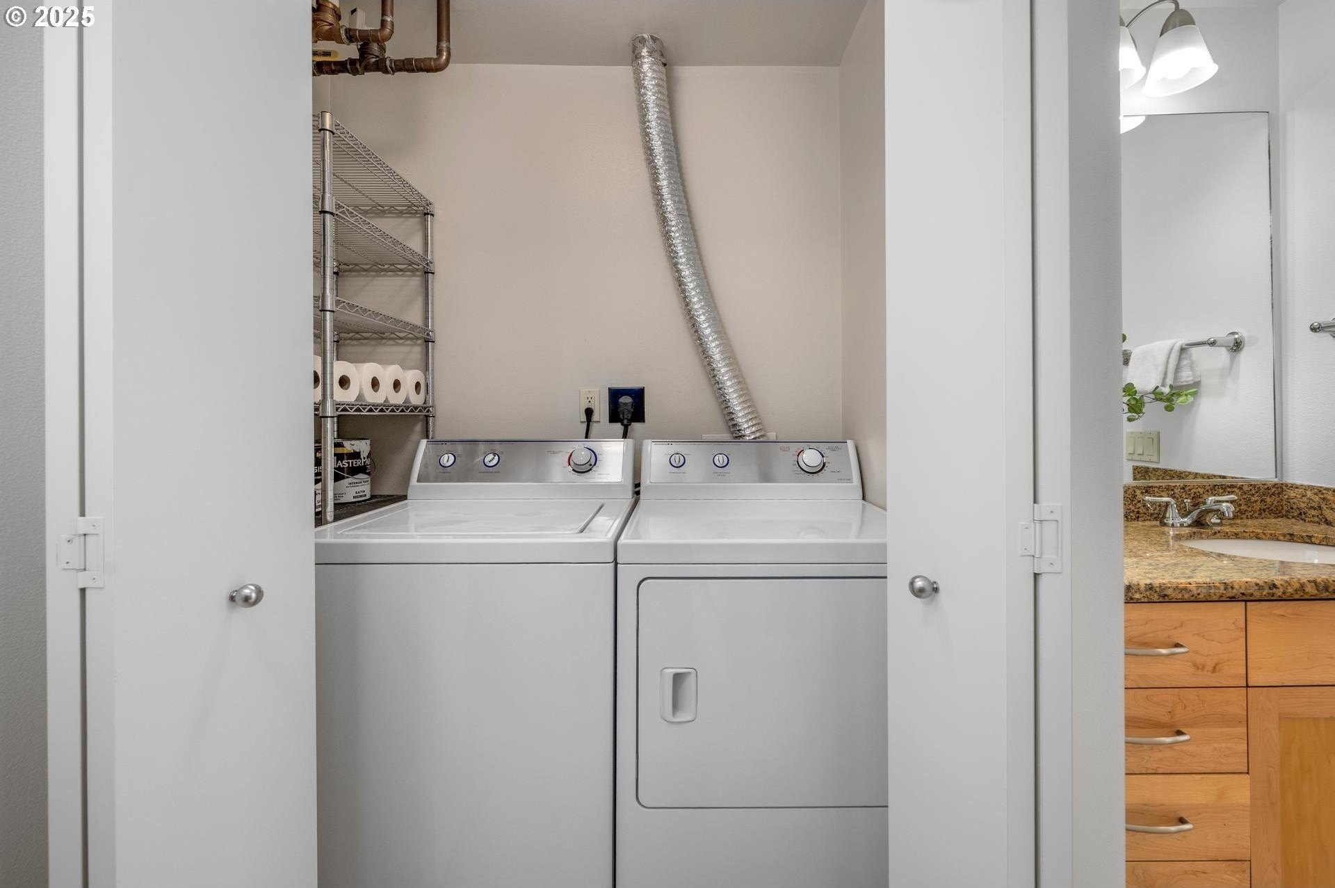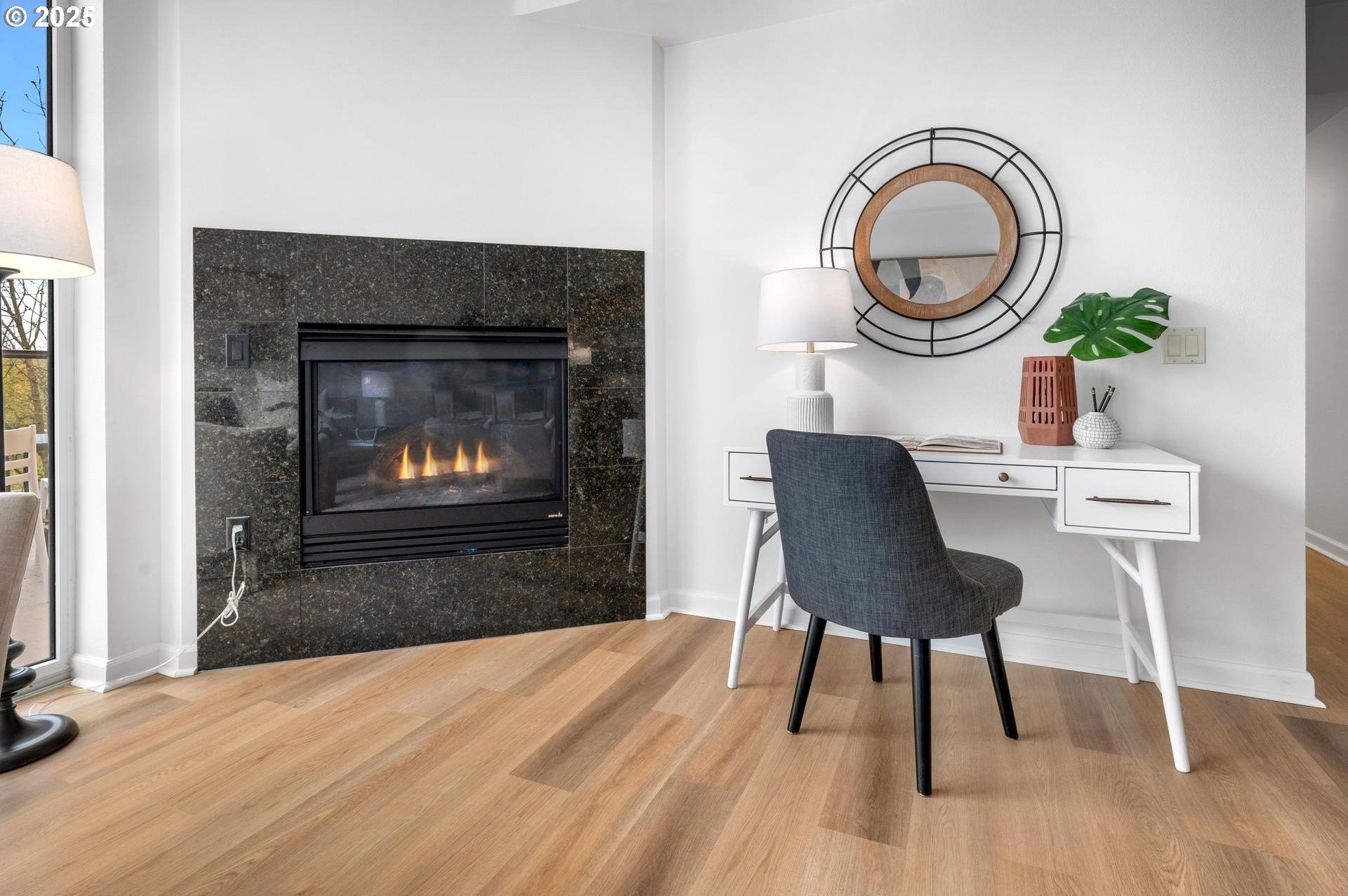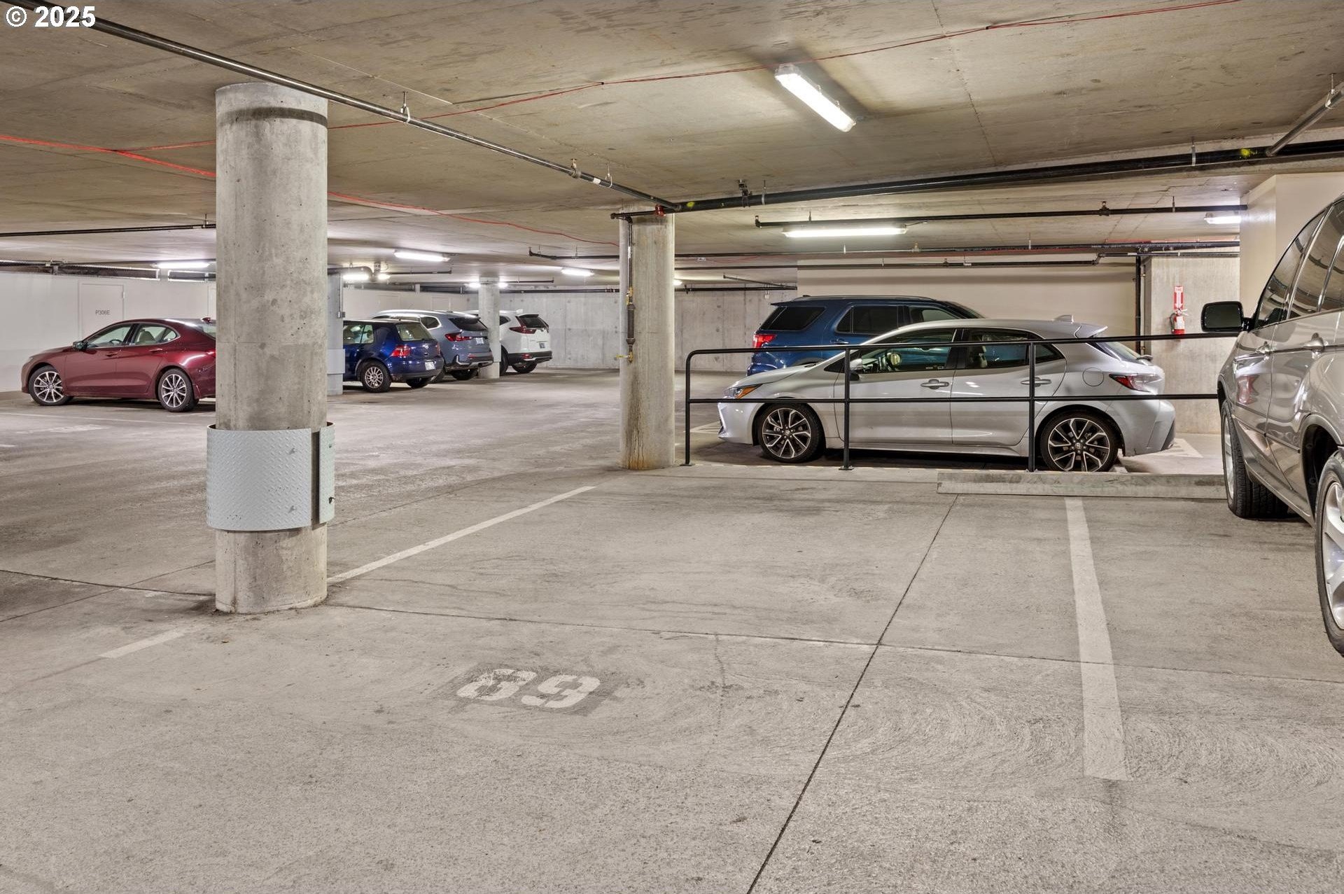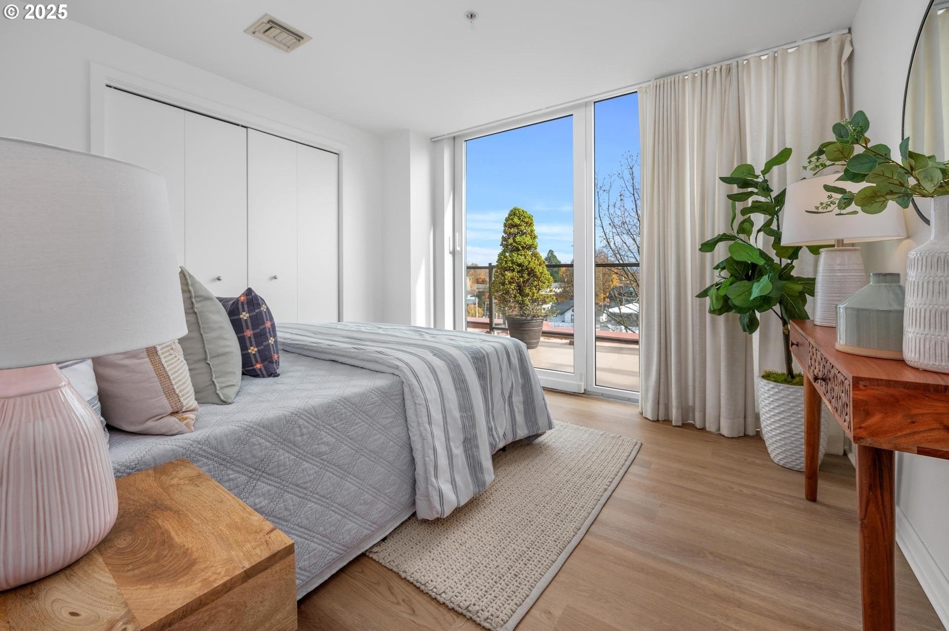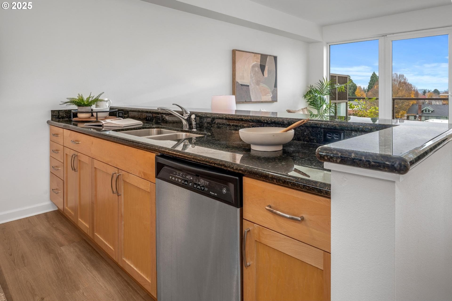 Welcome to your airy 5th-floor retreat, where an open floorplan and floor-to-ceiling windows fill the home with natural light from sunrise on. Three expansive sliding glass doors invite you out to a generous lanai—an ideal extension of your living space for morning coffee, lounging, or enjoying the soft glow of Portland evenings.Nestled in the heart of inner Northeast PDX—one of the city’s most beloved and walkable neighborhoods—this contemporary condo blends modern design with effortless everyday comfort. The east-facing orientation offers wonderful city and mountain views while keeping you connected to the energy of the neighborhood below.The beautifully appointed kitchen is a true chef’s delight, showcasing granite countertops, a gas range, stainless steel appliances, and a welcoming eat-in bar perfect for gathering with friends. Enjoy fresh paint, new flooring, and a cozy gas fireplace that makes the home truly move-in ready.Convenience is at your fingertips with two dedicated parking spaces and a secure storage unit. The community is impeccably maintained, offering lush courtyards and inviting common areas for residents to enjoy. Step outside and you’re moments from trendy shopping, restaurants, and everyday essentials—including multiple grocery options. With an exceptional Walk Score of 95 and a Bike Score of 100, this location embodies the best of Portland living—vibrant, connected, and effortlessly convenient. This is more than a home; it’s a lifestyle you’ll love.