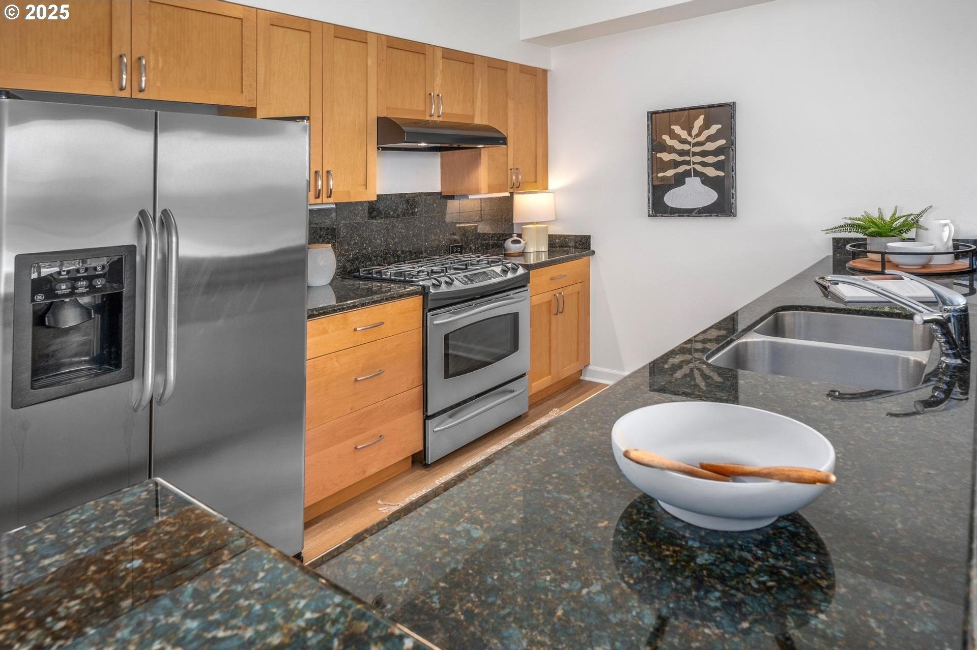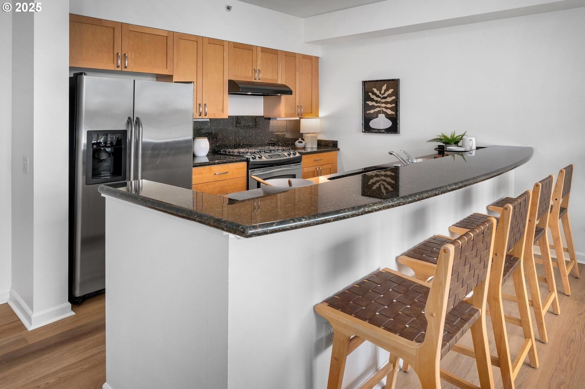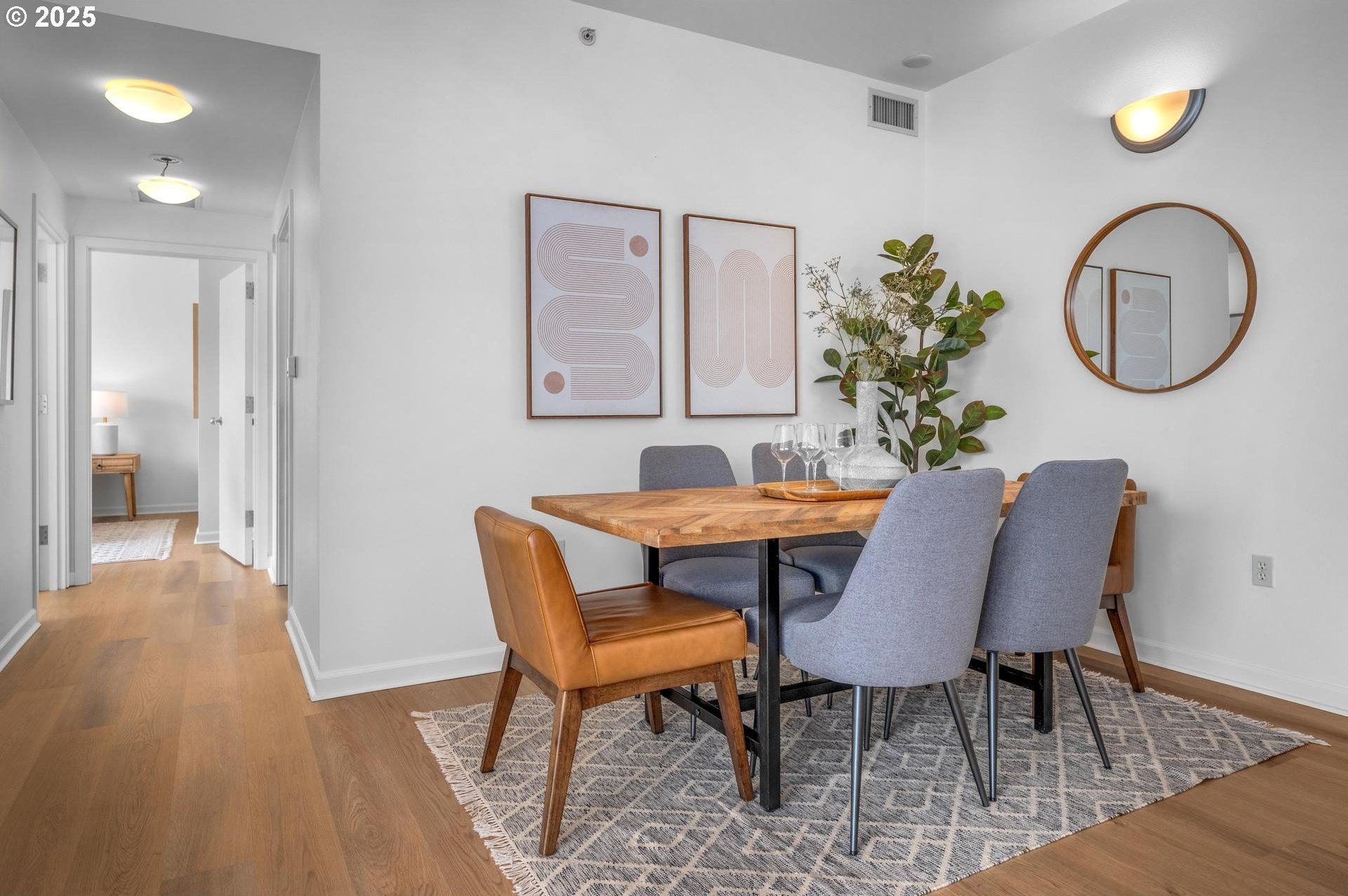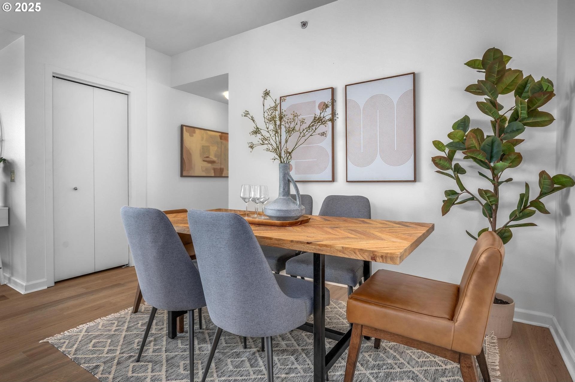 Welcome to your airy 5th-floor retreat, where an open floorplan and floor-to-ceiling windows fill the home with natural light from sunrise on. Three expansive sliding glass doors invite you out to a generous lanai—an ideal extension of your living space for morning coffee, lounging, or enjoying the soft glow of Portland evenings.Nestled in the heart of inner Northeast PDX—one of the city’s most beloved and walkable neighborhoods—this contemporary condo blends modern design with effortless everyday comfort. The east-facing orientation offers wonderful city and mountain views while keeping you connected to the energy of the neighborhood below.The beautifully appointed kitchen is a true chef’s delight, showcasing granite countertops, a gas range, stainless steel appliances, and a welcoming eat-in bar perfect for gathering with friends. Enjoy fresh paint, new flooring, and a cozy gas fireplace that makes the home truly move-in ready.Convenience is at your fingertips with two dedicated parking spaces and a secure storage unit. The community is impeccably maintained, offering lush courtyards and inviting common areas for residents to enjoy. Step outside and you’re moments from trendy shopping, restaurants, and everyday essentials—including multiple grocery options. With an exceptional Walk Score of 95 and a Bike Score of 100, this location embodies the best of Portland living—vibrant, connected, and effortlessly convenient. This is more than a home; it’s a lifestyle you’ll love.