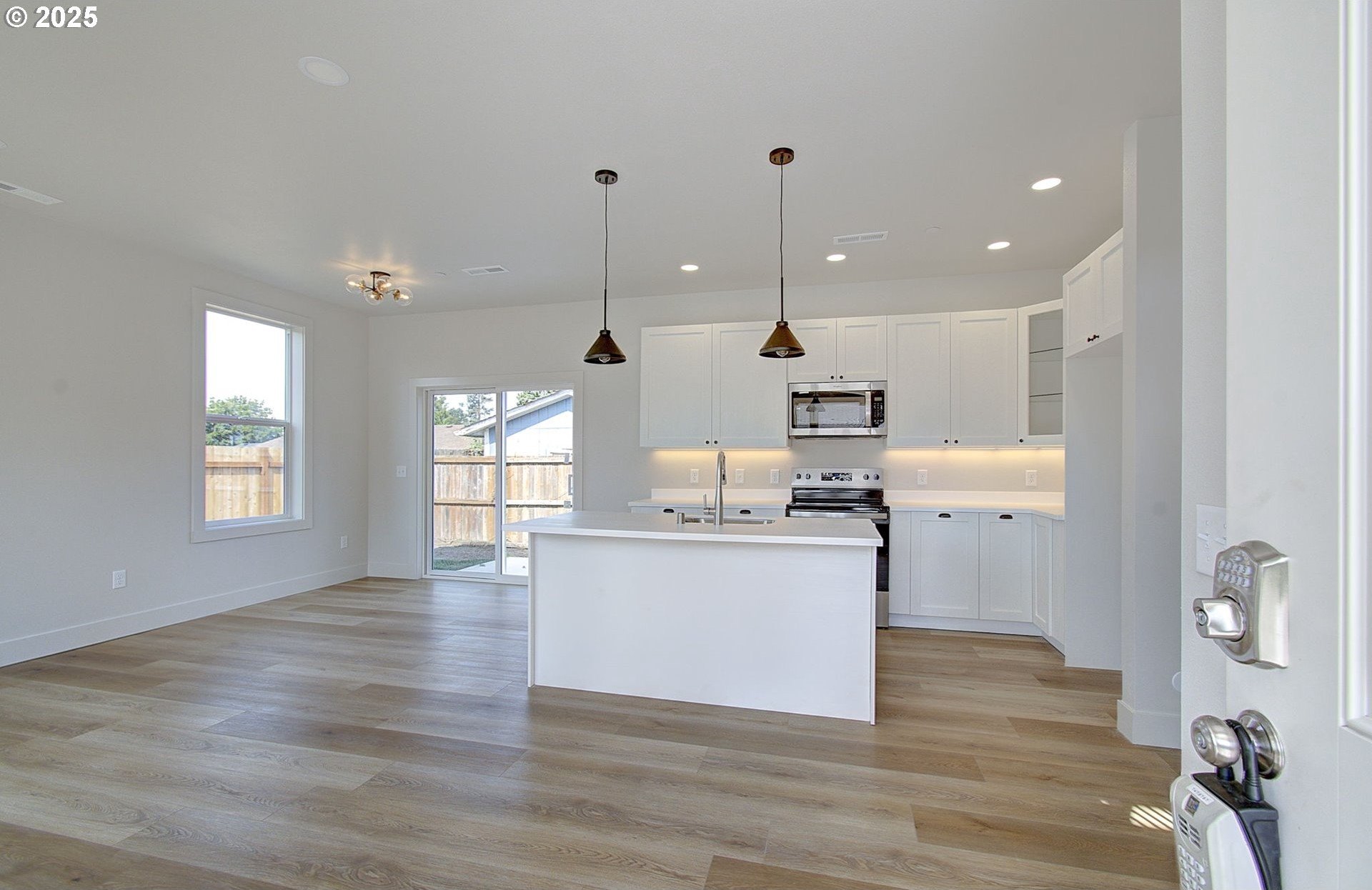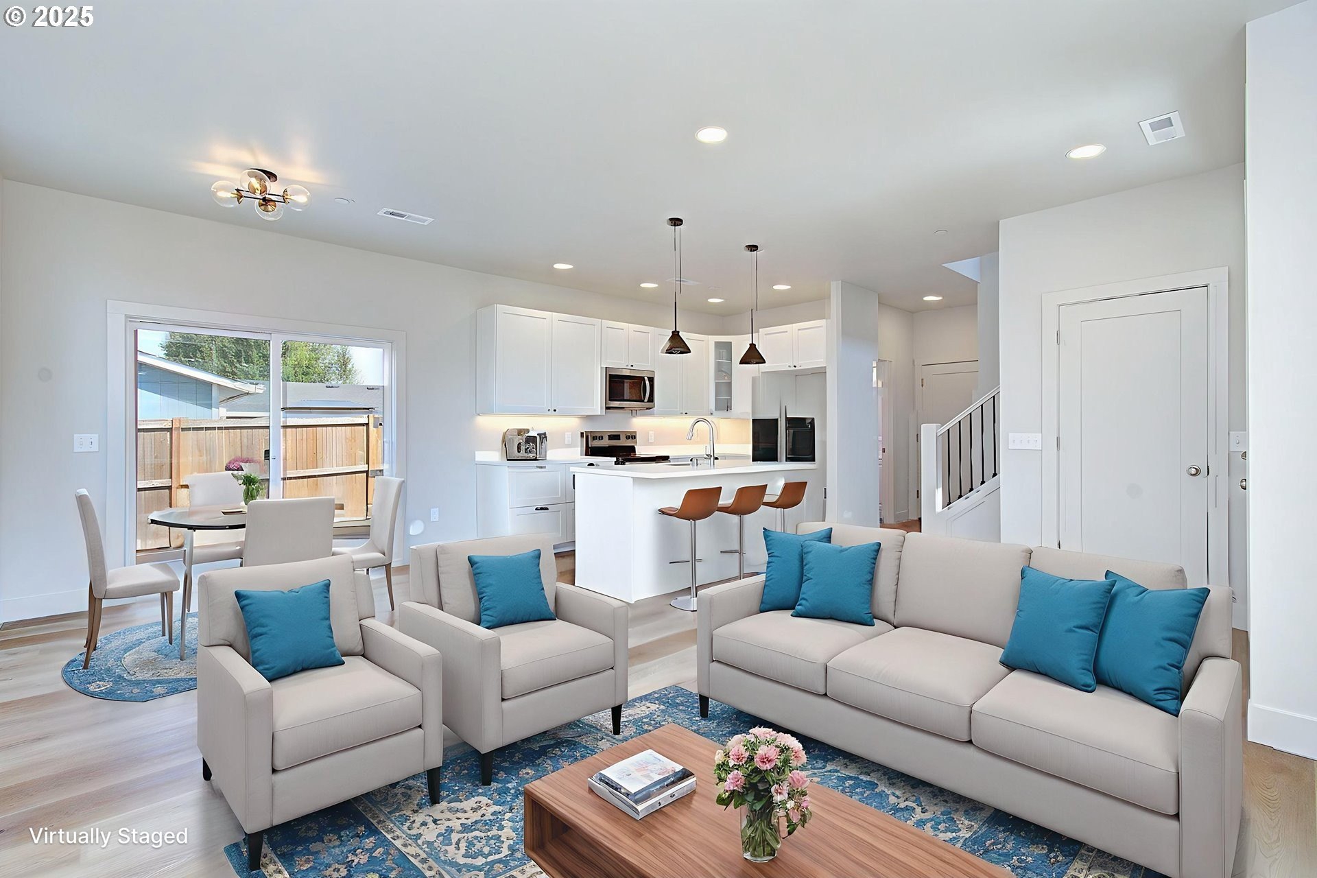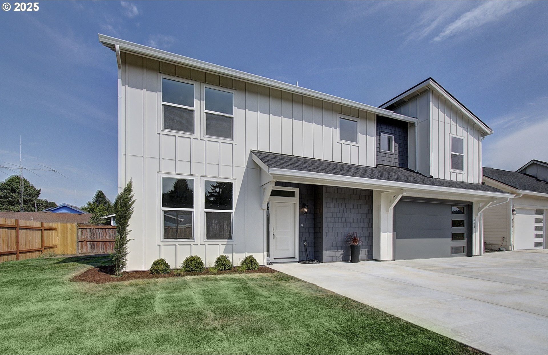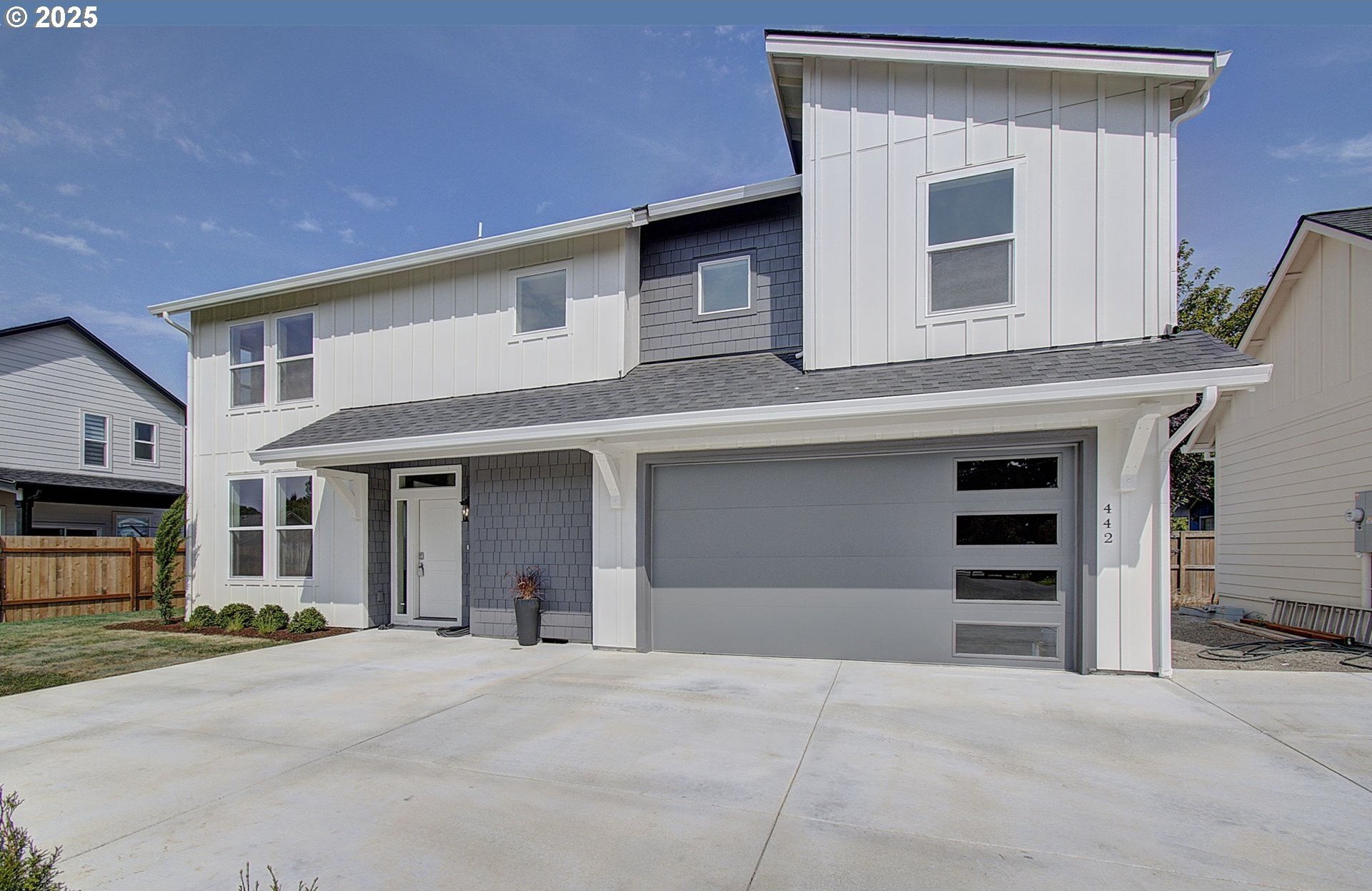 Experience modern living in this newly built two-story home, quietly situated at the end of a long shared drive for added privacy. Thoughtfully designed with a blend of style and function, this 3-bed, 2.5-bath residence offers an inviting open-concept layout highlighted by tasteful farmhouse-inspired finishes. The main level features durable laminate flooring, upgraded lighting, and a spacious great room that flows effortlessly into the kitchen, showcasing stainless steel appliances and generous space for cooking and entertaining. A back patio extends your living area outdoors—ideal for morning coffee or warm-weather gatherings. Upstairs, discover three well-sized bedrooms, including a comfortable primary suite, along with beautifully finished bathrooms. Additional features include an EV charger in the garage and modern touches throughout. Move-in ready and designed for everyday ease.