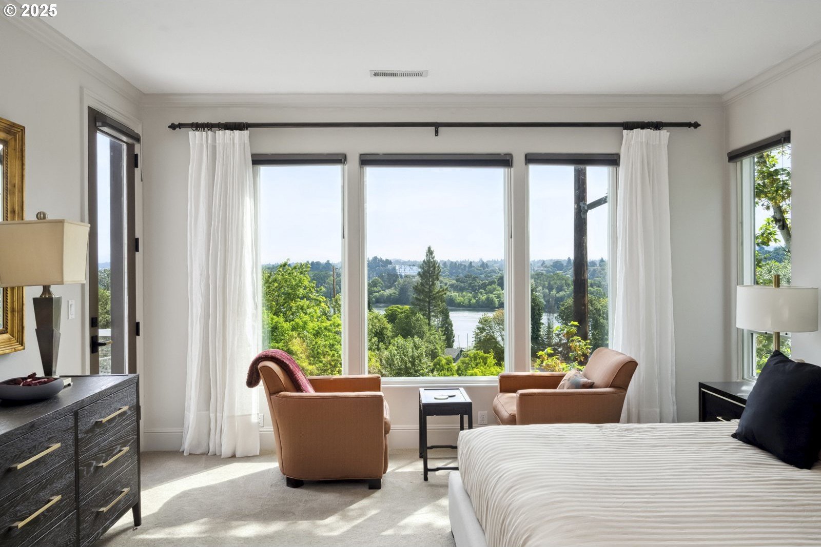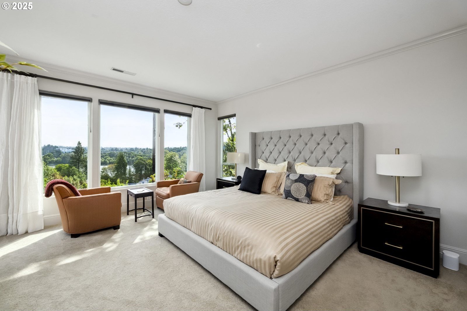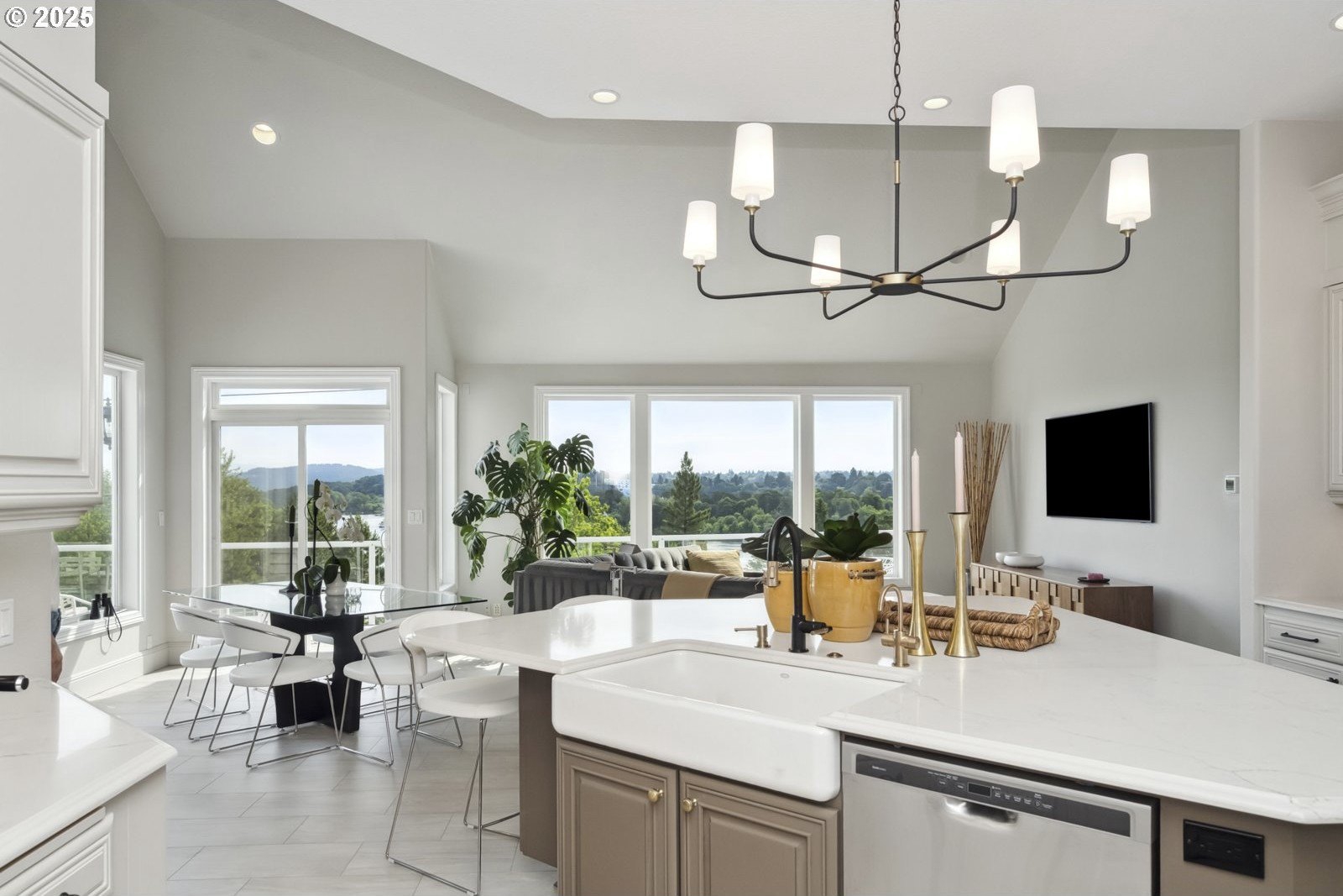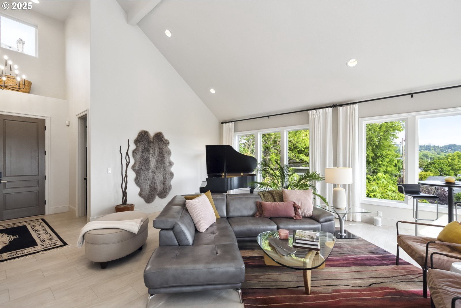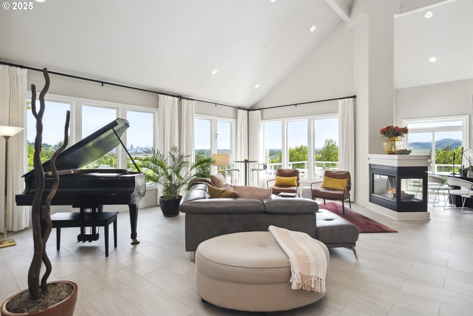 Stunning views, high ceilings and abundant natural light take center stage at this exceptional Portland home. Perched just above Portland’s South Waterfront, this exceptional residence offers sweeping views of downtown, Mt. Hood, and the Willamette River. An entertainer’s dream, the open floorplan is both luxurious and comfortable, offering seamless flow through expansive living areas designed for effortless hosting and everyday enjoyment. The gourmet kitchen is a showstopper with new quartz countertops, backsplash, and updated lighting. A cozy gas fireplace adds warmth and ambiance to the living room, while new flooring, paint and finishes throughout elevate every detail. Off the main level, you will find an expansive back deck, perfect for enjoying a sunset cocktail or summertime entertaining. The main-level primary suite offers true one-level living and includes a spacious walk-in closet with custom organizers and nearby laundry. Downstairs, you’ll find three additional bedrooms, two full bathrooms, a large recreation room with projector screen, and an Italian-inspired wine room for a touch of European charm. On the lowest level, a fully permitted 1-bedroom, 1-bath ADU with its own private entrance offers ideal space for guests, multi-generational living, or rental income (currently rented at $1950). Recent upgrades include new garage doors, brand new boiler and air conditioning and elegant linen drapery panels. An attached three-car garage and low-maintenance front yard complete this rare opportunity to live in a tucked away street overlooking Johns Landing and South Waterfront. Experience luxury, comfort, and convenience all in one breathtaking home.
