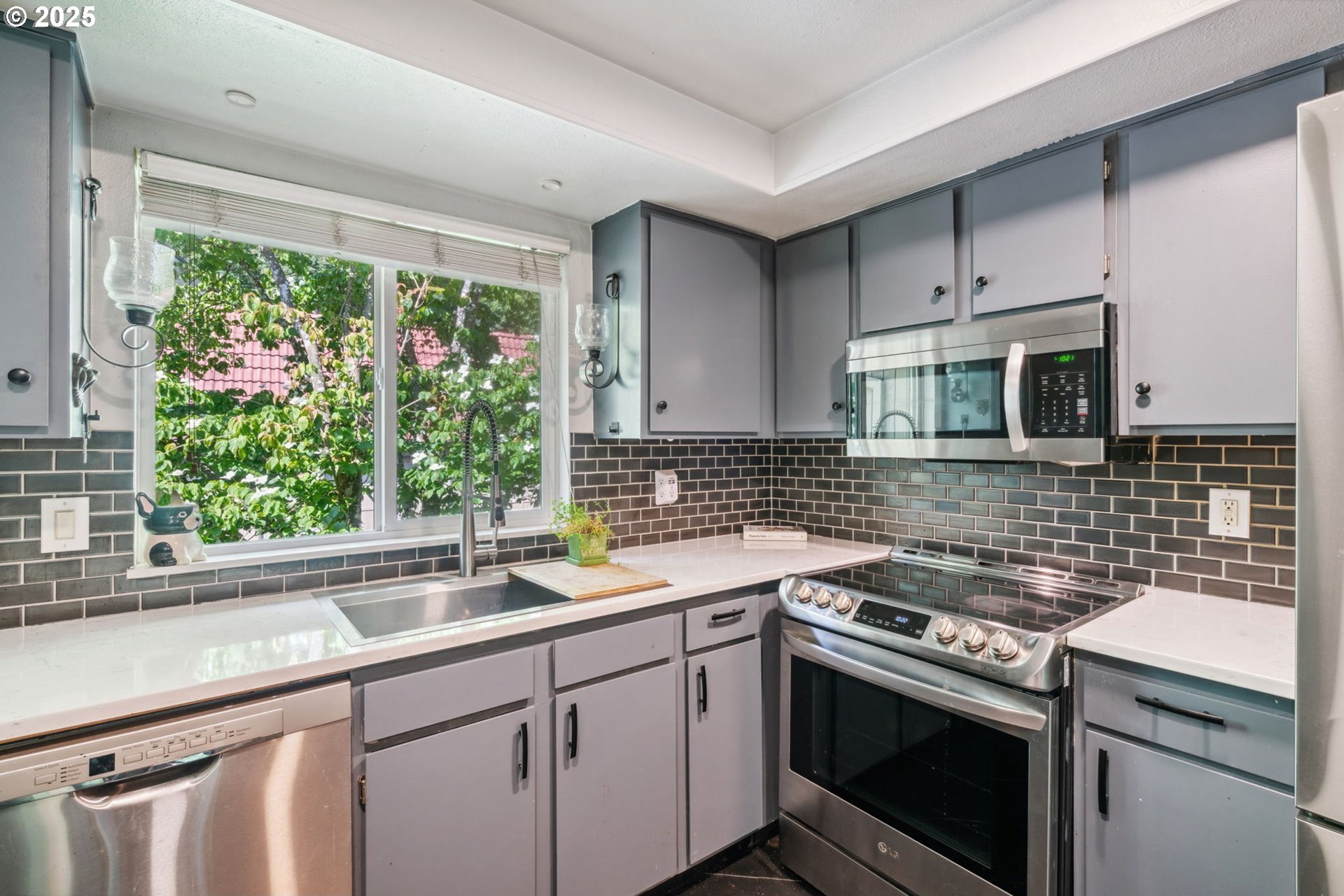 This rare find sits quietly in a beautifully maintained pocket of West Linn—right in the heart of one of Oregon’s most desirable communities. It’s a charming 2-bed, 1.5-bath townhouse-style condo with its own detached garage, and it really strikes that perfect balance of comfort, convenience, and low-maintenance living. Inside there are: vaulted ceilings, slate tile floors, quartz counters, and stainless steel appliances. Both bedrooms are generously sized and both bathrooms are updated. You also have a full-size, side-by-side washer and dryer—which is a huge perk in condo living. One of the best features? You get TWO private balconies—one on each floor. Morning coffee, evening wine, or just fresh air whenever you want it. The detached garage is just steps from your front door, offering extra storage and easy parking. Beyond the home, West Linn itself really shines. You’re minutes from Mary S. Young Park with miles of wooded trails, picnic areas, sports fields, and an off-leash dog area. Camassia Nature Preserve is close by too—perfect for quiet walks and spring wildflowers. Nearby neighborhood parks—Tanner Creek, Marylhurst Heights, and Robinwood—offer splash pads, playgrounds, courts, and green space. If you love being on the water, you’re close to the Willamette River Water Trail for kayaking and paddleboarding at Willamette Park, with scenic riverfront trails at Maddax Woods and Swiftshore Open Space. Shopping and dining are easy and close—Historic Willamette Main Street is just minutes away, with additional options at Bridgeport Village and downtown Lake Oswego. All within the top-rated West Linn–Wilsonville School District, known for academic excellence and long-term value.
