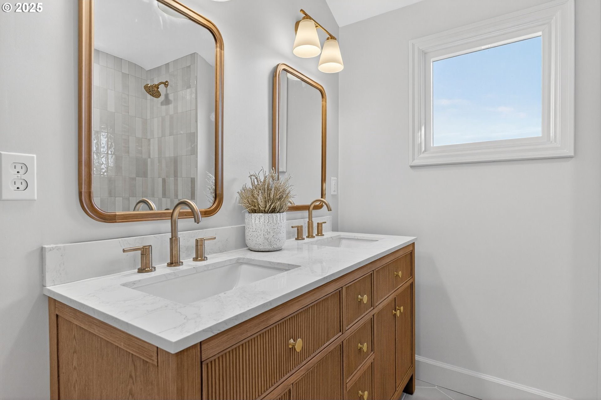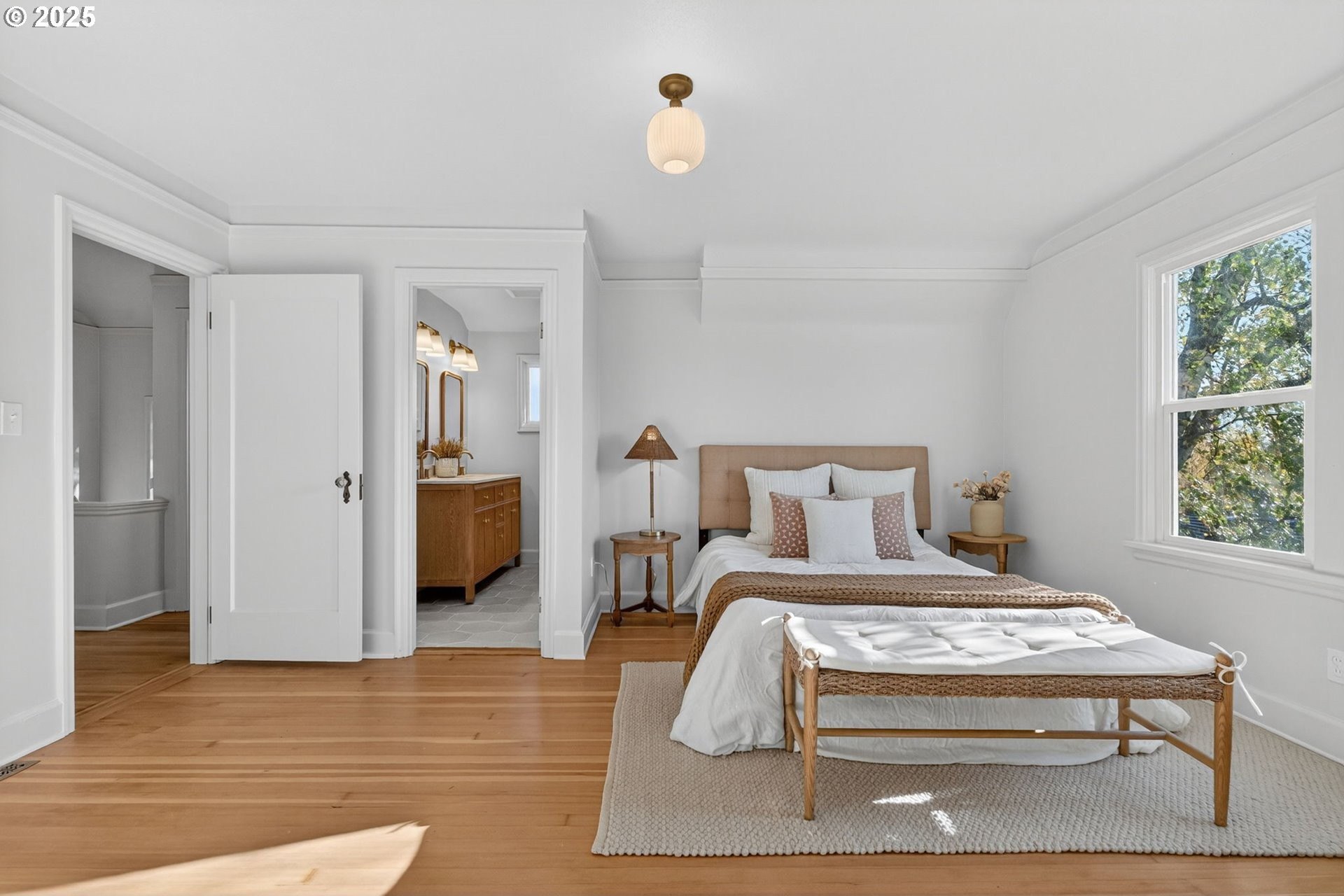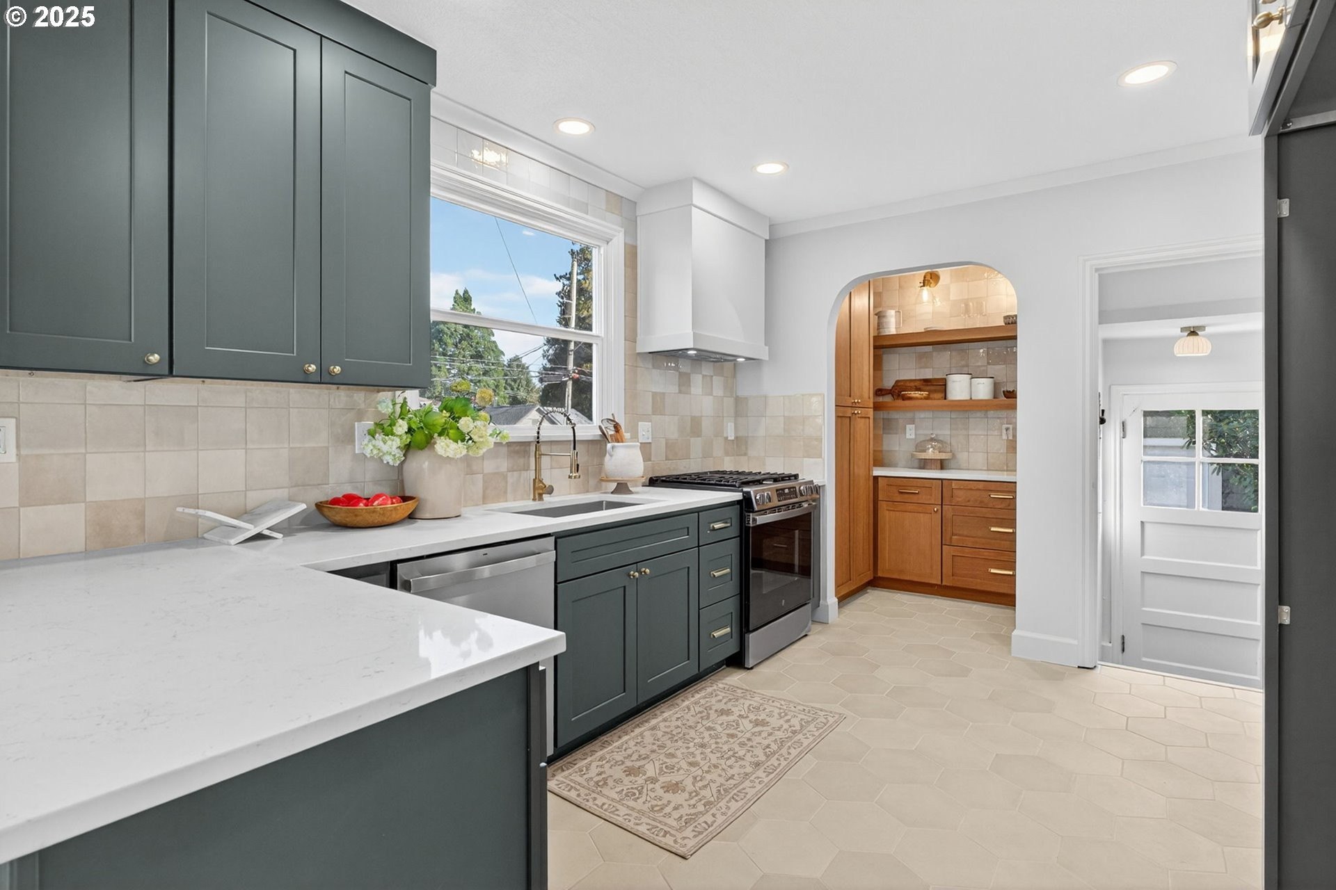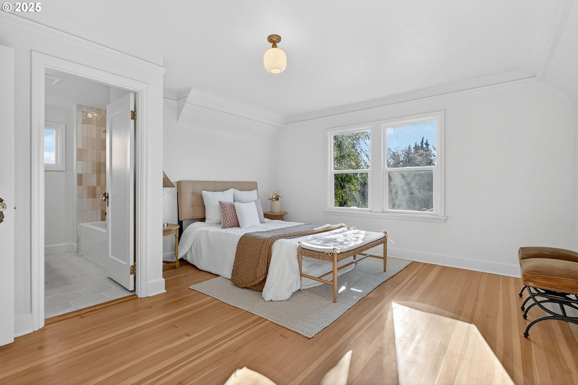 Stunningly remodeled Mt. Tabor Tudor blends modern amenities with original period details. Living room boasts a beautifully preserved fireplace, picture rail molding and wall of wooden windows that fill the space with natural light. Newly remodeled kitchen opens to expansive dining room with more period charm and peek-a-boo views of Mt. Tabor. Large kitchen with peninsula offers quartz countertops, gas stove with custom hood, Bedrosions designer tile, walk-in pantry with open shelving and an abundance of storage. Newly refinished oak and fir floors throughout with a full bedroom and bathroom on main floor. Upstairs features generously sized primary suite with large en-suite bathroom and walk-in closet. 3rd bedroom upstairs with adjoining bonus room that could be a great flex space/office. Full height unfinished basement allows for future expansion possibilities. Large corner lot with two car garage backing to highly rated Bridger Elementary. Conveniently positioned just blocks from iconic Mt. Tabor park, Montavilla shops, farmers market, cafes and restaurants. This is the one!