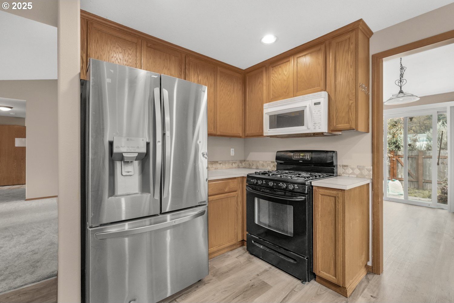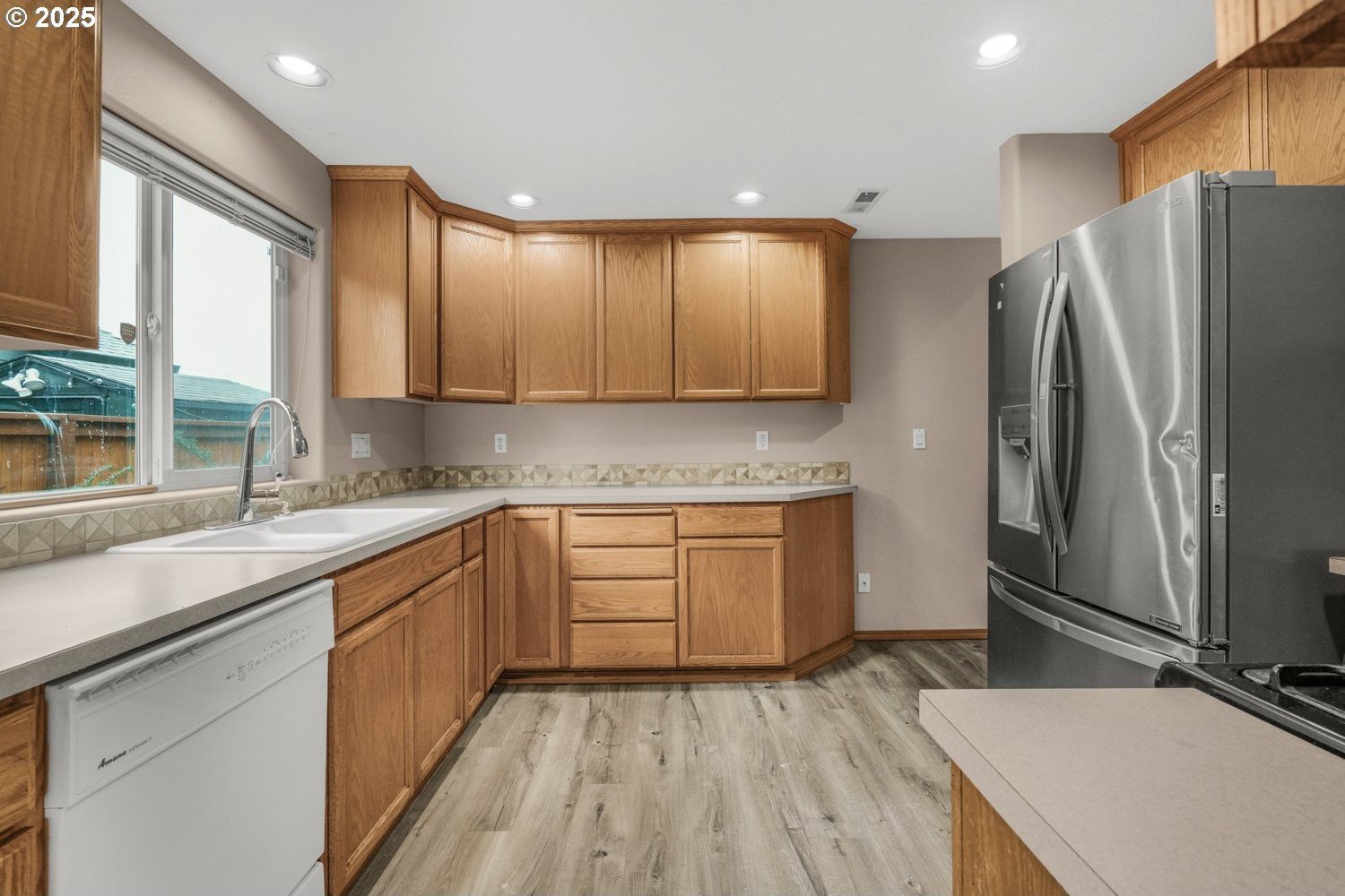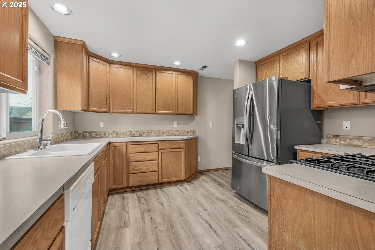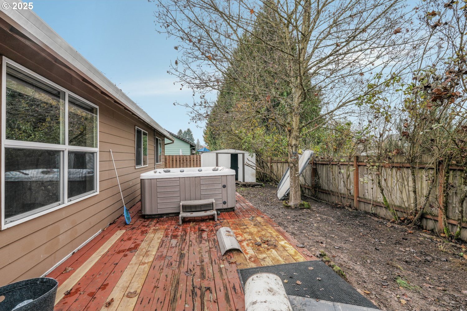 Move-in ready and well maintained, this 3-bed, 2-bath home offers comfortable living in a convenient location. The spacious living room features vaulted ceilings and great natural light, flowing seamlessly into the dining area with sliding doors that open to the backyard making it ideal for indoor/outdoor living and entertaining. The kitchen provides lots of prep space and generous cabinetry for storage. The private primary suite is thoughtfully positioned on its own side of the home and includes a large walk-in closet and an en-suite bath with dual vanities. Two additional bedrooms and a full guest bath with a tub/shower complete the layout. A dedicated laundry room with utility sink adds everyday convenience. Outside, enjoy a fully fenced backyard with both a patio and a deck with a hot tub that's perfect for gatherings, grilling, or relaxing. All this just minutes from dining, shopping, schools, parks with hiking trails, and marinas along the Multnomah Channel of the Willamette River, offering swimming, boating, and a convenient ramp for water access.