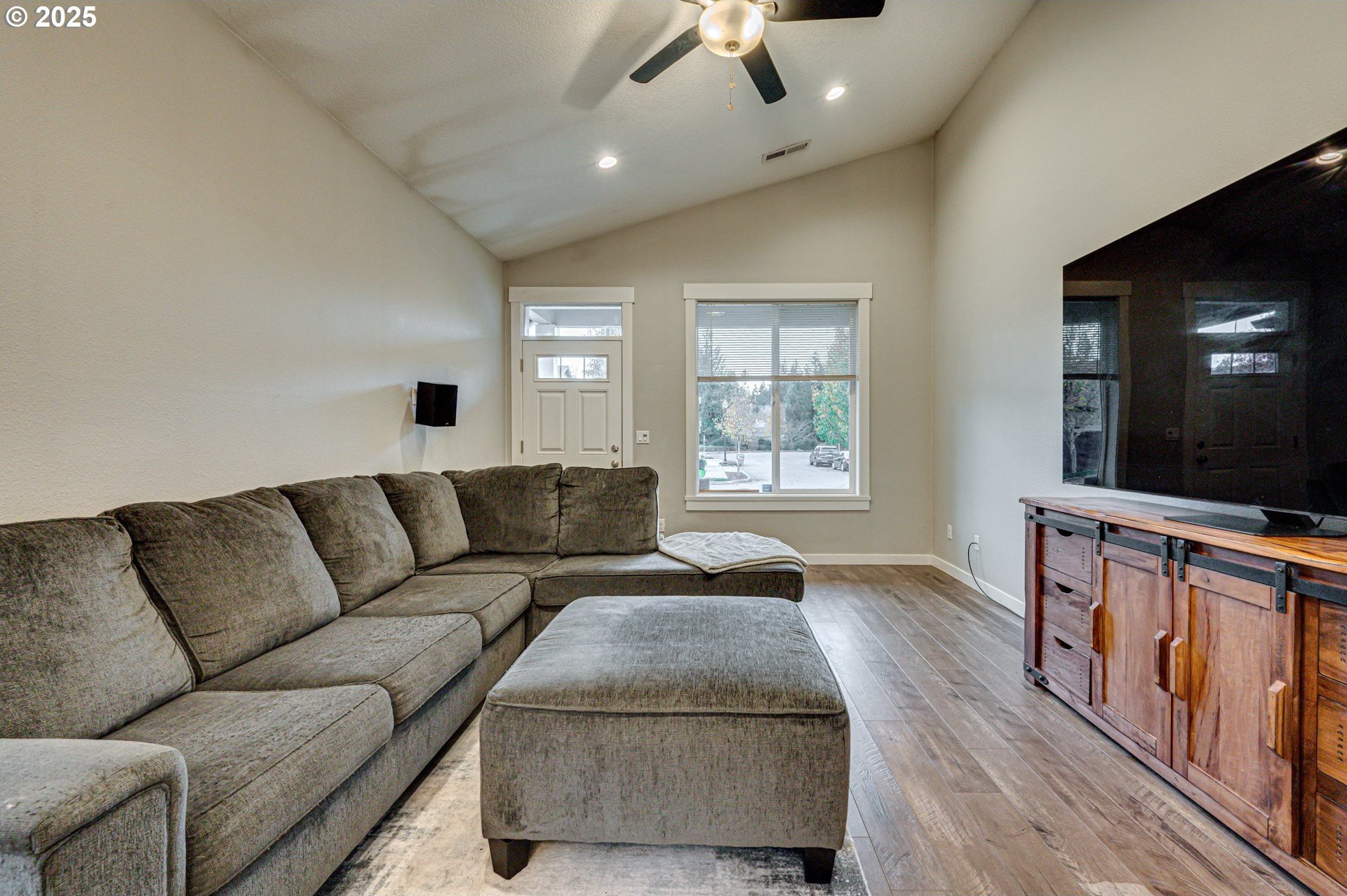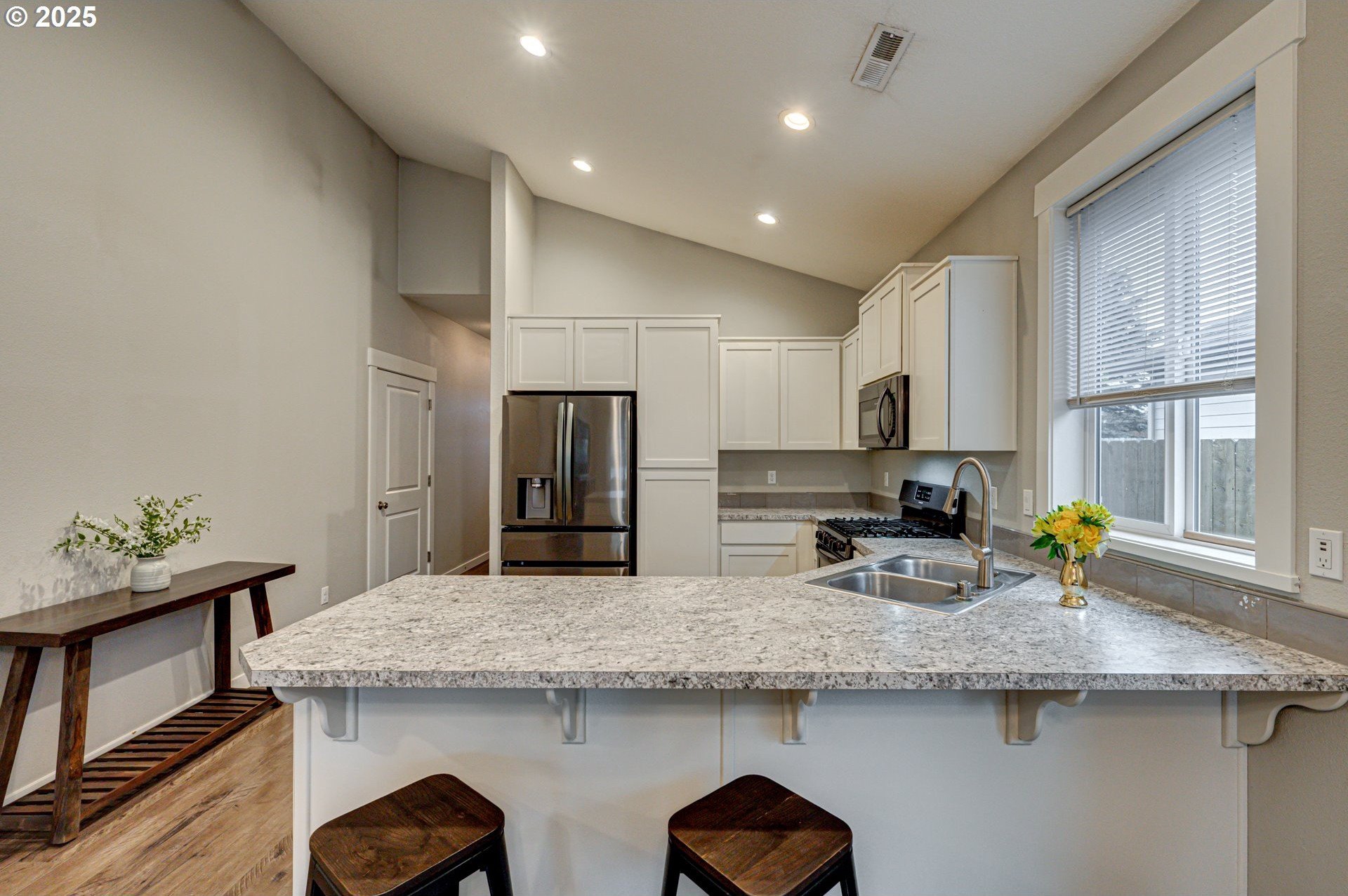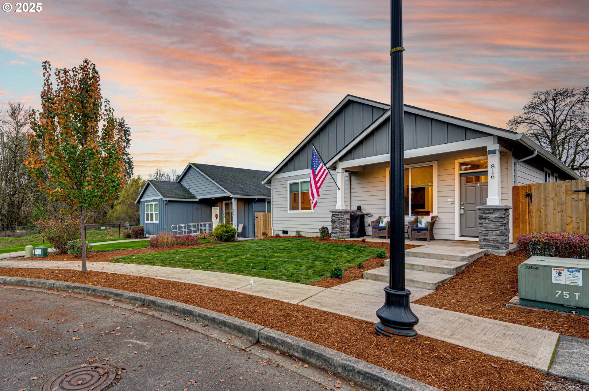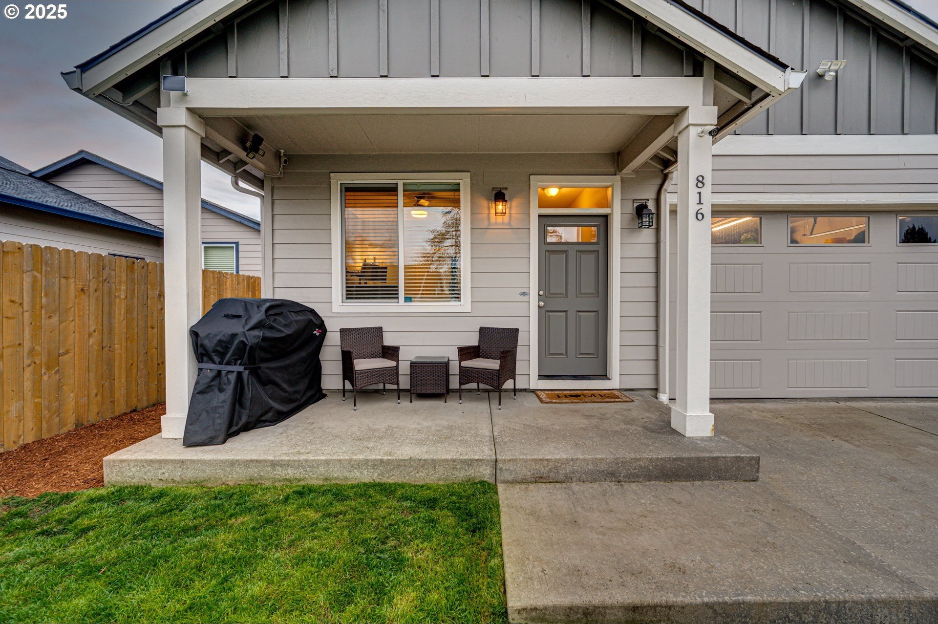 Built in 2019, this 3-bedroom, 2-bath home is well-designed with a vaulted, open great-room layout. The kitchen includes a gas range, stainless-steel appliances, and generous counter and cupboard space. LVP flooring extends through the main living areas, with carpet in the bedrooms for added comfort. A covered back patio and fenced yard with gated alley access offer practical outdoor use. Permanent, programmable roofline lighting sets the perfect atmosphere for holidays and celebrations year-round. Located on a low-maintenance lot in a quiet cul-de-sac just moments from town, within walking distance to downtown shops and restaurants. This home is a solid fit for a first-time buyer or anyone looking to downsize while keeping everyday convenience.