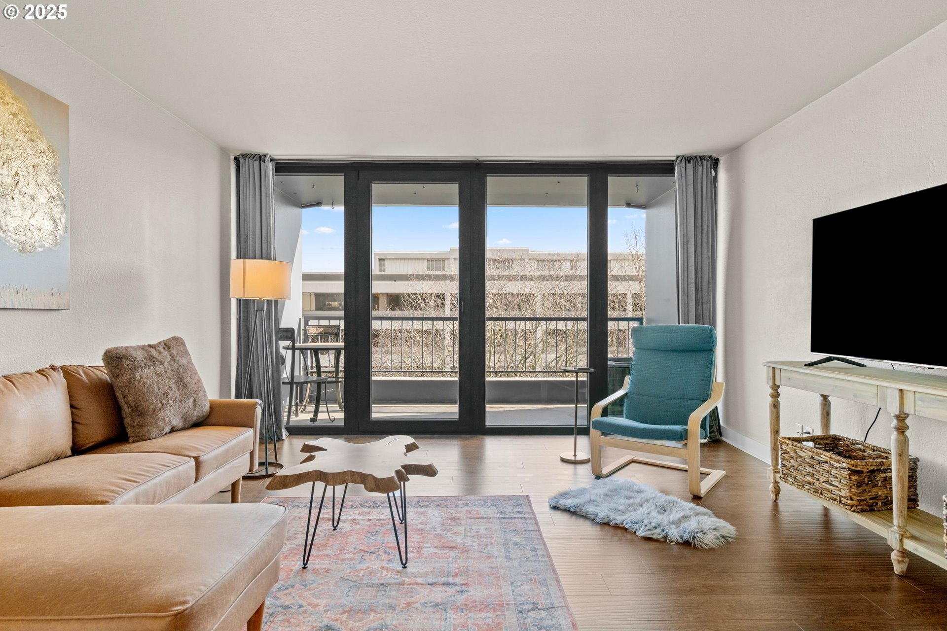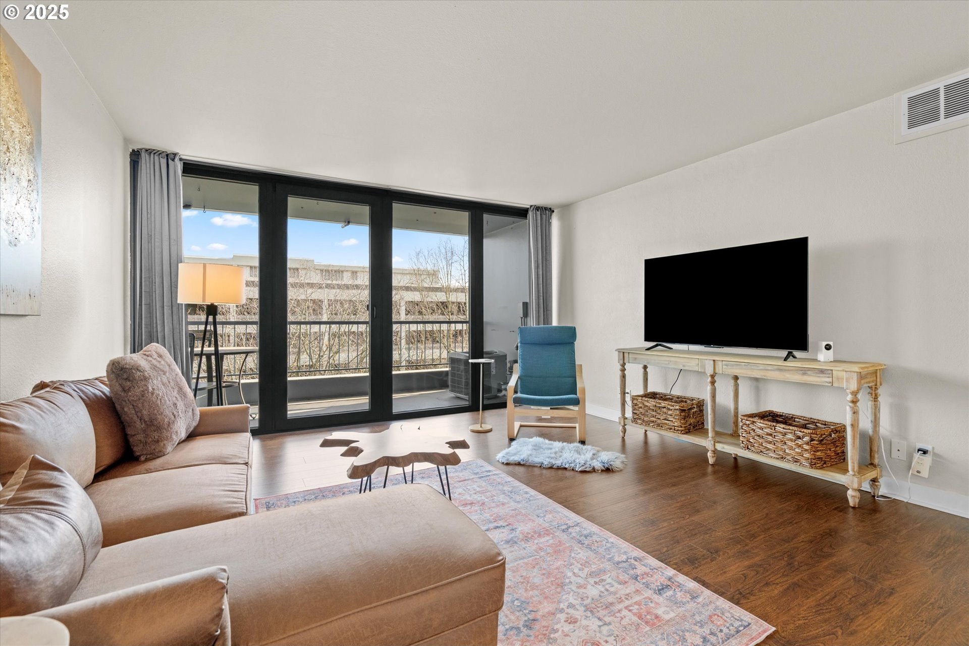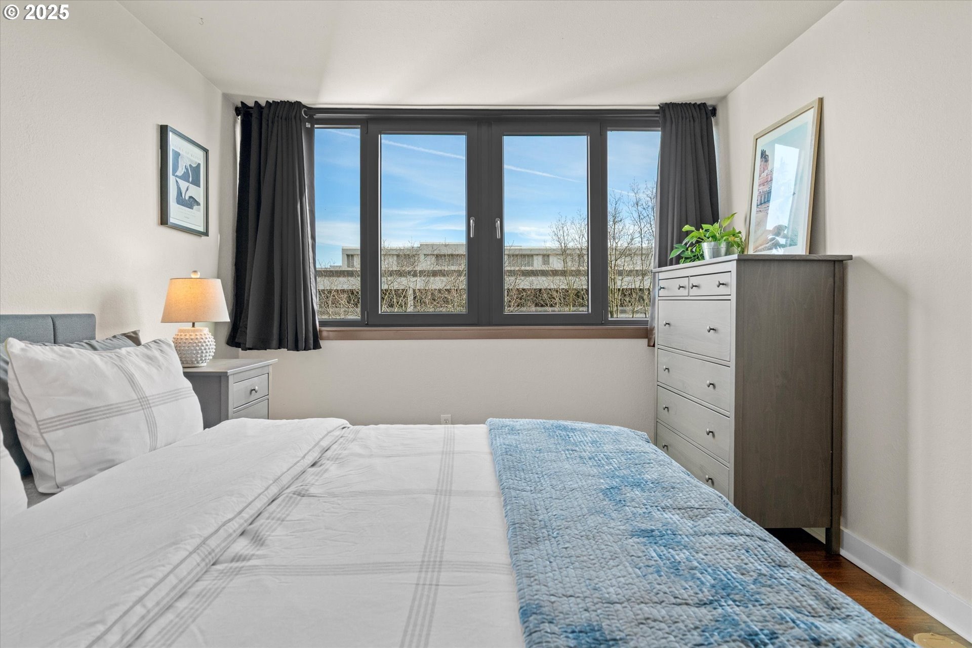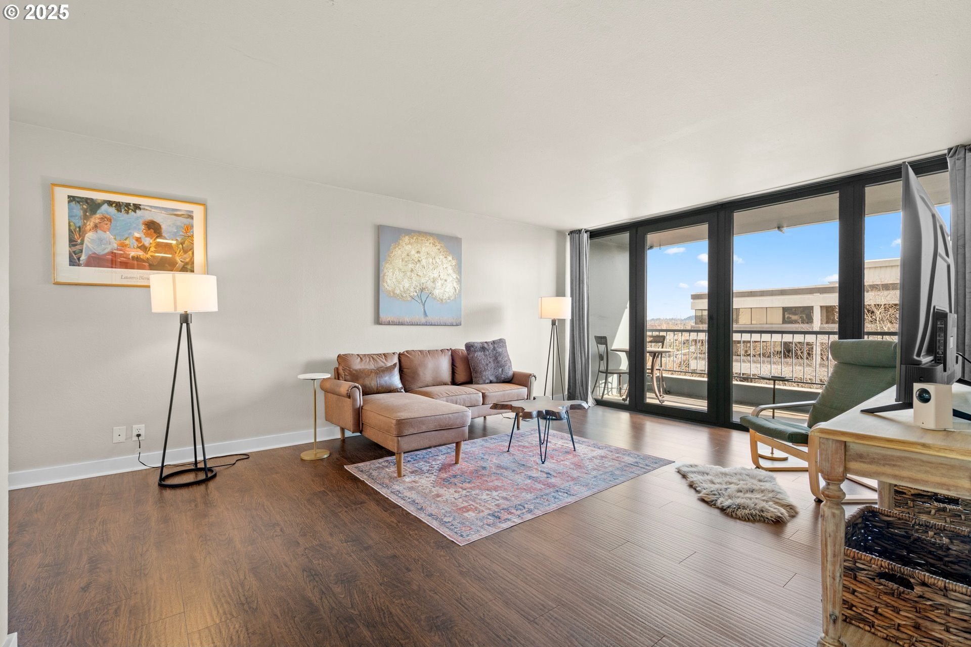Light and bright one bedroom corner unit with a view! Welcome to downtown Portland's beautiful Harrison East Building. Steeped in Mid-Century architecture this building offers affordable living in a quiet corner of SW Portland. It's move-in ready with all furniture included. The "F" units are a popular layout with more than 700 square set on the corner of the building. Living is comfortable with a large living space that flows outside to the deck. Looking North East you will take in territorial views including the Willamette river and bridges. This unit comes with a storage locker and large deeded parking space. The Harrison building complex boasts free shared laundry, fast wifi internet, a shared sauna and pool! Enjoy downtown living at its best. Walk to local parks, restaurants, cafes, the river, shopping, and local entertainment. Your commute will be a breeze with the street car just outside your door!