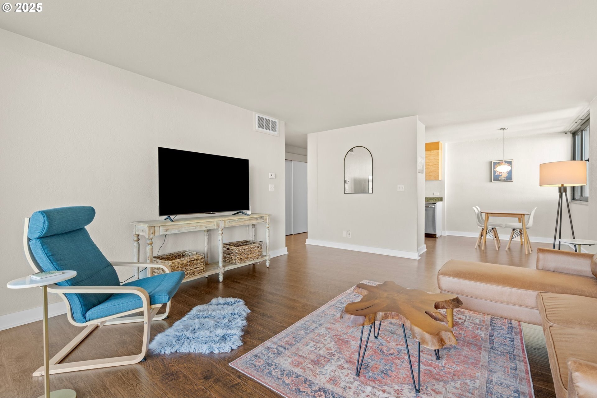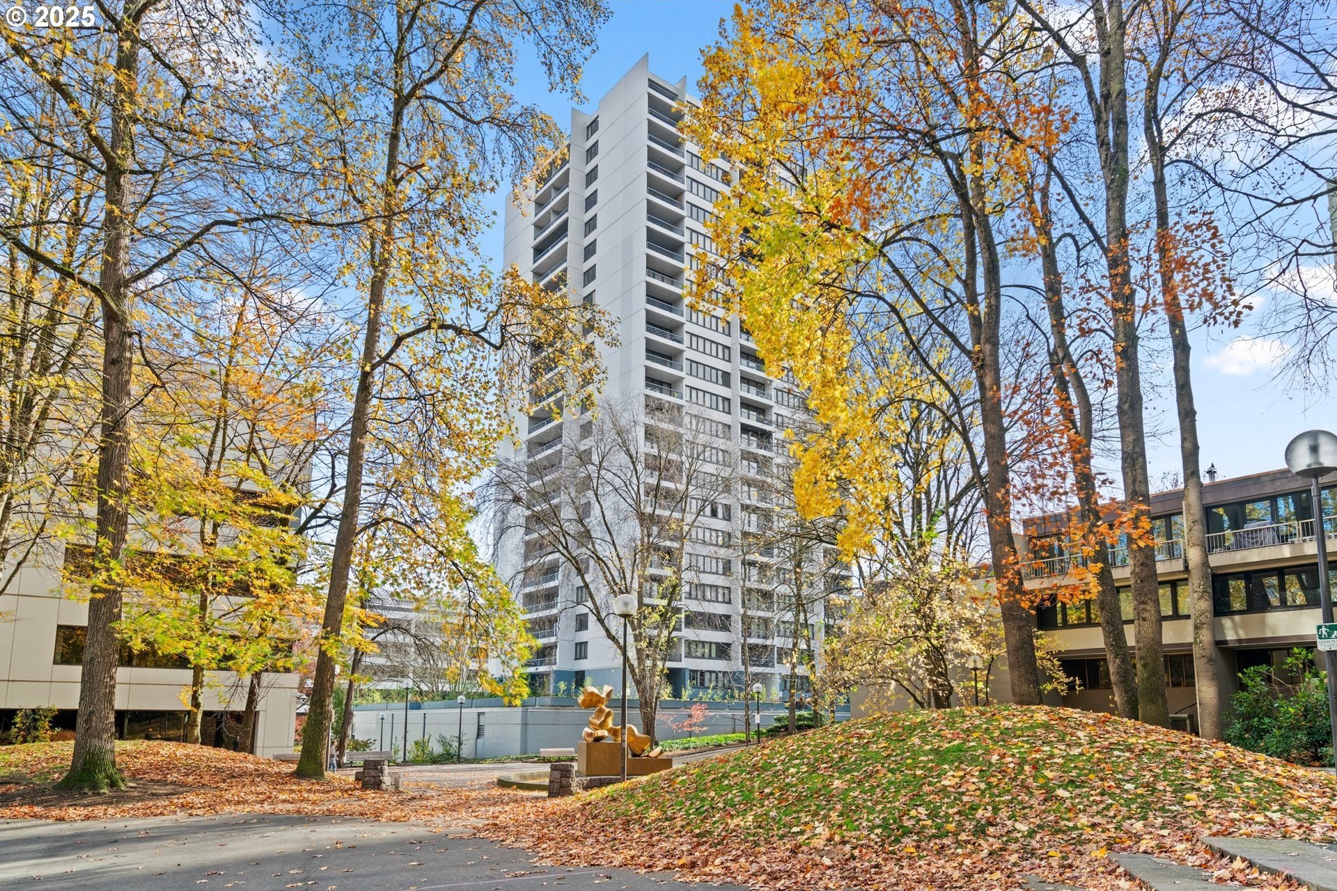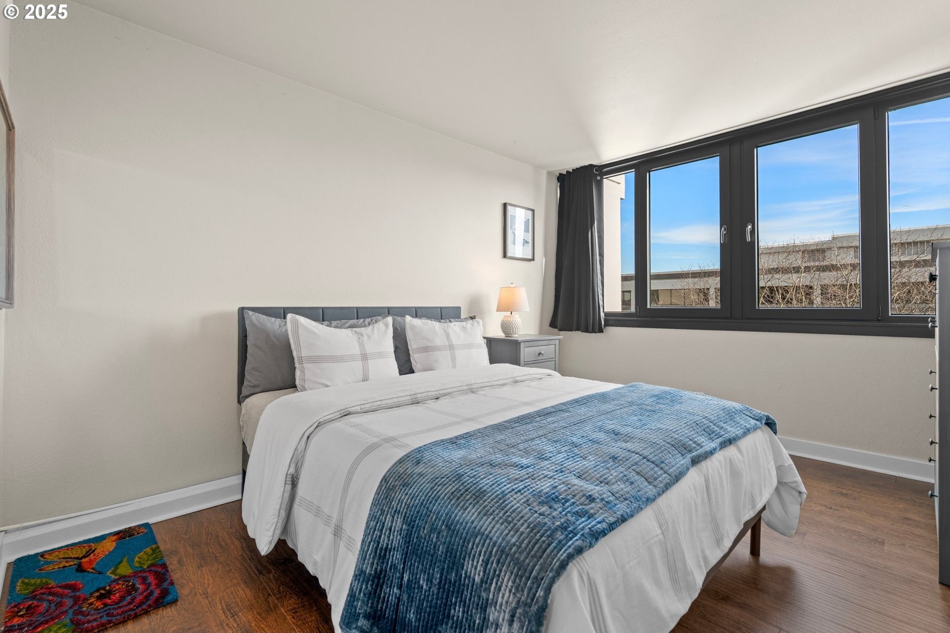 Light and bright one bedroom corner unit with a view! Welcome to downtown Portland's beautiful Harrison East Building. Steeped in Mid-Century architecture this building offers affordable living in a quiet corner of SW Portland. It's move-in ready with all furniture included. The "F" units are a popular layout with more than 700 square set on the corner of the building. Living is comfortable with a large living space that flows outside to the deck. Looking North East you will take in territorial views including the Willamette river and bridges. This unit comes with a storage locker and large deeded parking space. The Harrison building complex boasts free shared laundry, fast wifi internet, a shared sauna and pool! Enjoy downtown living at its best. Walk to local parks, restaurants, cafes, the river, shopping, and local entertainment. Your commute will be a breeze with the street car just outside your door!