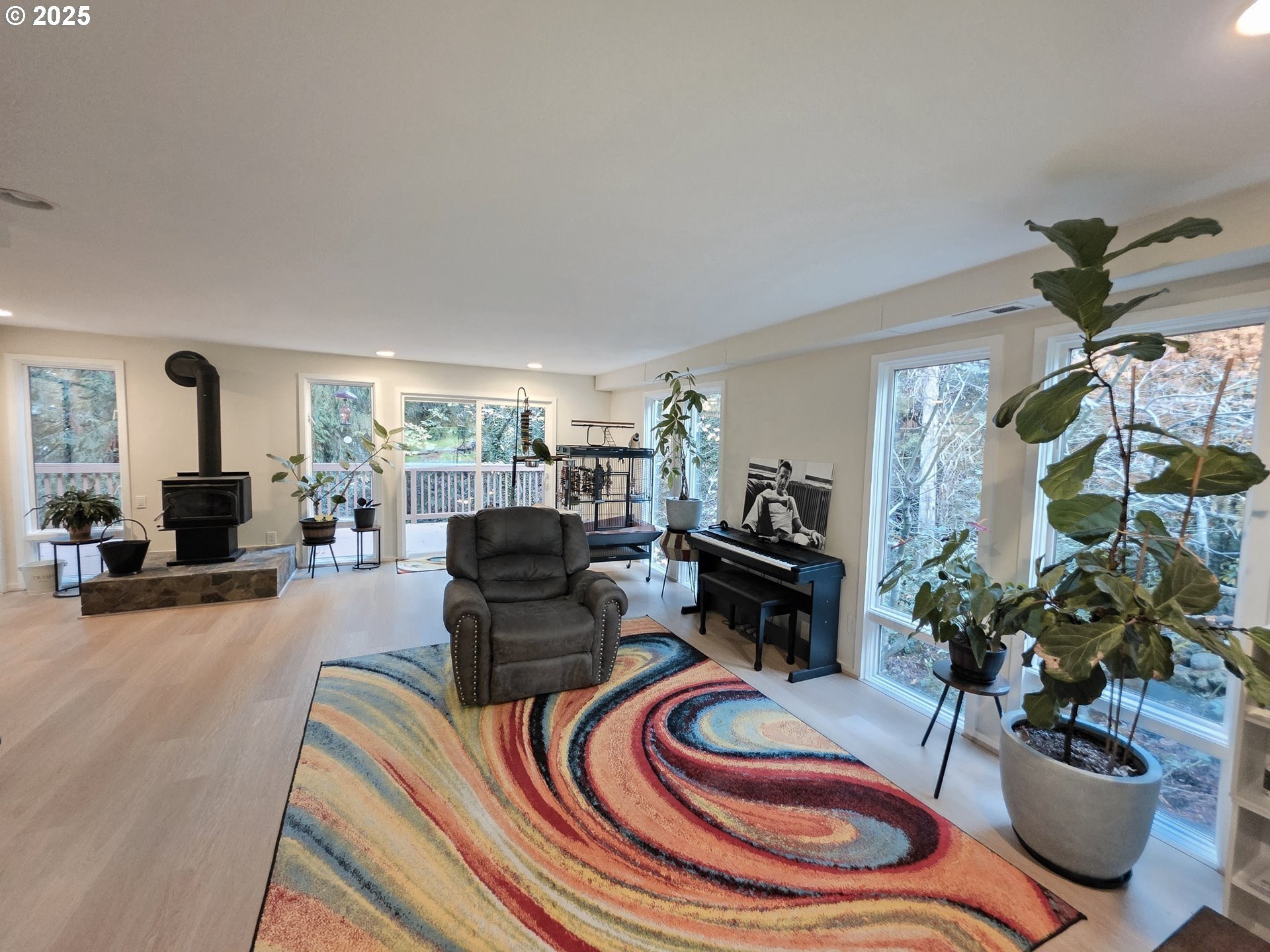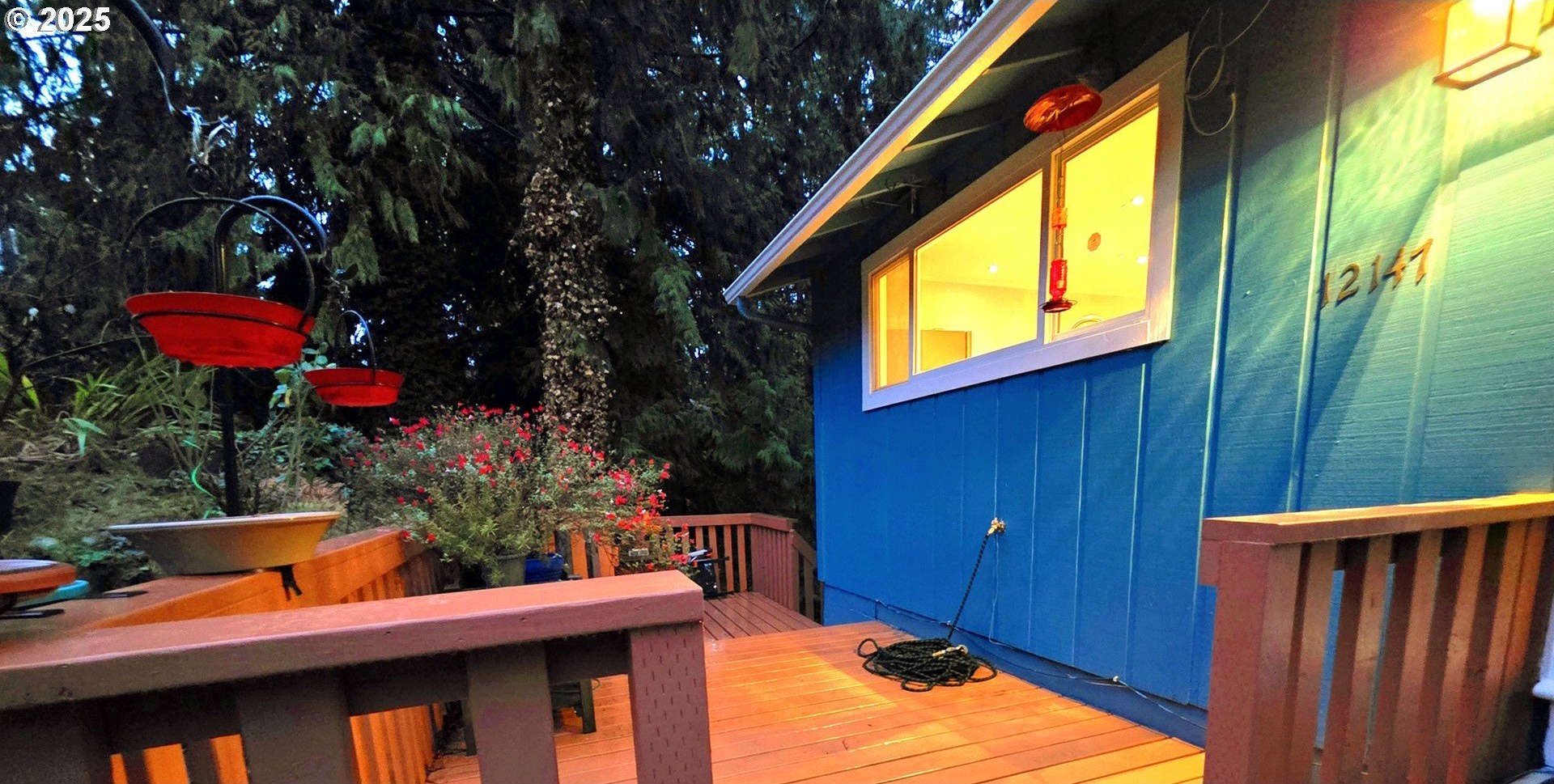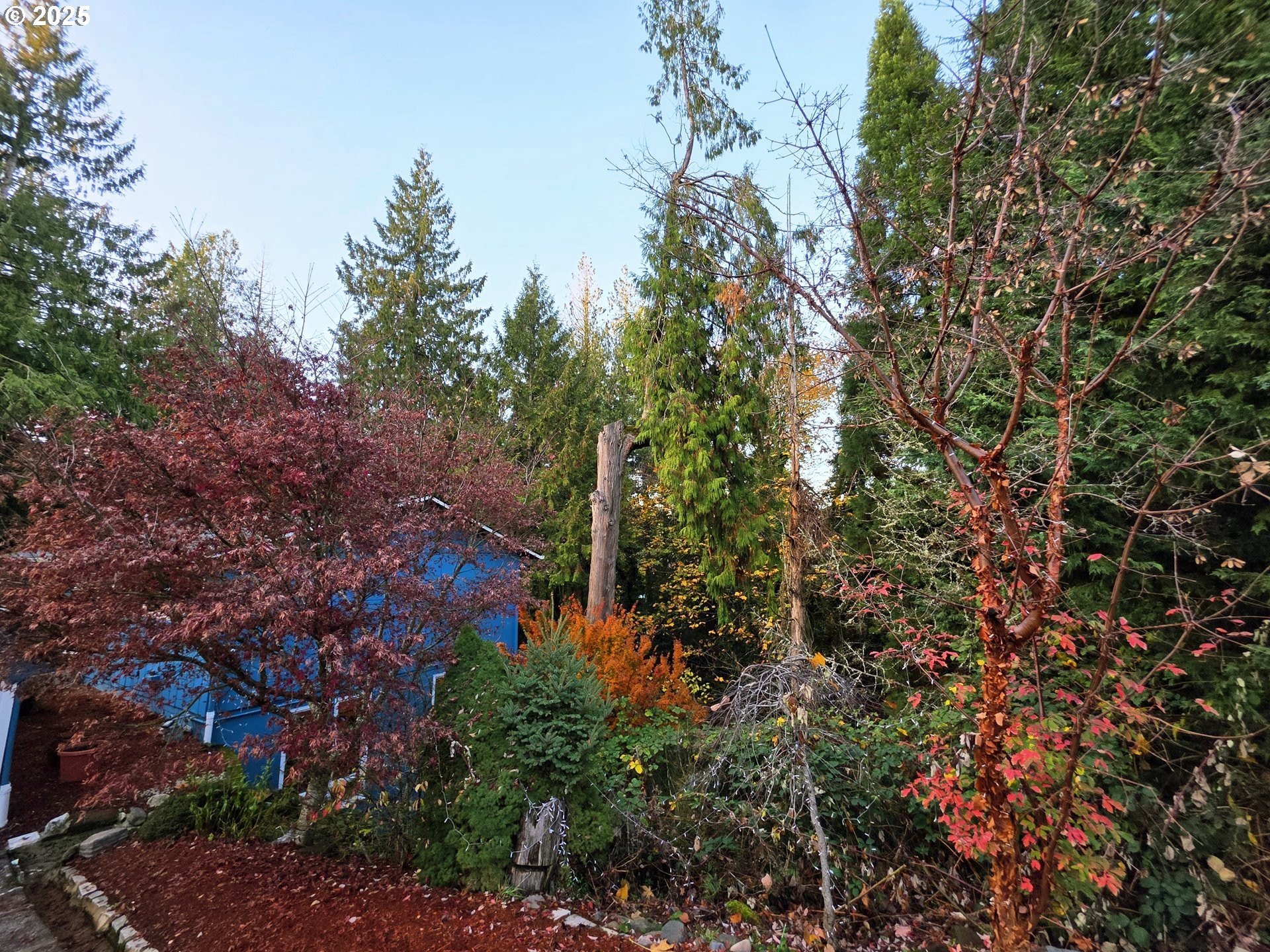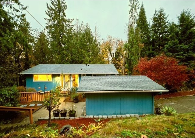 Nestled in a forested setting, this house on Henderson Drive is a sanctuary where architecture and nature exist in poetic harmony. Its design philosophy emphasizes complementing the scenery rather than competing with it, creating a serene, isolated retreat from the modern world. You will feel like you are in a forest, but this house is a couple of minutes from major grocery stores, public transit, and restaurants. The house is a three-story structure, and its lines mirror the forest floor. Large picture windows blur the lines between indoor and outdoor living and welcome views of dense, lush tree canopy. Deep overhangs provide shade and a protected area to enjoy the outdoors in any weather. The atmosphere is one of profound tranquility. The air is often misty in the early mornings, carrying the rich, earthy smell of damp soil and cedar. The dominant sound is the constant, gentle symphony of the natural world: birdsong and the rustle of leaves in the breeze. The property is a haven for wildlife, with deer occasionally grazing at the forested backyard, while songbirds sign on branches. The landscape shifts dramatically with the seasons. In autumn, the surrounding trees explode in a riot of red, yellow, and orange, a dazzling display viewed from the comfort of the living room. In winter, the house becomes a cozy haven, a warm, bright beacon against a backdrop of white snow. Though this house is in a forested setting, the interior offers modern-day amenities: LVC flooring, SPC flooring, stainless steel appliances, washer/dryer, dishwasher, forced air, etc. Imagine yourself baking an apple pie while enjoying hummingbirds that are visiting your feeder from your kitchen's picture window. Imagine yourself relaxing on the deck and no one in sight but trees, birds, rabbits, and deer. Imagine yourself enjoying a movie while occasionally looking outside through your large picture windows. Imagine and live in this peaceful sanctuary. [Home Energy Score = 5. HES Report at https://rpt.greenbuildingregistry.com/hes/OR10235078]