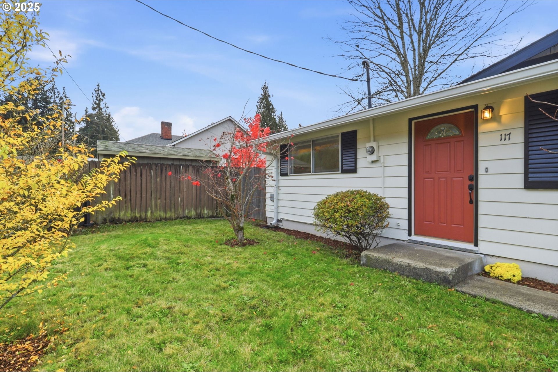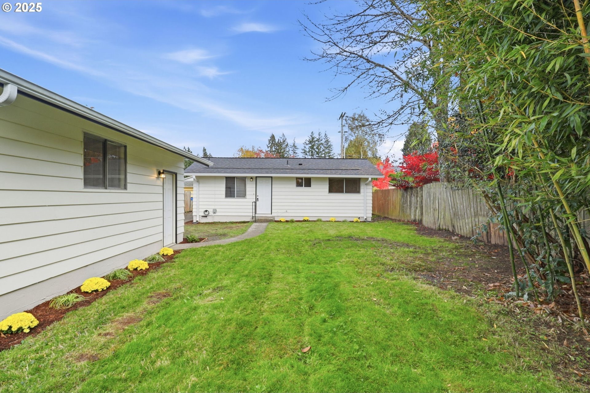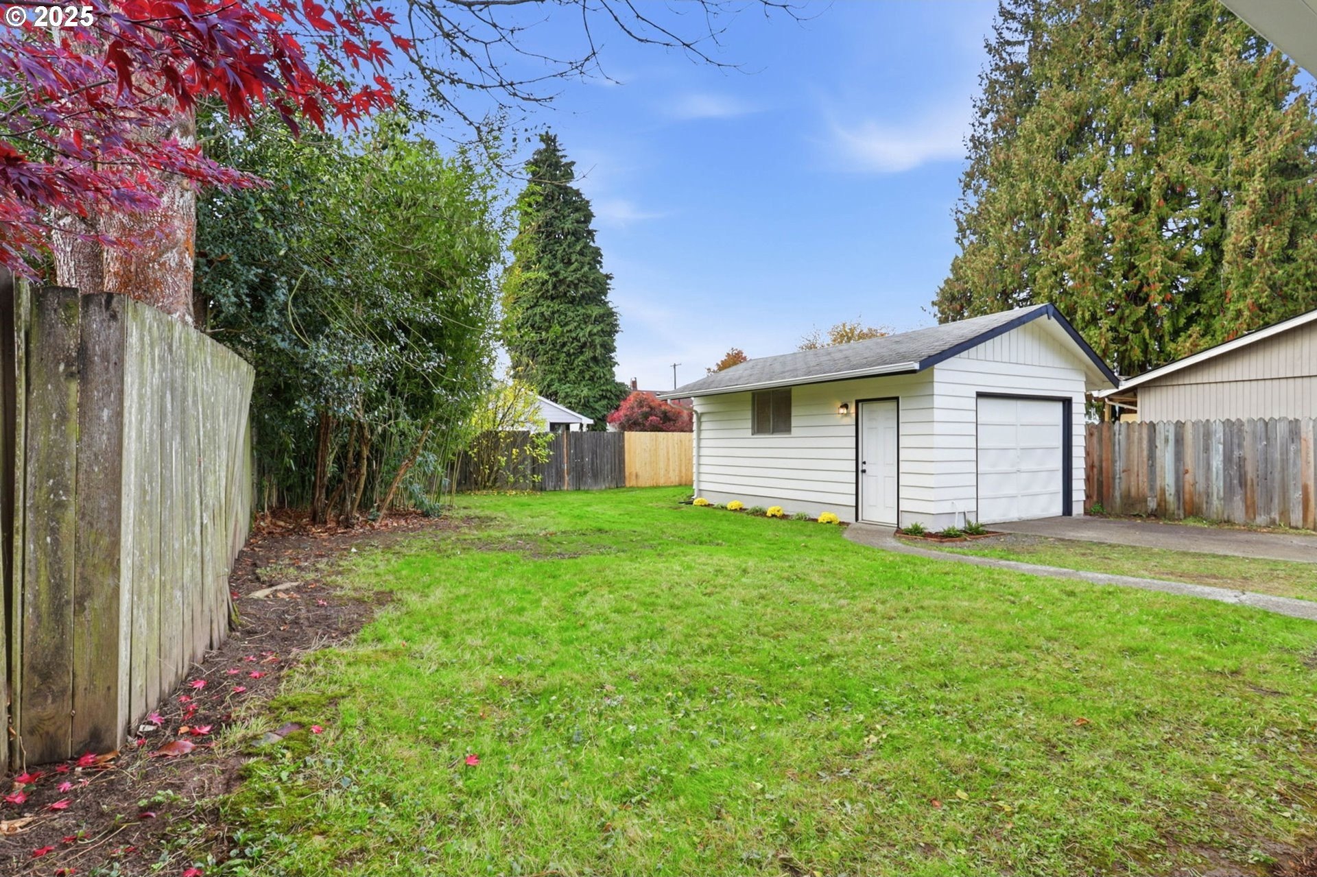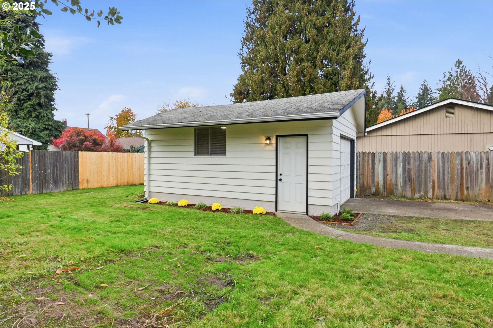 This single-level home welcomes you with durable vinyl plank flooring throughout, a bright white kitchen featuring sleek quartz countertops, deep stainless steel sink, nice subway tile backsplash, and full appliance package including refrigerator, range, and dishwasher. The sparkling bathroom shines with crisp subway tile and modern fixtures. Convenient in-unit laundry includes washer/dryer. A detached 1-car garage offers a finished bonus space in the rear perfect for a workshop, studio, or home gym. The sizeable yard is level and lush, with mature landscaping and plenty of room for gardening or play. Newer roof and fresh paint inside and out ensure low-maintenance living. Ample driveway parking for multiple vehicles. Ideally located just steps from vibrant downtown Ridgefield shops, cafes, parks, and top-rated schools. This move-in-ready gem blends classic charm with modern update. Your perfect Ridgefield retreat awaits!