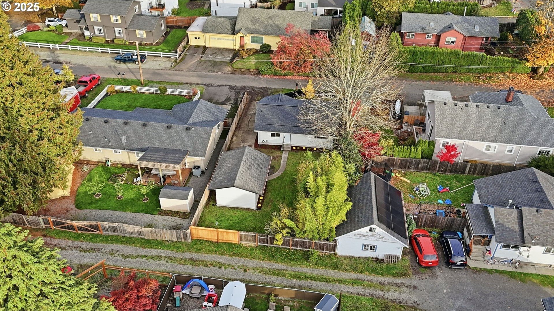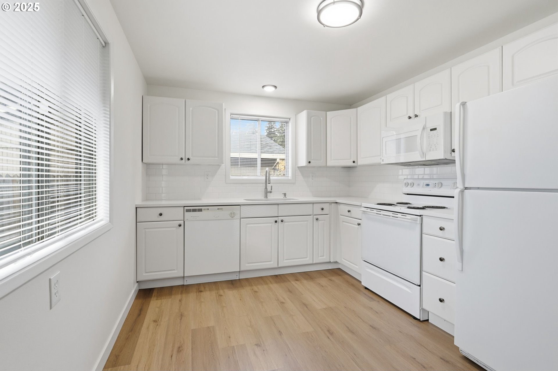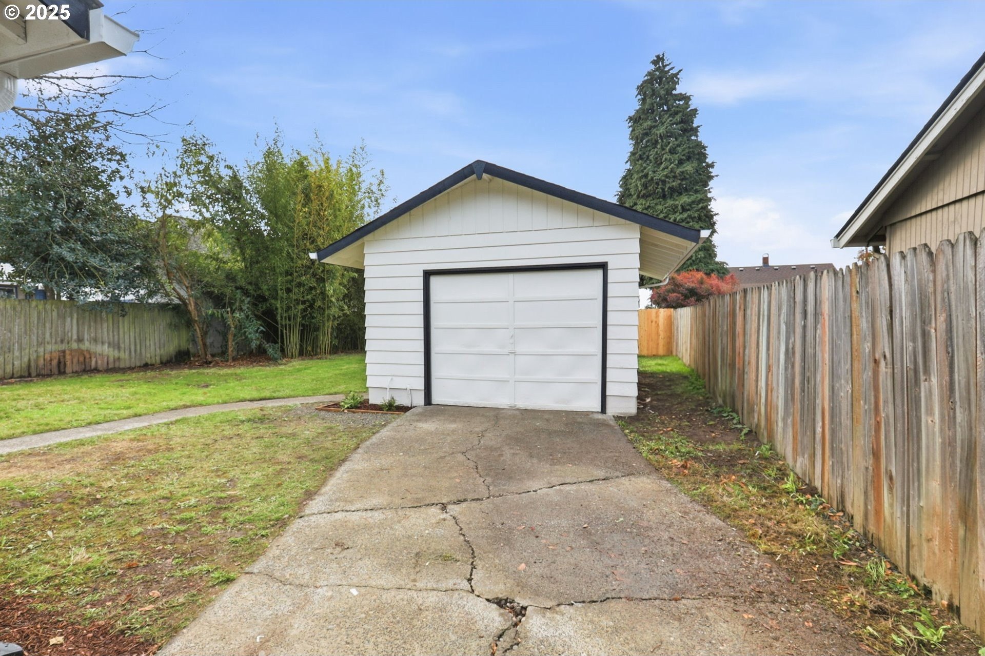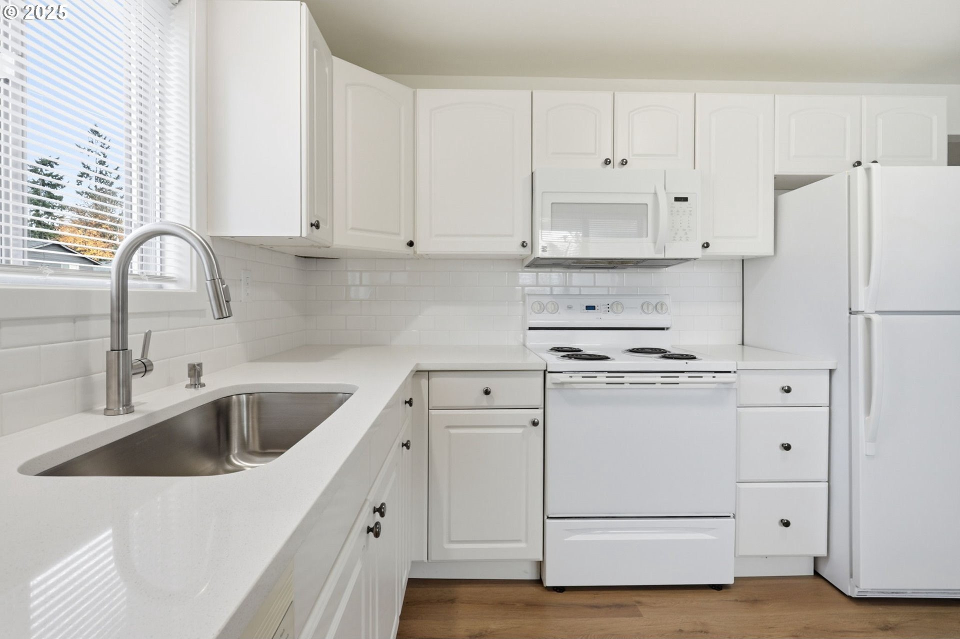 This single-level home welcomes you with durable vinyl plank flooring throughout, a bright white kitchen featuring sleek quartz countertops, deep stainless steel sink, nice subway tile backsplash, and full appliance package including refrigerator, range, and dishwasher. The sparkling bathroom shines with crisp subway tile and modern fixtures. Convenient in-unit laundry includes washer/dryer. A detached 1-car garage offers a finished bonus space in the rear perfect for a workshop, studio, or home gym. The sizeable yard is level and lush, with mature landscaping and plenty of room for gardening or play. Newer roof and fresh paint inside and out ensure low-maintenance living. Ample driveway parking for multiple vehicles. Ideally located just steps from vibrant downtown Ridgefield shops, cafes, parks, and top-rated schools. This move-in-ready gem blends classic charm with modern update. Your perfect Ridgefield retreat awaits!