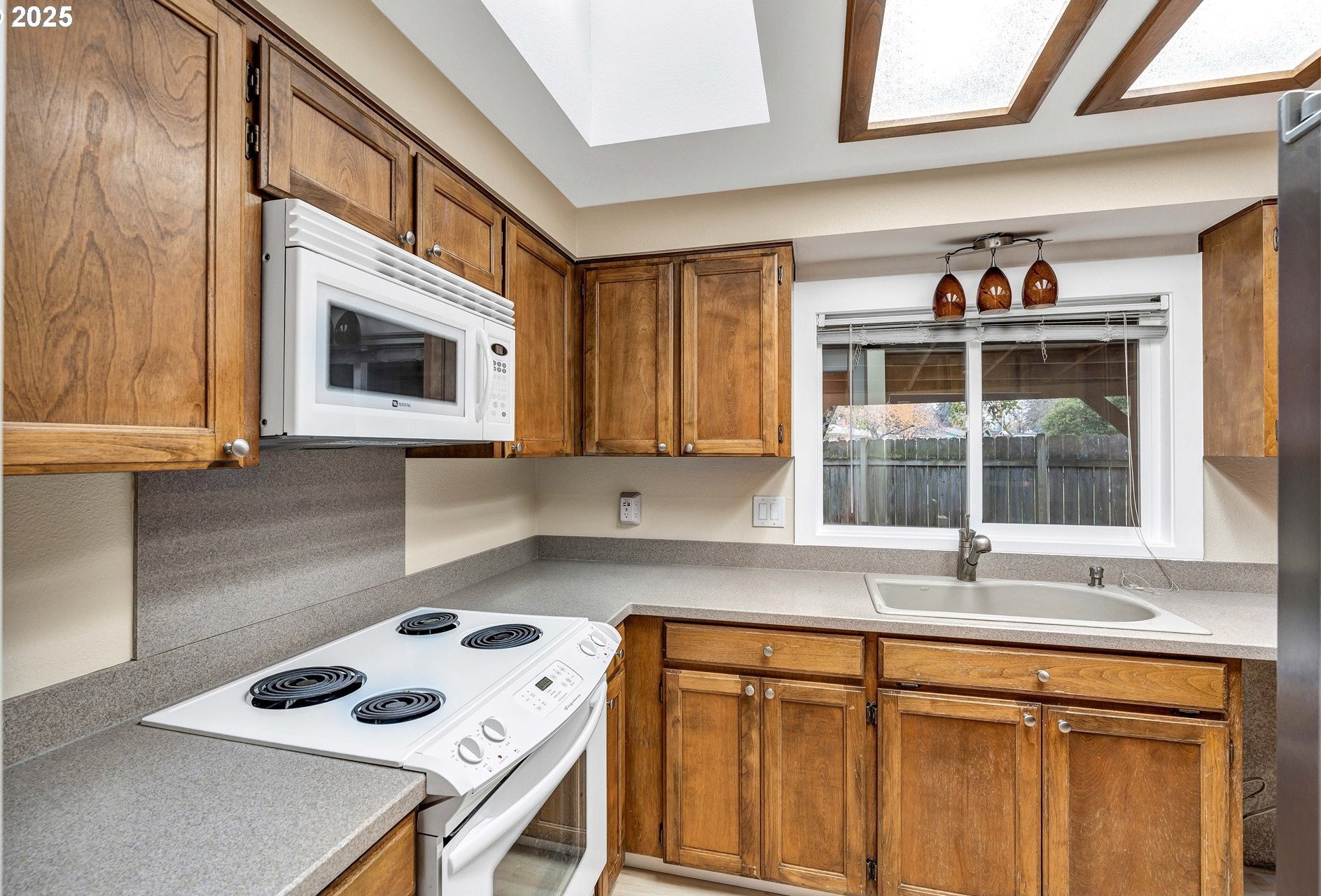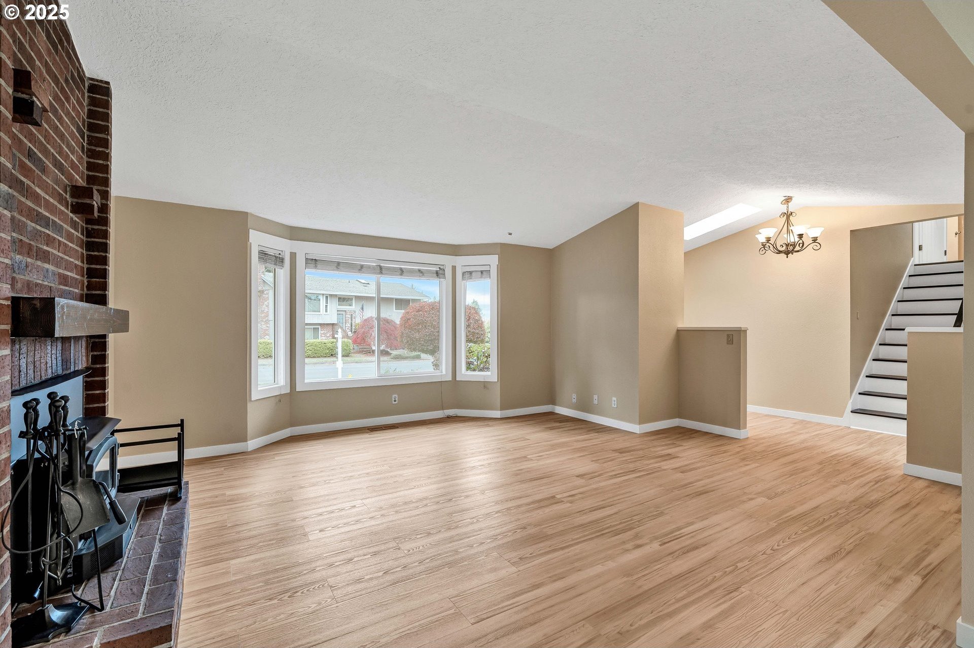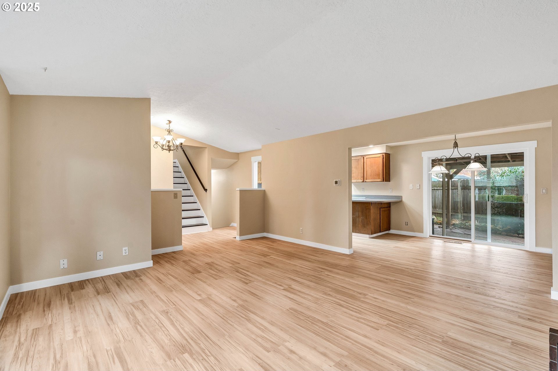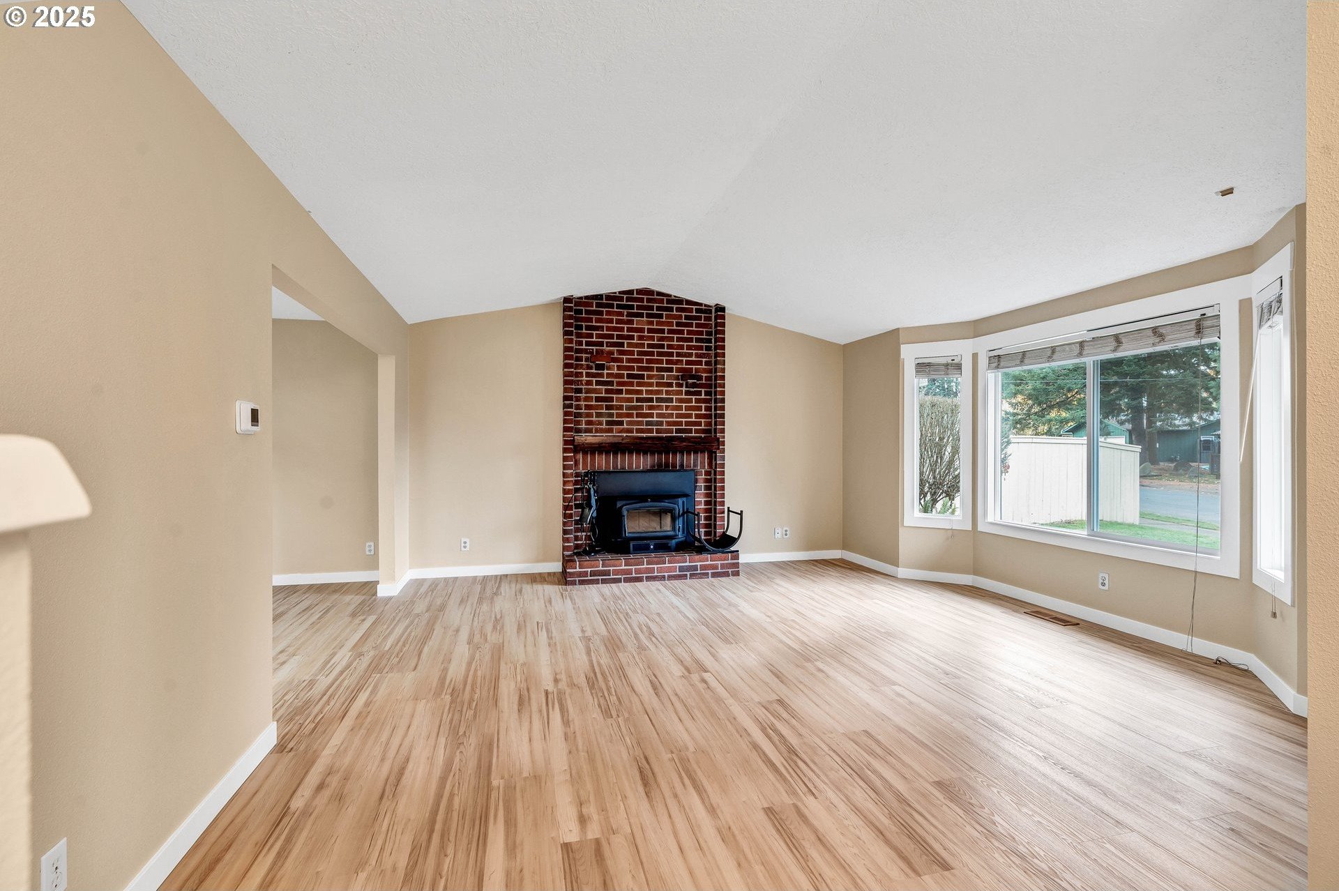 Seller to purchase new stainless steel appliances with an accepted offer for this beautiful 2-Level Home – 3 Bedrooms, 2.5 Bathrooms. Step into this bright and spacious home featuring brand new LVP flooring throughout and high vaulted ceilings that create an open, airy feel. The living room is filled with natural light from bay windows and is centered around a cozy fireplace, perfect for gatherings.The primary bedroom boasts a large bay window and an ensuite bathroom with a walk-in shower. Two additional bedrooms share a well-appointed bathroom, while a half bath provides convenience for guests.The dining room opens through sliding doors to a beautiful, oversized backyard, fully fenced and filled with lush greenery and mature trees, offering privacy and space for outdoor entertaining or play.With an additional living room or storage space, this home perfectly blends comfort, functionality, and natural light in a serene, private setting.