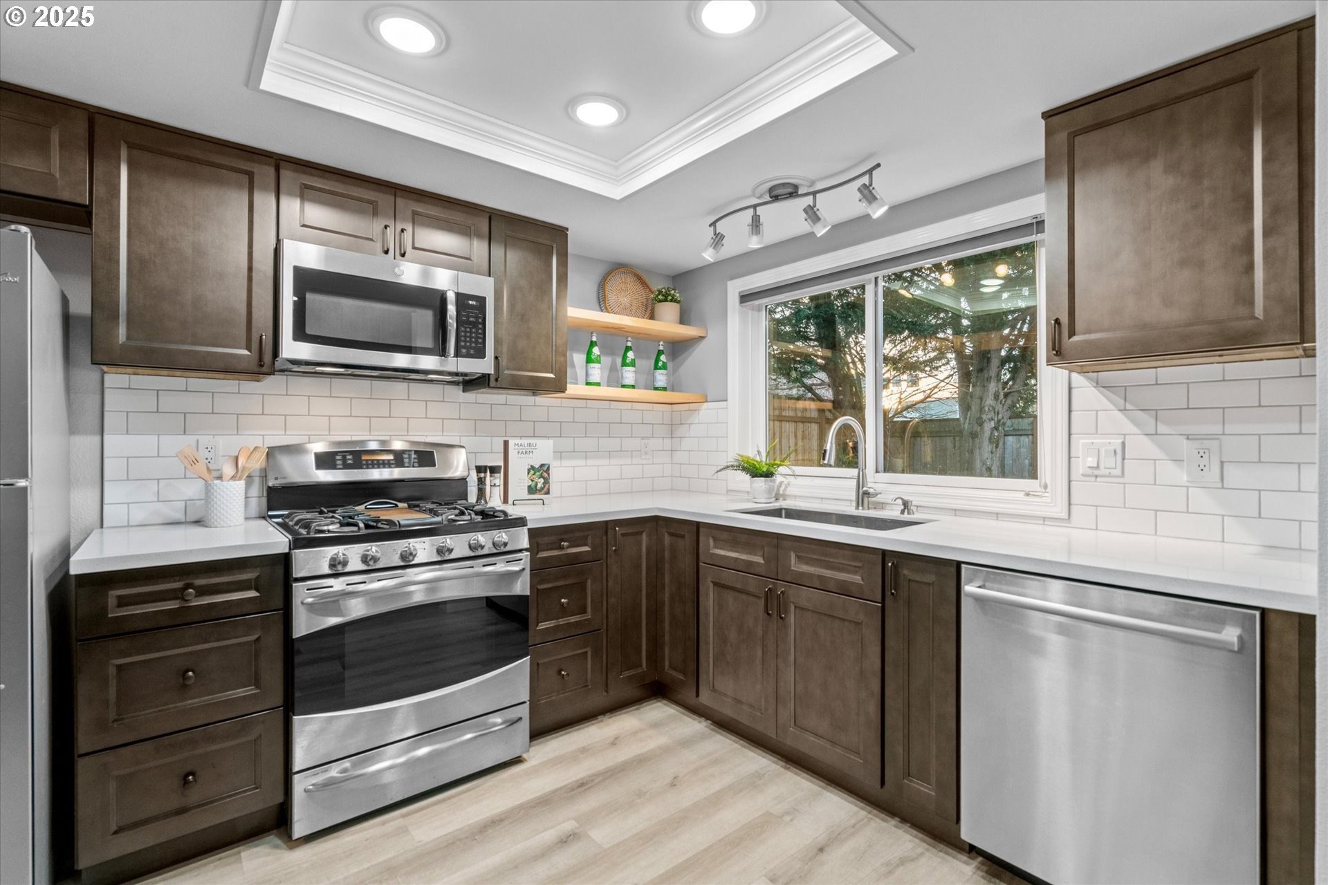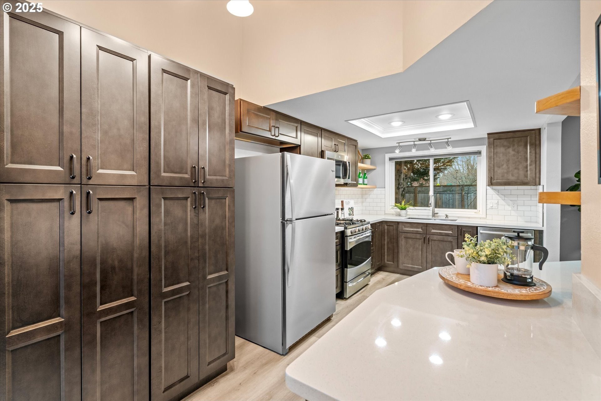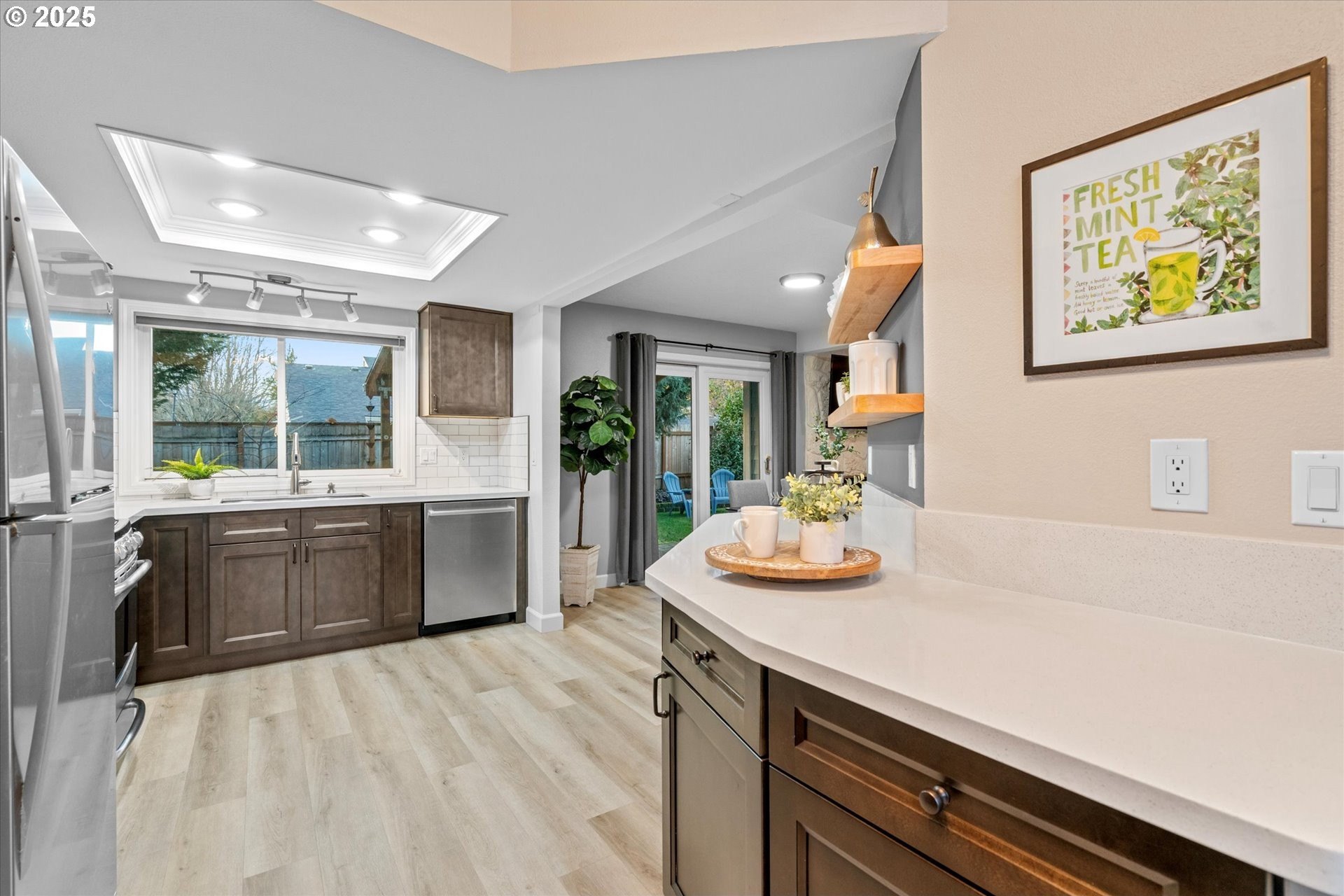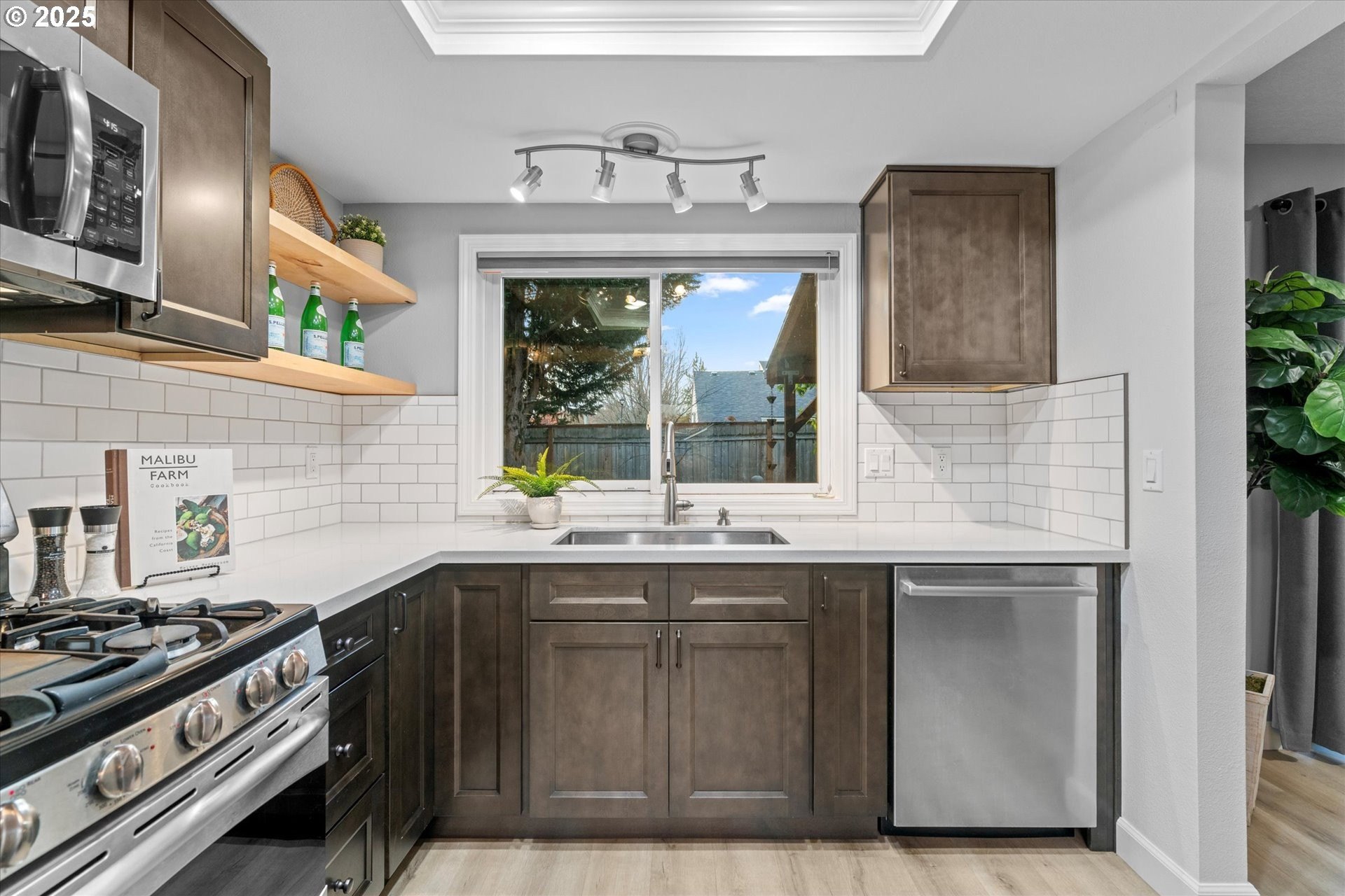 This Tigard home on 87th Ave has been incredibly well cared for and has seen significant upgrades from top to bottom since 2019. Recent high-ticket improvements include a new furnace, A/C, gutters, gas fireplace, vinyl flooring, carpet, patio cover, siding, exterior paint, and crawlspace vapor barrier. All of this completed work makes this a move-in-ready home where you can settle in quickly and enjoy life.Special attention was paid to the kitchen with a full remodel featuring quartz counters, solid wood cabinetry, stainless steel appliances, a pantry, and a coffee bar. The remodel also opened the floor plan to flow naturally into the dining and main living areas, so cooking, conversation, and entertaining can happen at the same time.On top of all the interior and exterior updates, the location offers accessibility and convenience. Everyday errands are simple with nearby grocery stores and shopping centers. Bridgeport Village is less than two miles away and offers dining, shopping, and entertainment. Multiple gyms, parks, and local schools round out a setting that supports an active, convenient lifestyle while still feeling residential and settled.