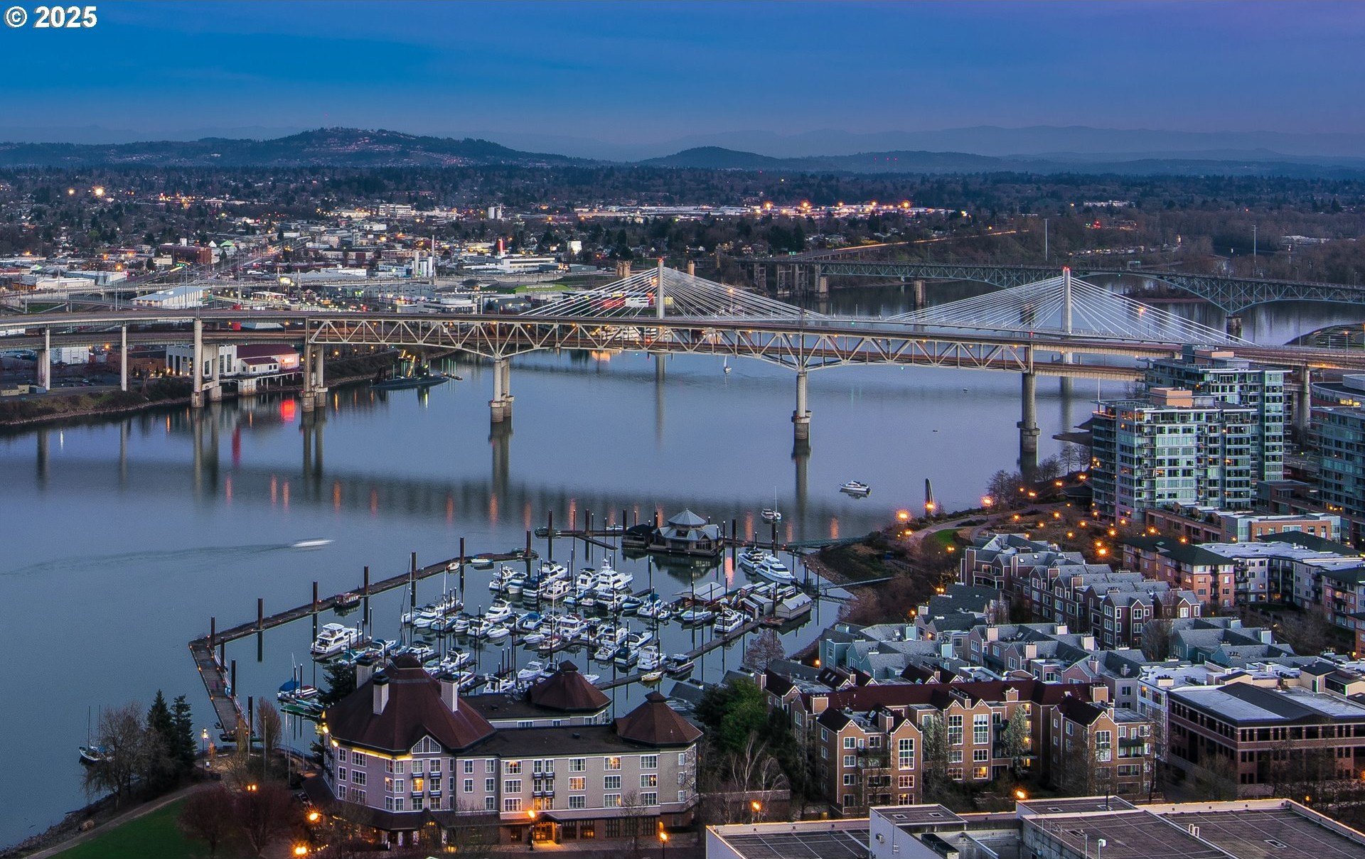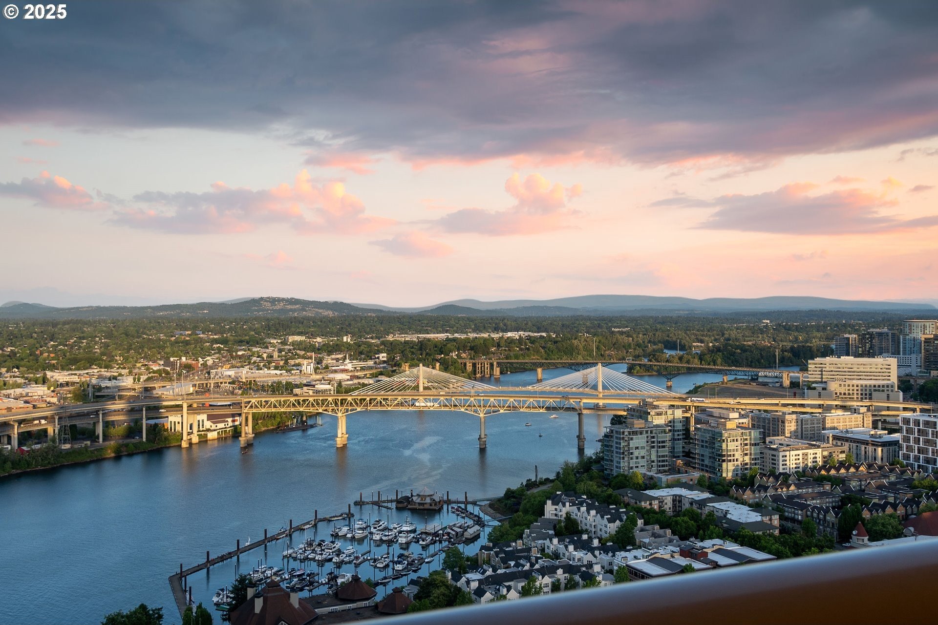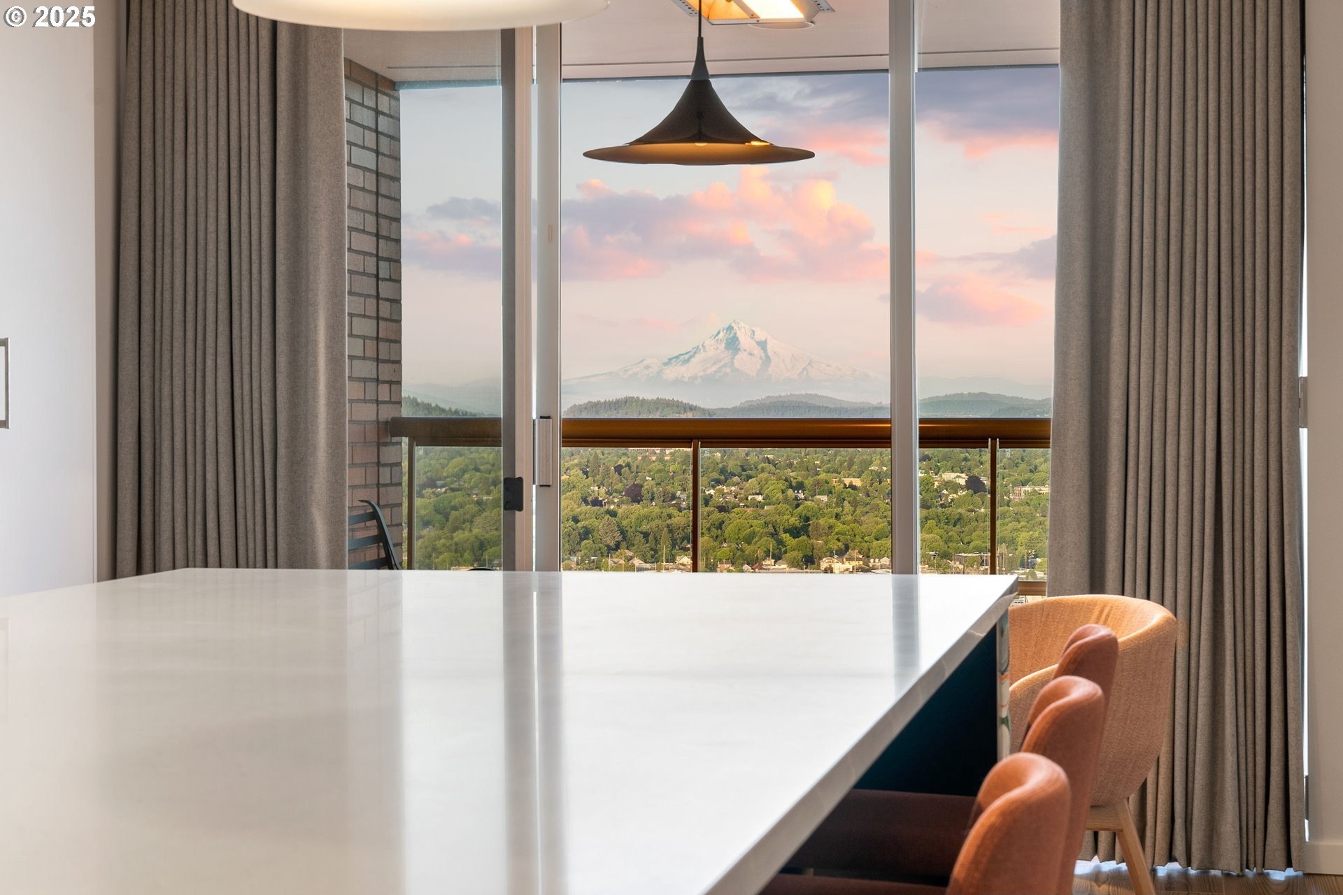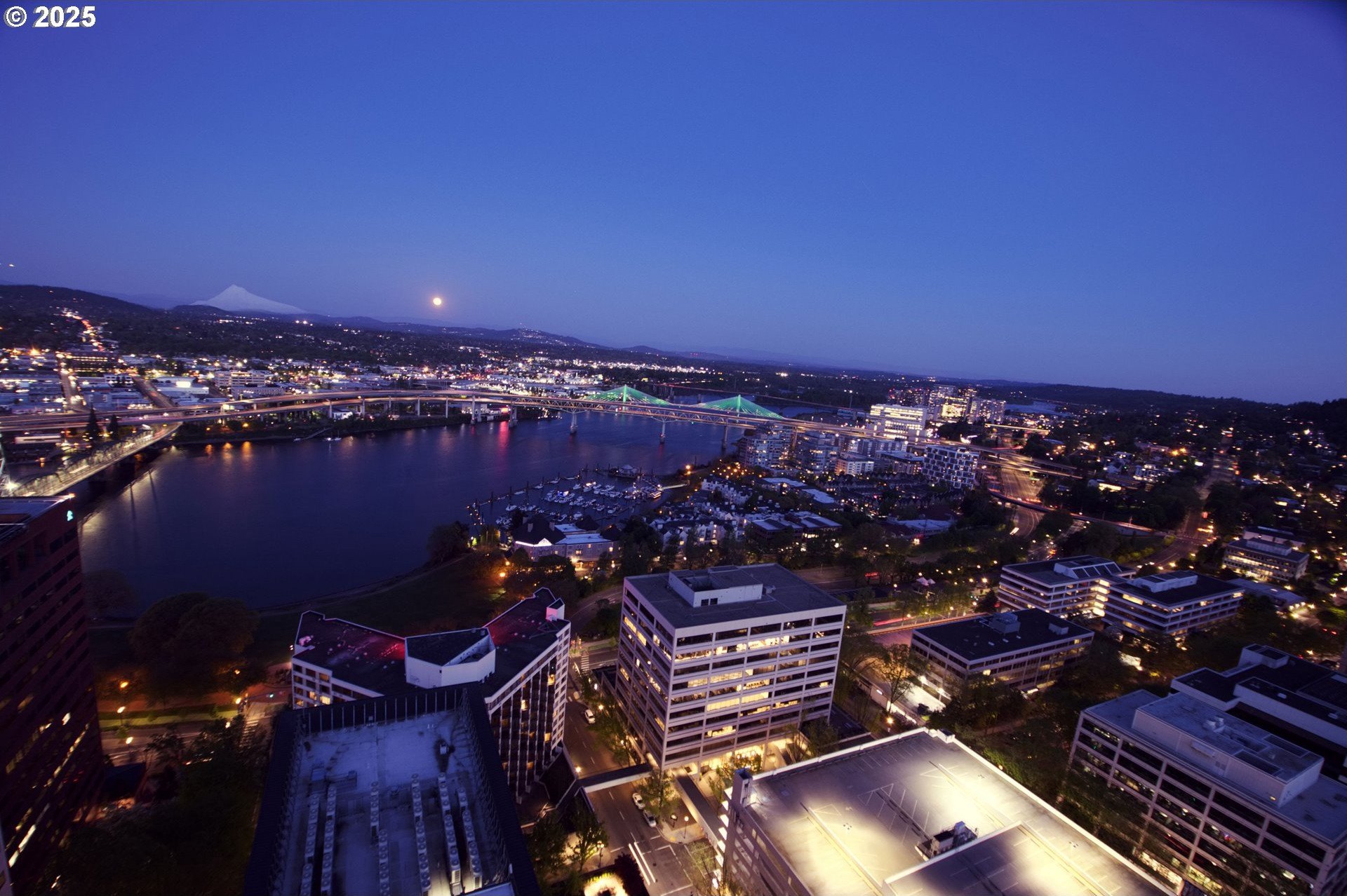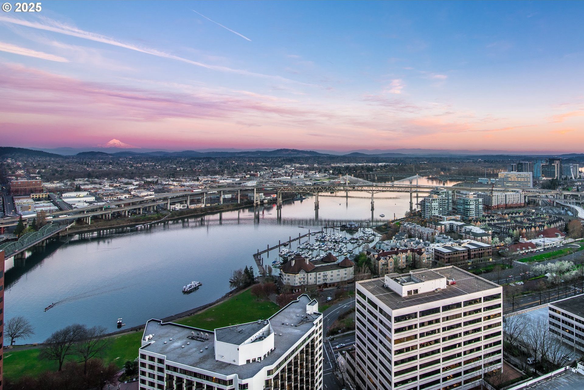 Perched high in the iconic KOIN Tower at Fountain Plaza, this extraordinary condominium offers an unparalleled sanctuary of refined luxury and breathtaking vistas. By day, gaze eastward to the majestic silhouette of Mt. Hood, where the sun rises in a symphony of golden hues, casting a radiant glow across the landscape. To the south, the serene Willamette River unfurls like a ribbon of liquid sapphire, its gentle currents reflecting the city's vibrant energy. As twilight descends, the scene transforms into a mesmerizing nightly view, with the Tilikum Crossing Bridge adorned in twinkling lights that dance upon the water like scattered diamonds.No expense has been spared in this meticulous full remodel-a pristine residence that has never been lived in since, awaiting its inaugural occupant. The kitchen stands as a masterpiece of culinary excellence, equipped with a 30" Dacor built-in oven, a commanding 48" Pro Sub-Zero refrigerator, and a precision-engineered 36" Wolf induction cooktop and extensive venting system. Exquisite fixtures elevate every detail: Kohler, Hubbardton Forge, and Victoria + Albert appointments grace the space with timeless sophistication. Plush upgraded carpeting underfoot and sumptuous wool draperies frame the expansive windows, ensuring both comfort and elegance.Residing within this secure concierge building evokes the prestige of a New York-style doorman enclave, where personalized service and unwavering privacy define the lifestyle. This is more than a home; it is an elevated realm of sophistication and serenity.