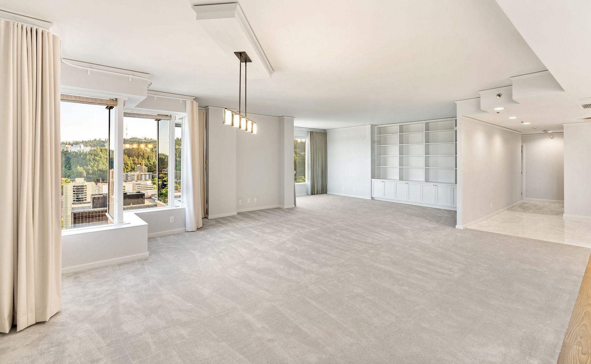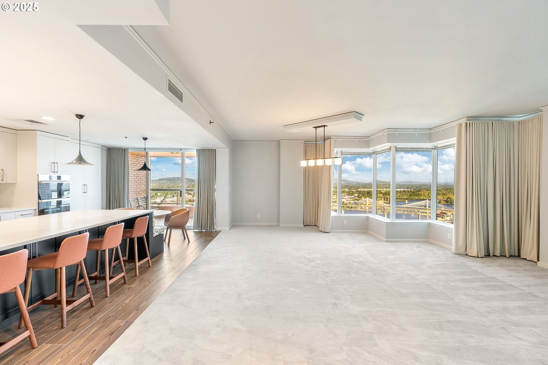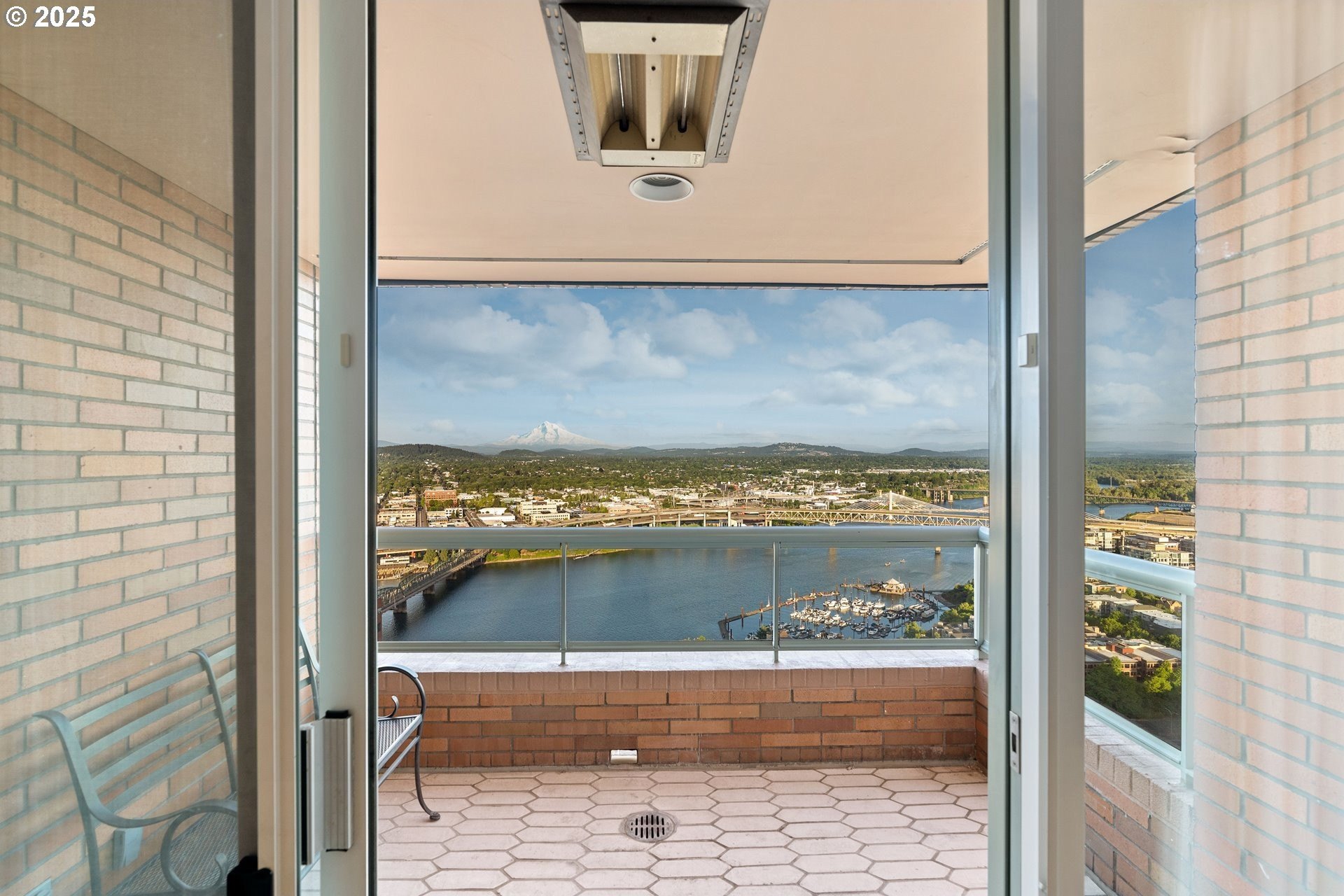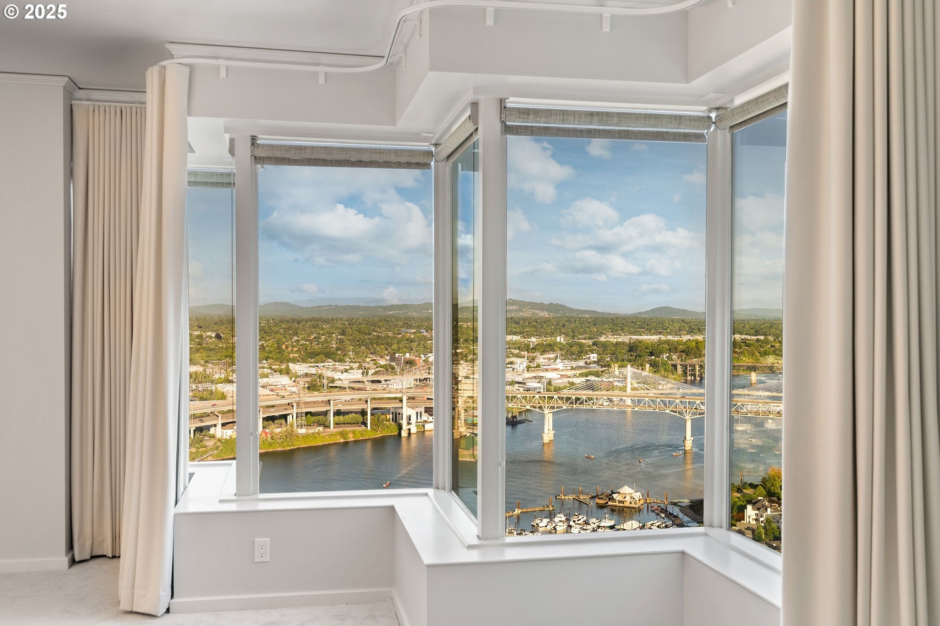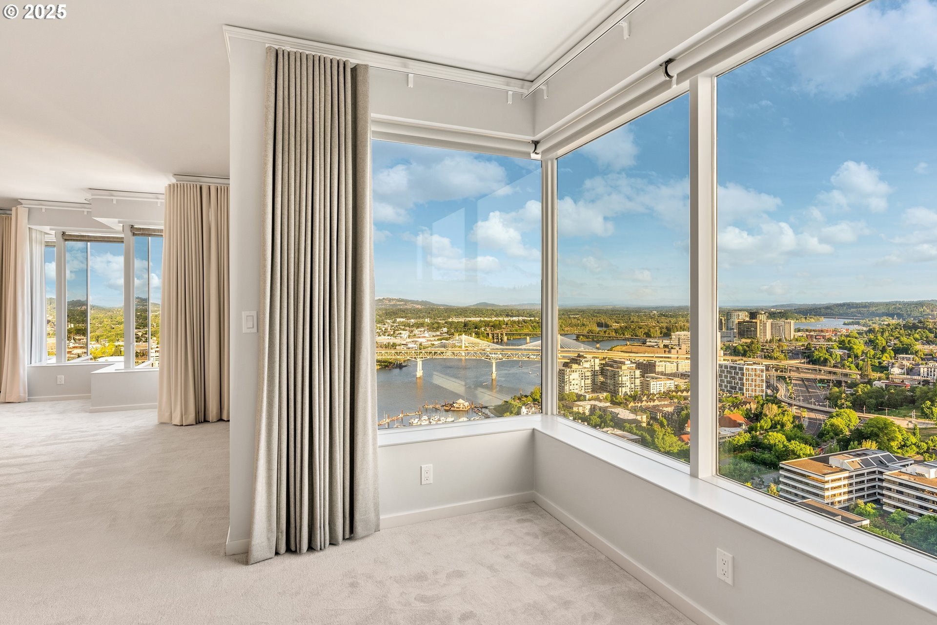 Perched high in the iconic KOIN Tower at Fountain Plaza, this extraordinary condominium offers an unparalleled sanctuary of refined luxury and breathtaking vistas. By day, gaze eastward to the majestic silhouette of Mt. Hood, where the sun rises in a symphony of golden hues, casting a radiant glow across the landscape. To the south, the serene Willamette River unfurls like a ribbon of liquid sapphire, its gentle currents reflecting the city's vibrant energy. As twilight descends, the scene transforms into a mesmerizing nightly view, with the Tilikum Crossing Bridge adorned in twinkling lights that dance upon the water like scattered diamonds.No expense has been spared in this meticulous full remodel-a pristine residence that has never been lived in since, awaiting its inaugural occupant. The kitchen stands as a masterpiece of culinary excellence, equipped with a 30" Dacor built-in oven, a commanding 48" Pro Sub-Zero refrigerator, and a precision-engineered 36" Wolf induction cooktop and extensive venting system. Exquisite fixtures elevate every detail: Kohler, Hubbardton Forge, and Victoria + Albert appointments grace the space with timeless sophistication. Plush upgraded carpeting underfoot and sumptuous wool draperies frame the expansive windows, ensuring both comfort and elegance.Residing within this secure concierge building evokes the prestige of a New York-style doorman enclave, where personalized service and unwavering privacy define the lifestyle. This is more than a home; it is an elevated realm of sophistication and serenity.