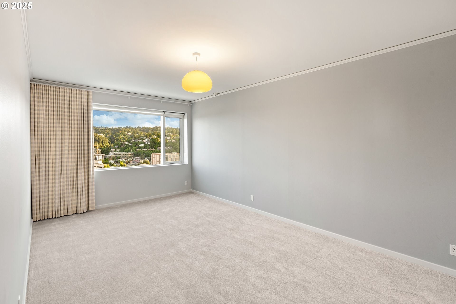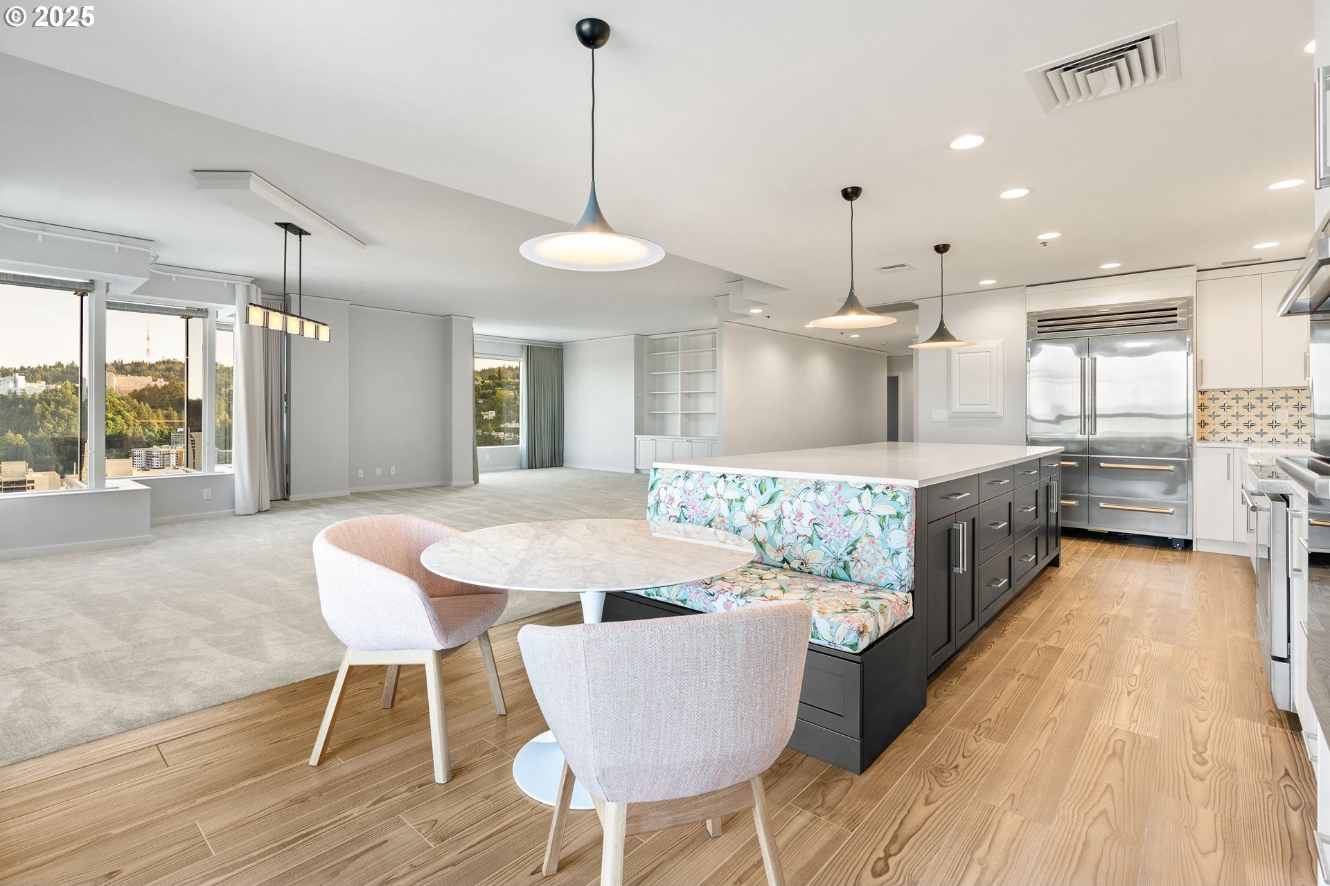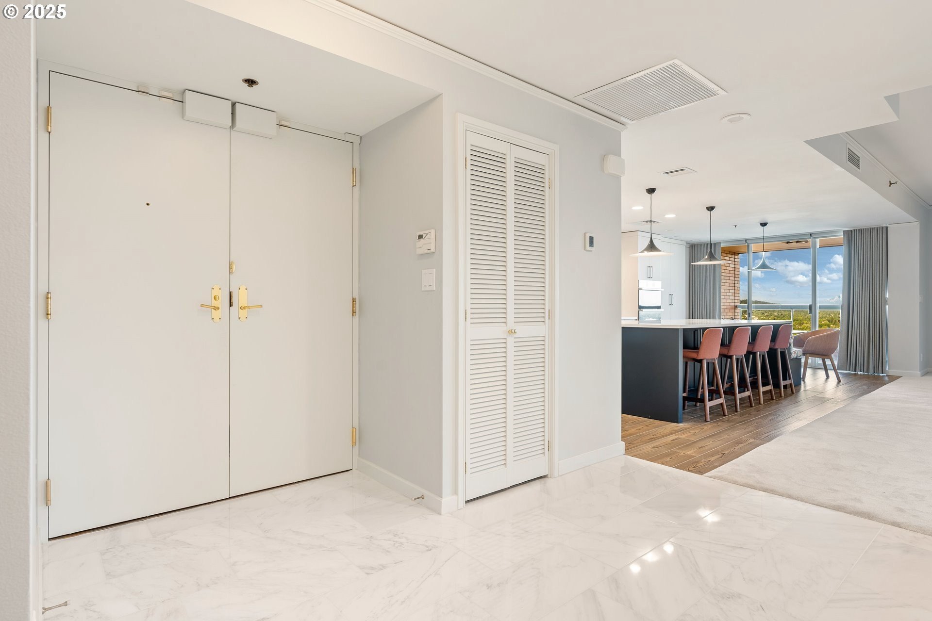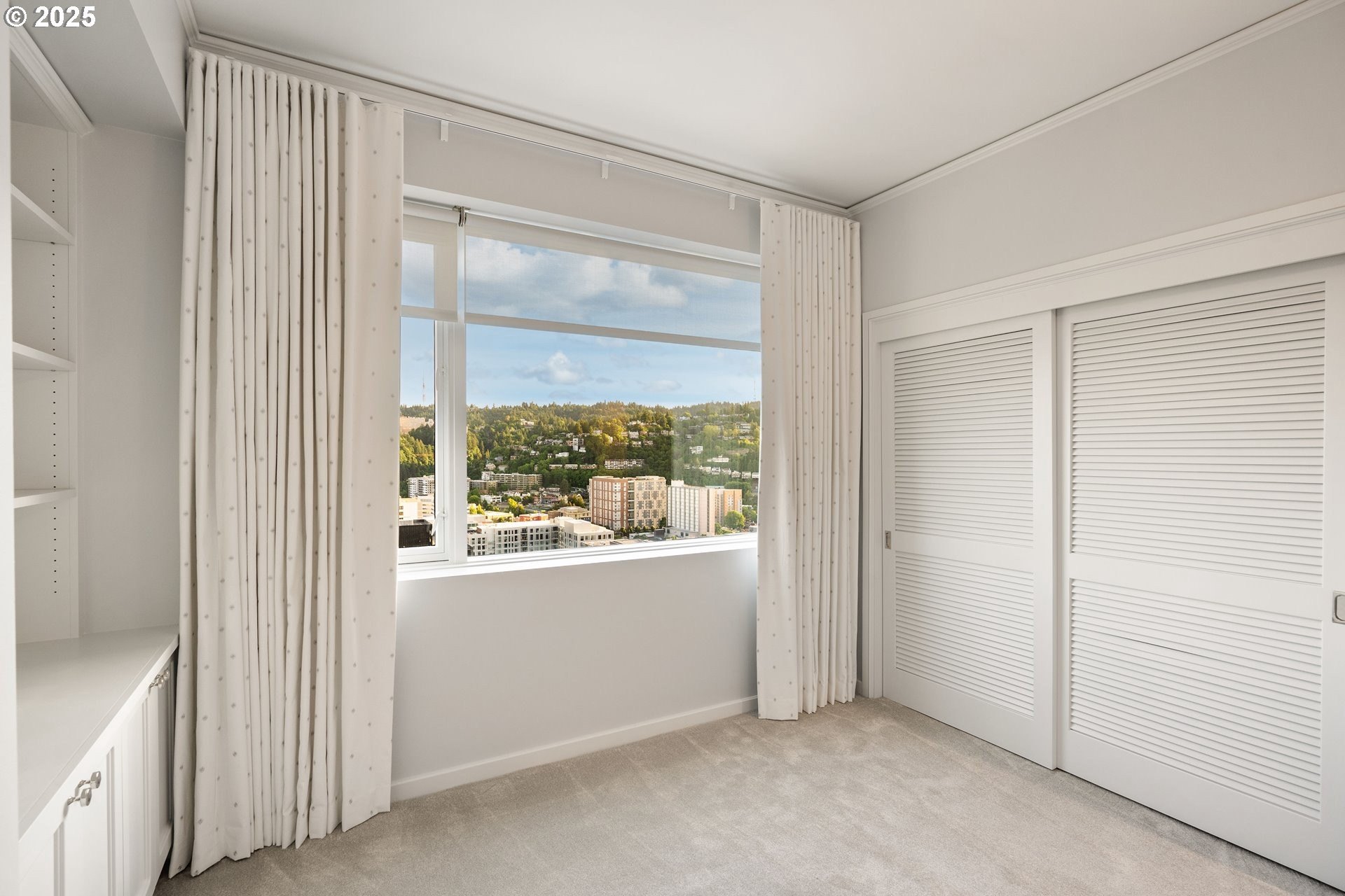Perched high in the iconic KOIN Tower at Fountain Plaza, this extraordinary condominium offers an unparalleled sanctuary of refined luxury and breathtaking vistas. By day, gaze eastward to the majestic silhouette of Mt. Hood, where the sun rises in a symphony of golden hues, casting a radiant glow across the landscape. To the south, the serene Willamette River unfurls like a ribbon of liquid sapphire, its gentle currents reflecting the city's vibrant energy. As twilight descends, the scene transforms into a mesmerizing nightly view, with the Tilikum Crossing Bridge adorned in twinkling lights that dance upon the water like scattered diamonds.No expense has been spared in this meticulous full remodel-a pristine residence that has never been lived in since, awaiting its inaugural occupant. The kitchen stands as a masterpiece of culinary excellence, equipped with a 30" Dacor built-in oven, a commanding 48" Pro Sub-Zero refrigerator, and a precision-engineered 36" Wolf induction cooktop and extensive venting system. Exquisite fixtures elevate every detail: Kohler, Hubbardton Forge, and Victoria + Albert appointments grace the space with timeless sophistication. Plush upgraded carpeting underfoot and sumptuous wool draperies frame the expansive windows, ensuring both comfort and elegance.Residing within this secure concierge building evokes the prestige of a New York-style doorman enclave, where personalized service and unwavering privacy define the lifestyle. This is more than a home; it is an elevated realm of sophistication and serenity.
