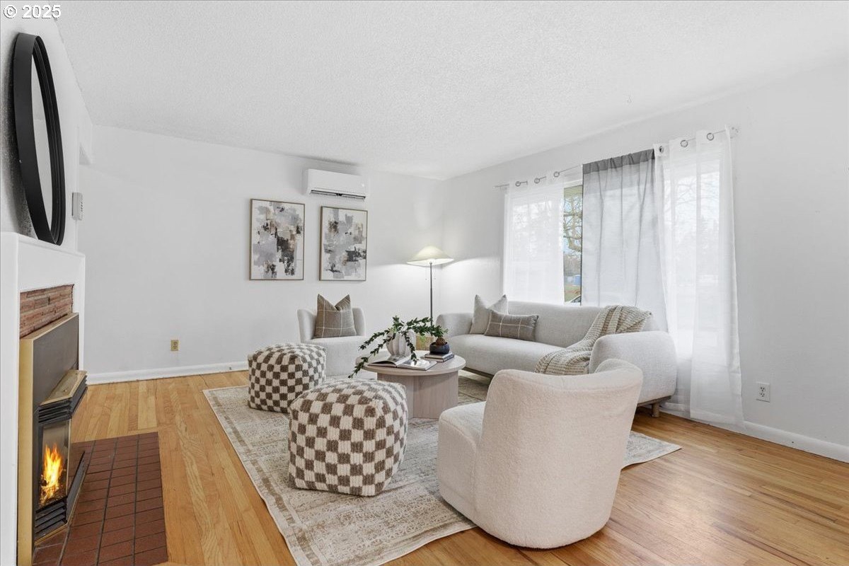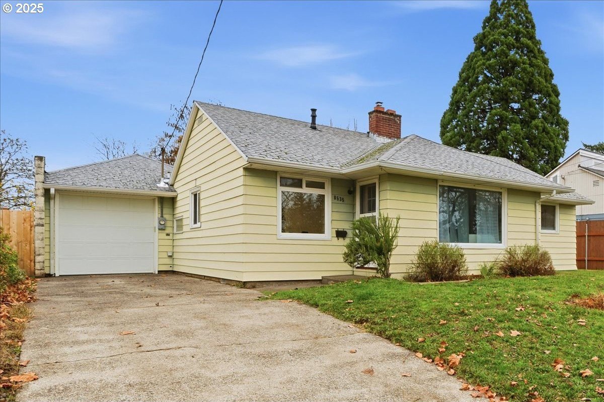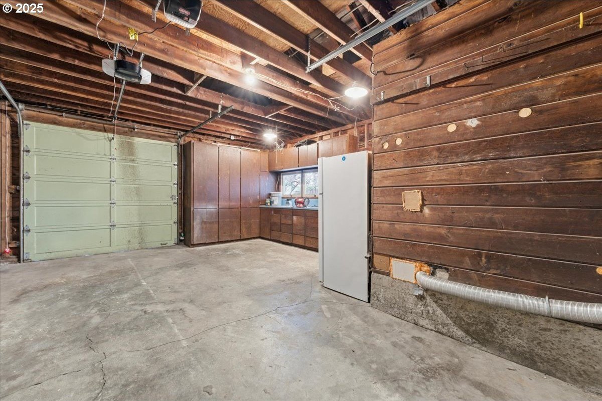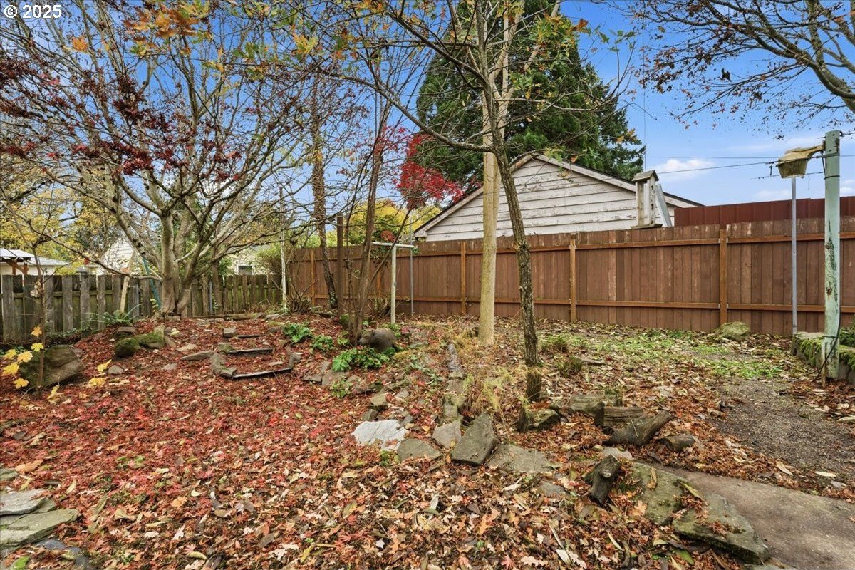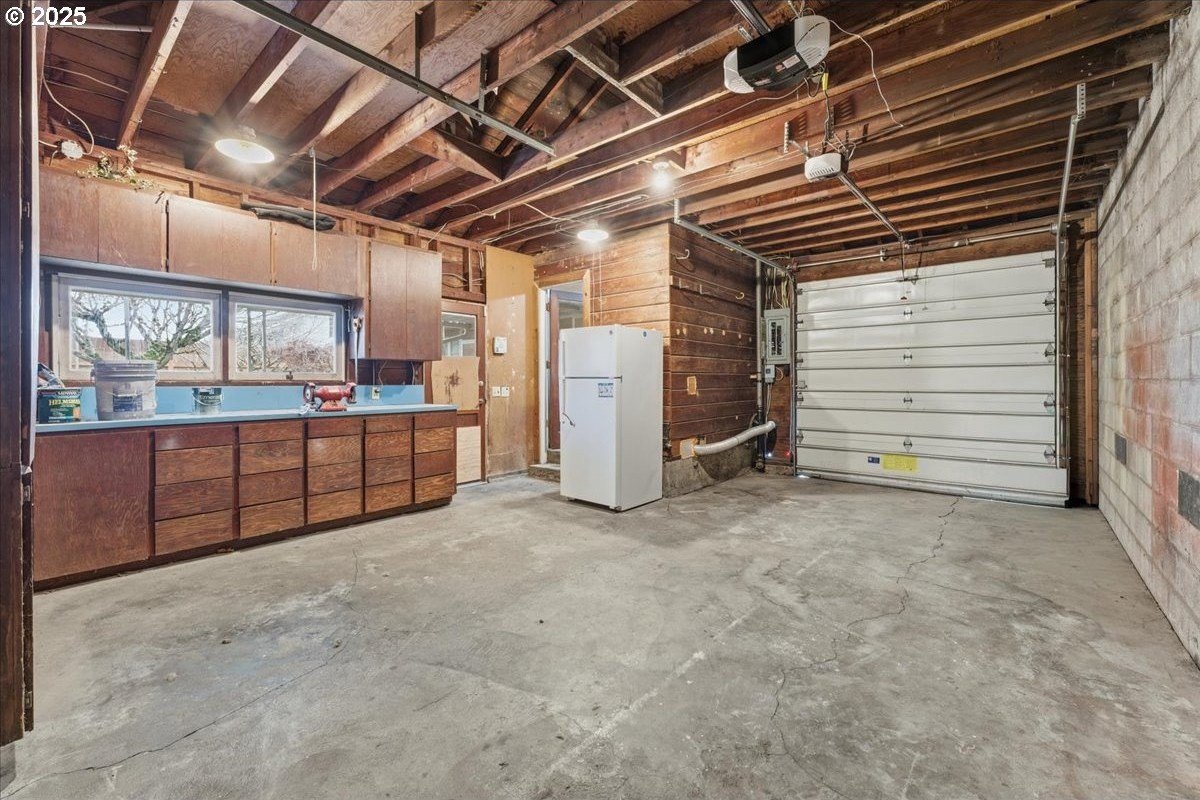 This cutie-pie 1953 one-level Bungalow is ready for your finishing touches and offers smart updates and character. Enjoy a refreshed galley kitchen with newly painted cabinetry, a brand-new fridge. Energy efficient mini-splits provide both heat and cooling, new light fixtures and double-pane vinyl windows throughout, and tankless hot water heater (energy score of 9/10!) Classic features like oak hardwood floors, a cozy wood-burning fireplace and original solid-core doors add charm. A separate laundry room with washer and dryer - included - keeps household noise out of your living space. The unique, DOUBLE OVERHEAD door garage to the backyard offers versatility for hobbyists and adventurers: complete with cabinets and shop space for art projects, car tinkering, camping gear, kayaks, or year-round indoor/outdoor entertaining. Outside, two covered patios, mature trees, and a fully fenced private yard are perfect for social gatherings year round. Located just 1 mile from hip restaurants, bars, boutiques, and Asian markets, and with bus service a quick 3-block stroll away, you'll love the convenience of Montavilla living. Come take a peek soon! [Home Energy Score = 9. HES Report
