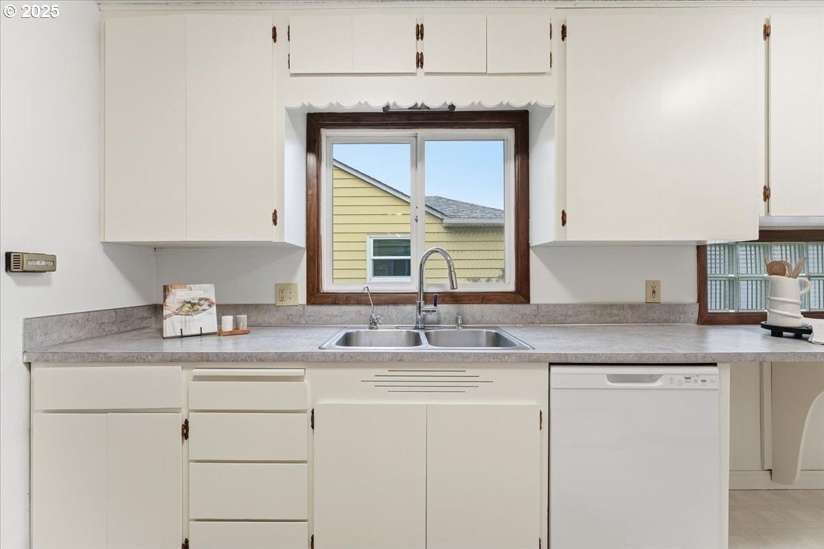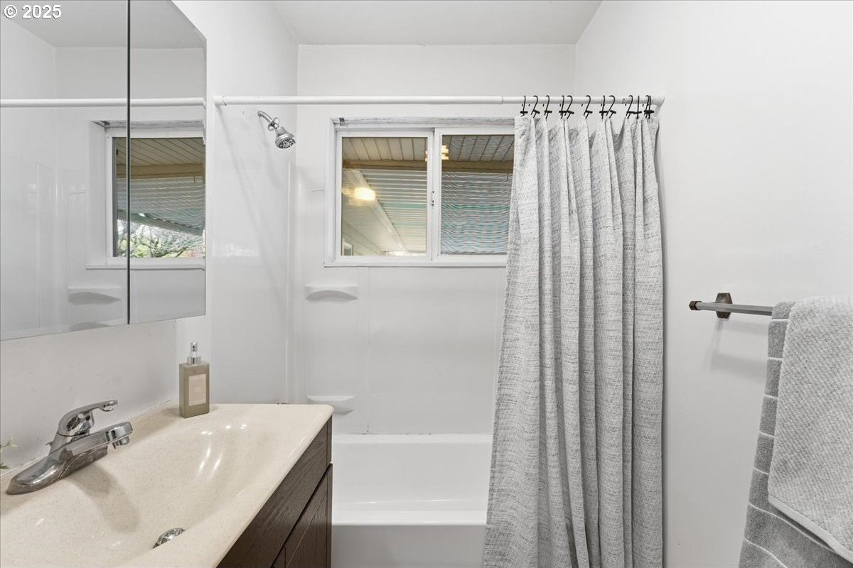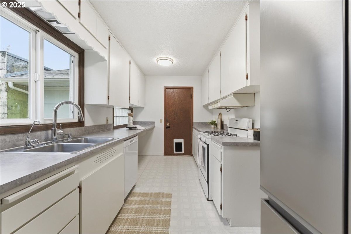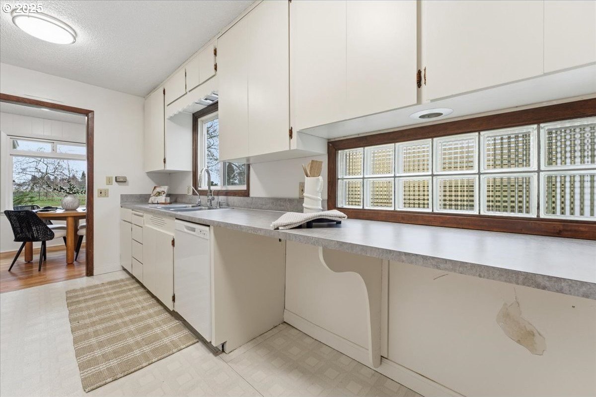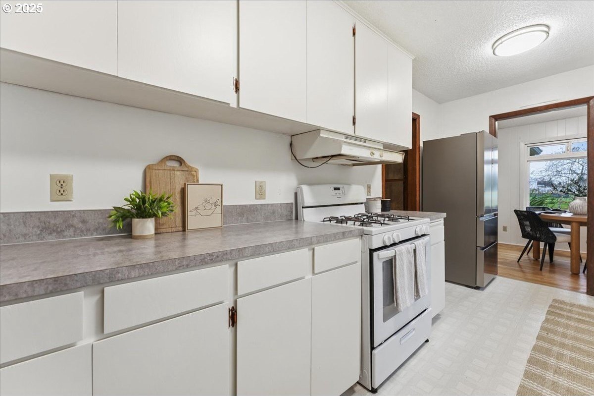 This cutie-pie 1953 one-level Bungalow is ready for your finishing touches and offers smart updates and character. Enjoy a refreshed galley kitchen with newly painted cabinetry, a brand-new fridge. Energy efficient mini-splits provide both heat and cooling, new light fixtures and double-pane vinyl windows throughout, and tankless hot water heater (energy score of 9/10!) Classic features like oak hardwood floors, a cozy wood-burning fireplace and original solid-core doors add charm. A separate laundry room with washer and dryer - included - keeps household noise out of your living space. The unique, DOUBLE OVERHEAD door garage to the backyard offers versatility for hobbyists and adventurers: complete with cabinets and shop space for art projects, car tinkering, camping gear, kayaks, or year-round indoor/outdoor entertaining. Outside, two covered patios, mature trees, and a fully fenced private yard are perfect for social gatherings year round. Located just 1 mile from hip restaurants, bars, boutiques, and Asian markets, and with bus service a quick 3-block stroll away, you'll love the convenience of Montavilla living. Come take a peek soon! [Home Energy Score = 9. HES Report