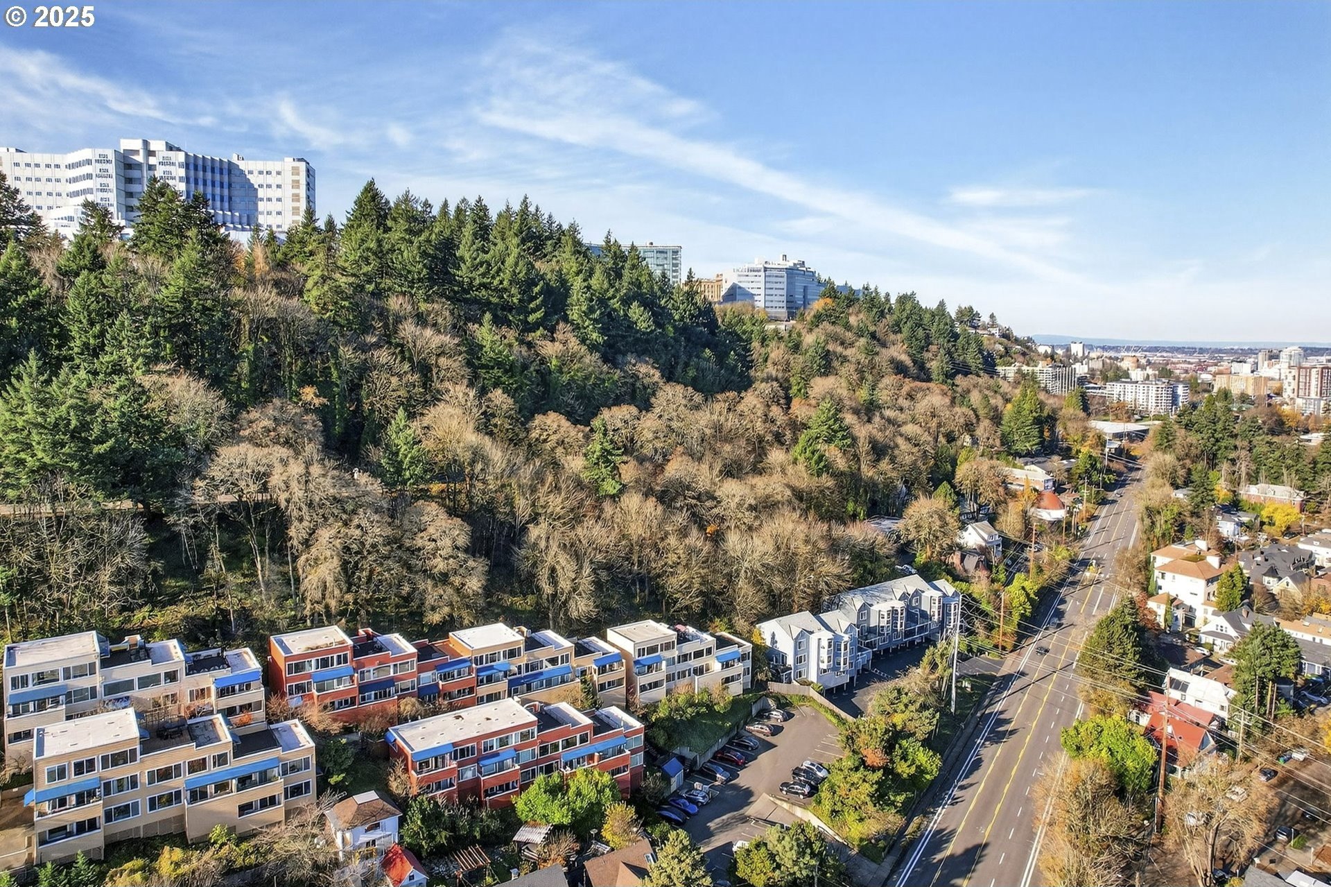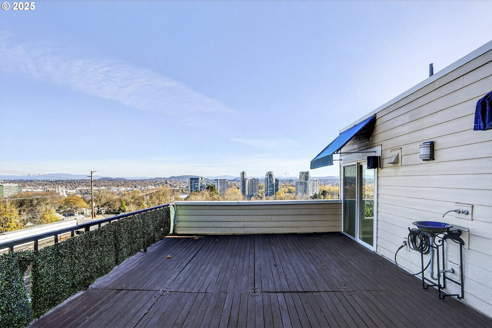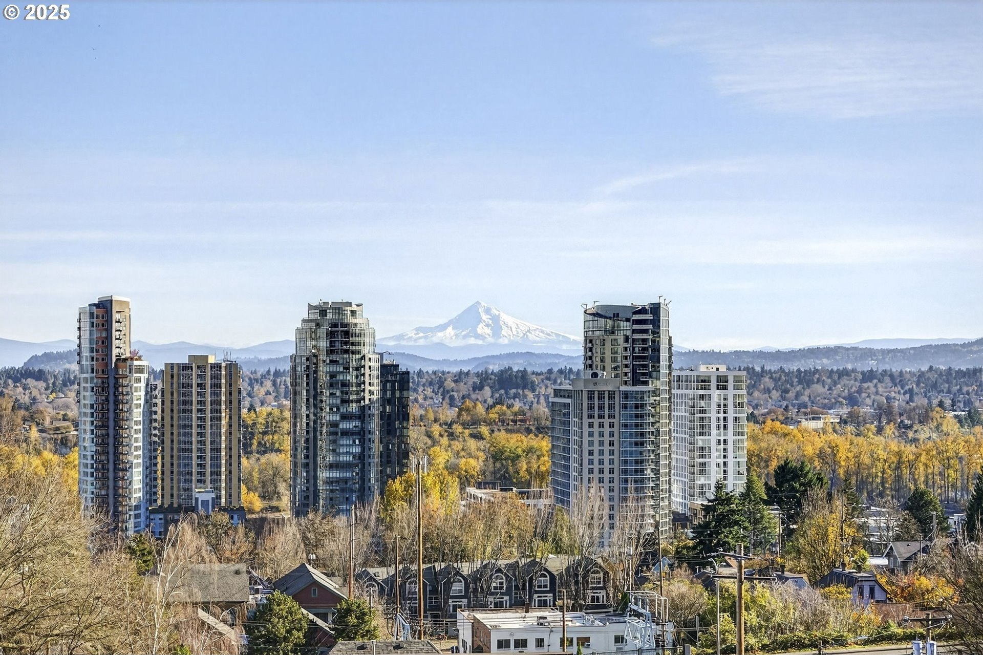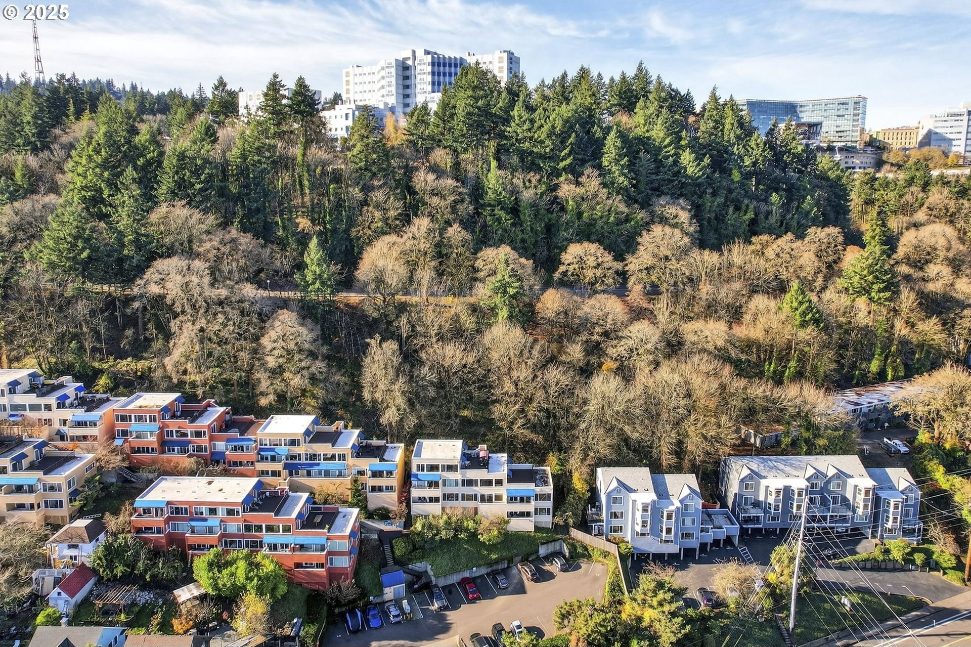 Live your best Portland life in this cozy condo nestled in a wooded hillside with breathtaking views of downtown, Southeast Portland, the Cascade mountain range, and the Willamette river! Watch the sunrise from your living room and then step outside your door to explore all of the outdoor amenities that the Homestead/Lair Hill area offers. Discover old growth forests and city views by hiking or biking the trails of the Terwilliger Parkway and Marquam Nature Park. Entertain friends and family on your private 384 square foot deck with one of the best views in the city. The open floor plan with lots of windows allows you to fully immerse yourself in this spectacular setting. This unit has fresh paint, new carpeting, and a stacking washer/dryer unit that provides much-needed convenience. The kitchen features slate flooring, a built-in Subzero refrigerator, a Miele dishwasher and a stainless-steel range. Play your favorite beats on the Bose speakers in the ceiling and an additional speaker on the deck. The complex has recently undergone a complete exterior renovation including new siding, exterior paint, vinyl windows and doors. The HOA is currently in the process of replacing the decks and awnings and this unit is on the replacement list. This condo includes an assigned parking spot and a storage unit. Fantastic location just minutes from OHSU, the South Waterfront, downtown, and quick access to I-5, 405, and highway 26. Walk score of 73 and bike score of 69.