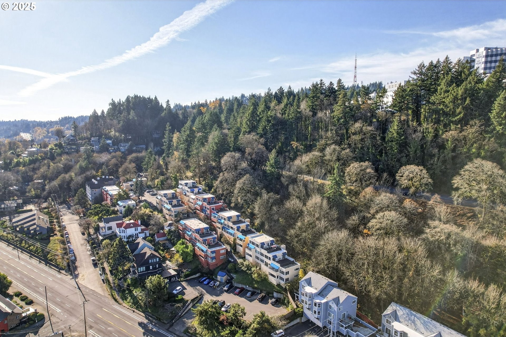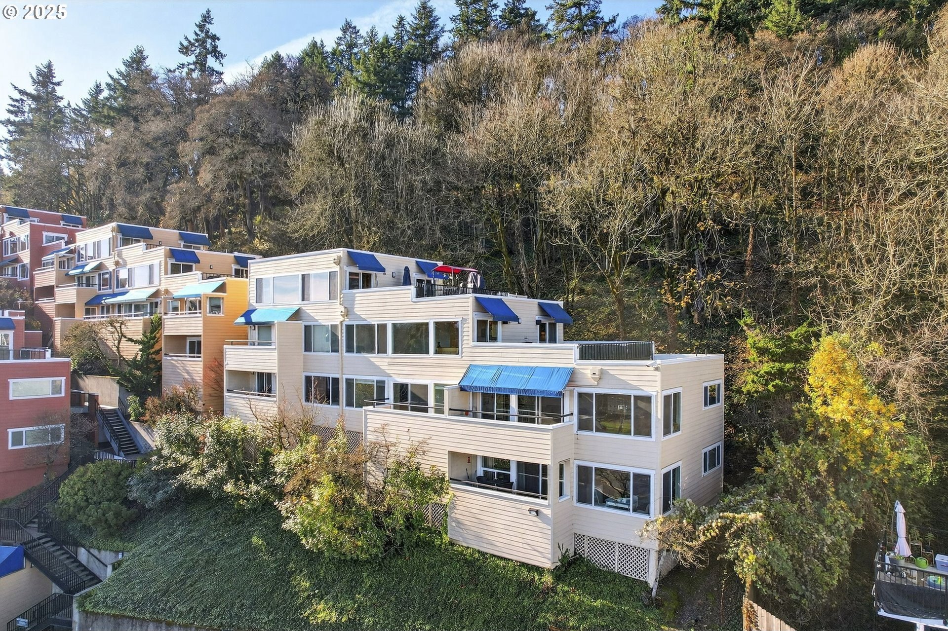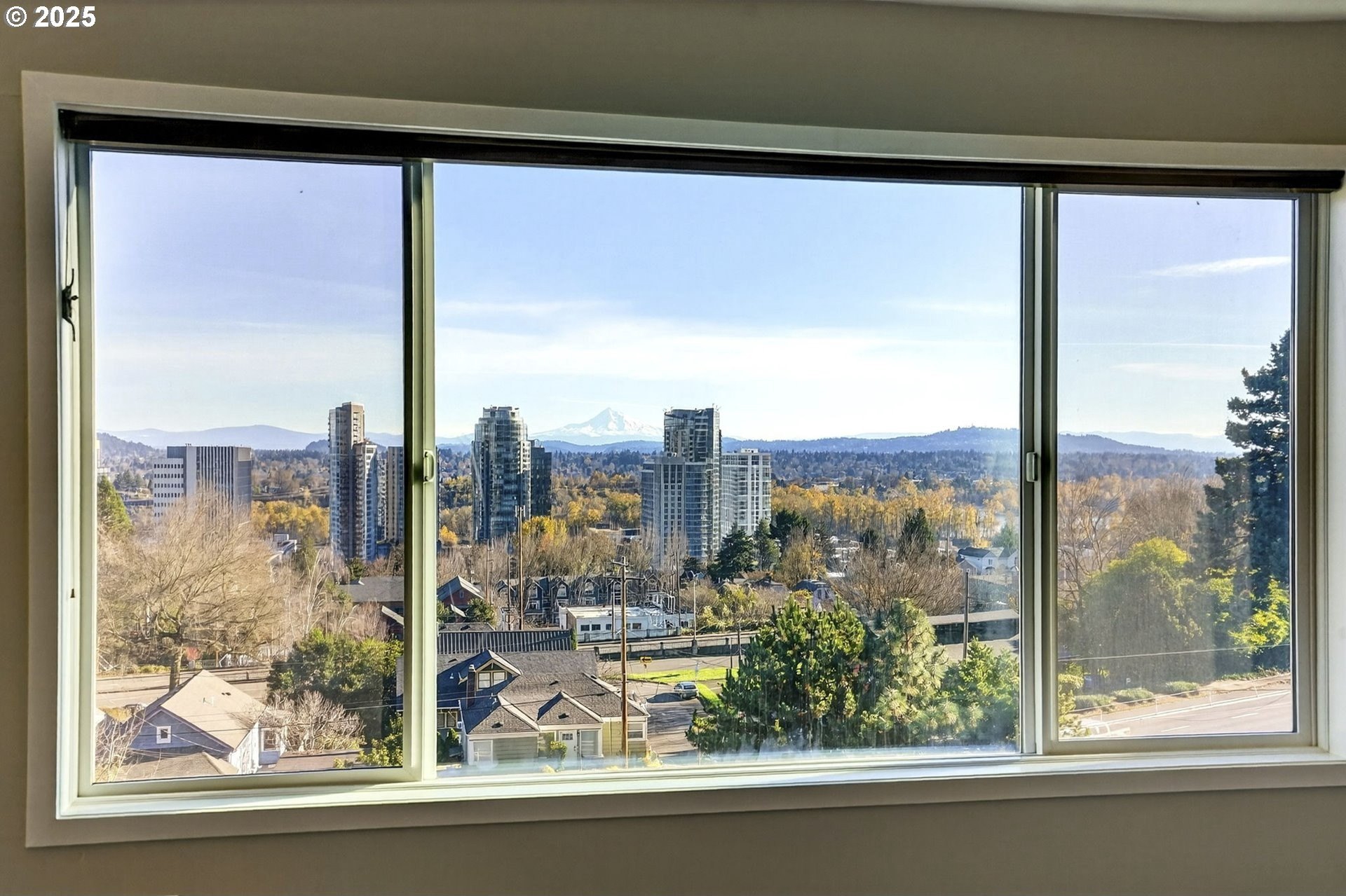Live your best Portland life in this cozy condo nestled in a wooded hillside with breathtaking views of downtown, Southeast Portland, the Cascade mountain range, and the Willamette river! Watch the sunrise from your living room and then step outside your door to explore all of the outdoor amenities that the Homestead/Lair Hill area offers. Discover old growth forests and city views by hiking or biking the trails of the Terwilliger Parkway and Marquam Nature Park. Entertain friends and family on your private 384 square foot deck with one of the best views in the city. The open floor plan with lots of windows allows you to fully immerse yourself in this spectacular setting. This unit has fresh paint, new carpeting, and a stacking washer/dryer unit that provides much-needed convenience. The kitchen features slate flooring, a built-in Subzero refrigerator, a Miele dishwasher and a stainless-steel range. Play your favorite beats on the Bose speakers in the ceiling and an additional speaker on the deck. The complex has recently undergone a complete exterior renovation including new siding, exterior paint, vinyl windows and doors. The HOA is currently in the process of replacing the decks and awnings and this unit is on the replacement list. This condo includes an assigned parking spot and a storage unit. Fantastic location just minutes from OHSU, the South Waterfront, downtown, and quick access to I-5, 405, and highway 26. Walk score of 73 and bike score of 69.