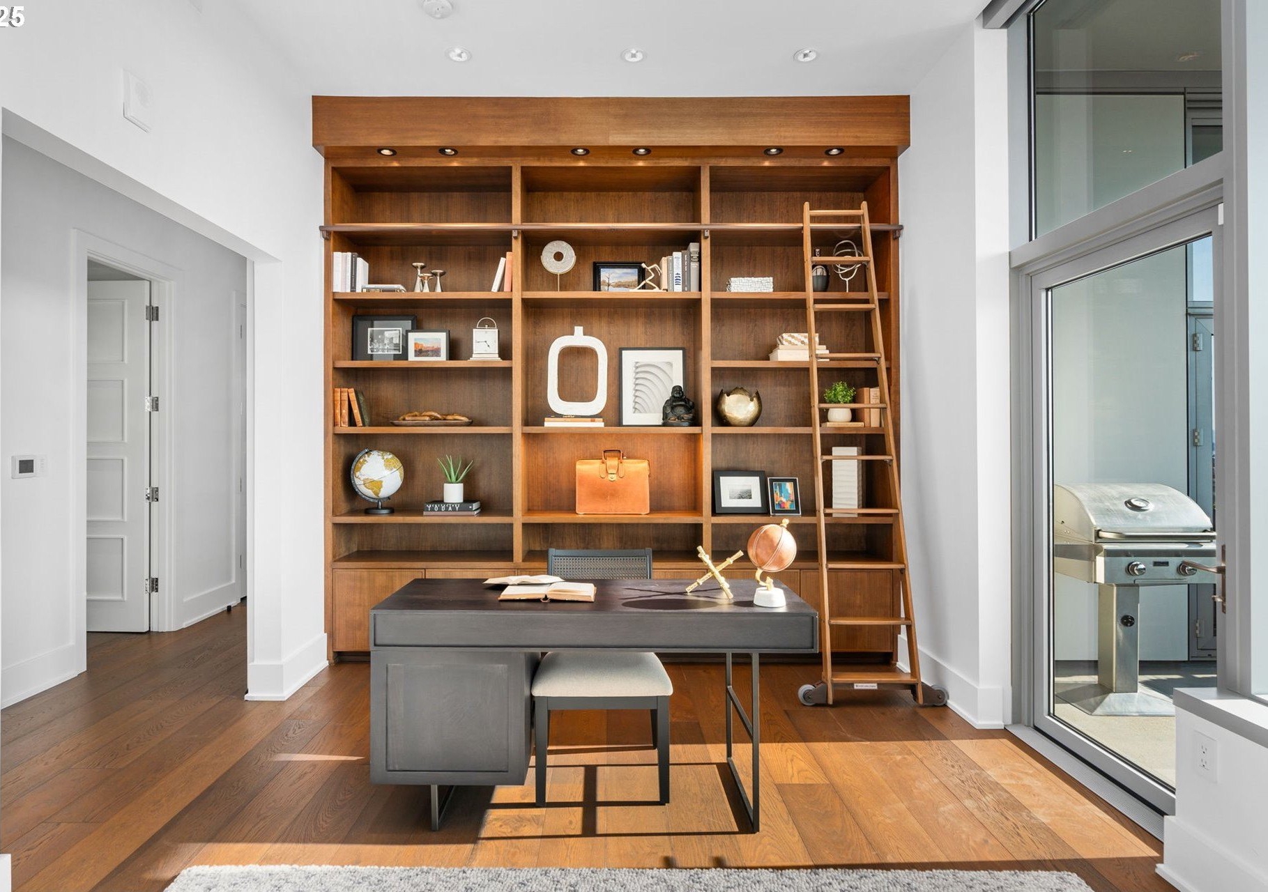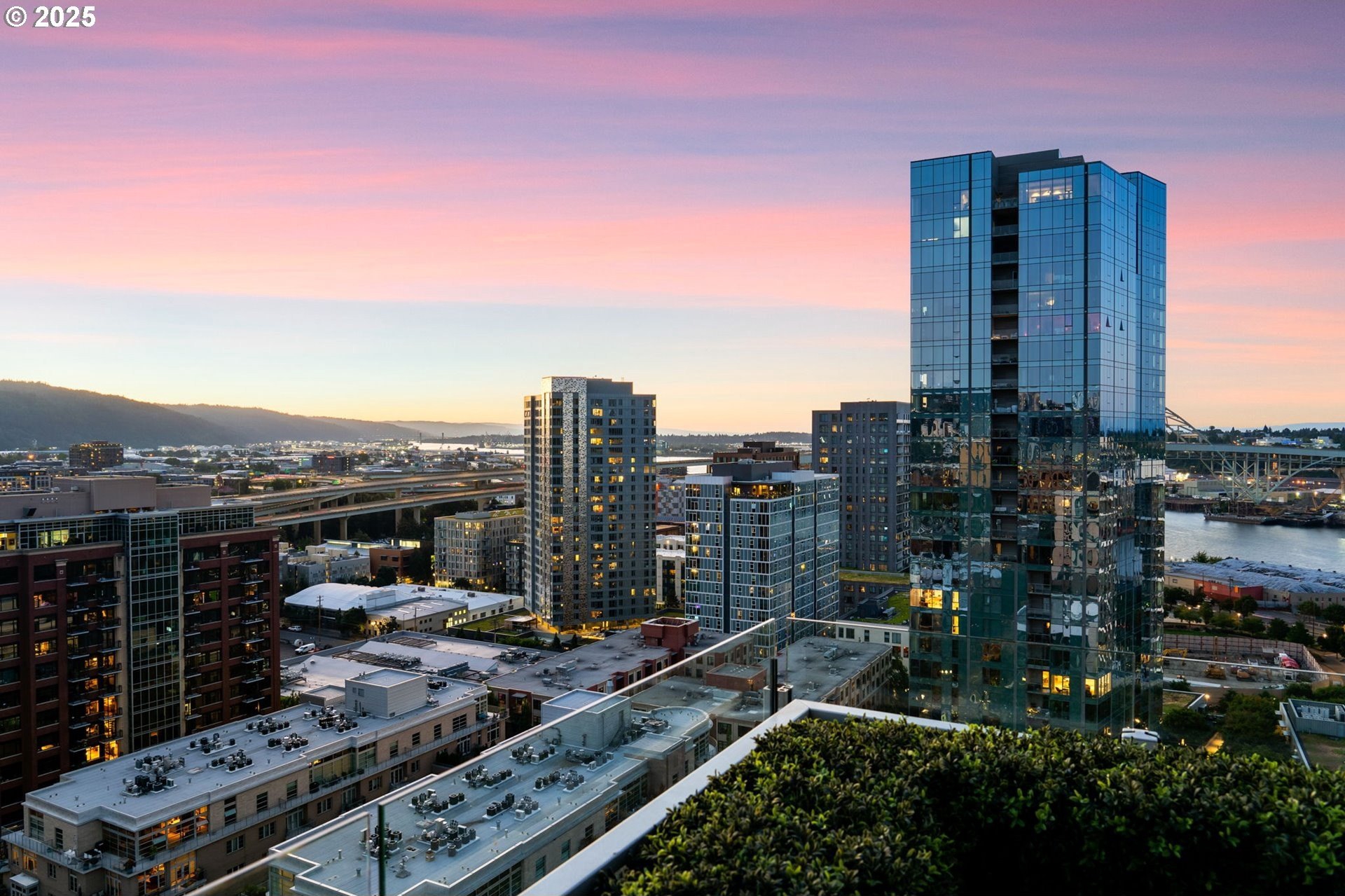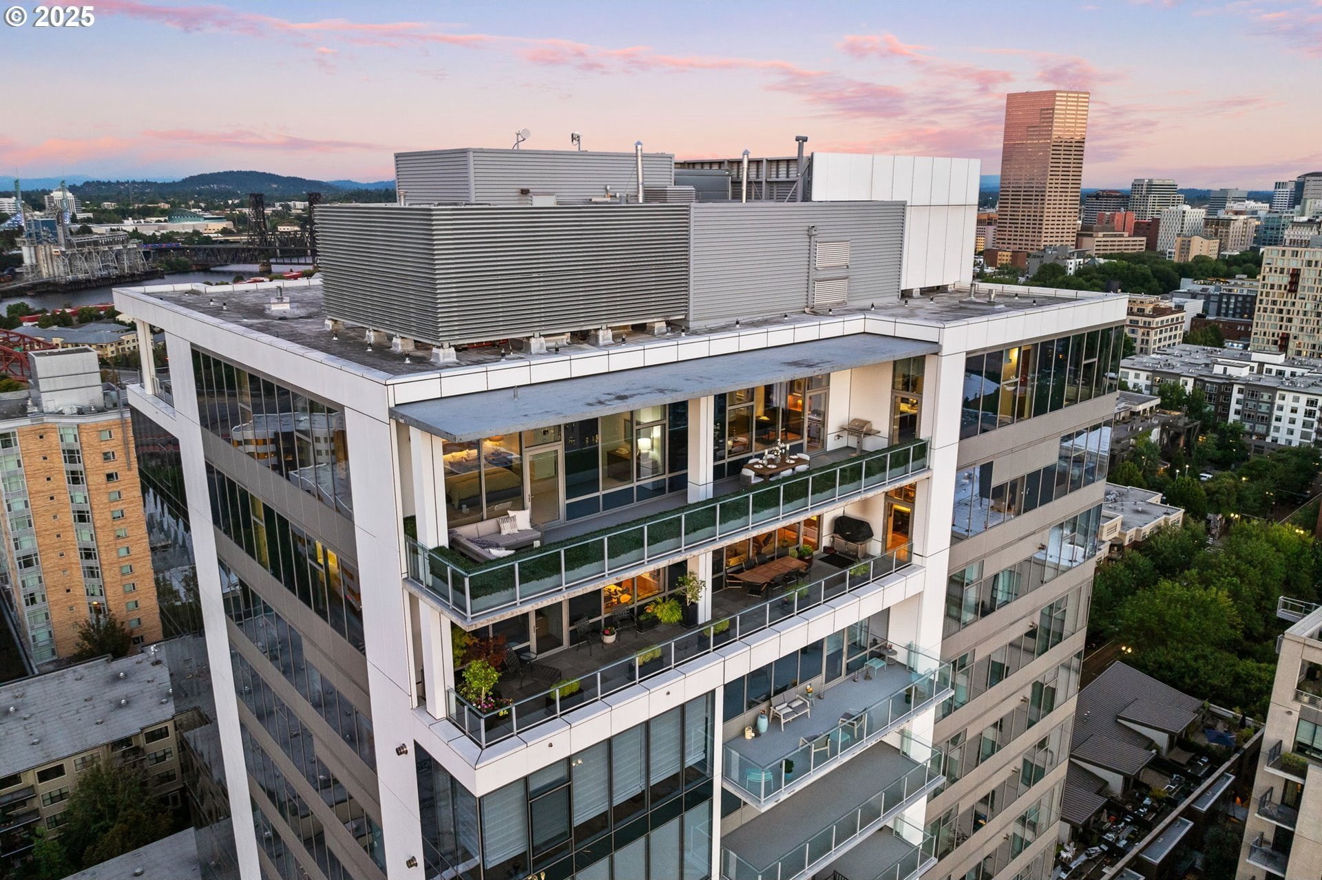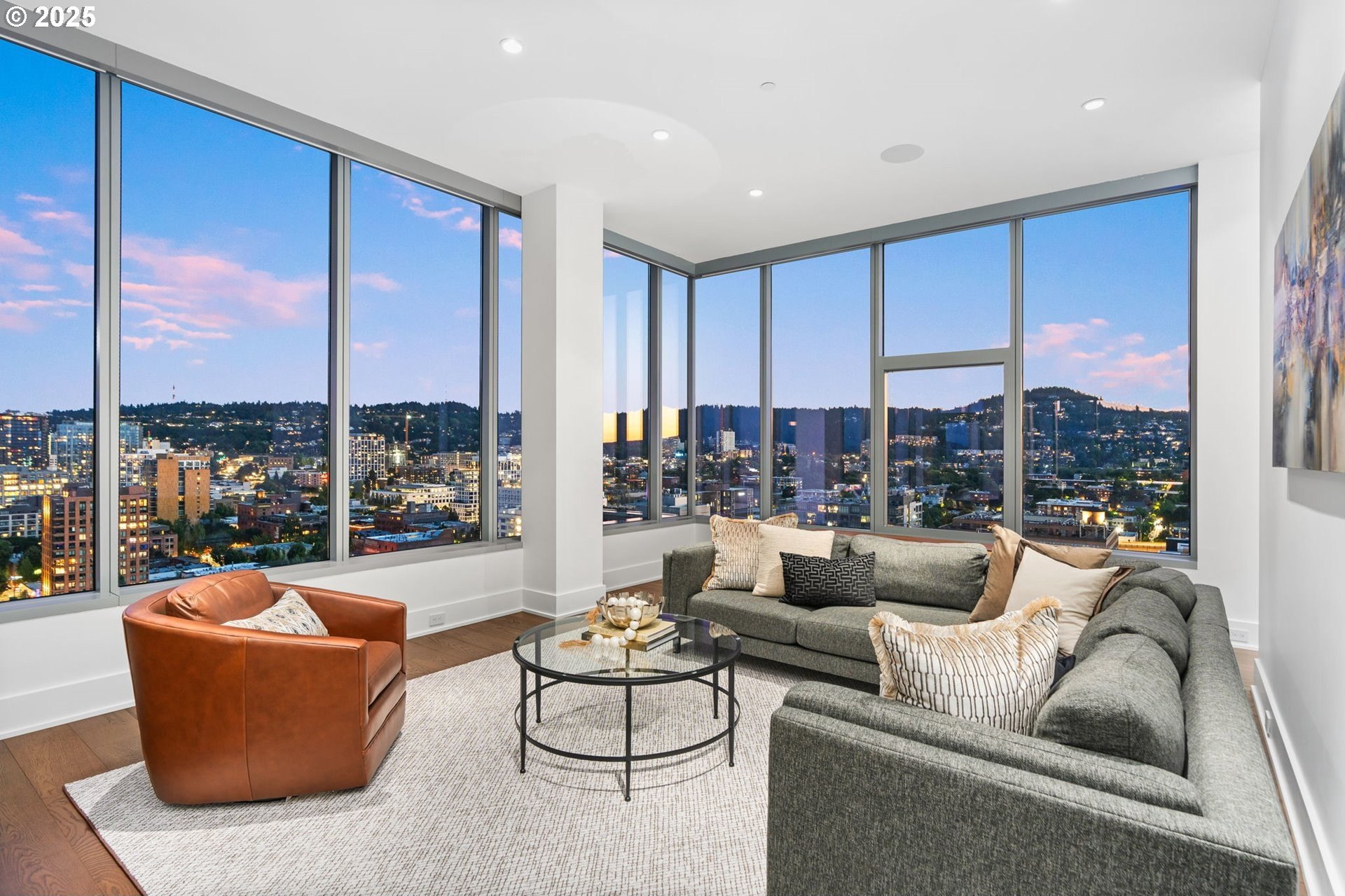 Experience the pinnacle of Portland luxury in this extraordinary penthouse, commanding the western half of the top floor in the iconic Metropolitan Condominium Tower. Walls of glass frame sweeping, unobstructed vistas of the city skyline, the West Hills, Willamette River, and the snow-capped majesty of Mt. Hood, Mt. St. Helens, and Mt. Adams. Awaken to the first light of day as the sunrise bathes the city and Mt. Hood in golden hues, and unwind in the evening with al fresco dining on the expansive western terrace, where sunsets paint the sky in a kaleidoscope of color. Every detail has been painstakingly curated, from custom walnut cabinetry throughout the residence to exquisite slab marble surfaces. A Miele appliance suite, built-in Sub-Zero refrigerator, and dry bar with Sub-Zero wine fridge elevate the culinary experience, while a smart home command center controls the Sonos surround sound and automated blinds. The primary suite offers western-facing views, terrace access, and a spa-inspired bath with oversized soaking tub, walk-in glass shower, and double vanity. A custom-fitted walk-in closet features built-in display shelving with LED lighting and a walnut folding island with additional storage. The study, complete with floor-to-ceiling library shelving and sliding ladder, opens directly to the terrace, blending work, leisure, and breathtaking views. This is more than a residence-it's a statement of refinement and a rare vantage point above the heart of Portland. 24 hour concierge + Security.