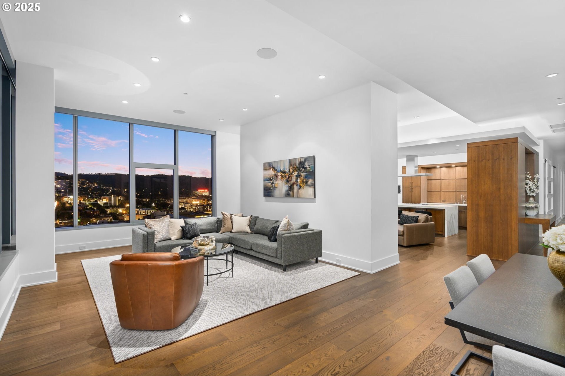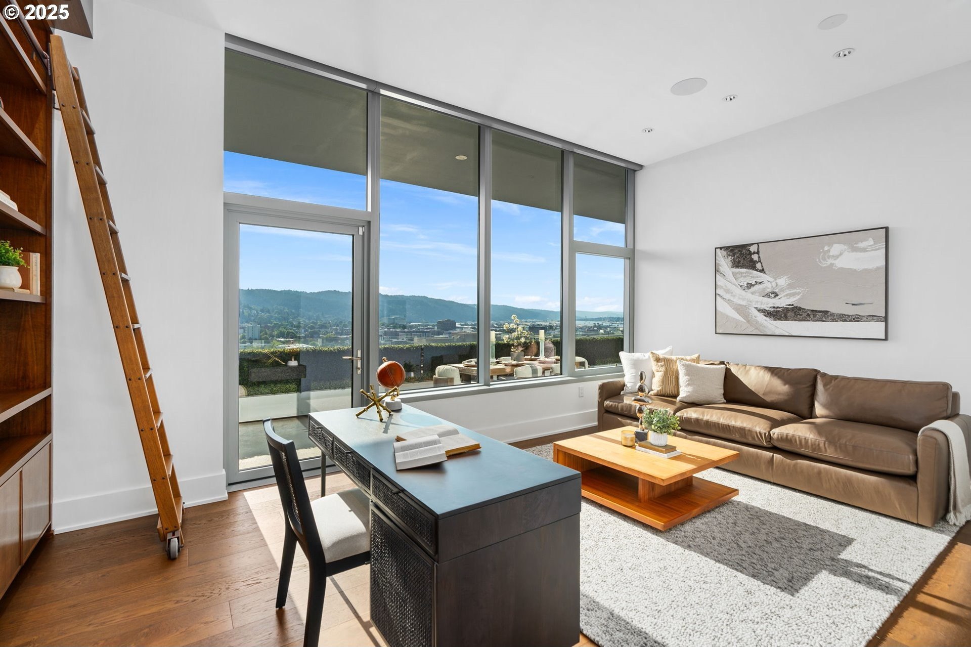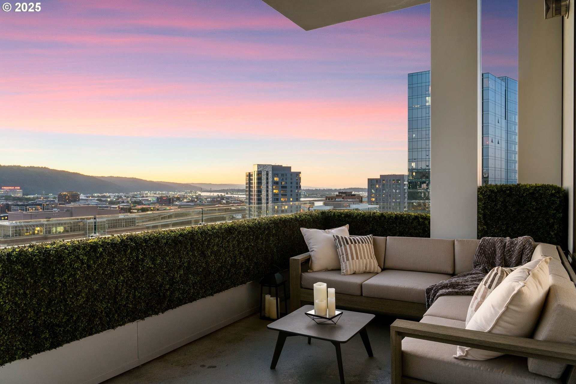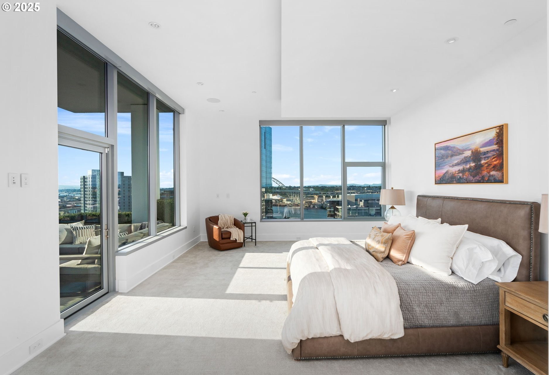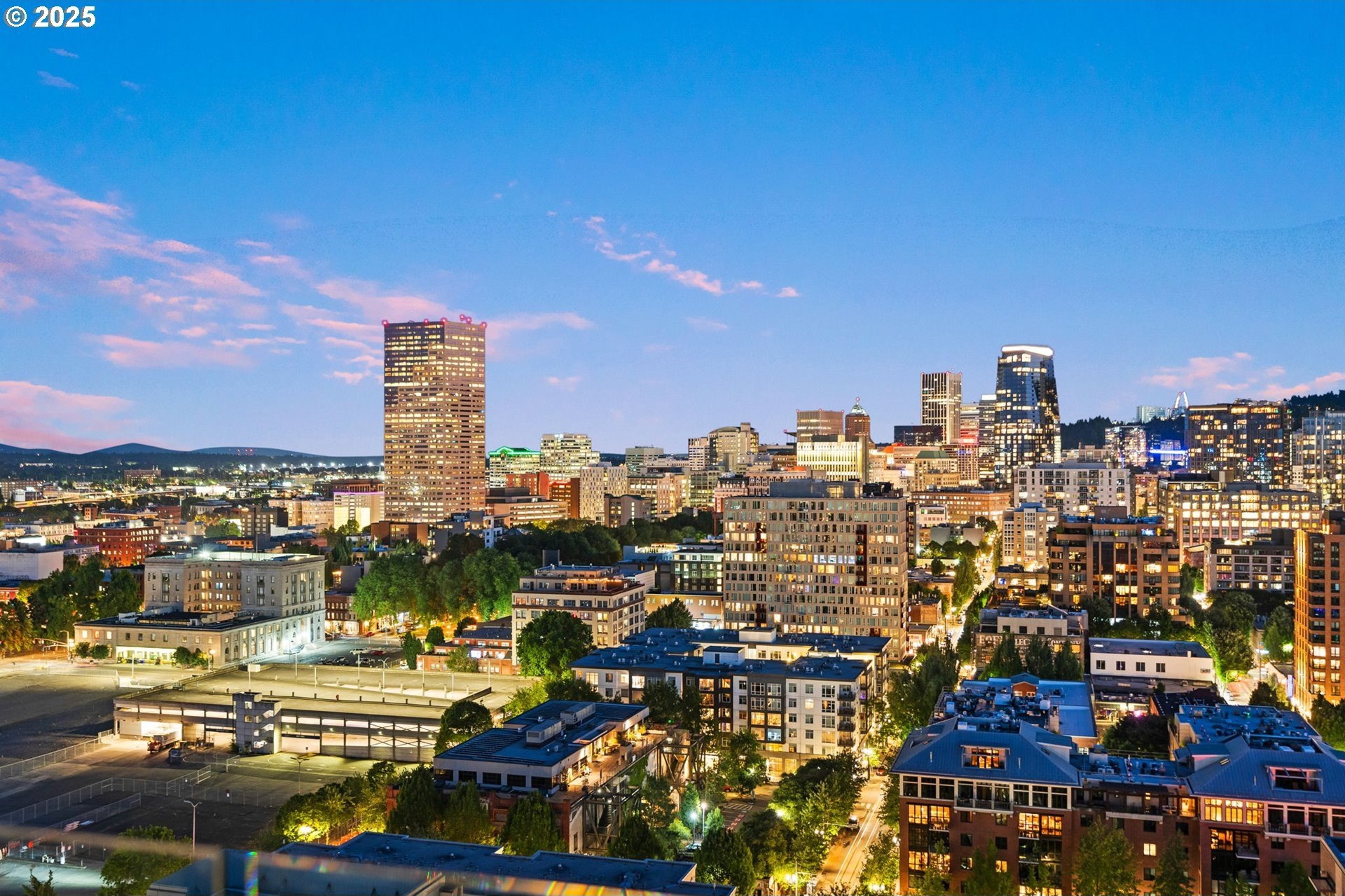 Experience the pinnacle of Portland luxury in this extraordinary penthouse, commanding the western half of the top floor in the iconic Metropolitan Condominium Tower. Walls of glass frame sweeping, unobstructed vistas of the city skyline, the West Hills, Willamette River, and the snow-capped majesty of Mt. Hood, Mt. St. Helens, and Mt. Adams. Awaken to the first light of day as the sunrise bathes the city and Mt. Hood in golden hues, and unwind in the evening with al fresco dining on the expansive western terrace, where sunsets paint the sky in a kaleidoscope of color. Every detail has been painstakingly curated, from custom walnut cabinetry throughout the residence to exquisite slab marble surfaces. A Miele appliance suite, built-in Sub-Zero refrigerator, and dry bar with Sub-Zero wine fridge elevate the culinary experience, while a smart home command center controls the Sonos surround sound and automated blinds. The primary suite offers western-facing views, terrace access, and a spa-inspired bath with oversized soaking tub, walk-in glass shower, and double vanity. A custom-fitted walk-in closet features built-in display shelving with LED lighting and a walnut folding island with additional storage. The study, complete with floor-to-ceiling library shelving and sliding ladder, opens directly to the terrace, blending work, leisure, and breathtaking views. This is more than a residence-it's a statement of refinement and a rare vantage point above the heart of Portland. 24 hour concierge + Security.