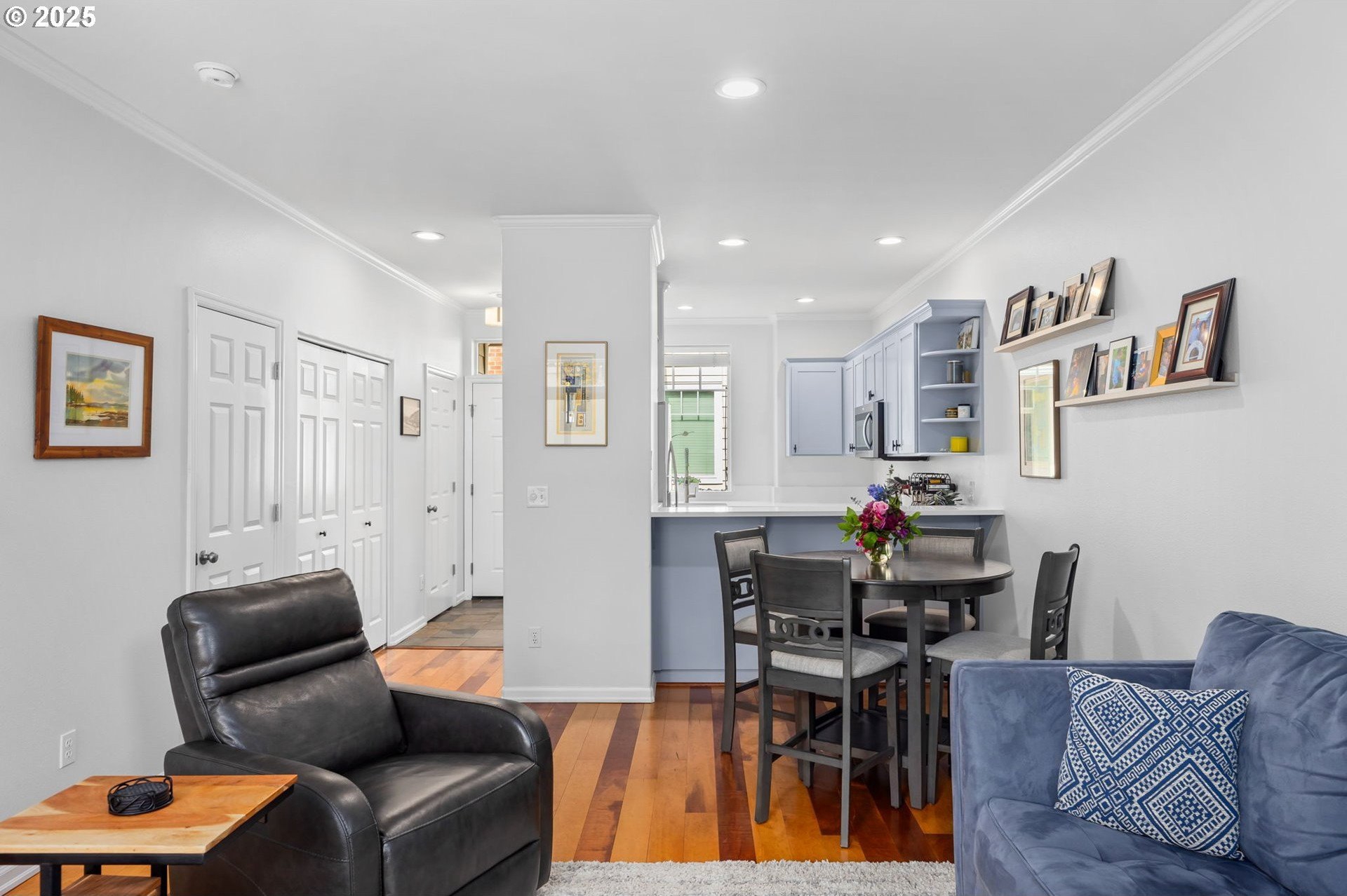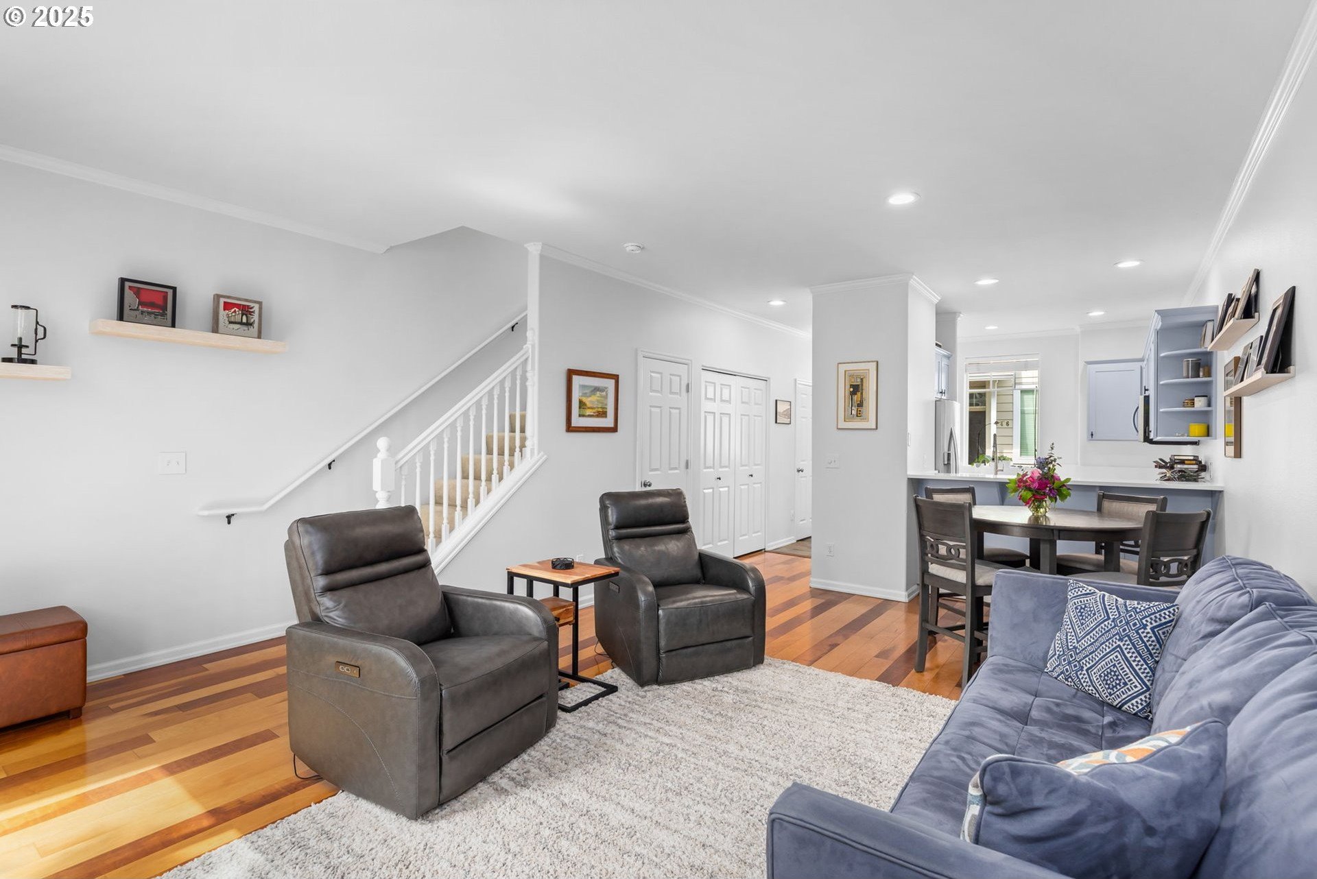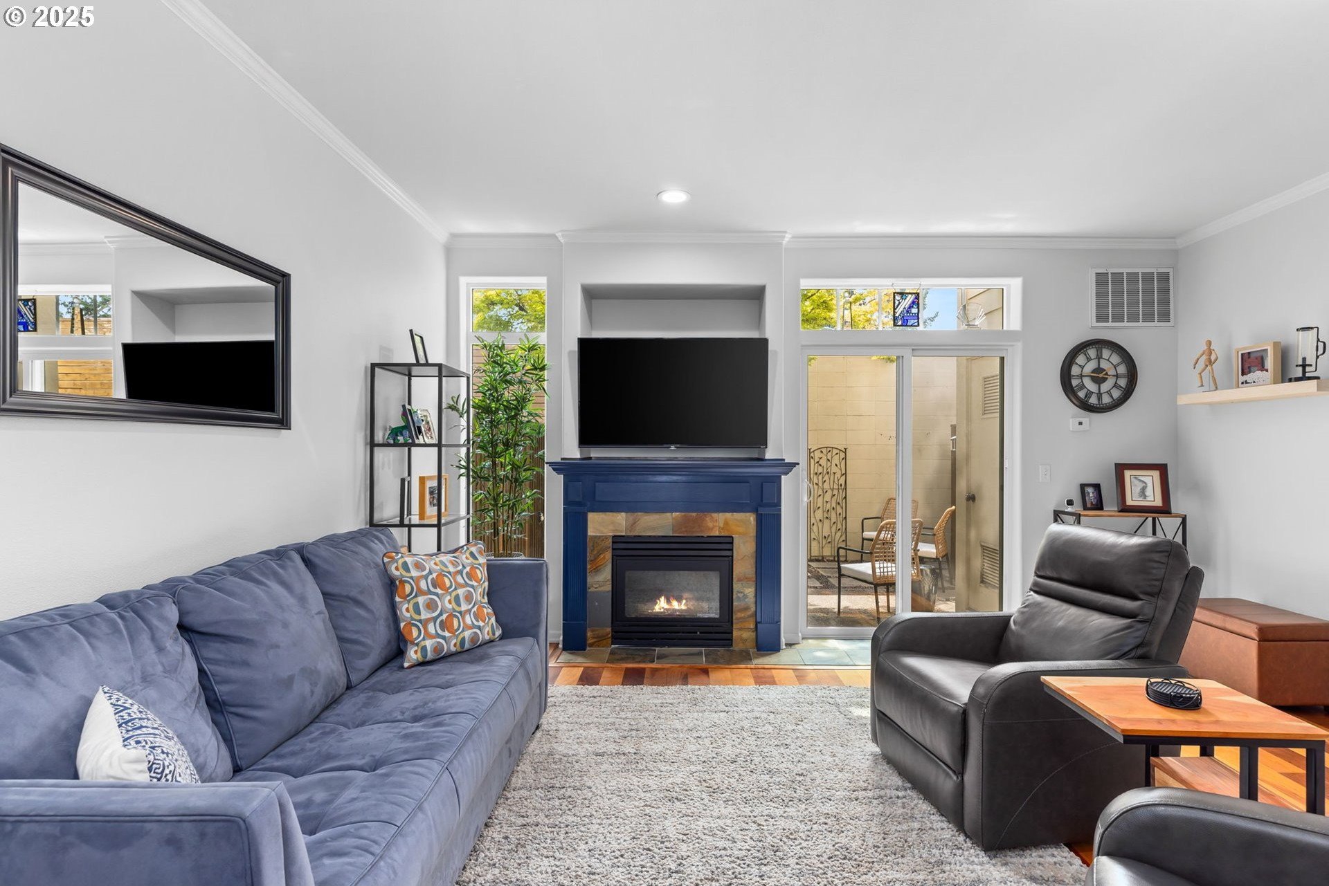 Live in the heart of downtown Lake Oswego's First Addition neighborhood! Charming + lush courtyard greets guests with beautiful landscaping. Light & bright interior features 9' high ceilings, great room concept on main level with Brazilian cherry wood floors + crown molding. Remodeled kitchen with stainless steel appliances, quartz counter tops & eat bar. Living room with cozy gas fireplace. Sliding glass door opens to fenced & oversized private patio. Upstairs you will find 2 bedrooms connected by full bathroom with 2 sink vanity, excellent storage & shower+tub combo. Detached garage with attic storage & opener . This 16 unit complex is a special combination of a low maintenance, peaceful retreat in the heart of one of the most sought-after neighborhoods. Stroll to shops, grocery, library, post office, farmer's market, theater, dining, cafes & parks. Walk Score 94 + Bike Score 69!