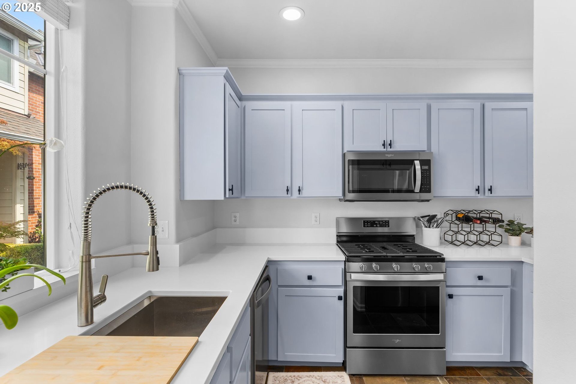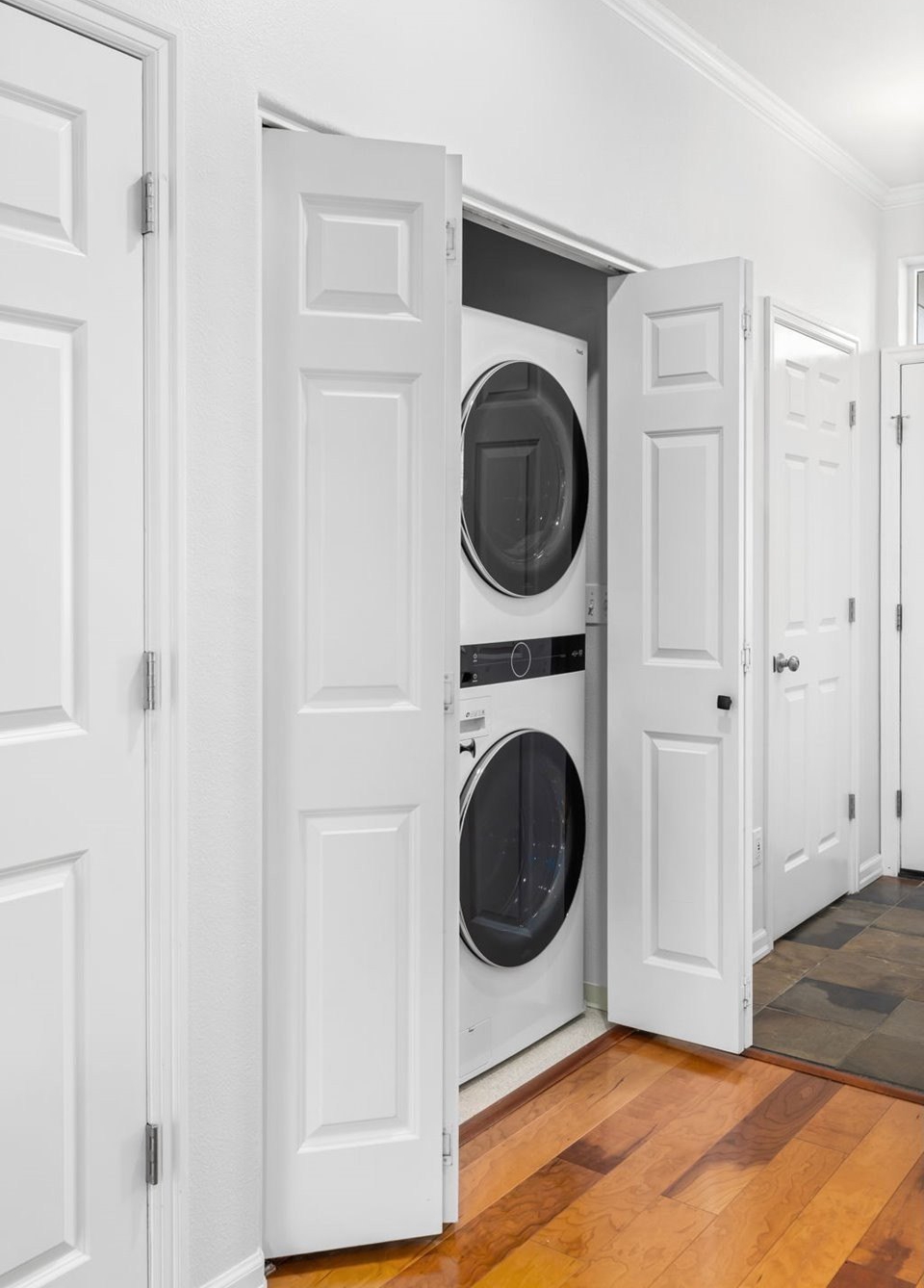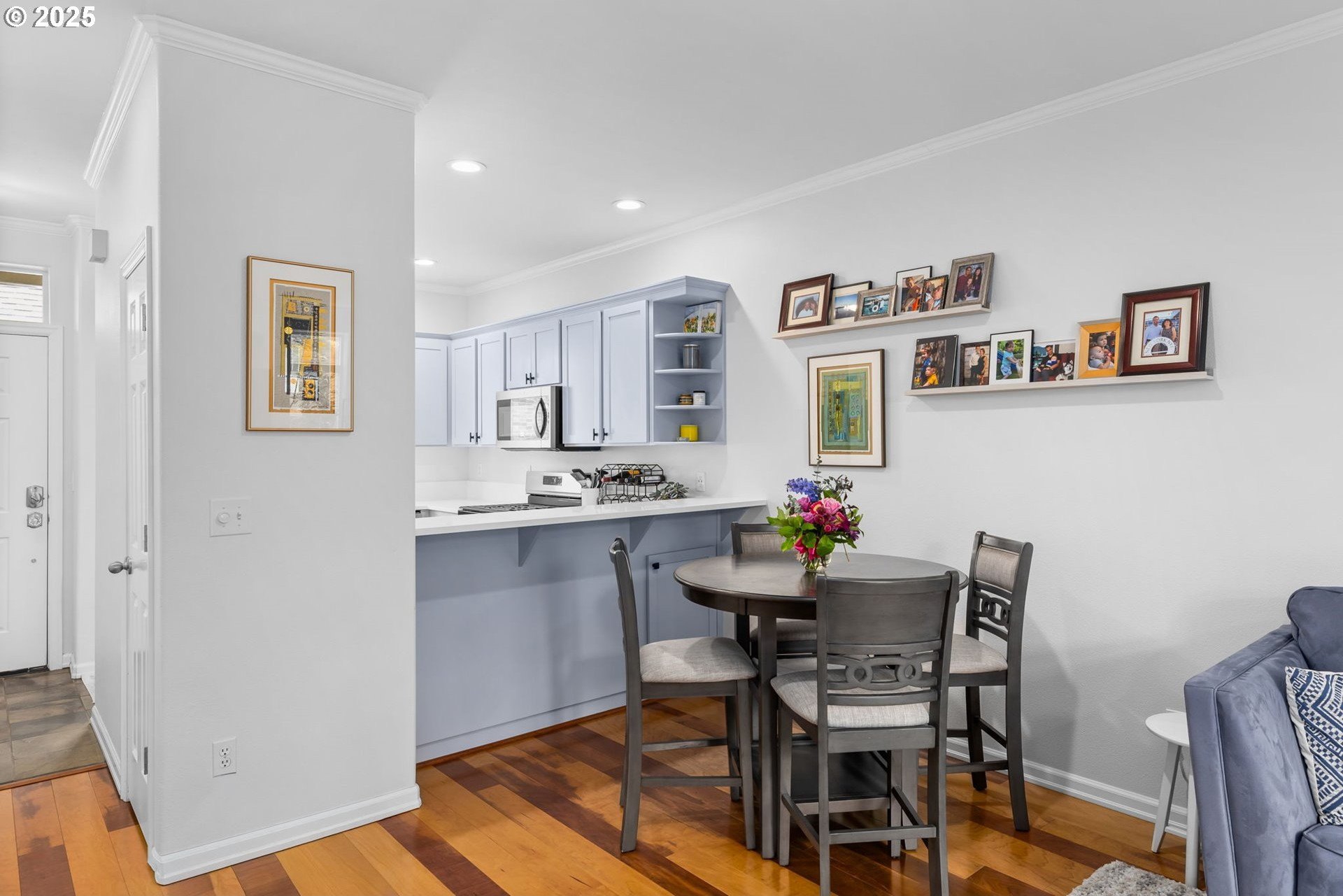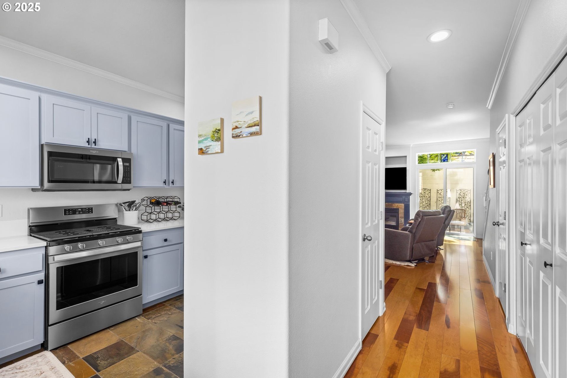 Live in the heart of downtown Lake Oswego's First Addition neighborhood! Charming + lush courtyard greets guests with beautiful landscaping. Light & bright interior features 9' high ceilings, great room concept on main level with Brazilian cherry wood floors + crown molding. Remodeled kitchen with stainless steel appliances, quartz counter tops & eat bar. Living room with cozy gas fireplace. Sliding glass door opens to fenced & oversized private patio. Upstairs you will find 2 bedrooms connected by full bathroom with 2 sink vanity, excellent storage & shower+tub combo. Detached garage with attic storage & opener . This 16 unit complex is a special combination of a low maintenance, peaceful retreat in the heart of one of the most sought-after neighborhoods. Stroll to shops, grocery, library, post office, farmer's market, theater, dining, cafes & parks. Walk Score 94 + Bike Score 69!
