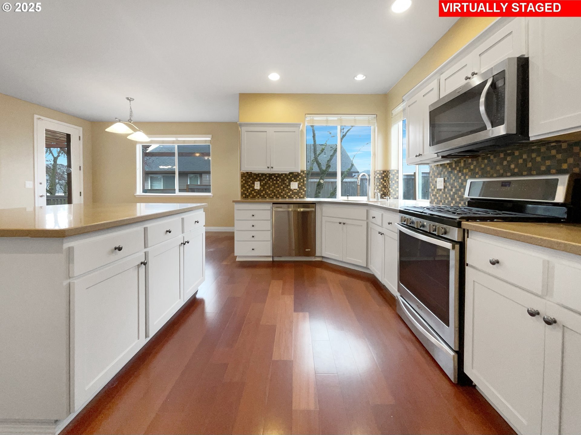 Welcome to this beautiful property that boasts a host of desirable features. The living room is adorned with a cozy fireplace, perfect for those chilly evenings. The primary bathroom is a haven of luxury with double sinks, a separate tub, and shower. The primary bedroom is spacious and includes a walk-in closet. The kitchen is a chef's dream with an accent backsplash, a functional island, and all stainless steel appliances. The home has a neutral color paint scheme and partial flooring replacement, giving it a fresh, modern feel. Outside, you'll find a deck overlooking a fenced-in backyard, perfect for outdoor entertaining. This property is a must-see for anyone seeking a comfortable and stylish home. This home has been virtually staged to illustrate its potential.
