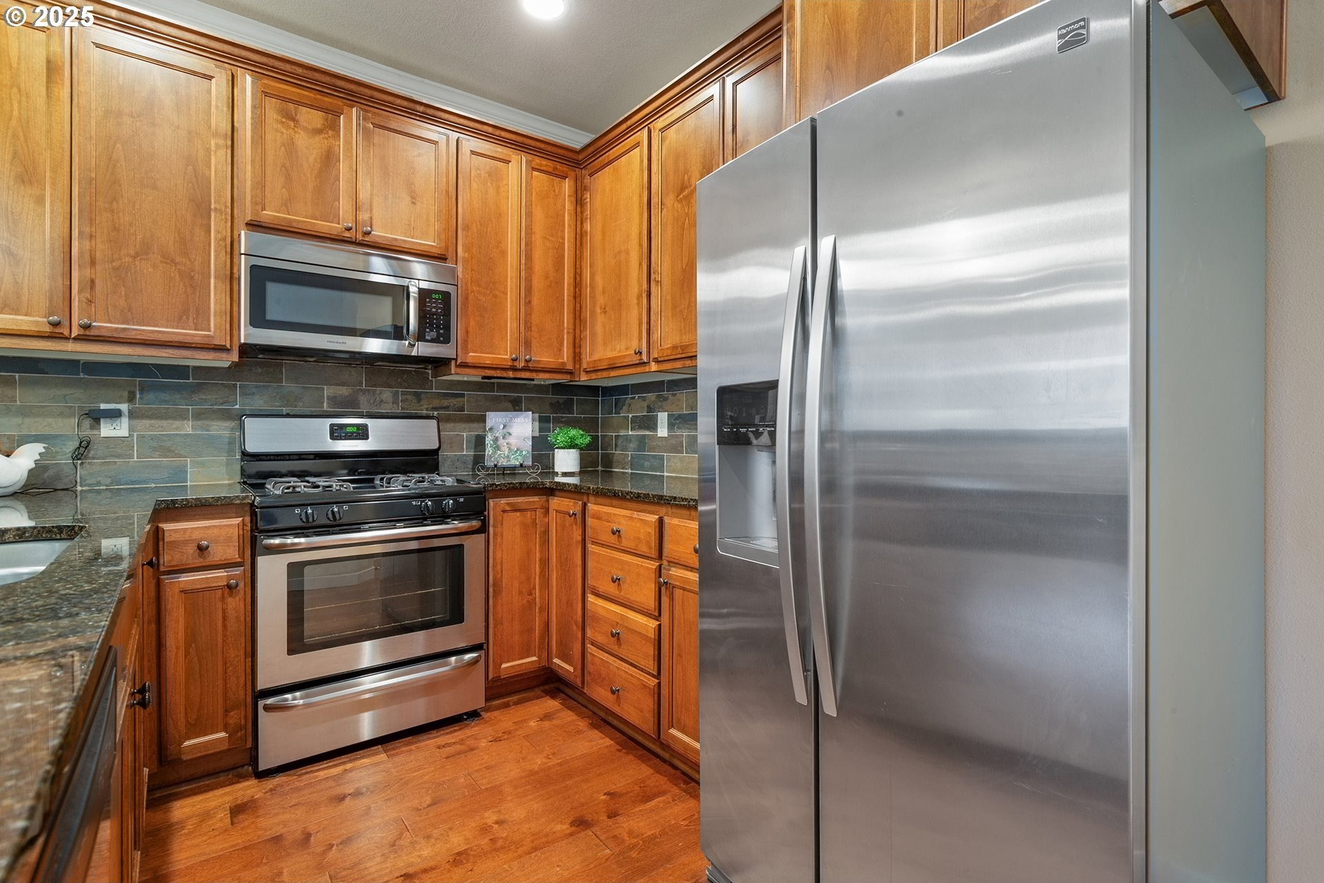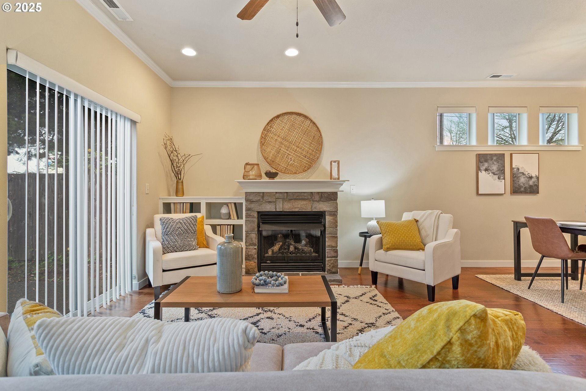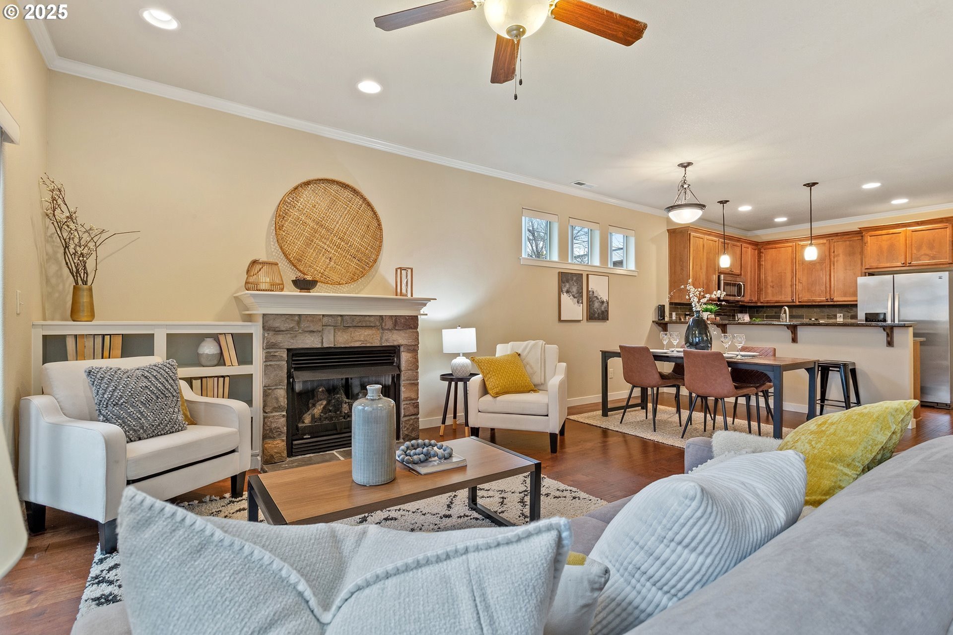 Fall in love with this move-in ready home tucked at the end of a quiet dead-end street-private, peaceful, and nearby shops, parks, and amenities! The open main level features rich Brazilian wood floors and cabinetry, high ceilings, granite counters, and a cozy gas fireplace with built-ins. Upstairs offers comfortable bedrooms and a convenient laundry room, while the third-floor bonus space invites endless possibilities-home office, art studio, media room, or 4th bedroom. Refrigerator, washer, and dryer are included. Enjoy easy living with HOA-maintained front landscaping and a tree-lined setting that bursts with color in spring and summer. Pride of ownership shines throughout this welcoming neighborhood-truly a place you'll love to call home.